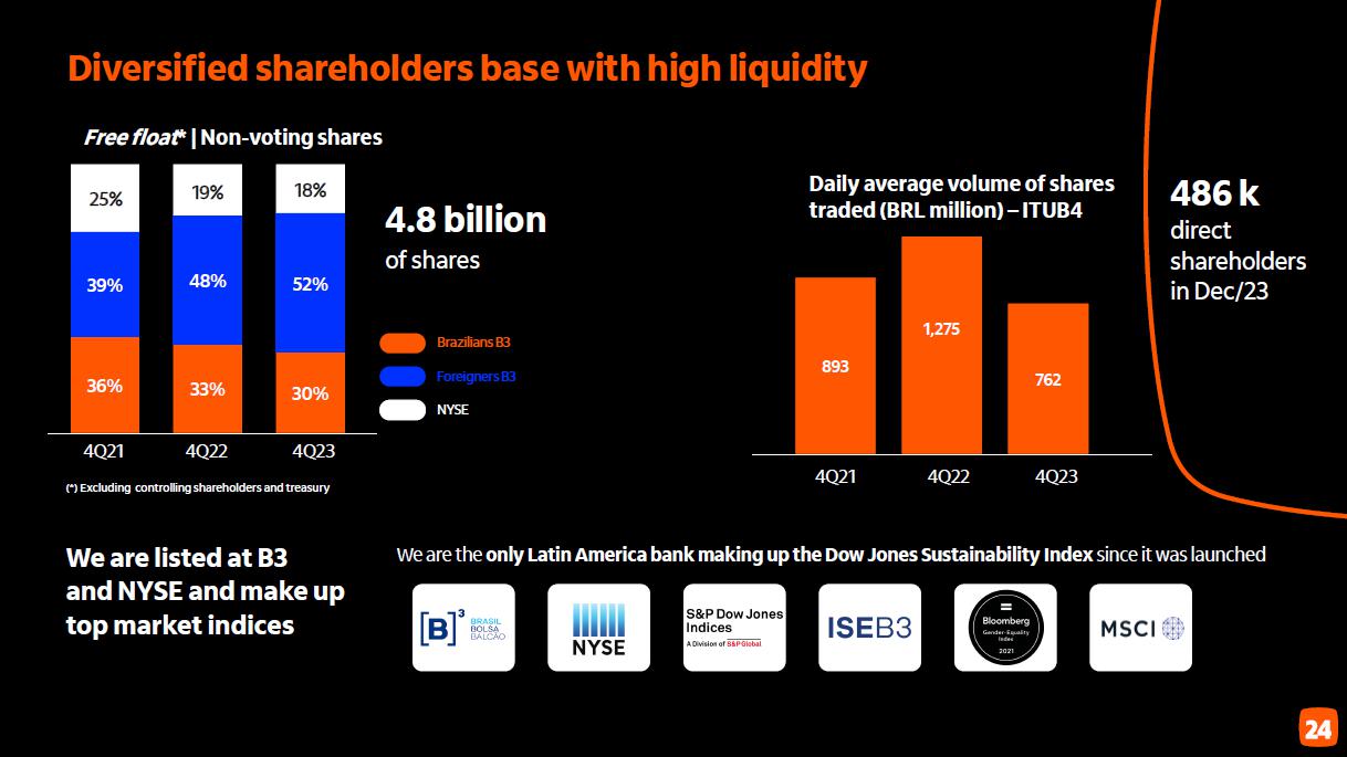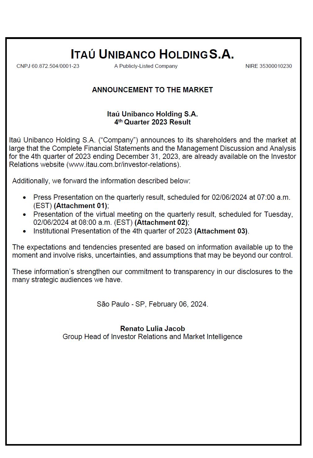 ITAÚ UNIBANCO HOLDING S.A. CNPJ 60.872.504/0001-23 A Publicly-Listed Company NIRE 35300010230 ANNOUNCEMENT TO THE MARKET Itaú Unibanco Holding S.A. 4th Quarter 2023 Result Itaú Unibanco Holding S.A. (“Company”) announces to its shareholders and the market at large that the Complete Financial Statements and the Management Discussion and Analysis for the 4th quarter of 2023 ending December 31, 2023, are already available on the Investor Relations website (www.itau.com.br/investor-relations). Additionally, we forward the information described below: • Press Presentation on the quarterly result, scheduled for 02/06/2024 at 07:00 a.m. (EST) (Attachment 01); • Presentation of the virtual meeting on the quarterly result, scheduled for Tuesday, 02/06/2024 at 08:00 a.m. (EST) (Attachment 02); • Institutional Presentation of the 4th quarter of 2023 (Attachment 03). The expectations and tendencies presented are based on information available up to the moment and involve risks, uncertainties, and assumptions that may be beyond our control. These information’s strengthen our commitment to transparency in our disclosures to the many strategic audiences we have. São Paulo ‐ SP, February 06, 2024. Renato Lulia Jacob Group Head of Investor Relations and Market Intelligence