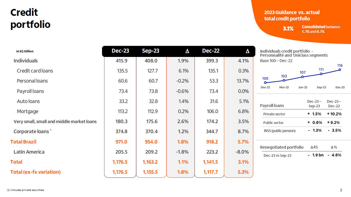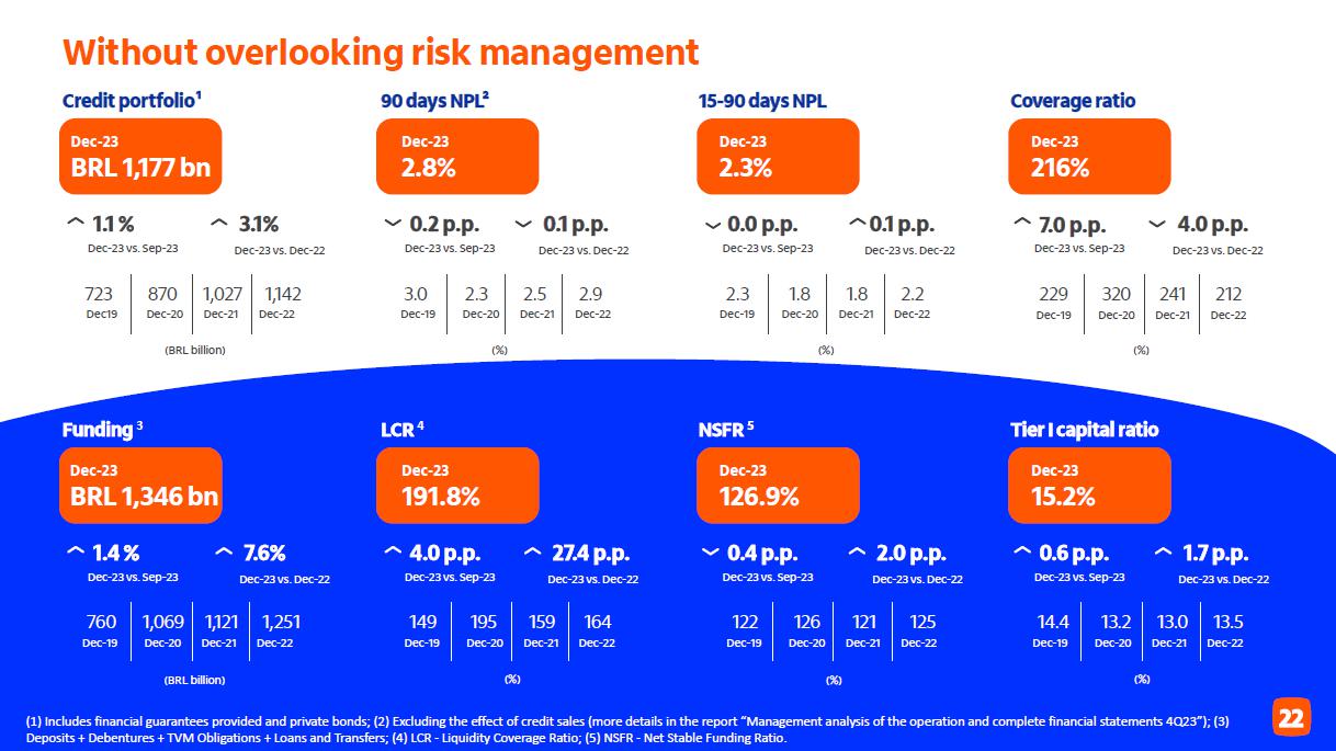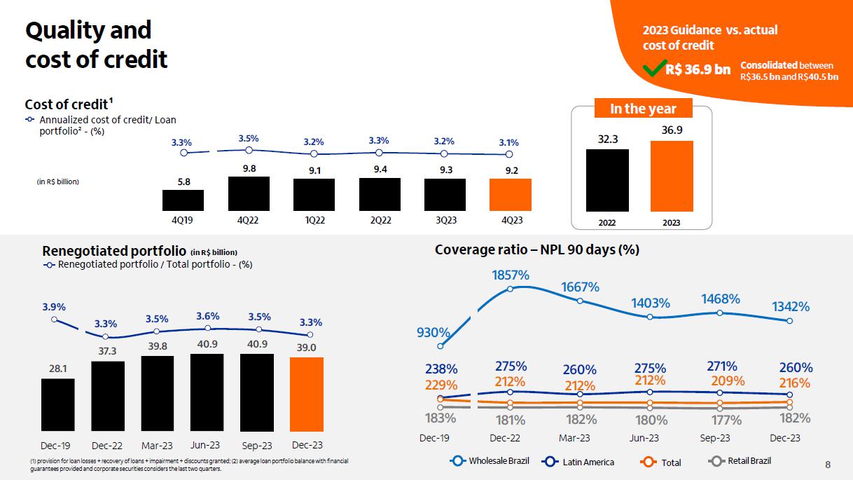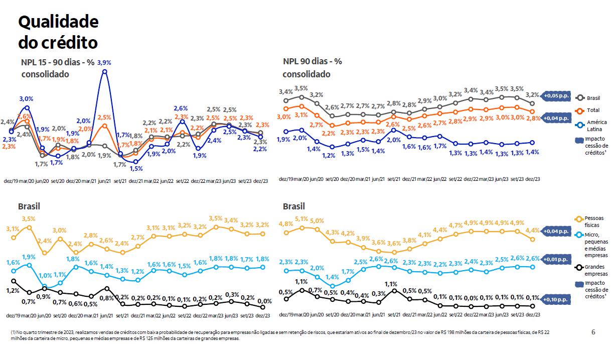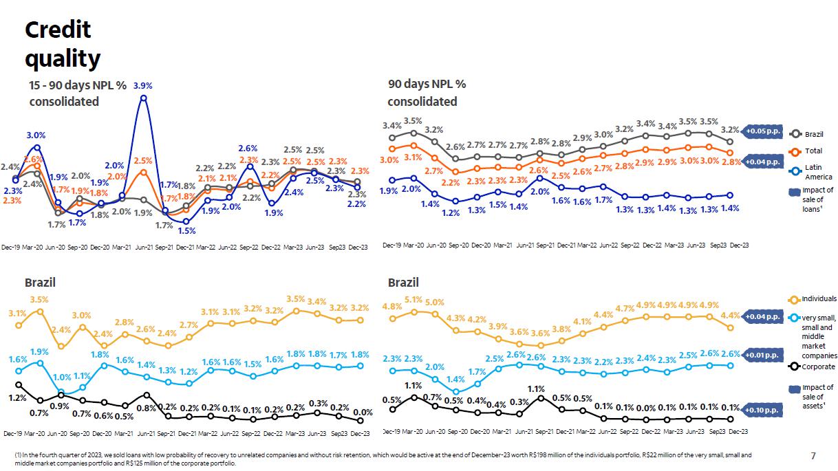 Qualidade do crédito Brasil Brasil Impacto cessão de créditos¹ consolidado consolidado +0,10 p.p. 3,0% 3,1% 2,7% 2,2% 2,3% 2,3% 2,3% 2,6% 2,5% 2,6% 2,7% 2,8%2,9% 2,9% 3,0%3,0% 2,8% 3,4% 3,5% 3,2% 2,6% 2,7% 2,7% 2,7% 2,8% 2,8% 2,9% 3,0% 3,2% 3,4% 3,4% 3,5% 3,5% 3,2% 1,9% 2,0% 1,4% 1,2% 1,3% 1,5% 1,4% 2,0% 1,6% 1,6% 1,7% 1,3% 1,3% 1,4% 1,3% 1,3% 1,4% dez/19mar/20 jun/20 set/20 dez/20mar/21 jun/21 set/21 dez/21mar/22 jun/22 set/22 dez/22mar/23 jun/23 set/23 dez/23 4,8% 5,1% 5,0% 4,3% 4,2% 3,9% 3,6% 3,6% 3,8% 4,1% 4,4% 4,7%4,9%4,9%4,9% 4,9% 4,4% 2,3% 2,3% 2,0% 1,4% 1,7% 2,5% 2,6%2,6% 2,3% 2,3% 2,2% 2,3% 2,4% 2,3% 2,5% 2,6% 2,6% 0,5% 1,1% 0,7% 0,5% 0,4%0,4% 0,3% 1,1% 0,5% 0,5% 0,1% 0,1% 0,0% 0,1% 0,1% 0,1% 0,1% dez/19mar/20 jun/20 set/20 dez/20mar/21 jun/21 set/21 dez/21mar/22 jun/22 set/22 dez/22mar/23 jun/23 set/23 dez/23 3,1% 3,5% 2,4% 3,0% 2,4% 2,8% 2,6% 2,4% 2,7% 3,1% 3,1% 3,2% 3,2% 3,5% 3,4% 3,2% 3,2% 1,6% 1,9% 1,0% 1,1% 1,8% 1,6% 1,4% 1,3% 1,2% 1,6% 1,6% 1,5% 1,6% 1,8% 1,8% 1,7% 1,8% 1,2% 0,7% 0,9% 0,7% 0,6%0,5% 0,8% 0,2% 0,2% 0,2% 0,1% 0,1% 0,2% 0,2% 0,3% 0,2% 0,0% dez/19mar/20 jun/20 set/20 dez/20mar/21 jun/21 set/21 dez/21 mar/22 jun/22 set/22 dez/22mar/23 jun/23 set/23 dez/23 (1) No quarto trimestre de 2023, realizamos vendas de créditos com baixa probabilidade de recuperação para empresas não ligadas e sem retenção de riscos, que estariam ativos ao final de dezembro/23 no valor de R$ 198 milhões da carteira de pessoas físicas, de R$ 22 milhões da carteira de micro, pequenas e médias empresas e de R$ 125 milhões da carteiras de grandes empresas.