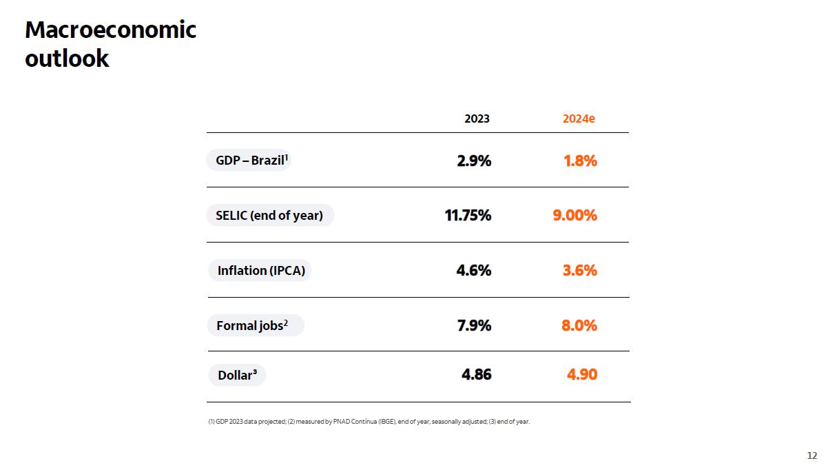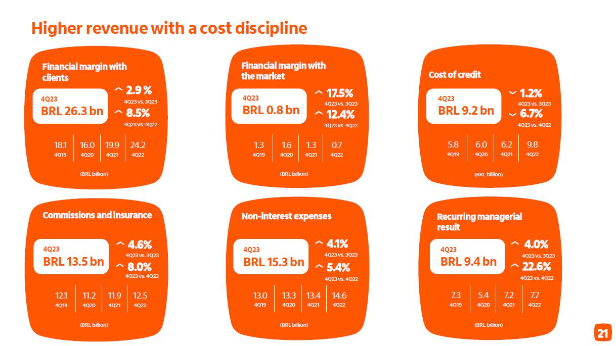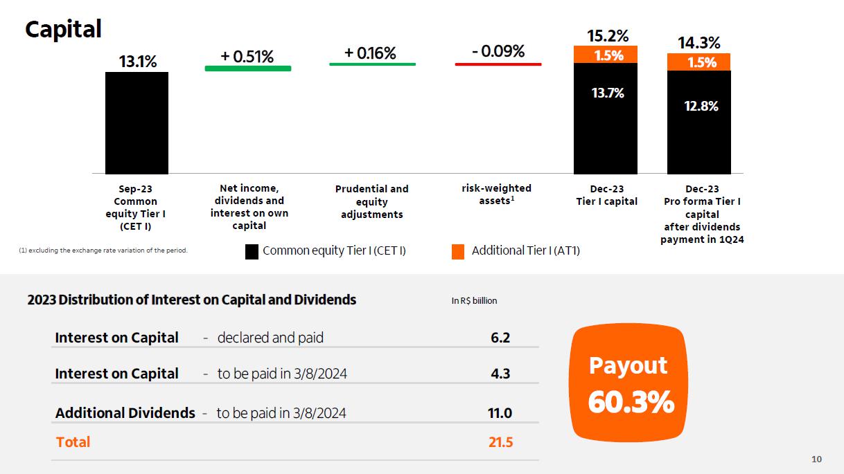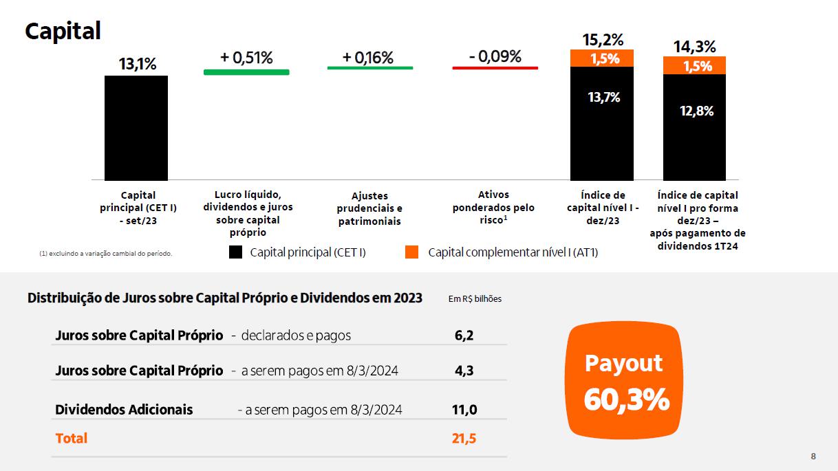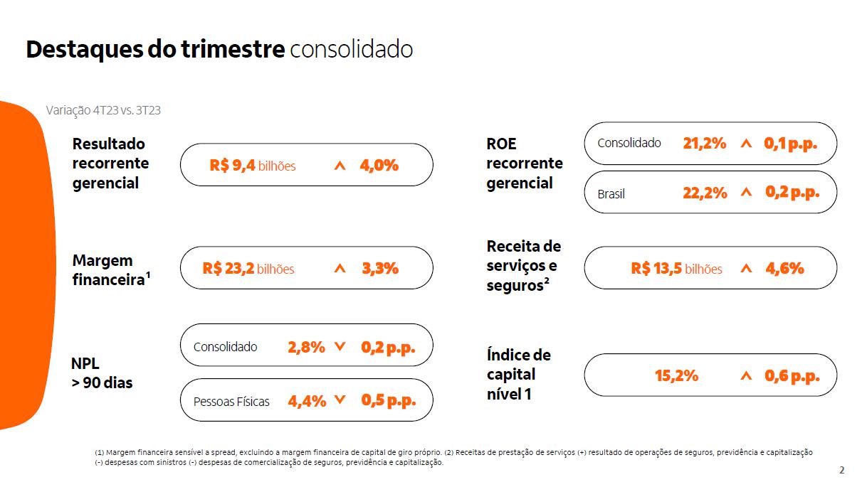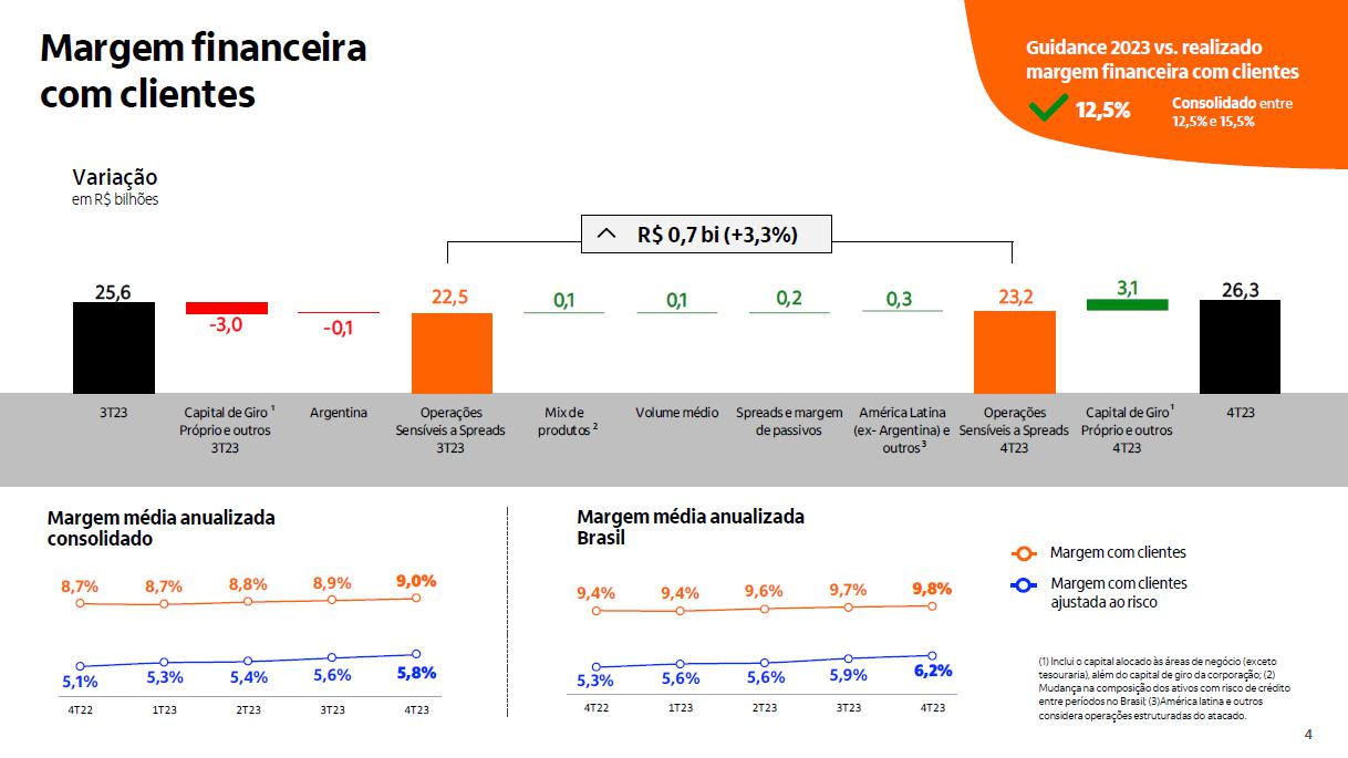 Qualidade do crédito Brasil Brasil Impacto cessão de créditos¹ consolidado consolidado +0,10 p.p. 3,0% 3,1% 2,7% 2,2% 2,3% 2,3% 2,3% 2,6% 2,5% 2,6% 2,7% 2,8%2,9% 2,9% 3,0%3,0% 2,8% 3,4% 3,5% 3,2% 2,6% 2,7% 2,7% 2,7% 2,8% 2,8% 2,9% 3,0% 3,2% 3,4% 3,4% 3,5% 3,5% 3,2% 1,9% 2,0% 1,4% 1,2% 1,3% 1,5% 1,4% 2,0% 1,6% 1,6% 1,7% 1,3% 1,3% 1,4% 1,3% 1,3% 1,4% dez/19mar/20 jun/20 set/20 dez/20mar/21 jun/21 set/21 dez/21mar/22 jun/22 set/22 dez/22mar/23 jun/23 set/23 dez/23 4,8% 5,1% 5,0% 4,3% 4,2% 3,9% 3,6% 3,6% 3,8% 4,1% 4,4% 4,7%4,9%4,9%4,9% 4,9% 4,4% 2,3% 2,3% 2,0% 1,4% 1,7% 2,5% 2,6%2,6% 2,3% 2,3% 2,2% 2,3% 2,4% 2,3% 2,5% 2,6% 2,6% 0,5% 1,1% 0,7% 0,5% 0,4%0,4% 0,3% 1,1% 0,5% 0,5% 0,1% 0,1% 0,0% 0,1% 0,1% 0,1% 0,1% dez/19mar/20 jun/20 set/20 dez/20mar/21 jun/21 set/21 dez/21mar/22 jun/22 set/22 dez/22mar/23 jun/23 set/23 dez/23 3,1% 3,5% 2,4% 3,0% 2,4% 2,8% 2,6% 2,4% 2,7% 3,1% 3,1% 3,2% 3,2% 3,5% 3,4% 3,2% 3,2% 1,6% 1,9% 1,0% 1,1% 1,8% 1,6% 1,4% 1,3% 1,2% 1,6% 1,6% 1,5% 1,6% 1,8% 1,8% 1,7% 1,8% 1,2% 0,7% 0,9% 0,7% 0,6%0,5% 0,8% 0,2% 0,2% 0,2% 0,1% 0,1% 0,2% 0,2% 0,3% 0,2% 0,0% dez/19mar/20 jun/20 set/20 dez/20mar/21 jun/21 set/21 dez/21 mar/22 jun/22 set/22 dez/22mar/23 jun/23 set/23 dez/23 (1) No quarto trimestre de 2023, realizamos vendas de créditos com baixa probabilidade de recuperação para empresas não ligadas e sem retenção de riscos, que estariam ativos ao final de dezembro/23 no valor de R$ 198 milhões da carteira de pessoas físicas, de R$ 22 milhões da carteira de micro, pequenas e médias empresas e de R$ 125 milhões da carteiras de grandes empresas.