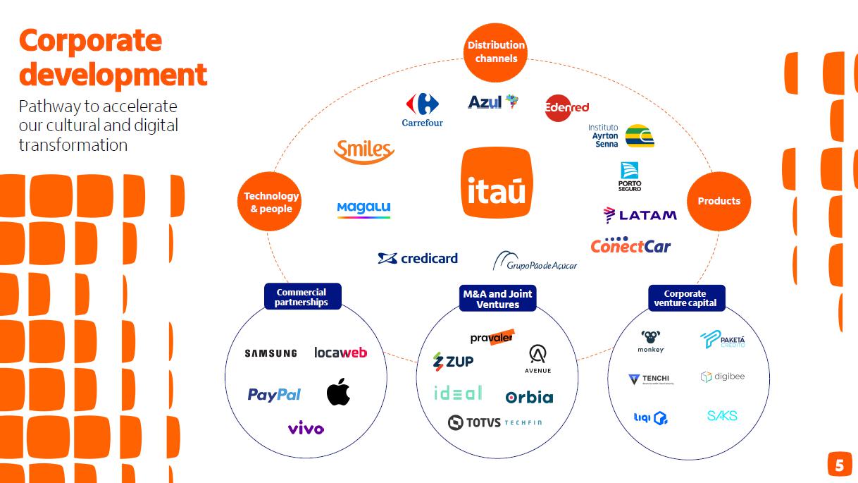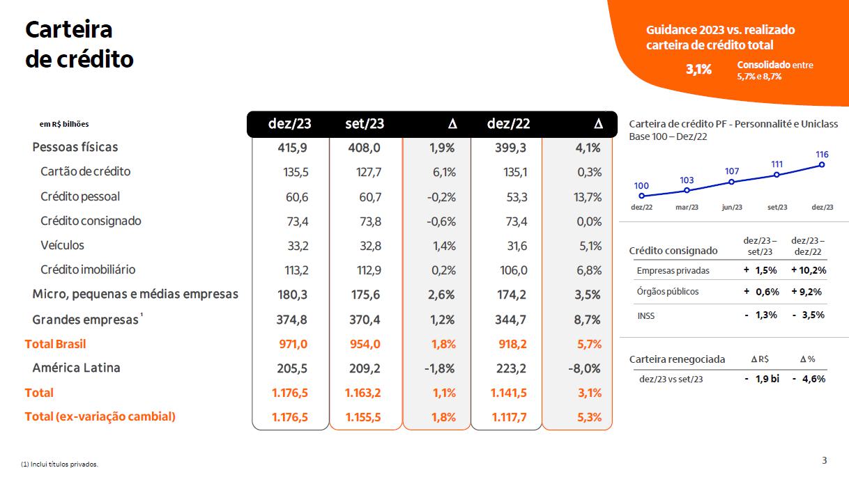 Margem financeira sensível a spread, excluindo a margem financeira de capital de giro próprio. (2) Receitas de prestação de serviços (+) resultado de operações de seguros, previdência e capitalização (-) despesas com sinistros (-) despesas de comercialização de seguros, previdência e capitalização. 0,2 p.p. 0,5 p.p. 4,4% Pessoas Físicas 2,8% Consolidado 3 Corporativo | Interno Carteira de crédito PF - Personnalité e Uniclass Base 100 – Dez/22 100 103 107 111 116 dez/22 mar/23 jun/23 set/23 dez/23 Carteira de crédito em R$ bilhões ¹ (1) Inclui títulos privados. dez/23 set/23 D dez/22 D Pessoas físicas 415,9 408,0 1,9% 399,3 4,1% Cartão de crédito 135,5 127,7 6,1% 135,1 0,3% Crédito pessoal 60,6 60,7 -0,2% 53,3 13,7% Crédito consignado 73,4 73,8 -0,6% 73,4 0,0% Veículos 33,2 32,8 1,4% 31,6 5,1% Crédito imobiliário 113,2 112,9 0,2% 106,0 6,8% Micro, pequenas e médias empresas 180,3 175,6 2,6% 174,2 3,5% Grandes empresas 374,8 370,4 1,2% 344,7 8,7% Total Brasil 971,0 954,0 1,8% 918,2 5,7% América Latina 205,5 209,2 -1,8% 223,2 -8,0% Total 1.176,5 1.163,2 1,1% 1.141,5 3,1% Total (ex-variação cambial) 1.176,5 1.155,5 1,8% 1.117,7 5,3% Guidance 2023 vs. realizado carteira de crédito total 3,1% Crédito consignado INSS Órgãos públicos 1,3% 0,6% - + 3,5% 9,2% - + Empresas privadas + 1,5% + 10,2% dez/23 – set/23 dez/23 – dez/22 Carteira renegociada dez/23 vs set/23 - 1,9 bi - 4,6% D R$ D % Consolidado entre 5,7% e 8,7% 4 Corporativo | Interno 25,6 22,5 23,2 26,3 -3,0 -0,1 0,1 0,1 0,2 0,3 3,1 3T23 Capital de Giro Próprio e outros 3T23 Argentina Operações Sensíveis a Spreads 3T23 Mix de produtos Volume médio Spreads e margem de passivos América Latina (ex- Argentina) e outros Operações Sensíveis a Spreads 4T23 Capital de Giro Próprio e outros 4T23 4T23 Variação em R$ bilhões Margem financeira com clientes (1) Inclui o capital alocado às áreas de negócio (exceto tesouraria), além do capital de giro da corporação; (2) Mudança na composição dos ativos com risco de crédito entre períodos no Brasil; (3)América latina e outros considera operações estruturadas do atacado. Margem com clientes Margem com clientes ajustada ao risco Margem média anualizada Brasil Margem média anualizada consolidado R$ 0,7 bi (+3,3%) ¹ 2 ¹ 3 8,7% 8,7% 8,8% 8,9% 9,0% 5,1% 5,3% 5,4% 5,6% 5,8% 4T22 1T23 2T23 3T23 4T23 9,4% 9,4% 9,6% 9,7% 9,8% 5,3% 5,6% 5,6% 5,9% 6,2% 4T22 1T23 2T23 3T23 4T23 4