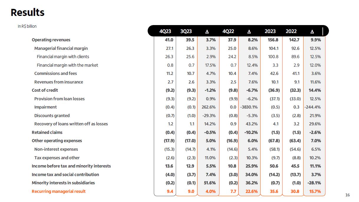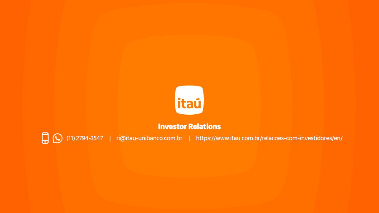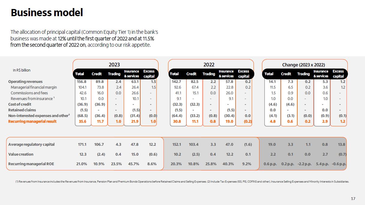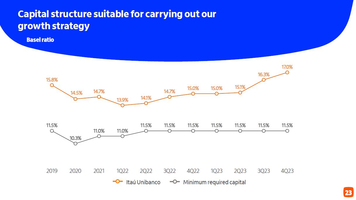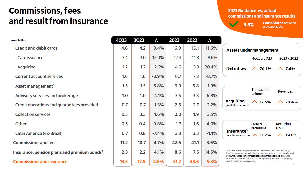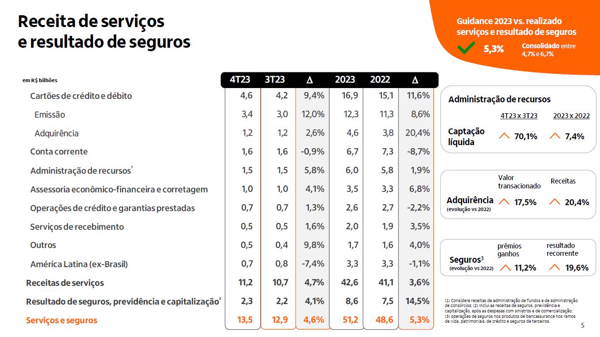 Receita de serviços e resultado de seguros ¹ em R$ bilhões Administração de recursos Guidance 2023 vs. realizado serviços e resultado de seguros Consolidado entre 4,7% e 6,7% 5,3% Seguros3 (evolução vs 2022) resultado recorrente 19,6% prêmios ganhos 11,2% Adquirência Receitas 20,4% Valor transacionado 17,5% (evolução vs 2022) ² 4T23 3T23 D 2023 2022 D Cartões de crédito e débito 4,6 4,2 9,4% 16,9 15,1 11,6% Emissão 3,4 3,0 12,0% 12,3 11,3 8,6% Adquirência 1,2 1,2 2,6% 4,6 3,8 20,4% Conta corrente 1,6 1,6 -0,9% 6,7 7,3 -8,7% Administração de recursos 1,5 1,5 5,8% 6,0 5,8 1,9% Assessoria econômico-financeira e corretagem 1,0 1,0 4,1% 3,5 3,3 6,8% Operações de crédito e garantias prestadas 0,7 0,7 1,3% 2,6 2,7 -2,2% Serviços de recebimento 0,5 0,5 1,6% 2,0 1,9 3,5% Outros 0,5 0,4 9,8% 1,7 1,6 4,0% América Latina (ex-Brasil) 0,7 0,8 -7,4% 3,3 3,3 -1,1% Receitas de serviços 11,2 10,7 4,7% 42,6 41,1 3,6% Resultado de seguros, previdência e capitalização 2,3 2,2 4,1% 8,6 7,5 14,5% Serviços e seguros 13,5 12,9 4,6% 51,2 48,6 5,3% Captação líquida 2023 x 2022 7,4% 4T23 x 3T23 70,1% (1) Considera receitas de administração de fundos e de administração de consórcios; (2) Inclui as receitas de seguros, previdência e capitalização, após as despesas com sinistros e de comercialização; (3) operações de seguros nos produtos de bancassurance nos ramos de vida, patrimoniais, de crédito e seguros de terceiros.