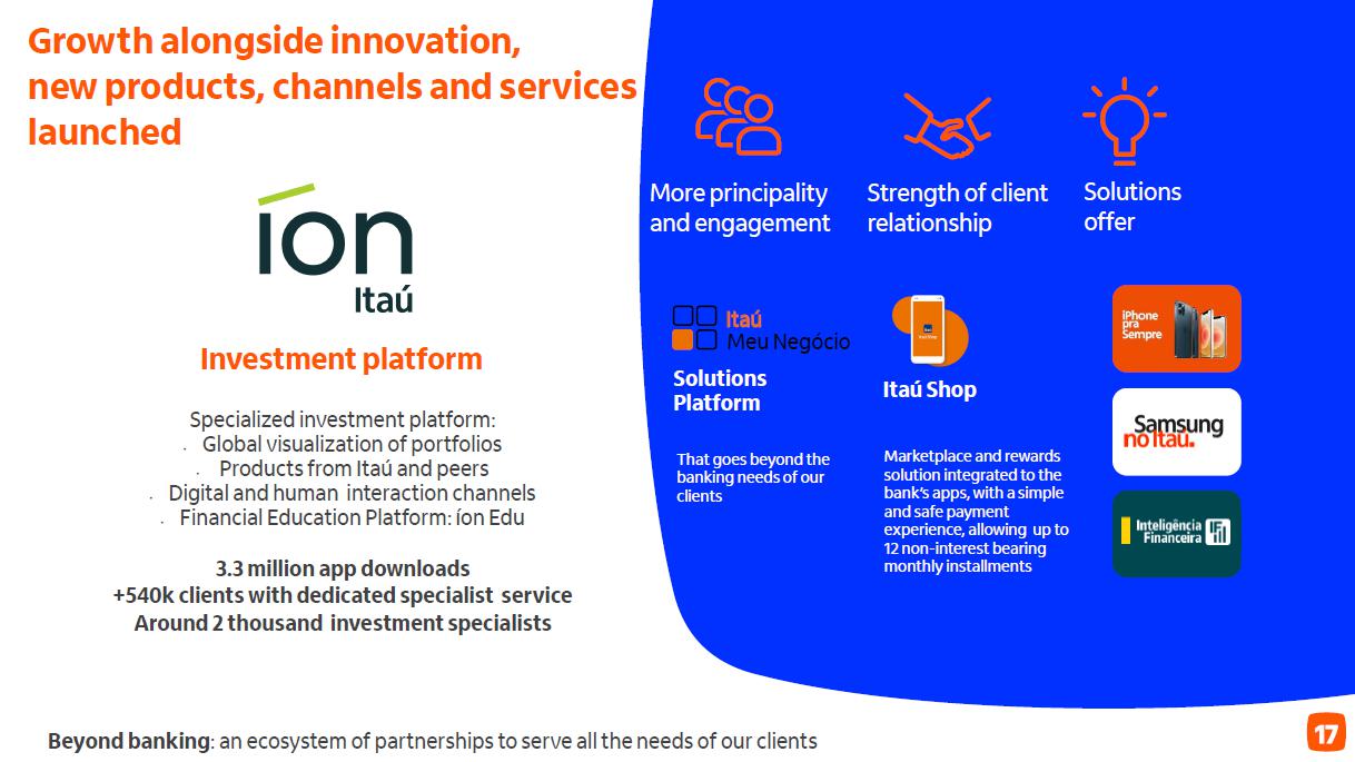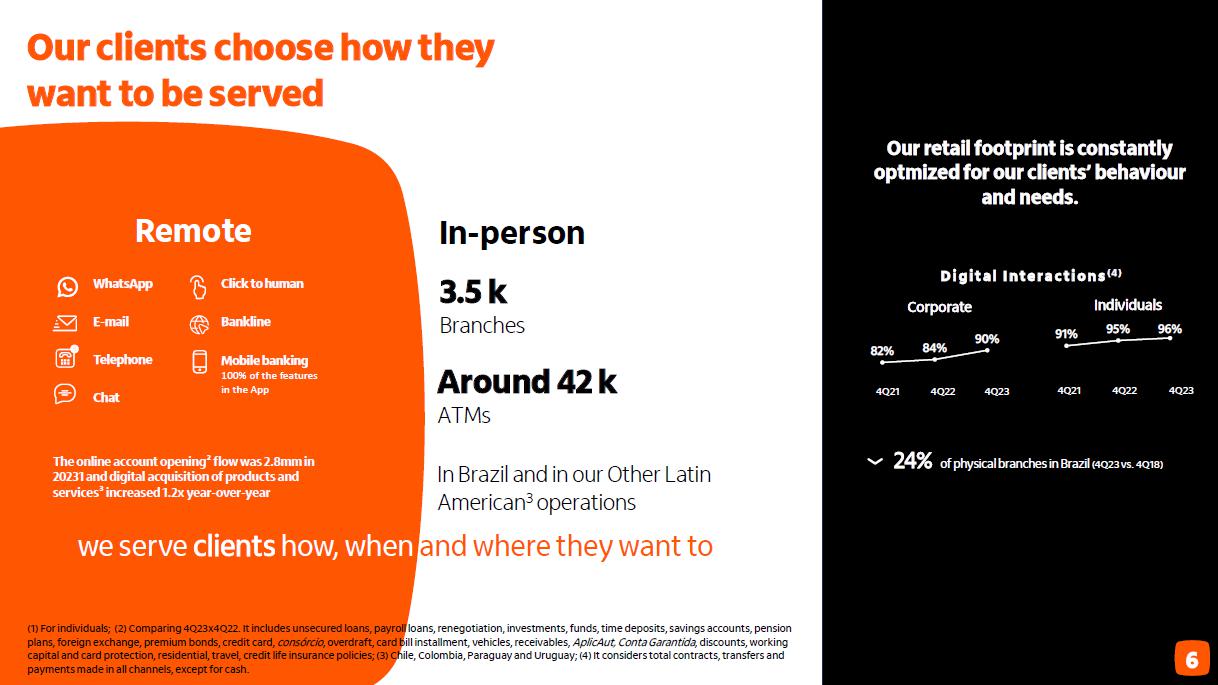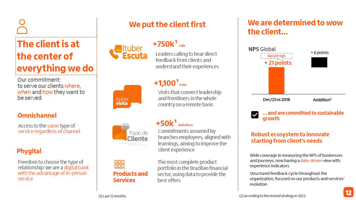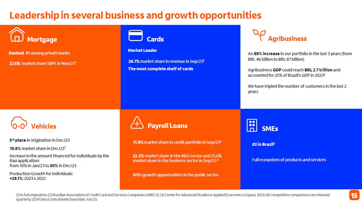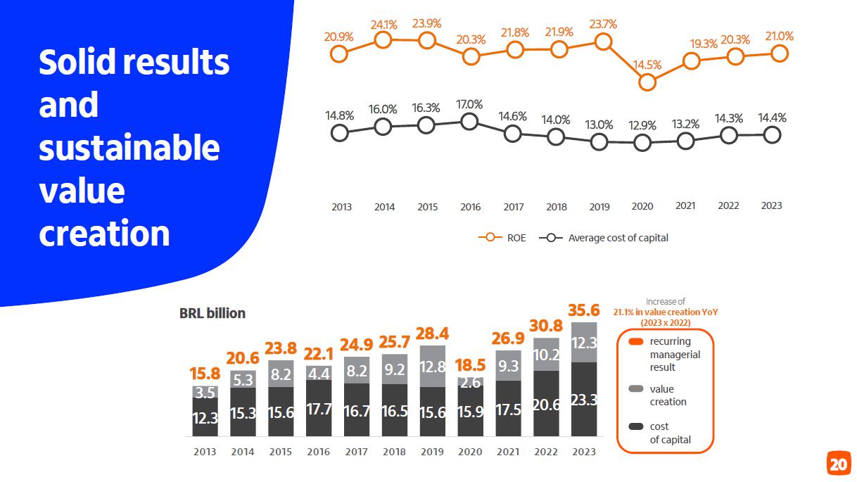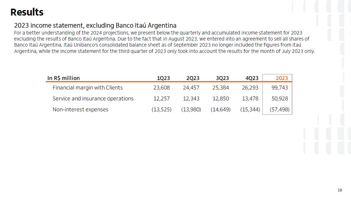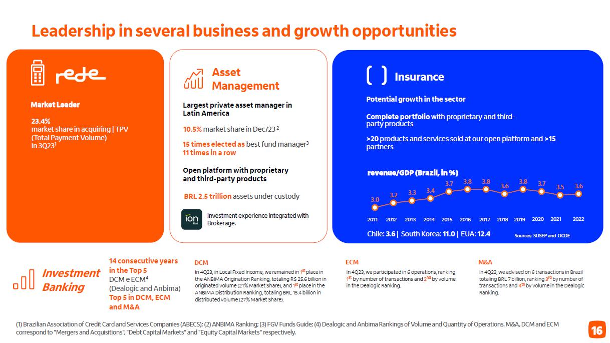 Receita de serviços e resultado de seguros ¹ em R$ bilhões Administração de recursos Guidance 2023 vs. realizado serviços e resultado de seguros Consolidado entre 4,7% e 6,7% 5,3% Seguros3 (evolução vs 2022) resultado recorrente 19,6% prêmios ganhos 11,2% Adquirência Receitas 20,4% Valor transacionado 17,5% (evolução vs 2022) ² 4T23 3T23 D 2023 2022 D Cartões de crédito e débito 4,6 4,2 9,4% 16,9 15,1 11,6% Emissão 3,4 3,0 12,0% 12,3 11,3 8,6% Adquirência 1,2 1,2 2,6% 4,6 3,8 20,4% Conta corrente 1,6 1,6 -0,9% 6,7 7,3 -8,7% Administração de recursos 1,5 1,5 5,8% 6,0 5,8 1,9% Assessoria econômico-financeira e corretagem 1,0 1,0 4,1% 3,5 3,3 6,8% Operações de crédito e garantias prestadas 0,7 0,7 1,3% 2,6 2,7 -2,2% Serviços de recebimento 0,5 0,5 1,6% 2,0 1,9 3,5% Outros 0,5 0,4 9,8% 1,7 1,6 4,0% América Latina (ex-Brasil) 0,7 0,8 -7,4% 3,3 3,3 -1,1% Receitas de serviços 11,2 10,7 4,7% 42,6 41,1 3,6% Resultado de seguros, previdência e capitalização 2,3 2,2 4,1% 8,6 7,5 14,5% Serviços e seguros 13,5 12,9 4,6% 51,2 48,6 5,3% Captação líquida 2023 x 2022 7,4% 4T23 x 3T23 70,1% (1) Considera receitas de administração de fundos e de administração de consórcios; (2) Inclui as receitas de seguros, previdência e capitalização, após as despesas com sinistros e de comercialização; (3) operações de seguros nos produtos de bancassurance nos ramos de vida, patrimoniais, de crédito e seguros de terceiros.