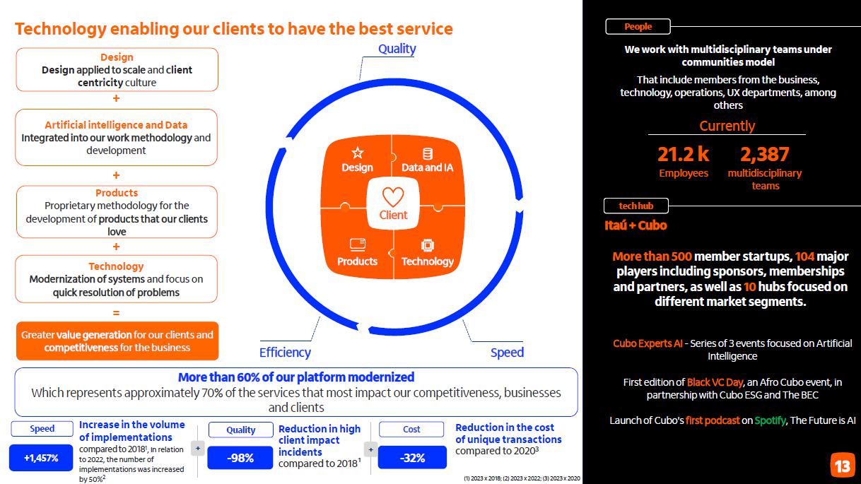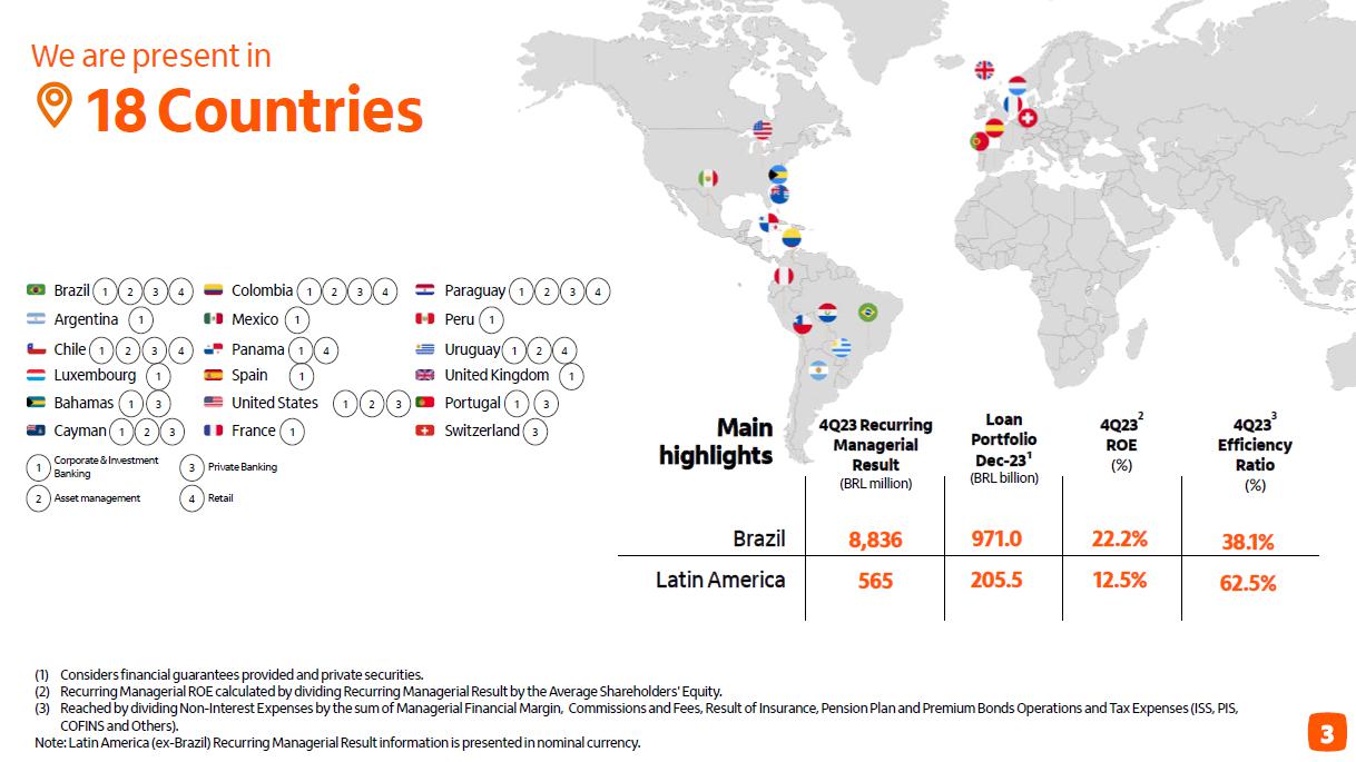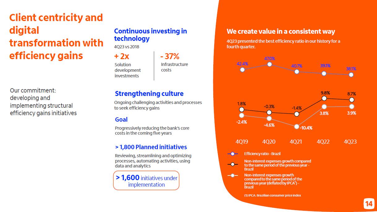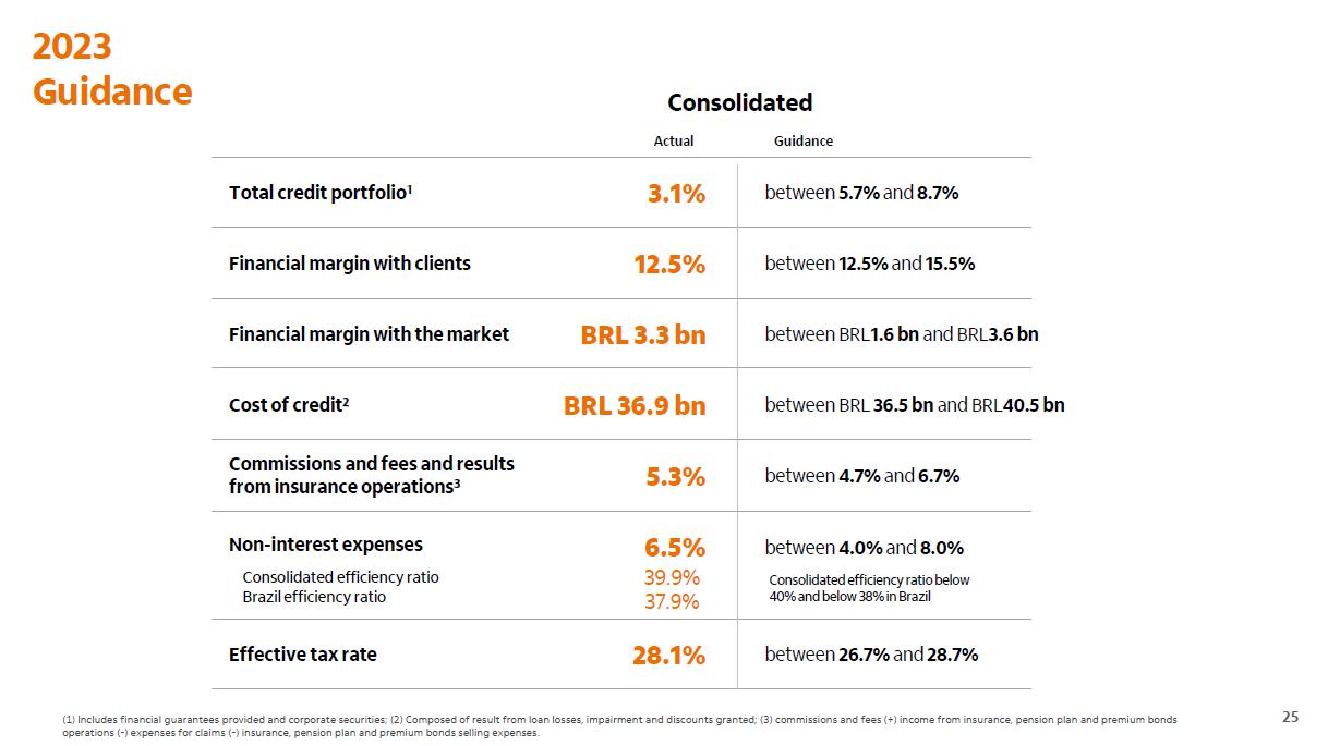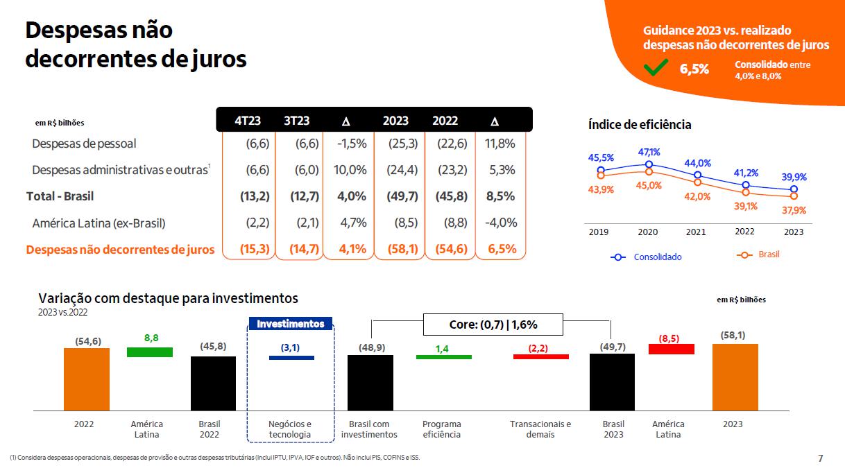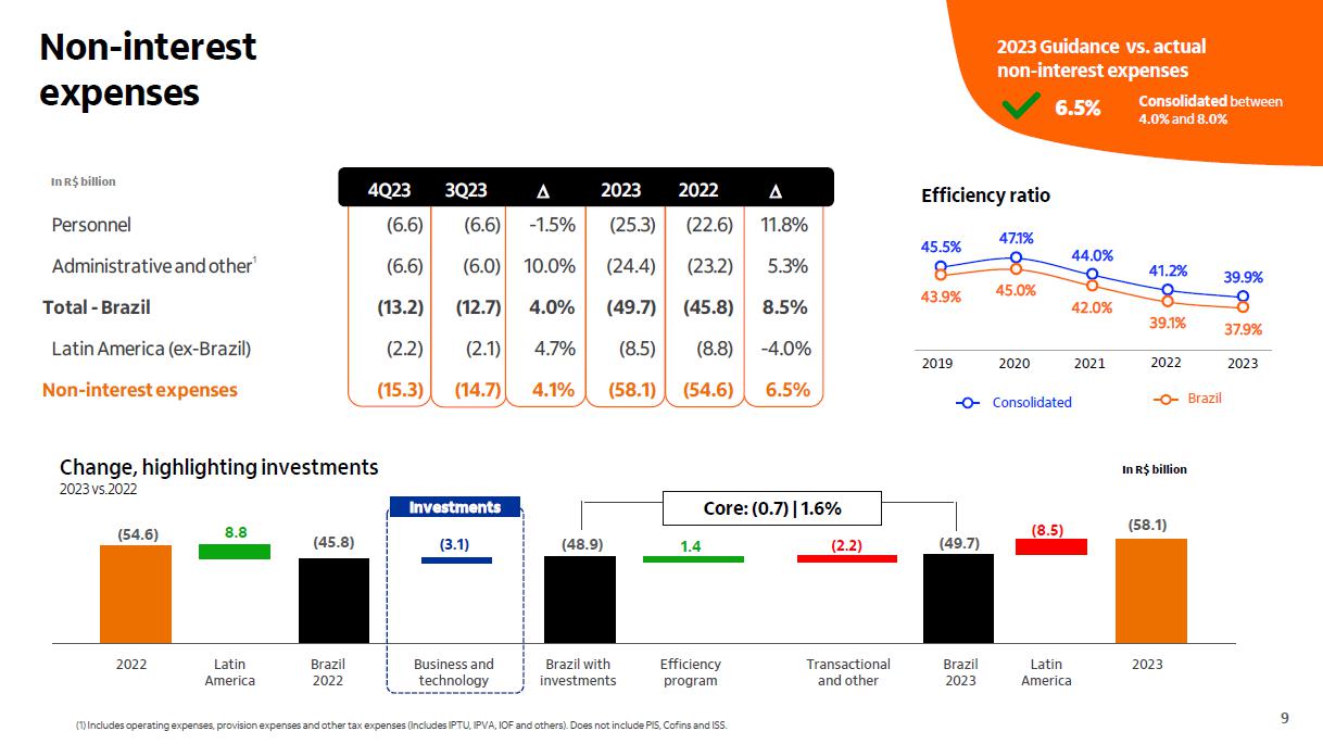 Despesas não decorrentes de juros Variação com destaque para investimentos 2023 vs.2022 (54,6) América Latina Brasil 2022 2022 América Latina 8,8 (45,8) (8,5) Core: (0,7) | 1,6% Negócios e tecnologia (3,1) Brasil 2023 (49,7) Programa eficiência 1,4 2023 (58,1) Brasil com investimentos (48,9) (2,2) Transacionais e demais Investimentos 1 em R$ bilhões Consolidado Brasil índice de eficiência 2019 2020 2021 2022 2023 guidance 2023 vs. realizado despesas não decorrentes de juros Consolidado 6,5% entre 4,0% e 8,0% Guidance 2023 vs. realizado despesas não decorrentes de juros Consolidado entre 4,0% e 8,0% 6,5% em R$ bilhões 4T23 3T23 D 2023 2022 D Despesas de pessoal (6,6) (6,6) -1,5% (25,3) (22,6) 11,8% Despesas administrativas e outras (6,6) (6,0) 10,0% (24,4) (23,2) 5,3% Total - Brasil (13,2) (12,7) 4,0% (49,7) (45,8) 8,5% América Latina (ex-Brasil) (2,2) (2,1) 4,7% (8,5) (8,8) -4,0% Despesas não decorrentes de juros (15,3) (14,7) 4,1% (58,1) (54,6) 6,5% (1) Considera despesas operacionais, despesas de provisão e outras despesas tributárias (Inclui IPTU, IPVA, IOF e outros). Não inclui PIS, COFINS e ISS.