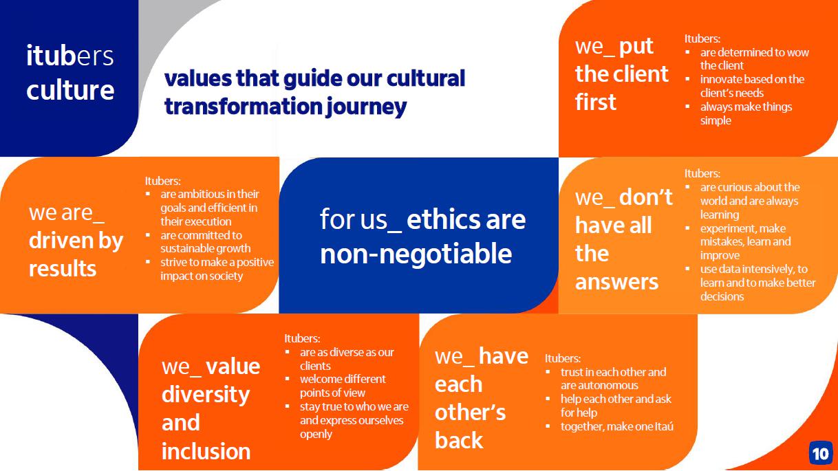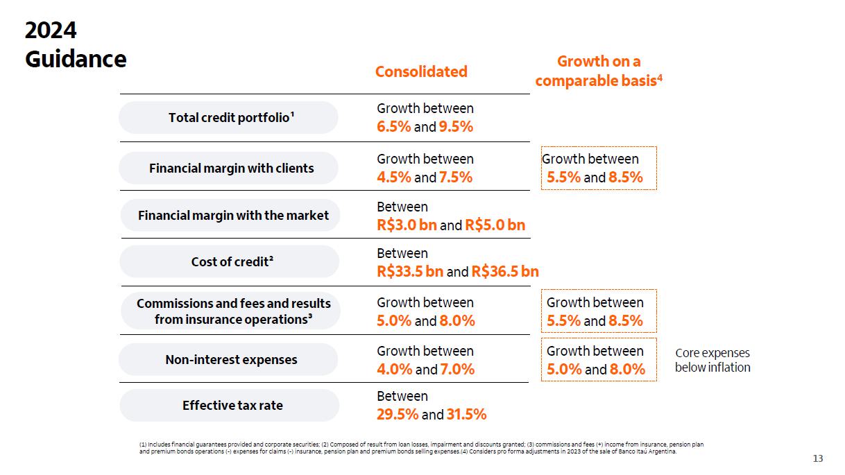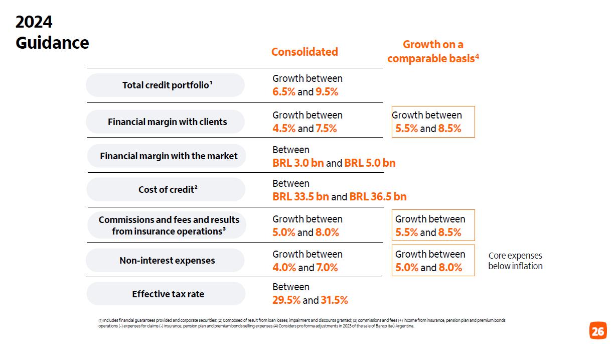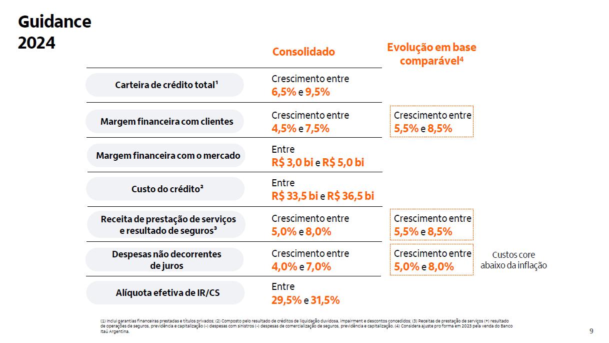 9 Corporativo | Interno (1) Inclui garantias financeiras prestadas e títulos privados; (2) Composto pelo resultado de créditos de liquidação duvidosa, impairment e descontos concedidos; (3) Receitas de prestação de serviços (+) resultado de operações de seguros, previdência e capitalização (-) despesas com sinistros (-) despesas de comercialização de seguros, previdência e capitalização. (4) Considera ajuste pro forma em 2023 pela venda do Banco Itaú Argentina. Consolidado Carteira de crédito total¹ Margem financeira com clientes Custo do crédito² Margem financeira com o mercado Receita de prestação de serviços e resultado de seguros³ Despesas não decorrentes de juros Alíquota efetiva de IR/CS Crescimento entre 6,5% e 9,5% Entre 29,5% e 31,5% Crescimento entre 4,0% e 7,0% Crescimento entre 5,0% e 8,0% Entre R$ 33,5 bi e R$ 36,5 bi Entre R$ 3,0 bi e R$ 5,0 bi Crescimento entre 4,5% e 7,5%