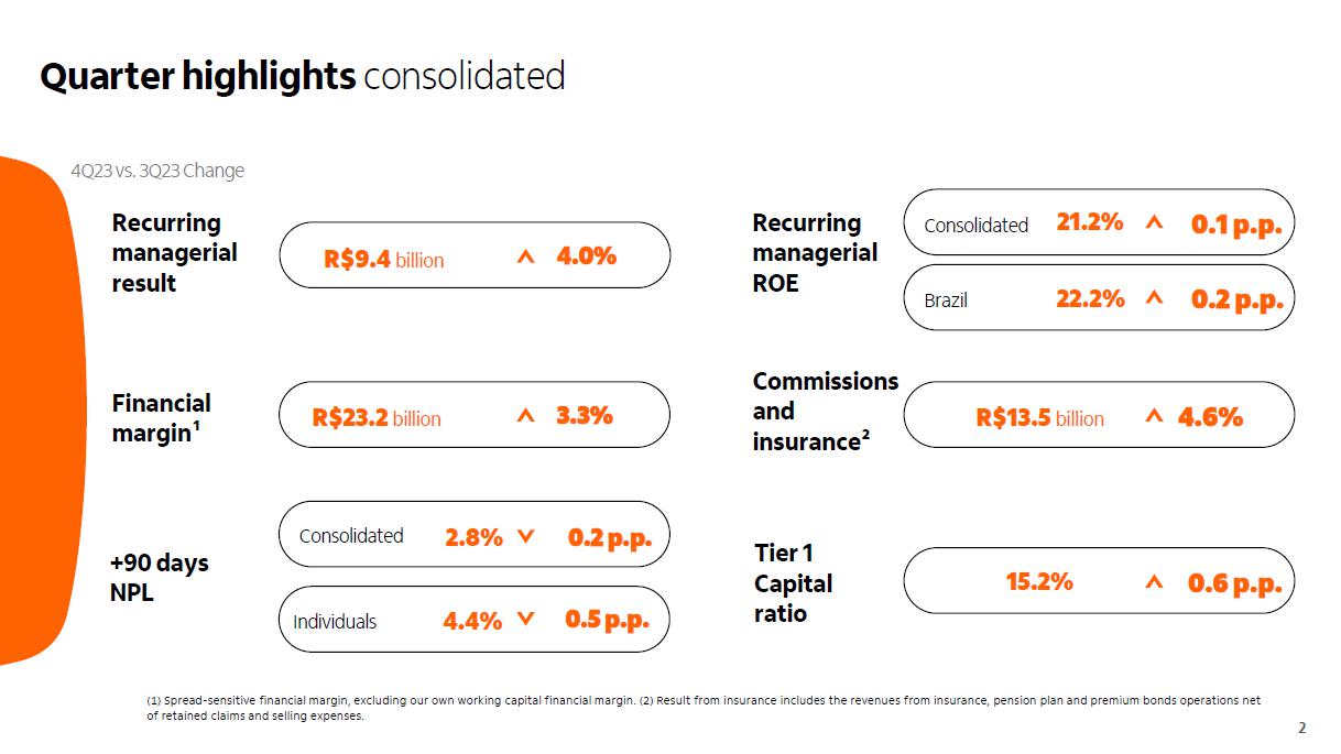 Quarter highlights consolidated 4Q23 vs. 3Q23 Change Quarter highlights consolidated (1) Spread sensitive financial margin, excluding our own working capital financial margin. (2 ) Result from insurance includes the revenues from insurance, pension plan and premium bonds operations net of retained claims and selling expenses.