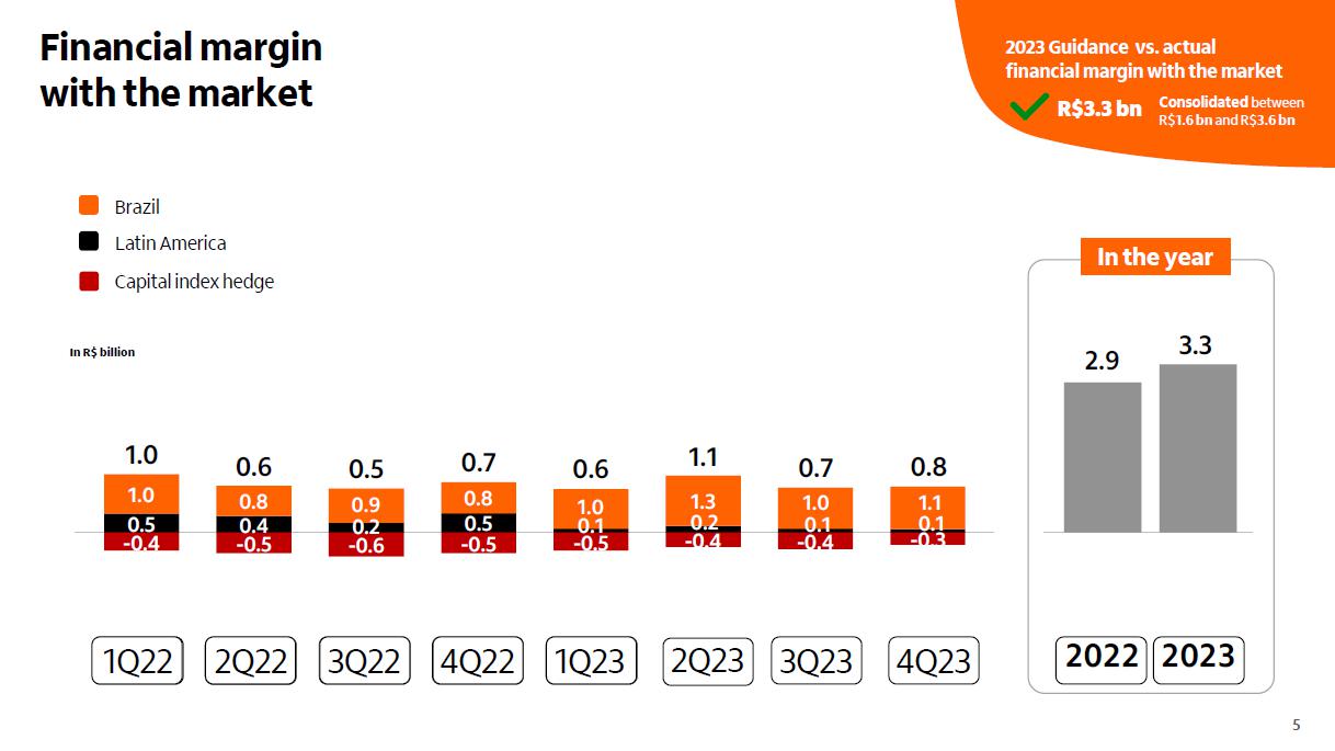 Carteira de crédito em R$ bilhões ¹ (1) Inclui títulos privados. dez/23 set/23 D dez/22 D Pessoas físicas 415,9 408,0 1,9% 399,3 4,1% Cartão de crédito 135,5 127,7 6,1% 135,1 0,3% Crédito pessoal 60,6 60,7 -0,2% 53,3 13,7% Crédito consignado 73,4 73,8 -0,6% 73,4 0,0% Veículos 33,2 32,8 1,4% 31,6 5,1% Crédito imobiliário 113,2 112,9 0,2% 106,0 6,8% Micro, pequenas e médias empresas 180,3 175,6 2,6% 174,2 3,5% Grandes empresas 374,8 370,4 1,2% 344,7 8,7% Total Brasil 971,0 954,0 1,8% 918,2 5,7% América Latina 205,5 209,2 -1,8% 223,2 -8,0% Total 1.176,5 1.163,2 1,1% 1.141,5 3,1% Total (ex-variação cambial) 1.176,5 1.155,5 1,8% 1.117,7 5,3% Guidance 2023 vs. realizado carteira de crédito total 3,1% Crédito consignado INSS Órgãos públicos 1,3% 0,6% - + 3,5% 9,2% - + Empresas privadas + 1,5% + 10,2% dez/23 – set/23 dez/23 – dez/22 Carteira renegociada dez/23 vs set/23 - 1,9 bi - 4,6% D R$ D % Consolidado entre 5,7% e 8,7% 4 Corporativo | Interno 25,6 22,5 23,2 26,3 -3,0 -0,1 0,1 0,1 0,2 0,3 3,1 3T23 Capital de Giro Próprio e outros 3T23 Argentina Operações Sensíveis a Spreads 3T23 Mix de produtos Volume médio Spreads e margem de passivos América Latina (ex- Argentina) e outros Operações Sensíveis a Spreads 4T23 Capital de Giro Próprio e outros 4T23 4T23 Variação em R$ bilhões