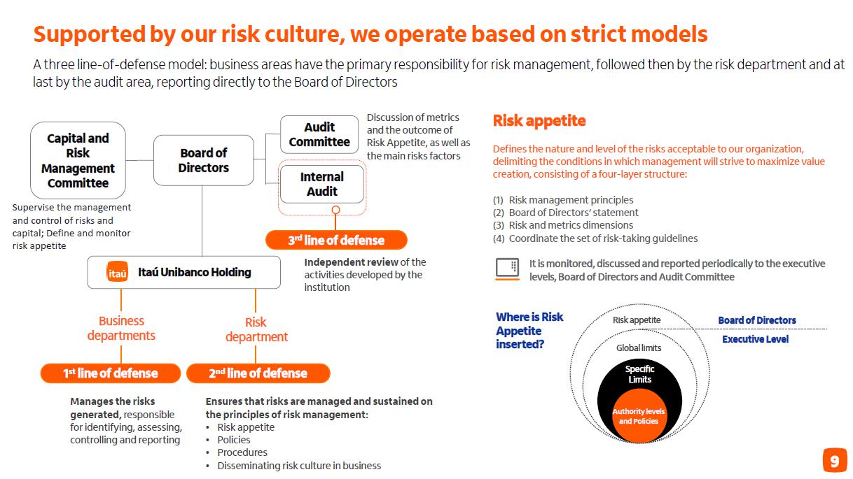 Capital Capital principal (CET I) - set/23 Lucro líquido, dividendos e juros sobre capital próprio Índice de capital nível I - dez/23 11,3% 13,1% + 0,51% Ativos ponderados pelo risco1 - 0,09% 1,5% 13,7% 15,2% + 0,16% Ajustes prudenciais e patrimoniais Índice de capital nível I pro forma dez/23 – após pagamento de dividendos 1T24 1,5% 12,8% 14,3% Distribuição de Juros sobre Capital Próprio e Dividendos em 2023 60,3% Payout Em R$ bilhões 8