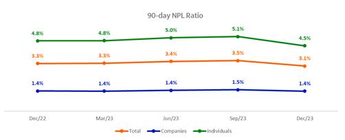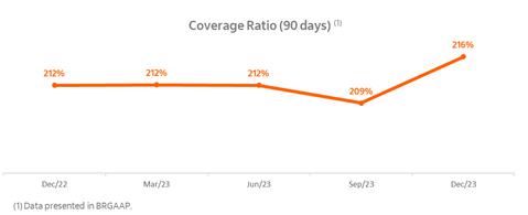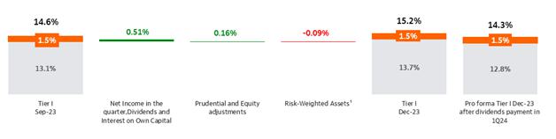 The Basel Ratio reached 17.0% at 12/31/2023, an increase of 2.0 p.p. compared to 12/31/2022, due to the result for the period and reduction of Risk-Weighted Assets. In Risk-Weighted Assets, noteworthy is the reduction in the credit component due to the enactment of BACEN Resolution Nº 229 and Resolution N° 303 with evolution of internal models.