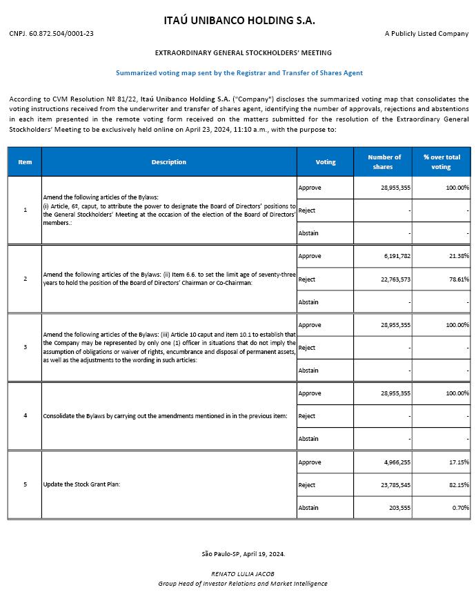 ITAÚ UNIBANCO - Summarized voting map sent by the Registrar and Transfer of Shares Agent