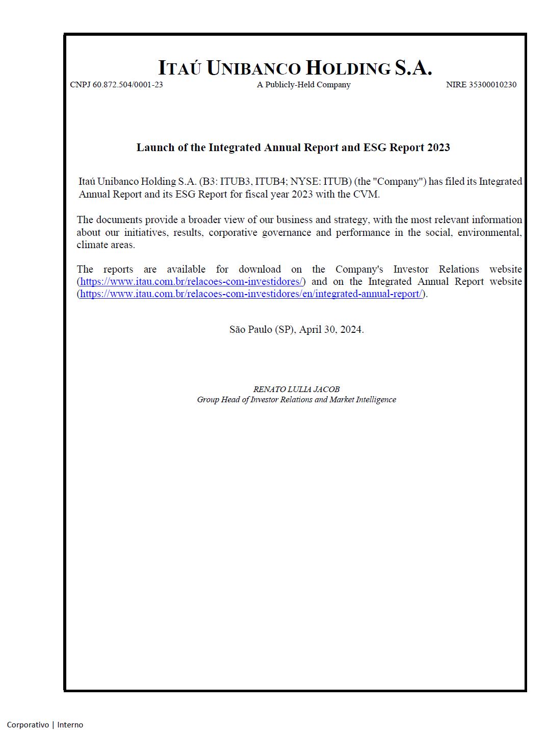 ITAÚ UNIBANCO HOLDING S.A. CNPJ 60.872.504/0001-23 A Publicly-Held Company NIRE 35300010230 Launch of the Integrated Annual Report and ESG Report 2023 Itaú Unibanco Holding S.A. (B3: ITUB3, ITUB4; NYSE: ITUB) (the "Company") has filed its Integrated Annual Report and its ESG Report for fiscal year 2023 with the CVM. The documents provide a broader view of our business and strategy, with the most relevant information about our initiatives, results, corporative governance and performance in the social, environmental, climate areas. The reports are available for download on the Company's Investor Relations website (https://www.itau.com.br/relacoes-com-investidores/) and on the Integrated Annual Report website (https://www.itau.com.br/relacoes-com-investidores/en/integrated-annual-report/). São Paulo (SP), April 30, 2024. RENATO LULIA JACOB Group Head of Investor Relations and Market Intelligence