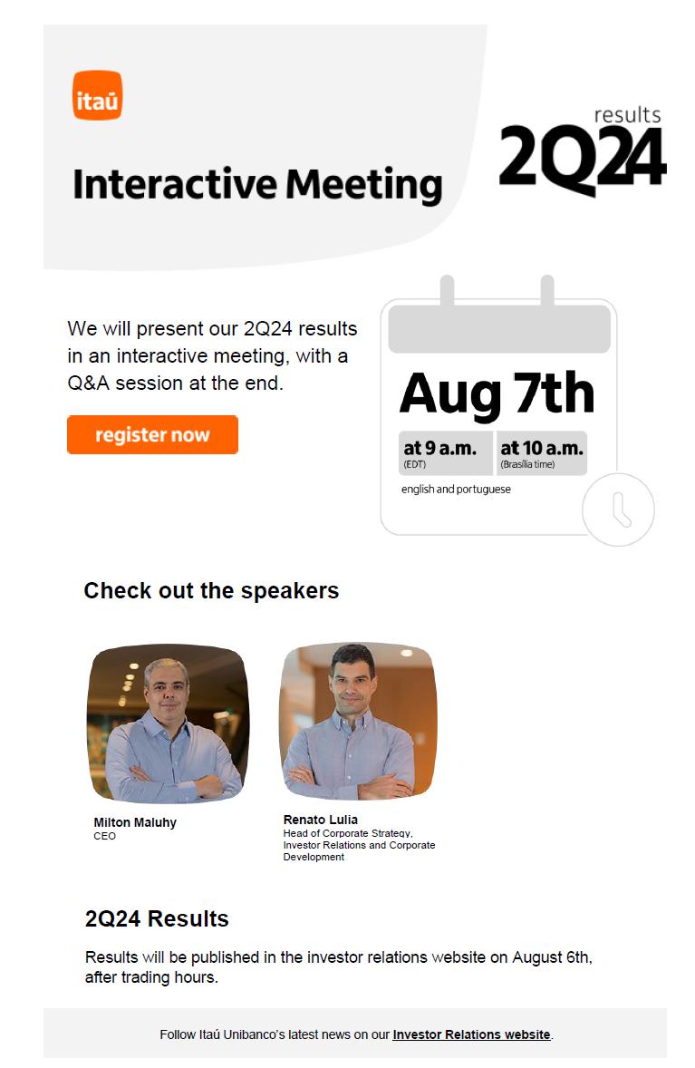 We will present our 2Q24 results in an interactive meeting, with a Q&A session at the end. Check out the speakers Milton Maluhy CEO Renato Lulia Head of Corporate Strategy, Investor Relations and Corporate Development 2Q24 Results Results will be published in the investor relations website on August 6th, after trading hours. Follow Itaú Unibanco’s latest news on our Investor Relations website.