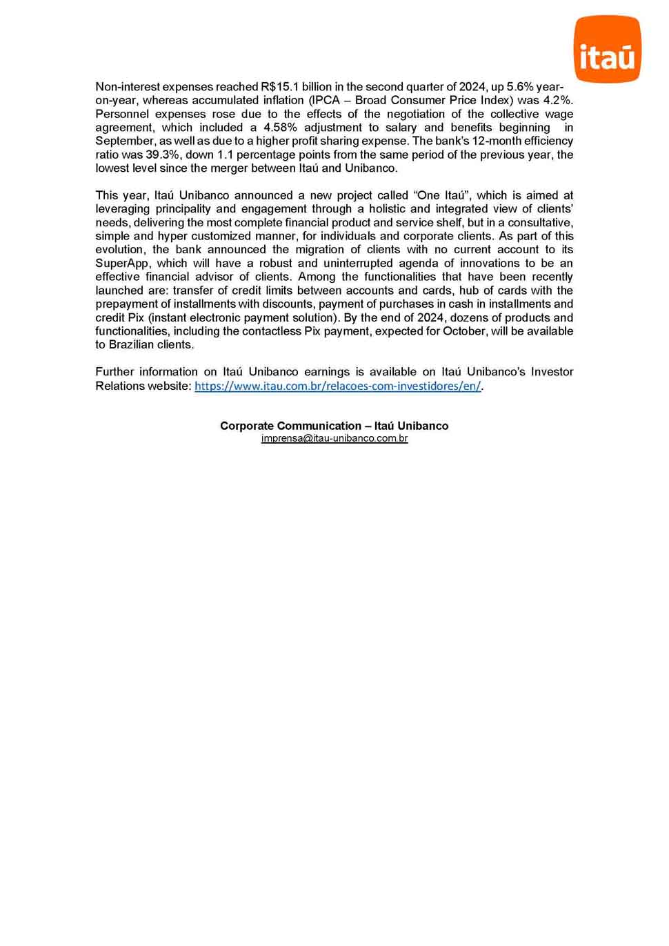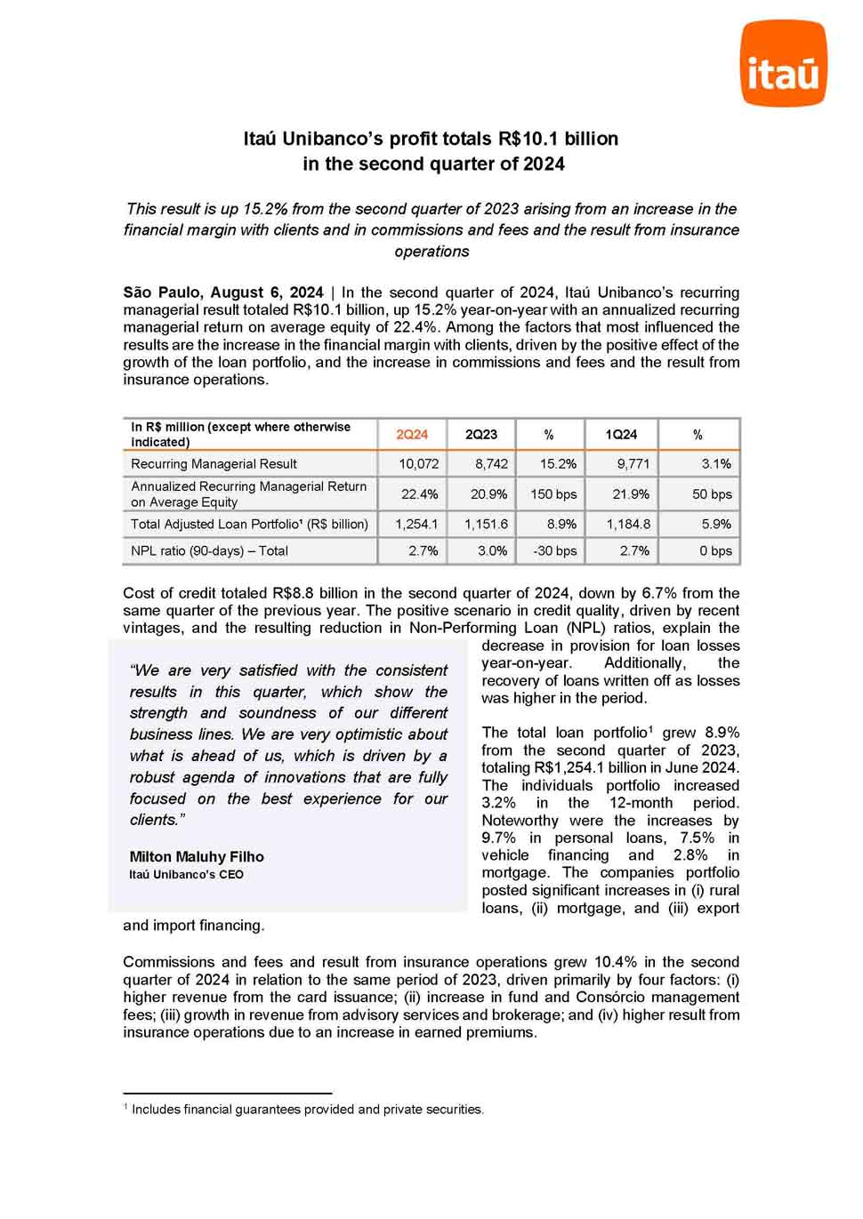 Itaú Unibanco’s profit totals R$10.1 billion in the second quarter of 2024 This result is up 15.2% from the second quarter of 2023 arising from an increase in the financial margin with clients and in commissions and fees and the result from insurance operations São Paulo, August 6, 2024 | In the second quarter of 2024, Itaú Unibanco’s recurring managerial result totaled R$10.1 billion, up 15.2% year-on-year with an annualized recurring managerial return on average equity of 22.4%. Among the factors that most influenced the results are the increase in the financial margin with clients, driven by the positive effect of the growth of the loan portfolio, and the increase in commissions and fees and the result from insurance operations. Cost of credit totaled R$8.8 billion in the second quarter of 2024, down by 6.7% from the same quarter of the previous year. The positive scenario in credit quality, driven by recent vintages, and the resulting reduction in Non-Performing Loan (NPL) ratios, explain the decrease in provision for loan losses year-on-year. Additionally, the recovery of loans written off as losses was higher in the period. The total loan portfolio1 grew 8.9% from the second quarter of 2023, totaling R$1,254.1 billion in June 2024. The individuals portfolio increased 3.2% in the 12-month period. Noteworthy were the increases by 9.7% in personal loans, 7.5% in vehicle financing and 2.8% in mortgage. The companies portfolio posted significant increases in (i) rural loans, (ii) mortgage, and (iii) export and import financing. Commissions and fees and result from insurance operations grew 10.4% in the second quarter of 2024 in relation to the same period of 2023, driven primarily by four factors: (i) higher revenue from the card issuance; (ii) increase in fund and Consórcio management fees; (iii) growth in revenue from advisory services and brokerage; and (iv) higher result from insurance operations due to an increase in earned premiums. 1 Includes financial guarantees provided and private securities. In R$ million (except where otherwise indicated) 2Q24 2Q23 % 1Q24 % Recurring Managerial Result 10,072 8,742 15.2% 9,771 3.1% Annualized Recurring Managerial Return on Average Equity 22.4% 20.9% 150 bps 21.9% 50 bps Total Adjusted Loan Portfolio¹ (R$ billion) 1,254.1 1,151.6 8.9% 1,184.8 5.9% NPL ratio (90-days) – Total 2.7% 3.0% -30 bps 2.7% 0 bps “We are very satisfied with the consistent results in this quarter, which show the strength and soundness of our different business lines. We are very optimistic about what is ahead of us, which is driven by a robust agenda of innovations that are fully focused on the best experience for our clients.” Milton Maluhy Filho Itaú Unibanco’s CEO Non-interest expenses reached R$15.1 billion in the second quarter of 2024, up 5.6% yearon- year, whereas accumulated inflation (IPCA – Broad Consumer Price Index) was 4.2%. Personnel expenses rose due to the effects of the negotiation of the collective wage agreement, which included a 4.58% adjustment to salary and benefits beginning in September, as well as due to a higher profit sharing expense. The bank’s 12-month efficiency ratio was 39.3%, down 1.1 percentage points from the same period of the previous year, the lowest level since the merger between Itaú and Unibanco. This year, Itaú Unibanco announced a new project called “One Itaú”, which is aimed at leveraging principality and engagement through a holistic and integrated view of clients’ needs, delivering the most complete financial product and service shelf, but in a consultative, simple and hyper customized manner, for individuals and corporate clients. As part of this evolution, the bank announced the migration of clients with no current account to its SuperApp, which will have a robust and uninterrupted agenda of innovations to be an effective financial advisor of clients. Among the functionalities that have been recently launched are: transfer of credit limits between accounts and cards, hub of cards with the prepayment of installments with discounts, payment of purchases in cash in installments and credit Pix (instant electronic payment solution). By the end of 2024, dozens of products and functionalities, including the contactless Pix payment, expected for October, will be available to Brazilian clients. Further information on Itaú Unibanco earnings is available on Itaú Unibanco’s Investor Relations website: https://www.itau.com.br/relacoes-com-investidores/en/. Corporate Communication – Itaú Unibanco imprensa@itau-unibanco.com.br