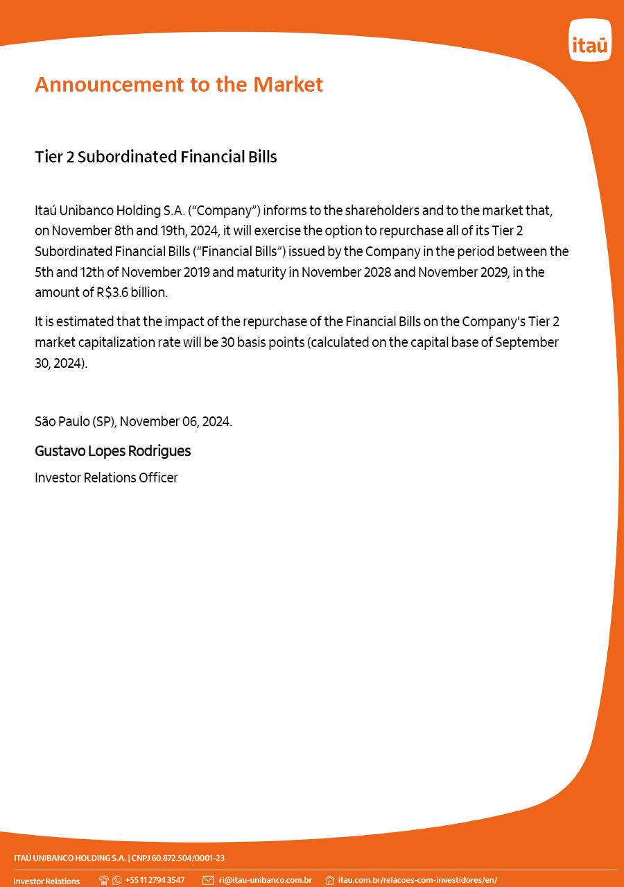 ANNOUNCEMENT TO THE MARKET - TIER 2 SUBORDINATED FINANCIAL BILLS