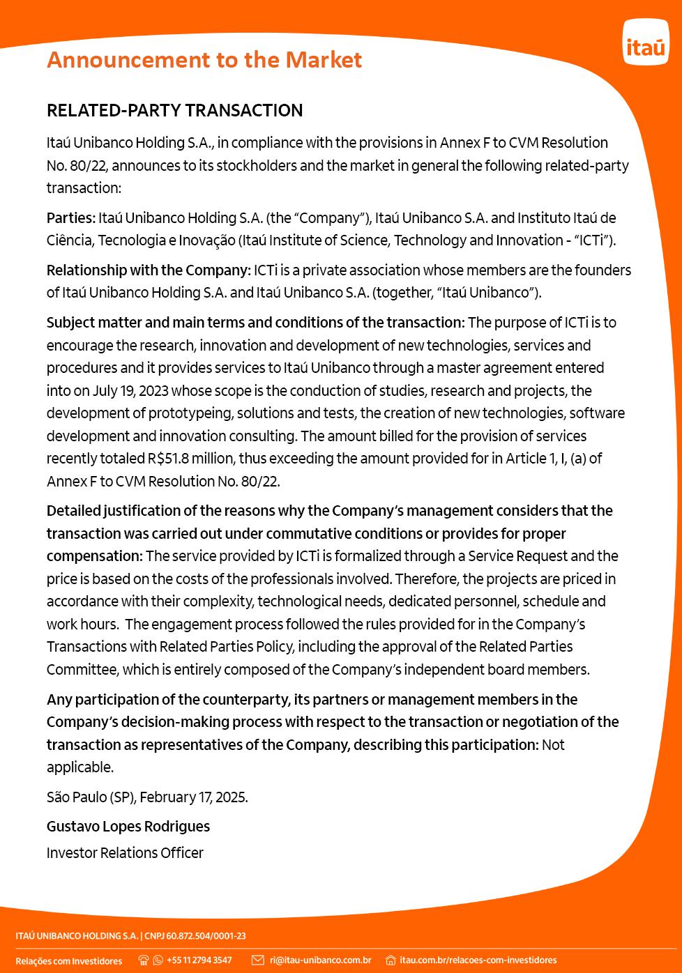 Announcement to the Market RELATED-PARTY TRANSACTION Itaú Unibanco Holding S.A., in compliance with the provisions in Annex F to CVM Resolution No. 80/22, announces to its stockholders and the market in general the following related-party transaction: Parties: Itaú Unibanco Holding S.A. (the “Company”), Itaú Unibanco S.A. and Instituto Itaú de Ciência, Tecnologia e Inovação (Itaú Institute of Science, Technology and Innovation - “ICTi”). Relationship with the Company: ICTi is a private association whose members are the founders of Itaú Unibanco Holding S.A. and Itaú Unibanco S.A. (together, “Itaú Unibanco”). Subject matter and main terms and conditions of the transaction: The purpose of ICTi is to encourage the research, innovation and development of new technologies, services and procedures and it provides services to Itaú Unibanco through a master agreement entered into on July 19, 2023 whose scope is the conduction of studies, research and projects, the development of prototypeing, solutions and tests, the creation of new technologies, software development and innovation consulting. The amount billed for the provision of services recently totaled R$51.8 million, thus exceeding the amount provided for in Article 1, I, (a) of Annex F to CVM Resolution No. 80/22. Detailed justification of the reasons why the Company’s management considers that the transaction was carried out under commutative conditions or provides for proper compensation: The service provided by ICTi is formalized through a Service Request and the price is based on the costs of the professionals involved. Therefore, the projects are priced in accordance with their complexity, technological needs, dedicated personnel, schedule and work hours. The engagement process followed the rules provided for in the Company’s Transactions with Related Parties Policy, including the approval of the Related Parties Committee, which is entirely composed of the Company’s independent board members. Any participation of the counterparty, its partners or management members in the Company’s decision-making process with respect to the transaction or negotiation of the transaction as representatives of the Company, describing this participation: Not applicable. São Paulo (SP), February 17, 2025. Gustavo Lopes Rodrigues Investor Relations Officer