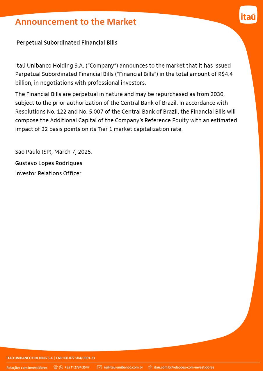 ANNOUNCEMENT TO THE MARKET - PERPETUAL SUBORDINATED FINANCIAL BILLS