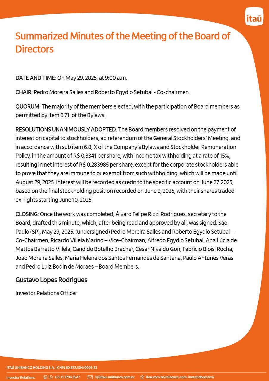 SUMMARIZED MINUTES OF THE MEETING OF THE BOARD OF DIRECTORS ON MAY 29, 2025