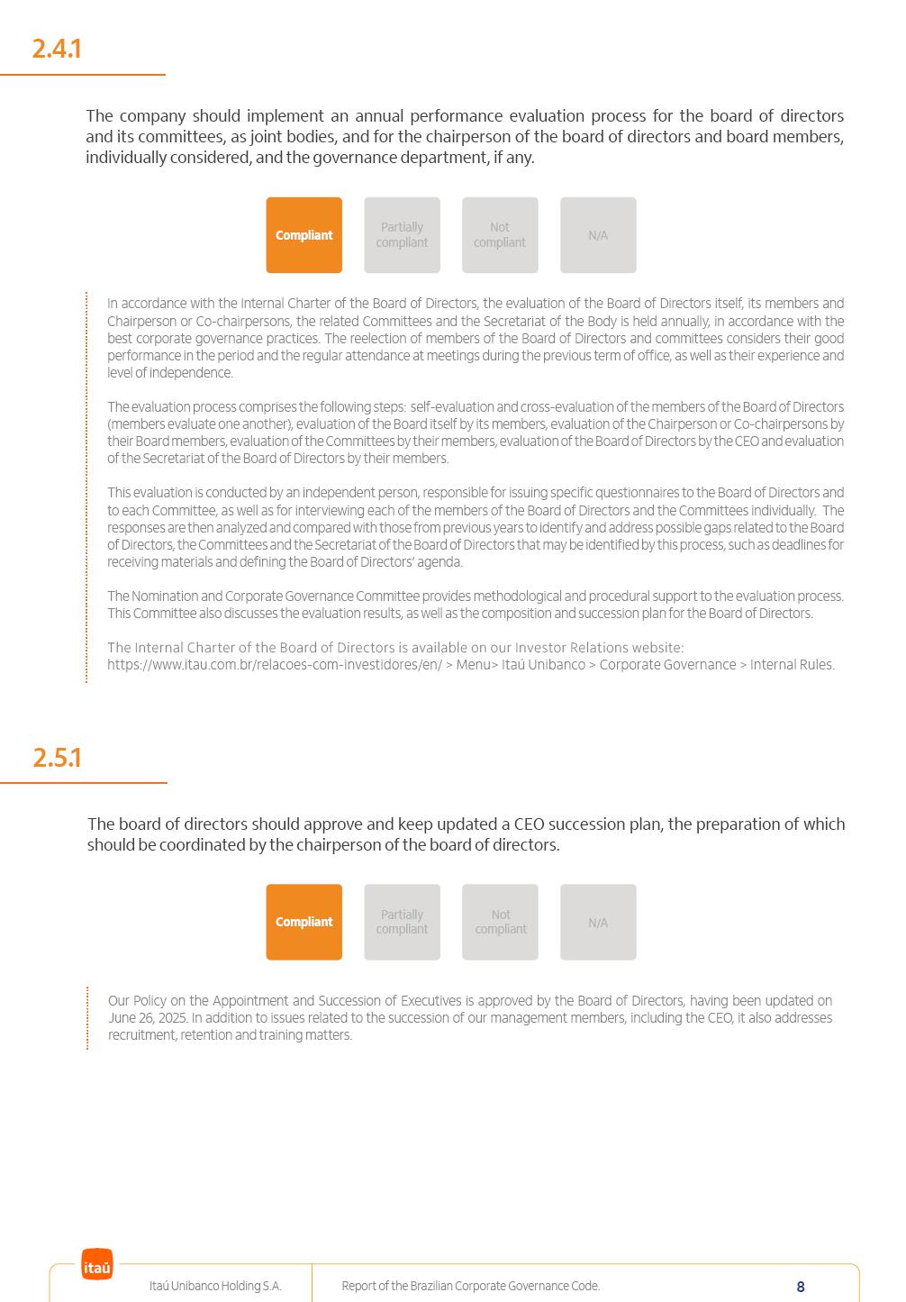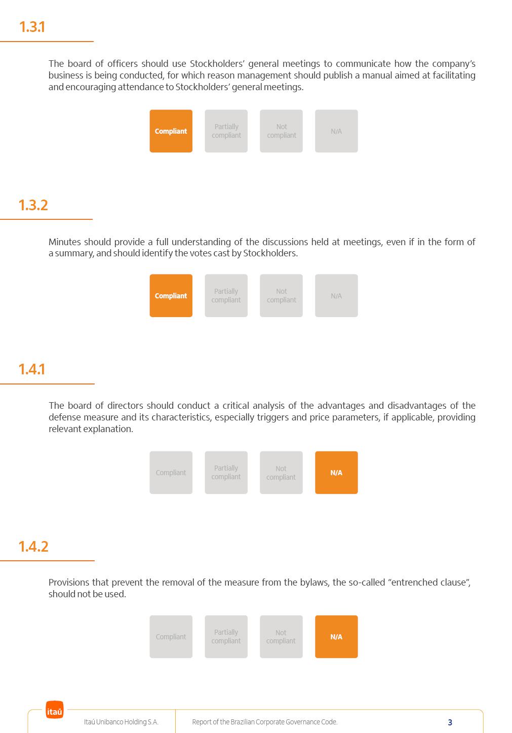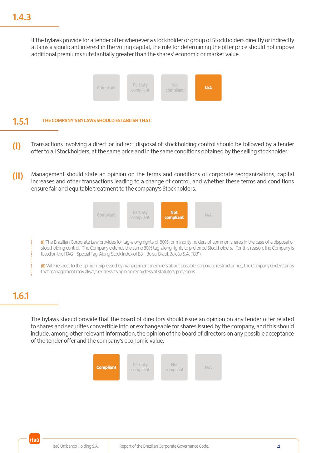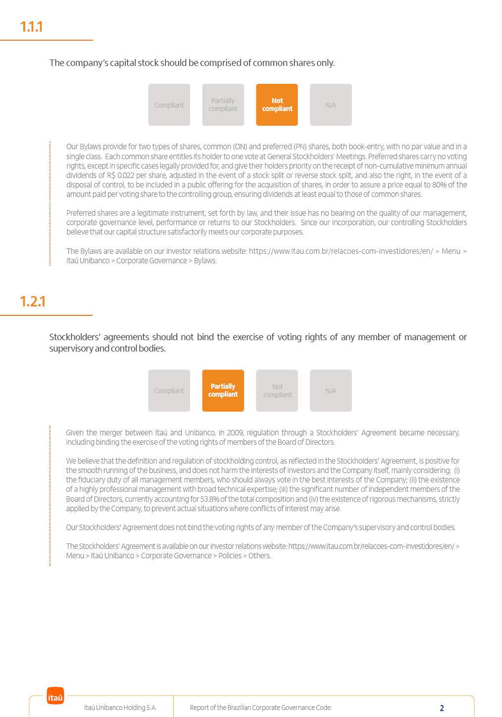 Report of theBrazilian CorporateGovernance CodeItaú Unibanco Holding S.A.July / 202520252025 Itaú Unibanco Holding S.A. Report of the Brazilian Corporate Governance Code. 2 Partially compliant Compliant N/A Not compliant 1.1.1 Partially compliant Compliant N/A Not compliant The company’s capital stock should be comprised of common shares only. Our Bylaws provide for two types of shares, common (ON) and preferred (PN) shares, both book-entry, with no par value and in a single class. Each common share entitles its holder to one vote at General Stockholders’ Meetings. Preferred shares carry no voting rights, except in specific cases legally provided for, and give their holders priority on the receipt of non-cumulative minimum annual dividends of R$ 0.022 per share, adjusted in the event of a stock split or reverse stock split, and also the right, in the event of a disposal of control, to be included in a public offering for the acquisition of shares, in order to assure a price equal to 80% of the amount paid per voting share to the controlling group, ensuring dividends at least equal to those of common shares. Preferred shares are a legitimate instrument, set forth by law, and their issue has no bearing on the quality of our management, corporate governance level, performance or returns to our Stockholders. Since our incorporation, our controlling Stockholders believe that our capital structure satisfactorily meets our corporate purposes. The Bylaws are available on our investor relations website: https://www.itau.com.br/relacoes-com-investidores/en/ > Menu > Itaú Unibanco > Corporate Governance > Bylaws. 1.2.1 Stockholders’ agreements should not bind the exercise of voting rights of any member of management or supervisory and control bodies. Given the merger between Itaú and Unibanco, in 2009, regulation through a Stockholders’ Agreement became necessary, including binding the exercise of the voting rights of members of the Board of Directors. We believe that the definition and regulation of stockholding control, as reflected in the Stockholders’ Agreement, is positive for the smooth running of the business, and does not harm the interests of investors and the Company itself, mainly considering: (i) the fiduciary duty of all management members, who should always vote in the best interests of the Company; (ii) the existence of a highly professional management with broad technical expertise; (iii) the significant number of independent members of the Board of Directors, currently accounting for 53.8% of the total composition and (iv) the existence of rigorous mechanisms, strictly applied by the Company, to prevent actual situations where conflicts of interest may arise. Our Stockholders’ Agreement does not bind the voting rights of any member of the Company’s supervisory and control bodies. The Stockholders’ Agreement is available on our investor relations website: https://www.itau.com.br/relacoes-com-investidores/en/ > Menu > Itaú Unibanco > Corporate Governance > Policies > Others. Itaú Unibanco Holding S.A. Report of the Brazilian Corporate Governance Code. 3 Partially compliant Compliant N/A Not compliant 1.3.1 The board of officers should use Stockholders’ general meetings to communicate how the company’s business is being conducted, for which reason management should publish a manual aimed at facilitating and encouraging attendance to Stockholders’ general meetings. Partially compliant Compliant N/A Not compliant 1.4.1 The board of directors should conduct a critical analysis of the advantages and disadvantages of the defense measure and its characteristics, especially triggers and price parameters, if applicable, providing relevant explanation. Partially compliant Compliant N/A Not compliant Minutes should provide a full understanding of the discussions held at meetings, even if in the form of a summary, and should identify the votes cast by Stockholders. 1.3.2 Partially compliant N/A Not compliant Provisions that prevent the removal of the measure from the bylaws, the so-called “entrenched clause”, should not be used. 1.4.2 Compliant Itaú Unibanco Holding S.A. Report of the Brazilian Corporate Governance Code. 4 Partially compliant N/A Not compliant Partially compliant N/A Not compliant 1.5.1 Transactions involving a direct or indirect disposal of stockholding control should be followed by a tender offer to all Stockholders, at the same price and in the same conditions obtained by the selling stockholder; (I) THE COMPANY’S BYLAWS SHOULD ESTABLISH THAT: (II) Management should state an opinion on the terms and conditions of corporate reorganizations, capital increases and other transactions leading to a change of control, and whether these terms and conditions ensure fair and equitable treatment to the company’s Stockholders. (I) The Brazilian Corporate Law provides for tag-along rights of 80% for minority holders of common shares in the case of a disposal of stockholding control. The Company extends the same 80% tag-along rights to preferred Stockholders. For this reason, the Company is listed on the ITAG – Special Tag-Along Stock Index of B3 – Bolsa, Brasil, Balcão S.A. (“B3”). (II) With respect to the opinion expressed by management members about possible corporate restructurings, the Company understands that management may always express its opinion regardless of statutory provisions. 1.6.1 The bylaws should provide that the board of directors should issue an opinion on any tender offer related to shares and securities convertible into or exchangeable for shares issued by the company, and this should include, among other relevant information, the opinion of the board of directors on any possible acceptance of the tender offer and the company’s economic value. Partially compliant N/A Not compliant If the bylaws provide for a tender offer whenever a stockholder or group of Stockholders directly or indirectly attains a significant interes