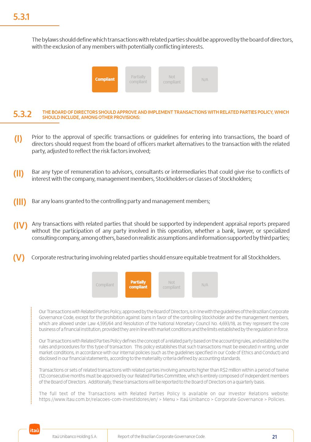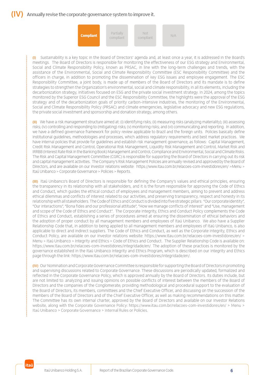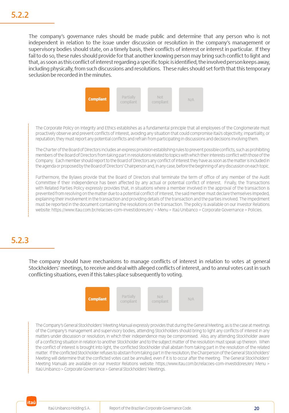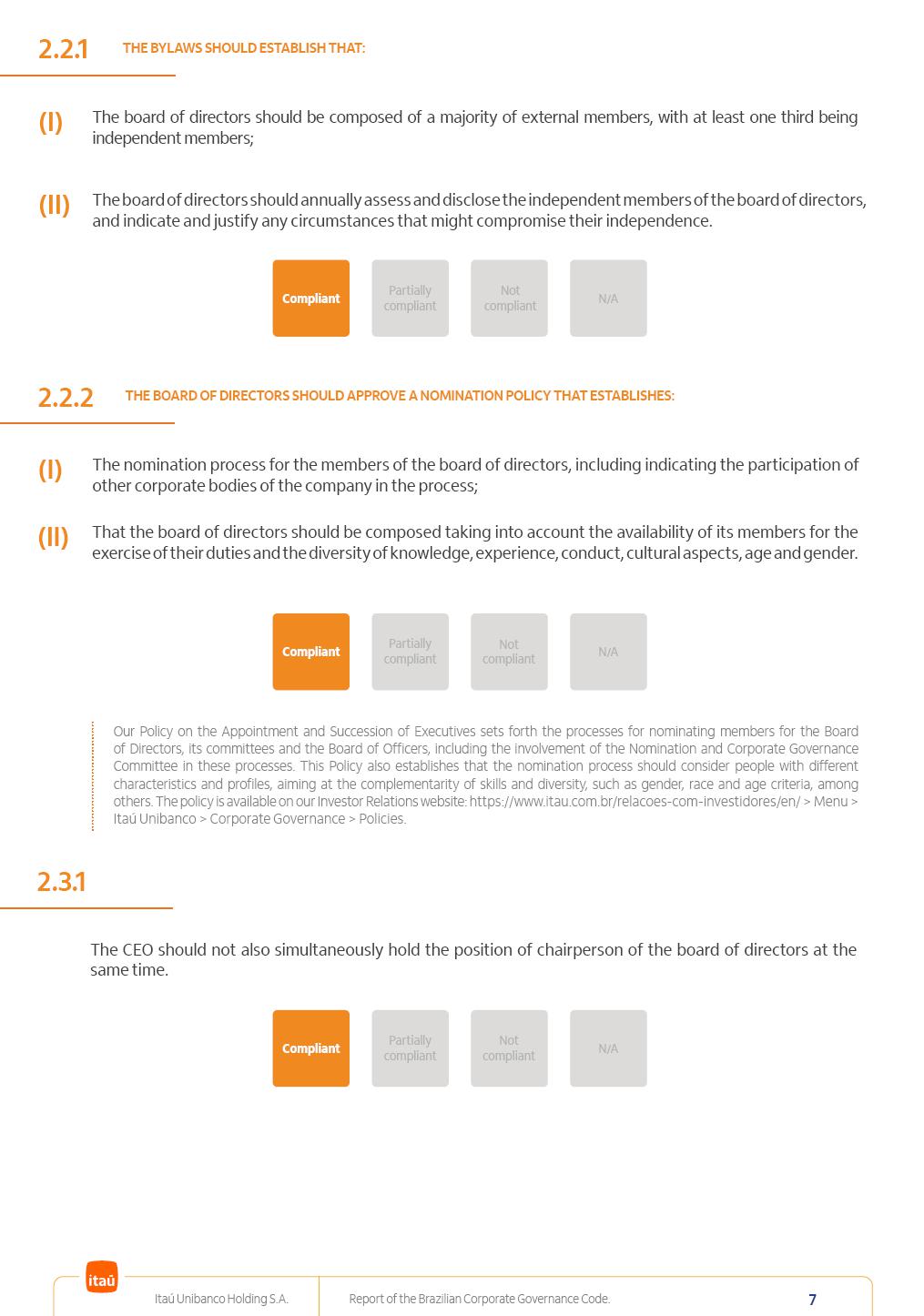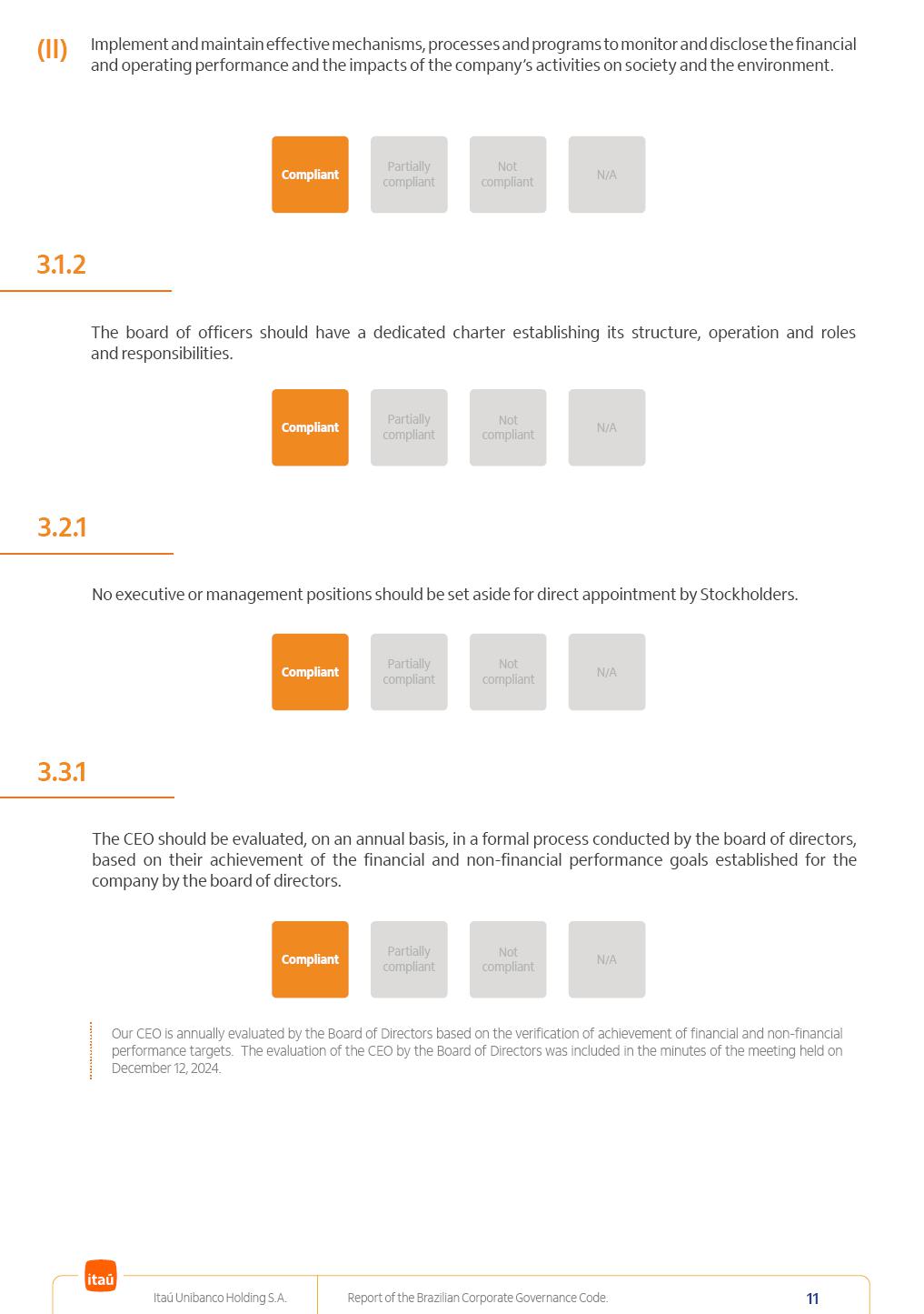 Report of theBrazilian CorporateGovernance CodeItaú Unibanco Holding S.A.July / 202520252025 Itaú Unibanco Holding S.A. Report of the Brazilian Corporate Governance Code. 2 Partially compliant Compliant N/A Not compliant 1.1.1 Partially compliant Compliant N/A Not compliant The company’s capital stock should be comprised of common shares only. Our Bylaws provide for two types of shares, common (ON) and preferred (PN) shares, both book-entry, with no par value and in a single class. Each common share entitles its holder to one vote at General Stockholders’ Meetings. Preferred shares carry no voting rights, except in specific cases legally provided for, and give their holders priority on the receipt of non-cumulative minimum annual dividends of R$ 0.022 per share, adjusted in the event of a stock split or reverse stock split, and also the right, in the event of a disposal of control, to be included in a public offering for the acquisition of shares, in order to assure a price equal to 80% of the amount paid per voting share to the controlling group, ensuring dividends at least equal to those of common shares. Preferred shares are a legitimate instrument, set forth by law, and their issue has no bearing on the quality of our management, corporate governance level, performance or returns to our Stockholders. Since our incorporation, our controlling Stockholders believe that our capital structure satisfactorily meets our corporate purposes. The Bylaws are available on our investor relations website: https://www.itau.com.br/relacoes-com-investidores/en/ > Menu > Itaú Unibanco > Corporate Governance > Bylaws. 1.2.1 Stockholders’ agreements should not bind the exercise of voting rights of any member of management or supervisory and control bodies. Given the merger between Itaú and Unibanco, in 2009, regulation through a Stockholders’ Agreement became necessary, including binding the exercise of the voting rights of members of the Board of Directors. We believe that the definition and regulation of stockholding control, as reflected in the Stockholders’ Agreement, is positive for the smooth running of the business, and does not harm the interests of investors and the Company itself, mainly considering: (i) the fiduciary duty of all management members, who should always vote in the best interests of the Company; (ii) the existence of a highly professional management with broad technical expertise; (iii) the significant number of independent members of the Board of Directors, currently accounting for 53.8% of the total composition and (iv) the existence of rigorous mechanisms, strictly applied by the Company, to prevent actual situations where conflicts of interest may arise. Our Stockholders’ Agreement does not bind the voting rights of any member of the Company’s supervisory and control bodies. The Stockholders’ Agreement is available on our investor relations website: https://www.itau.com.br/relacoes-com-investidores/en/ > Menu > Itaú Unibanco > Corporate Governance > Policies > Others. Itaú Unibanco Holding S.A. Report of the Brazilian Corporate Governance Code. 3 Partially compliant Compliant N/A Not compliant 1.3.1 The board of officers should use Stockholders’ general meetings to communicate how the company’s business is being conducted, for which reason management should publish a manual aimed at facilitating and encouraging attendance to Stockholders’ general meetings. Partially compliant Compliant N/A Not compliant 1.4.1 The board of directors should conduct a critical analysis of the advantages and disadvantages of the defense measure and its characteristics, especially triggers and price parameters, if applicable, providing relevant explanation. Partially compliant Compliant N/A Not compliant Minutes should provide a full understanding of the discussions held at meetings, even if in the form of a summary, and should identify the votes cast by Stockholders. 1.3.2 Partially compliant N/A Not compliant Provisions that prevent the removal of the measure from the bylaws, the so-called “entrenched clause”, should not be used. 1.4.2 Compliant Itaú Unibanco Holding S.A. Report of the Brazilian Corporate Governance Code. 4 Partially compliant N/A Not compliant Partially compliant N/A Not compliant 1.5.1 Transactions involving a direct or indirect disposal of stockholding control should be followed by a tender offer to all Stockholders, at the same price and in the same conditions obtained by the selling stockholder; (I) THE COMPANY’S BYLAWS SHOULD ESTABLISH THAT: (II) Management should state an opinion on the terms and conditions of corporate reorganizations, capital increases and other transactions leading to a change of control, and whether these terms and conditions ensure fair and equitable treatment to the company’s Stockholders. (I) The Brazilian Corporate Law provides for tag-along rights of 80% for minority holders of common shares in the case of a disposal of stockholding control. The Company extends the same 80% tag-along rights to preferred Stockholders. For this reason, the Company is listed on the ITAG – Special Tag-Along Stock Index of B3 – Bolsa, Brasil, Balcão S.A. (“B3”). (II) With respect to the opinion expressed by management members about possible corporate restructurings, the Company understands that management may always express its opinion regardless of statutory provisions. 1.6.1 The bylaws should provide that the board of directors should issue an opinion on any tender offer related to shares and securities convertible into or exchangeable for shares issued by the company, and this should include, among other relevant information, the opinion of the board of directors on any possible acceptance of the tender offer and the company’s economic value. Partially compliant N/A Not compliant If the bylaws provide for a tender offer whenever a stockholder or group of Stockholders directly or indirectly attains a significant interes