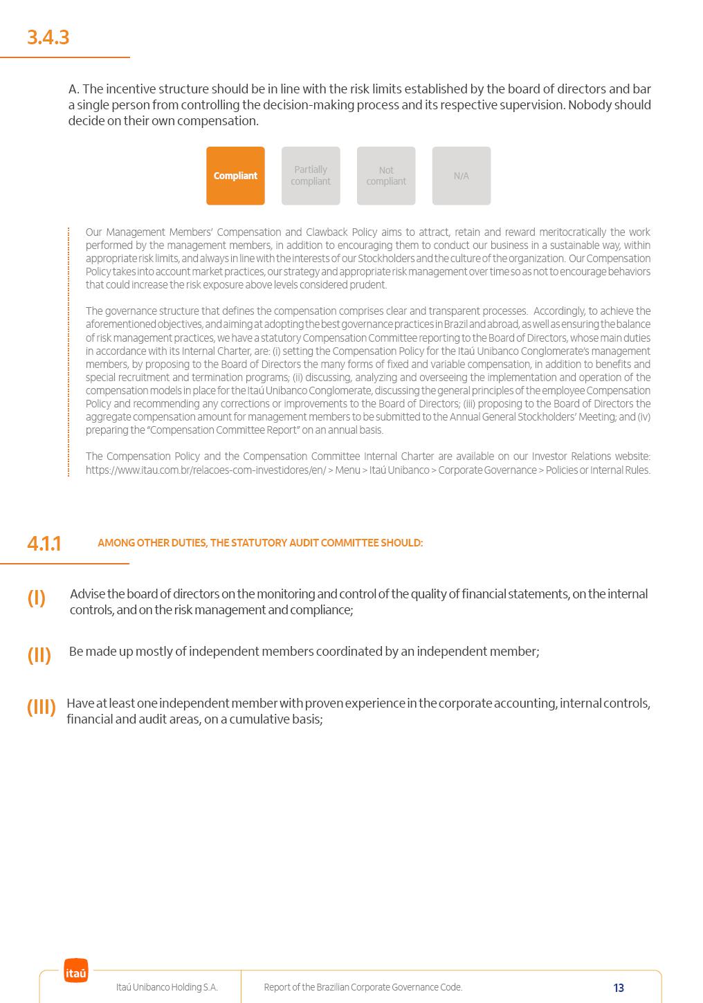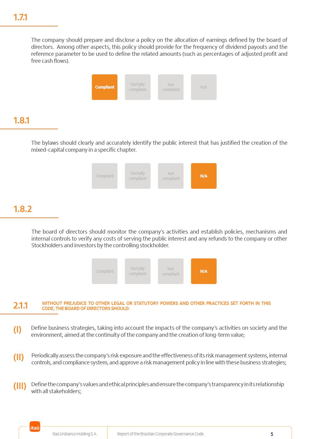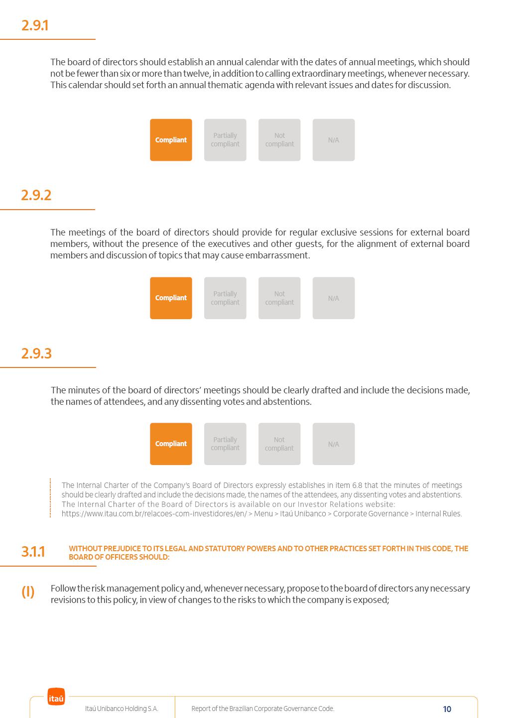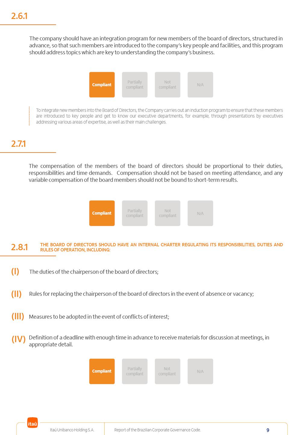 Report of theBrazilian CorporateGovernance CodeItaú Unibanco Holding S.A.July / 202520252025 Itaú Unibanco Holding S.A. Report of the Brazilian Corporate Governance Code. 2 Partially compliant Compliant N/A Not compliant 1.1.1 Partially compliant Compliant N/A Not compliant The company’s capital stock should be comprised of common shares only. Our Bylaws provide for two types of shares, common (ON) and preferred (PN) shares, both book-entry, with no par value and in a single class. Each common share entitles its holder to one vote at General Stockholders’ Meetings. Preferred shares carry no voting rights, except in specific cases legally provided for, and give their holders priority on the receipt of non-cumulative minimum annual dividends of R$ 0.022 per share, adjusted in the event of a stock split or reverse stock split, and also the right, in the event of a disposal of control, to be included in a public offering for the acquisition of shares, in order to assure a price equal to 80% of the amount paid per voting share to the controlling group, ensuring dividends at least equal to those of common shares. Preferred shares are a legitimate instrument, set forth by law, and their issue has no bearing on the quality of our management, corporate governance level, performance or returns to our Stockholders. Since our incorporation, our controlling Stockholders believe that our capital structure satisfactorily meets our corporate purposes. The Bylaws are available on our investor relations website: https://www.itau.com.br/relacoes-com-investidores/en/ > Menu > Itaú Unibanco > Corporate Governance > Bylaws. 1.2.1 Stockholders’ agreements should not bind the exercise of voting rights of any member of management or supervisory and control bodies. Given the merger between Itaú and Unibanco, in 2009, regulation through a Stockholders’ Agreement became necessary, including binding the exercise of the voting rights of members of the Board of Directors. We believe that the definition and regulation of stockholding control, as reflected in the Stockholders’ Agreement, is positive for the smooth running of the business, and does not harm the interests of investors and the Company itself, mainly considering: (i) the fiduciary duty of all management members, who should always vote in the best interests of the Company; (ii) the existence of a highly professional management with broad technical expertise; (iii) the significant number of independent members of the Board of Directors, currently accounting for 53.8% of the total composition and (iv) the existence of rigorous mechanisms, strictly applied by the Company, to prevent actual situations where conflicts of interest may arise. Our Stockholders’ Agreement does not bind the voting rights of any member of the Company’s supervisory and control bodies. The Stockholders’ Agreement is available on our investor relations website: https://www.itau.com.br/relacoes-com-investidores/en/ > Menu > Itaú Unibanco > Corporate Governance > Policies > Others. Itaú Unibanco Holding S.A. Report of the Brazilian Corporate Governance Code. 3 Partially compliant Compliant N/A Not compliant 1.3.1 The board of officers should use Stockholders’ general meetings to communicate how the company’s business is being conducted, for which reason management should publish a manual aimed at facilitating and encouraging attendance to Stockholders’ general meetings. Partially compliant Compliant N/A Not compliant 1.4.1 The board of directors should conduct a critical analysis of the advantages and disadvantages of the defense measure and its characteristics, especially triggers and price parameters, if applicable, providing relevant explanation. Partially compliant Compliant N/A Not compliant Minutes should provide a full understanding of the discussions held at meetings, even if in the form of a summary, and should identify the votes cast by Stockholders. 1.3.2 Partially compliant N/A Not compliant Provisions that prevent the removal of the measure from the bylaws, the so-called “entrenched clause”, should not be used. 1.4.2 Compliant Itaú Unibanco Holding S.A. Report of the Brazilian Corporate Governance Code. 4 Partially compliant N/A Not compliant Partially compliant N/A Not compliant 1.5.1 Transactions involving a direct or indirect disposal of stockholding control should be followed by a tender offer to all Stockholders, at the same price and in the same conditions obtained by the selling stockholder; (I) THE COMPANY’S BYLAWS SHOULD ESTABLISH THAT: (II) Management should state an opinion on the terms and conditions of corporate reorganizations, capital increases and other transactions leading to a change of control, and whether these terms and conditions ensure fair and equitable treatment to the company’s Stockholders. (I) The Brazilian Corporate Law provides for tag-along rights of 80% for minority holders of common shares in the case of a disposal of stockholding control. The Company extends the same 80% tag-along rights to preferred Stockholders. For this reason, the Company is listed on the ITAG – Special Tag-Along Stock Index of B3 – Bolsa, Brasil, Balcão S.A. (“B3”). (II) With respect to the opinion expressed by management members about possible corporate restructurings, the Company understands that management may always express its opinion regardless of statutory provisions. 1.6.1 The bylaws should provide that the board of directors should issue an opinion on any tender offer related to shares and securities convertible into or exchangeable for shares issued by the company, and this should include, among other relevant information, the opinion of the board of directors on any possible acceptance of the tender offer and the company’s economic value. Partially compliant N/A Not compliant If the bylaws provide for a tender offer whenever a stockholder or group of Stockholders directly or indirectly attains a significant interes