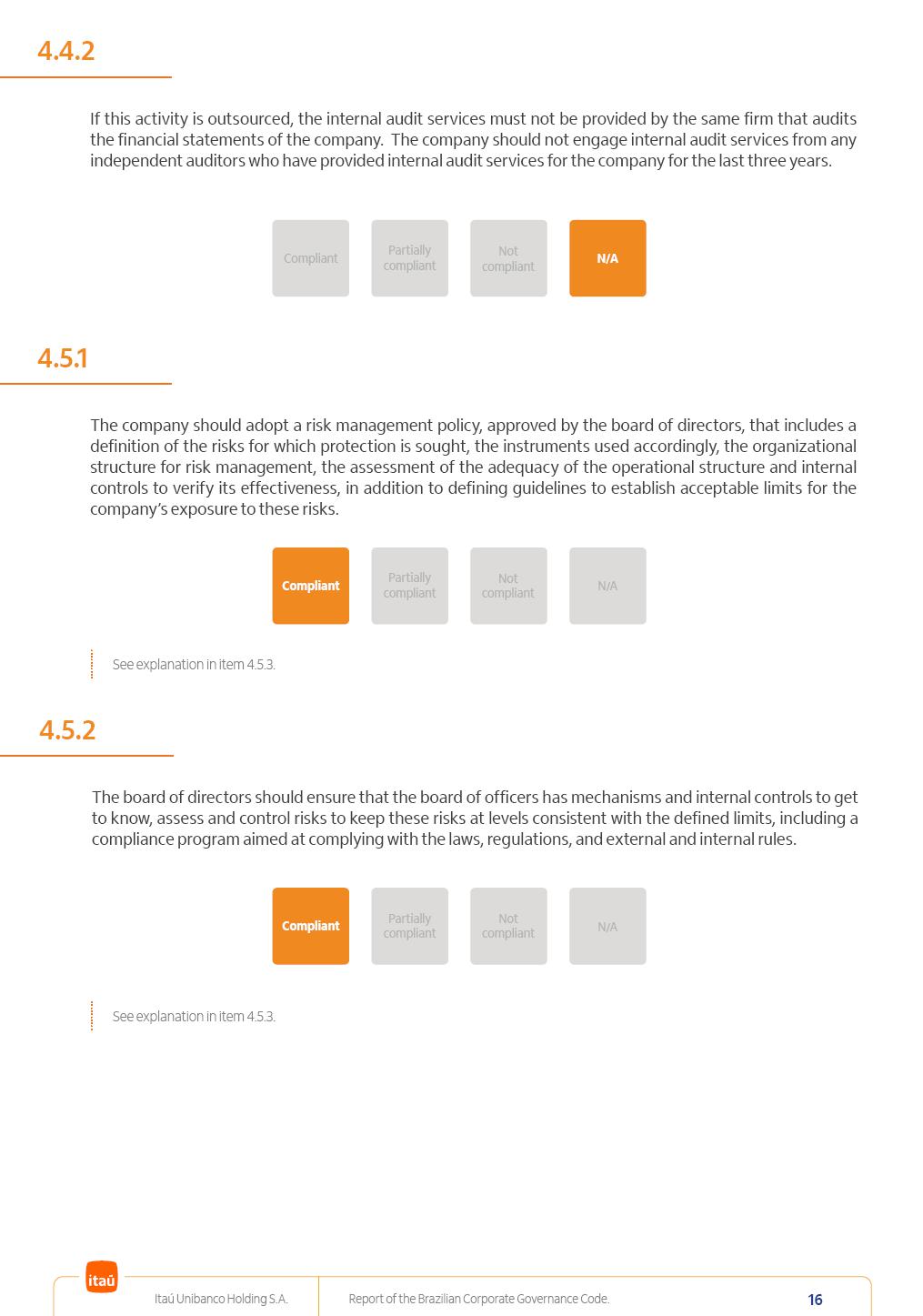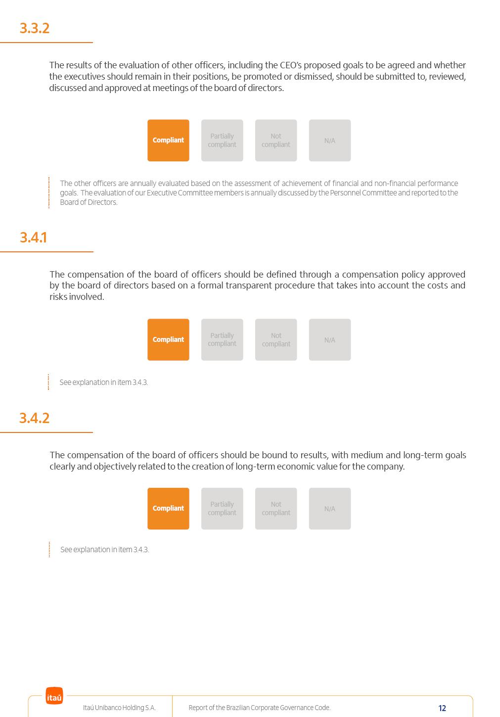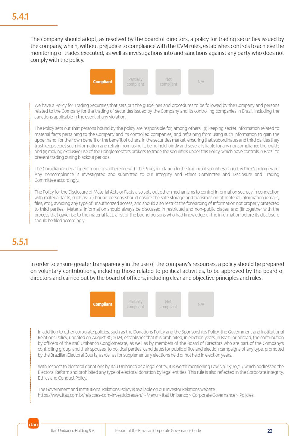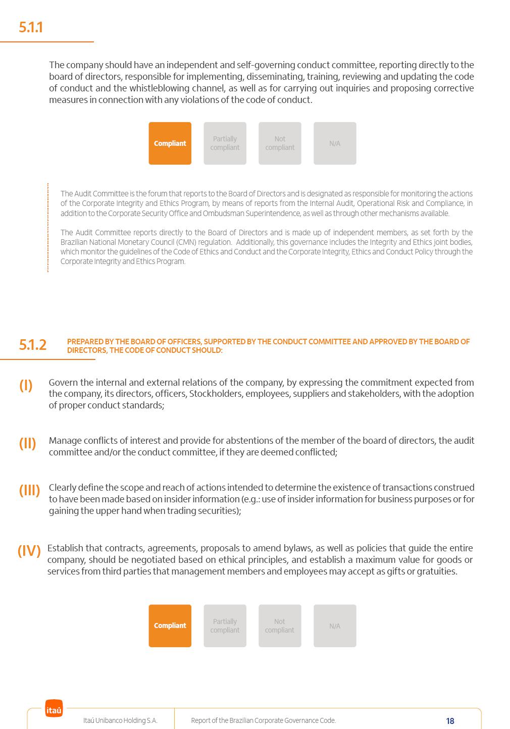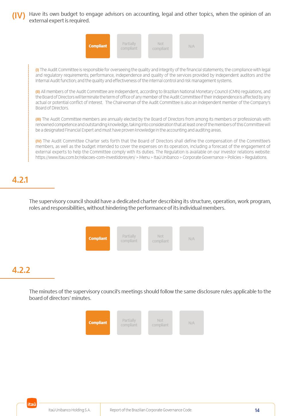 Report of theBrazilian CorporateGovernance CodeItaú Unibanco Holding S.A.July / 202520252025 Itaú Unibanco Holding S.A. Report of the Brazilian Corporate Governance Code. 2 Partially compliant Compliant N/A Not compliant 1.1.1 Partially compliant Compliant N/A Not compliant The company’s capital stock should be comprised of common shares only. Our Bylaws provide for two types of shares, common (ON) and preferred (PN) shares, both book-entry, with no par value and in a single class. Each common share entitles its holder to one vote at General Stockholders’ Meetings. Preferred shares carry no voting rights, except in specific cases legally provided for, and give their holders priority on the receipt of non-cumulative minimum annual dividends of R$ 0.022 per share, adjusted in the event of a stock split or reverse stock split, and also the right, in the event of a disposal of control, to be included in a public offering for the acquisition of shares, in order to assure a price equal to 80% of the amount paid per voting share to the controlling group, ensuring dividends at least equal to those of common shares. Preferred shares are a legitimate instrument, set forth by law, and their issue has no bearing on the quality of our management, corporate governance level, performance or returns to our Stockholders. Since our incorporation, our controlling Stockholders believe that our capital structure satisfactorily meets our corporate purposes. The Bylaws are available on our investor relations website: https://www.itau.com.br/relacoes-com-investidores/en/ > Menu > Itaú Unibanco > Corporate Governance > Bylaws. 1.2.1 Stockholders’ agreements should not bind the exercise of voting rights of any member of management or supervisory and control bodies. Given the merger between Itaú and Unibanco, in 2009, regulation through a Stockholders’ Agreement became necessary, including binding the exercise of the voting rights of members of the Board of Directors. We believe that the definition and regulation of stockholding control, as reflected in the Stockholders’ Agreement, is positive for the smooth running of the business, and does not harm the interests of investors and the Company itself, mainly considering: (i) the fiduciary duty of all management members, who should always vote in the best interests of the Company; (ii) the existence of a highly professional management with broad technical expertise; (iii) the significant number of independent members of the Board of Directors, currently accounting for 53.8% of the total composition and (iv) the existence of rigorous mechanisms, strictly applied by the Company, to prevent actual situations where conflicts of interest may arise. Our Stockholders’ Agreement does not bind the voting rights of any member of the Company’s supervisory and control bodies. The Stockholders’ Agreement is available on our investor relations website: https://www.itau.com.br/relacoes-com-investidores/en/ > Menu > Itaú Unibanco > Corporate Governance > Policies > Others. Itaú Unibanco Holding S.A. Report of the Brazilian Corporate Governance Code. 3 Partially compliant Compliant N/A Not compliant 1.3.1 The board of officers should use Stockholders’ general meetings to communicate how the company’s business is being conducted, for which reason management should publish a manual aimed at facilitating and encouraging attendance to Stockholders’ general meetings. Partially compliant Compliant N/A Not compliant 1.4.1 The board of directors should conduct a critical analysis of the advantages and disadvantages of the defense measure and its characteristics, especially triggers and price parameters, if applicable, providing relevant explanation. Partially compliant Compliant N/A Not compliant Minutes should provide a full understanding of the discussions held at meetings, even if in the form of a summary, and should identify the votes cast by Stockholders. 1.3.2 Partially compliant N/A Not compliant Provisions that prevent the removal of the measure from the bylaws, the so-called “entrenched clause”, should not be used. 1.4.2 Compliant Itaú Unibanco Holding S.A. Report of the Brazilian Corporate Governance Code. 4 Partially compliant N/A Not compliant Partially compliant N/A Not compliant 1.5.1 Transactions involving a direct or indirect disposal of stockholding control should be followed by a tender offer to all Stockholders, at the same price and in the same conditions obtained by the selling stockholder; (I) THE COMPANY’S BYLAWS SHOULD ESTABLISH THAT: (II) Management should state an opinion on the terms and conditions of corporate reorganizations, capital increases and other transactions leading to a change of control, and whether these terms and conditions ensure fair and equitable treatment to the company’s Stockholders. (I) The Brazilian Corporate Law provides for tag-along rights of 80% for minority holders of common shares in the case of a disposal of stockholding control. The Company extends the same 80% tag-along rights to preferred Stockholders. For this reason, the Company is listed on the ITAG – Special Tag-Along Stock Index of B3 – Bolsa, Brasil, Balcão S.A. (“B3”). (II) With respect to the opinion expressed by management members about possible corporate restructurings, the Company understands that management may always express its opinion regardless of statutory provisions. 1.6.1 The bylaws should provide that the board of directors should issue an opinion on any tender offer related to shares and securities convertible into or exchangeable for shares issued by the company, and this should include, among other relevant information, the opinion of the board of directors on any possible acceptance of the tender offer and the company’s economic value. Partially compliant N/A Not compliant If the bylaws provide for a tender offer whenever a stockholder or group of Stockholders directly or indirectly attains a significant interes