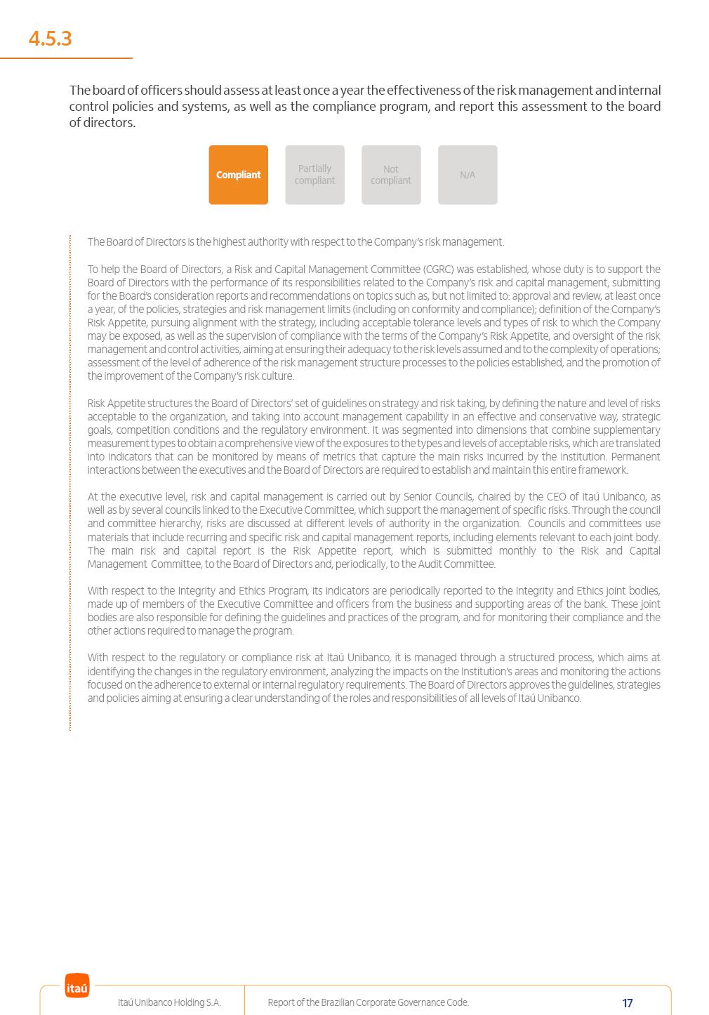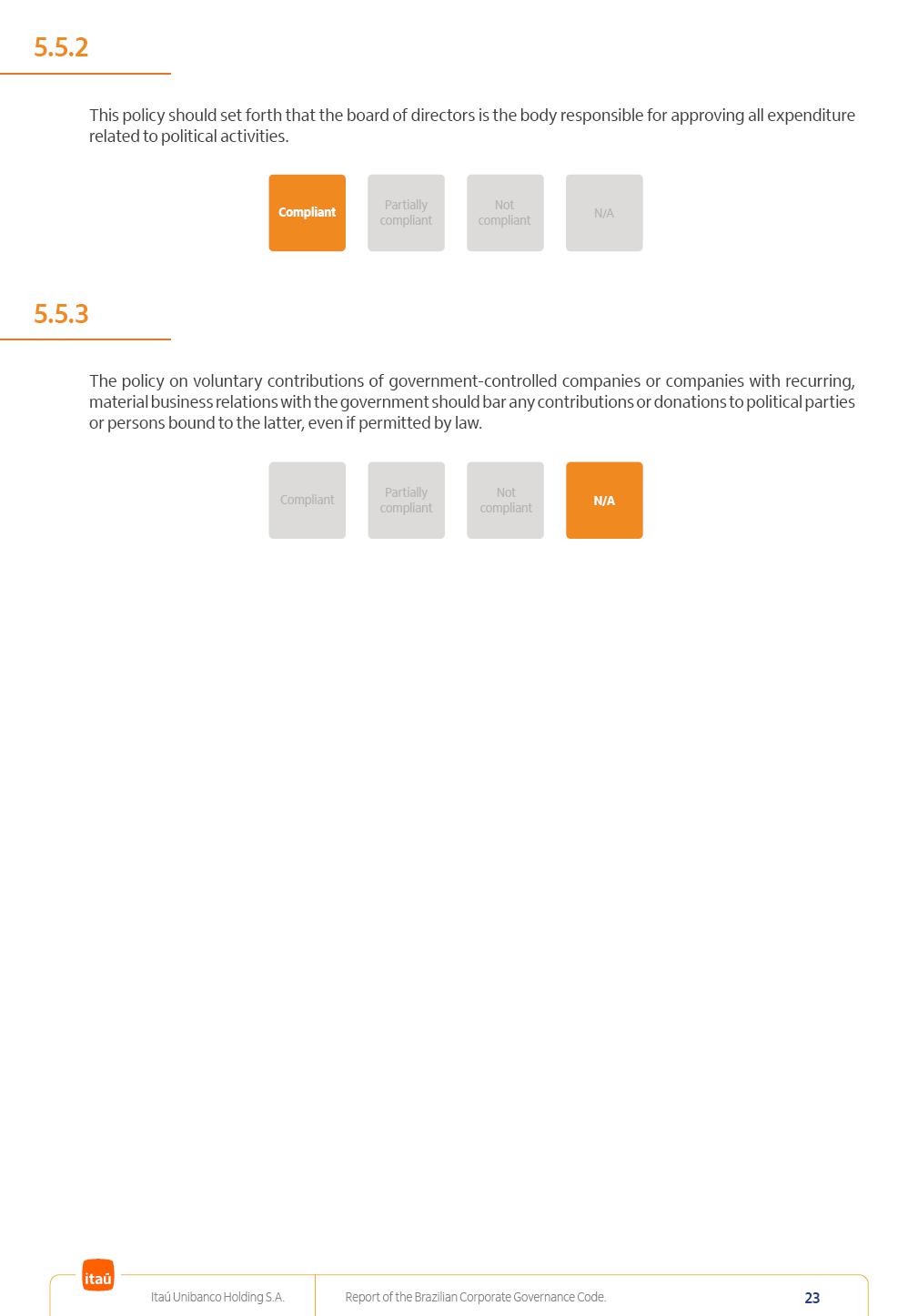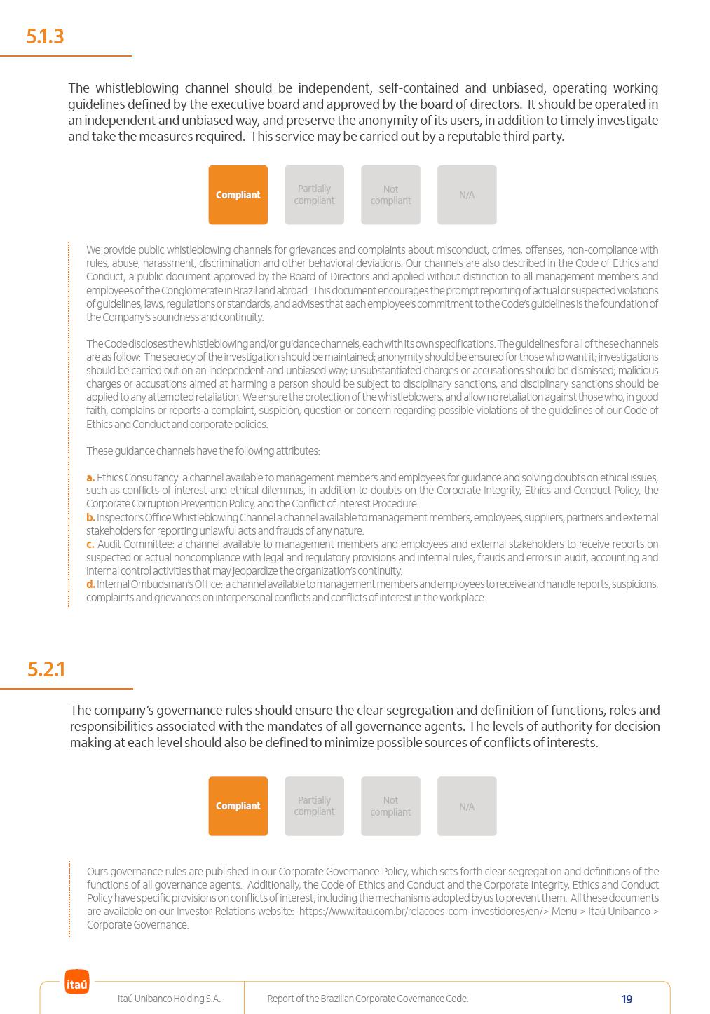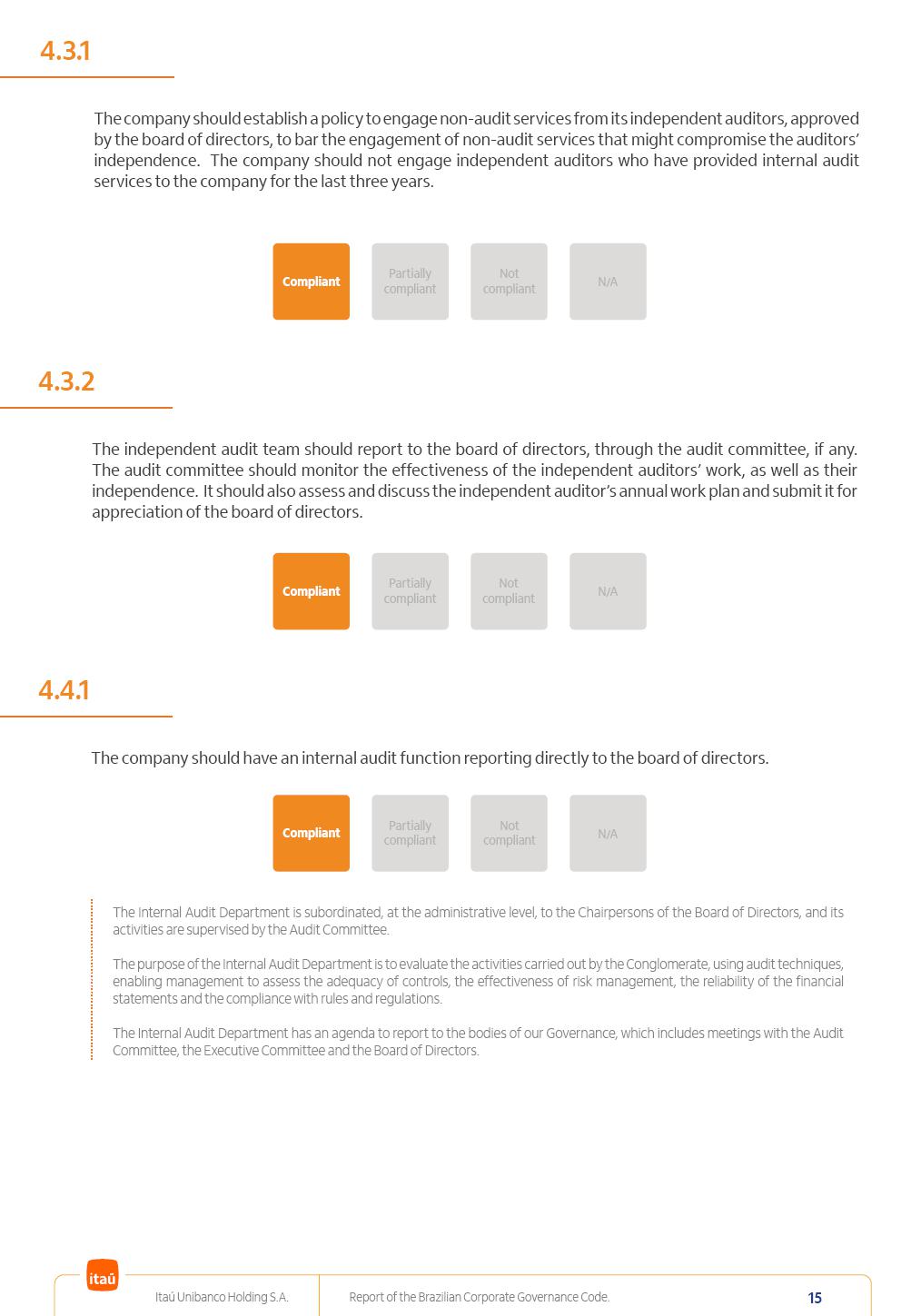 Report of theBrazilian CorporateGovernance CodeItaú Unibanco Holding S.A.July / 202520252025 Itaú Unibanco Holding S.A. Report of the Brazilian Corporate Governance Code. 2 Partially compliant Compliant N/A Not compliant 1.1.1 Partially compliant Compliant N/A Not compliant The company’s capital stock should be comprised of common shares only. Our Bylaws provide for two types of shares, common (ON) and preferred (PN) shares, both book-entry, with no par value and in a single class. Each common share entitles its holder to one vote at General Stockholders’ Meetings. Preferred shares carry no voting rights, except in specific cases legally provided for, and give their holders priority on the receipt of non-cumulative minimum annual dividends of R$ 0.022 per share, adjusted in the event of a stock split or reverse stock split, and also the right, in the event of a disposal of control, to be included in a public offering for the acquisition of shares, in order to assure a price equal to 80% of the amount paid per voting share to the controlling group, ensuring dividends at least equal to those of common shares. Preferred shares are a legitimate instrument, set forth by law, and their issue has no bearing on the quality of our management, corporate governance level, performance or returns to our Stockholders. Since our incorporation, our controlling Stockholders believe that our capital structure satisfactorily meets our corporate purposes. The Bylaws are available on our investor relations website: https://www.itau.com.br/relacoes-com-investidores/en/ > Menu > Itaú Unibanco > Corporate Governance > Bylaws. 1.2.1 Stockholders’ agreements should not bind the exercise of voting rights of any member of management or supervisory and control bodies. Given the merger between Itaú and Unibanco, in 2009, regulation through a Stockholders’ Agreement became necessary, including binding the exercise of the voting rights of members of the Board of Directors. We believe that the definition and regulation of stockholding control, as reflected in the Stockholders’ Agreement, is positive for the smooth running of the business, and does not harm the interests of investors and the Company itself, mainly considering: (i) the fiduciary duty of all management members, who should always vote in the best interests of the Company; (ii) the existence of a highly professional management with broad technical expertise; (iii) the significant number of independent members of the Board of Directors, currently accounting for 53.8% of the total composition and (iv) the existence of rigorous mechanisms, strictly applied by the Company, to prevent actual situations where conflicts of interest may arise. Our Stockholders’ Agreement does not bind the voting rights of any member of the Company’s supervisory and control bodies. The Stockholders’ Agreement is available on our investor relations website: https://www.itau.com.br/relacoes-com-investidores/en/ > Menu > Itaú Unibanco > Corporate Governance > Policies > Others. Itaú Unibanco Holding S.A. Report of the Brazilian Corporate Governance Code. 3 Partially compliant Compliant N/A Not compliant 1.3.1 The board of officers should use Stockholders’ general meetings to communicate how the company’s business is being conducted, for which reason management should publish a manual aimed at facilitating and encouraging attendance to Stockholders’ general meetings. Partially compliant Compliant N/A Not compliant 1.4.1 The board of directors should conduct a critical analysis of the advantages and disadvantages of the defense measure and its characteristics, especially triggers and price parameters, if applicable, providing relevant explanation. Partially compliant Compliant N/A Not compliant Minutes should provide a full understanding of the discussions held at meetings, even if in the form of a summary, and should identify the votes cast by Stockholders. 1.3.2 Partially compliant N/A Not compliant Provisions that prevent the removal of the measure from the bylaws, the so-called “entrenched clause”, should not be used. 1.4.2 Compliant Itaú Unibanco Holding S.A. Report of the Brazilian Corporate Governance Code. 4 Partially compliant N/A Not compliant Partially compliant N/A Not compliant 1.5.1 Transactions involving a direct or indirect disposal of stockholding control should be followed by a tender offer to all Stockholders, at the same price and in the same conditions obtained by the selling stockholder; (I) THE COMPANY’S BYLAWS SHOULD ESTABLISH THAT: (II) Management should state an opinion on the terms and conditions of corporate reorganizations, capital increases and other transactions leading to a change of control, and whether these terms and conditions ensure fair and equitable treatment to the company’s Stockholders. (I) The Brazilian Corporate Law provides for tag-along rights of 80% for minority holders of common shares in the case of a disposal of stockholding control. The Company extends the same 80% tag-along rights to preferred Stockholders. For this reason, the Company is listed on the ITAG – Special Tag-Along Stock Index of B3 – Bolsa, Brasil, Balcão S.A. (“B3”). (II) With respect to the opinion expressed by management members about possible corporate restructurings, the Company understands that management may always express its opinion regardless of statutory provisions. 1.6.1 The bylaws should provide that the board of directors should issue an opinion on any tender offer related to shares and securities convertible into or exchangeable for shares issued by the company, and this should include, among other relevant information, the opinion of the board of directors on any possible acceptance of the tender offer and the company’s economic value. Partially compliant N/A Not compliant If the bylaws provide for a tender offer whenever a stockholder or group of Stockholders directly or indirectly attains a significant interes