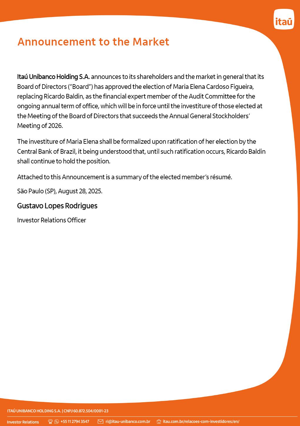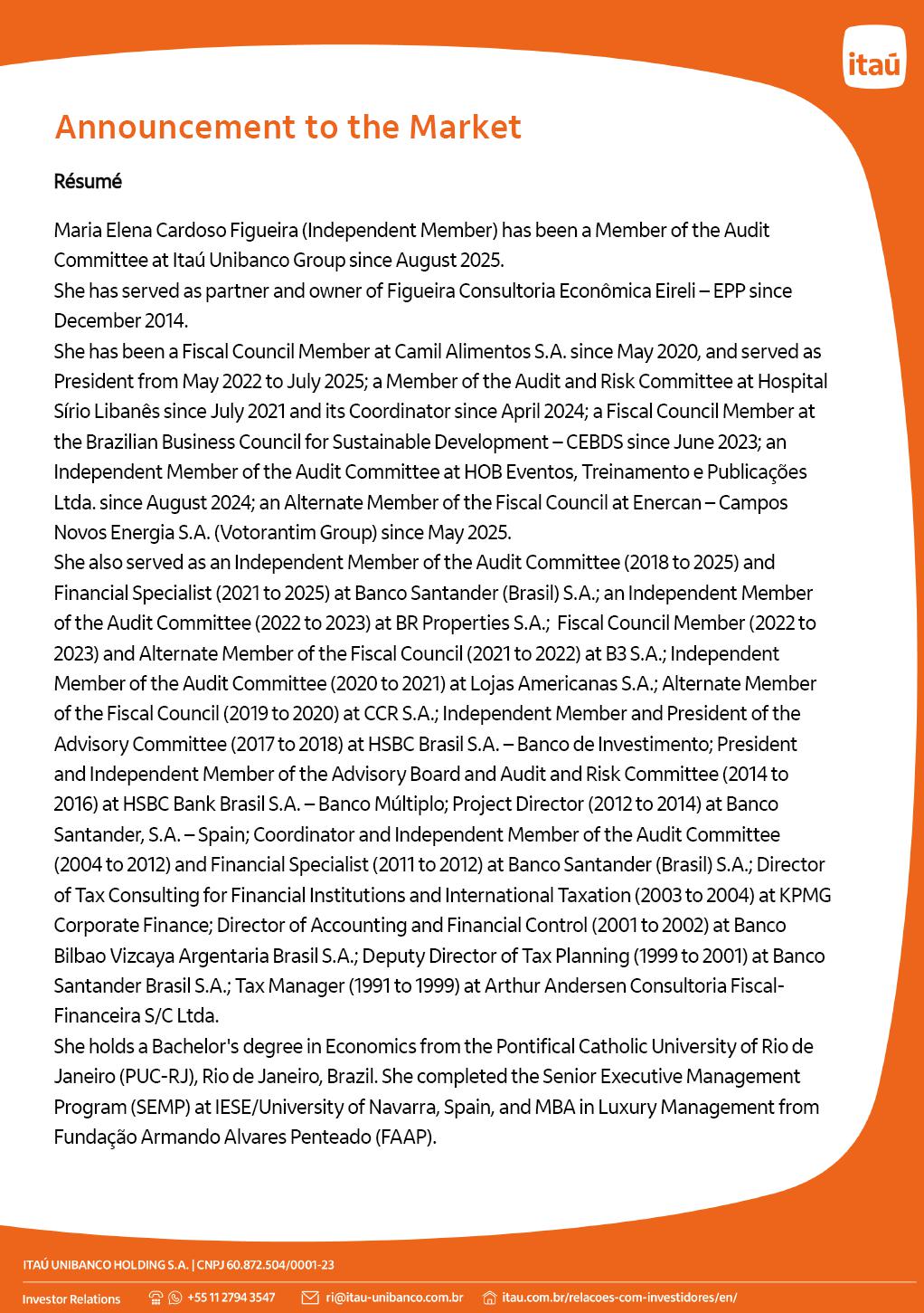Announcement to the Market Itaú Unibanco Holding S.A. announces to its shareholders and the market in general that its Board of Directors (“Board”) has approved the election of Maria Elena Cardoso Figueira, replacing Ricardo Baldin, as the financial expert member of the Audit Committee for the ongoing annual term of office, which will be in force until the investiture of those elected at the Meeting of the Board of Directors that succeeds the Annual General Stockholders’ Meeting of 2026. The investiture of Maria Elena shall be formalized upon ratification of her election by the Central Bank of Brazil, it being understood that, until such ratification occurs, Ricardo Baldin shall continue to hold the position. Attached to this Announcement is a summary of the elected member’s résumé. São Paulo (SP), August 28, 2025. Gustavo Lopes Rodrigues Investor Relations Officer Announcement to the Market Résumé Maria Elena Cardoso Figueira (Independent Member) has been a Member of the Audit Committee at Itaú Unibanco Group since August 2025. She has served as partner and owner of Figueira Consultoria Econômica Eireli – EPP since December 2014. She has been a Fiscal Council Member at Camil Alimentos S.A. since May 2020, and served as President from May 2022 to July 2025; a Member of the Audit and Risk Committee at Hospital Sírio Libanês since July 2021 and its Coordinator since April 2024; a Fiscal Council Member at the Brazilian Business Council for Sustainable Development – CEBDS since June 2023; an Independent Member of the Audit Committee at HOB Eventos, Treinamento e Publicações Ltda. since August 2024; an Alternate Member of the Fiscal Council at Enercan – Campos Novos Energia S.A. (Votorantim Group) since May 2025. She also served as an Independent Member of the Audit Committee (2018 to 2025) and Financial Specialist (2021 to 2025) at Banco Santander (Brasil) S.A.; an Independent Member of the Audit Committee (2022 to 2023) at BR Properties S.A.; Fiscal Council Member (2022 to 2023) and Alternate Member of the Fiscal Council (2021 to 2022) at B3 S.A.; Independent Member of the Audit Committee (2020 to 2021) at Lojas Americanas S.A.; Alternate Member of the Fiscal Council (2019 to 2020) at CCR S.A.; Independent Member and President of the Advisory Committee (2017 to 2018) at HSBC Brasil S.A. – Banco de Investimento; President and Independent Member of the Advisory Board and Audit and Risk Committee (2014 to 2016) at HSBC Bank Brasil S.A. – Banco Múltiplo; Project Director (2012 to 2014) at Banco Santander, S.A. – Spain; Coordinator and Independent Member of the Audit Committee (2004 to 2012) and Financial Specialist (2011 to 2012) at Banco Santander (Brasil) S.A.; Director of Tax Consulting for Financial Institutions and International Taxation (2003 to 2004) at KPMG Corporate Finance; Director of Accounting and Financial Control (2001 to 2002) at Banco Bilbao Vizcaya Argentaria Brasil S.A.; Deputy Director of Tax Planning (1999 to 2001) at Banco Santander Brasil S.A.; Tax Manager (1991 to 1999) at Arthur Andersen Consultoria Fiscal-Financeira S/C Ltda. She holds a Bachelor's degree in Economics from the Pontifical Catholic University of Rio de Janeiro (PUC-RJ), Rio de Janeiro, Brazil. She completed the Senior Executive Management Program (SEMP) at IESE/University of Navarra, Spain, and MBA in Luxury Management from Fundação Armando Alvares Penteado (FAAP).