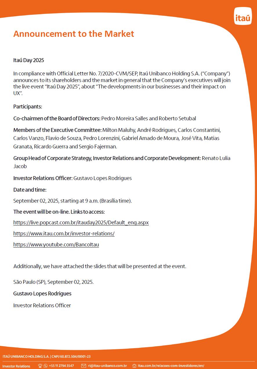 Announcement to the MarketItaú Day 2025In compliance with Official Letter No. 7/2020-CVM/SEP, Itaú Unibanco Holding S.A. (“Company”) announces to its shareholders and the market in general that the Company’s executives will join the live event “Itaú Day 2025”, about “The developments in our businesses and their impact on UX”. Participants: Co-chairmen of the Board of Directors: Pedro Moreira Salles and Roberto Setubal Members of the Executive Committee: Milton Maluhy, André Rodrigues, Carlos Constantini, Carlos Vanzo, Flavio de Souza, Pedro Lorenzini, Gabriel Amado de Moura, José Vita, Matias Granata, Ricardo Guerra and Sergio Fajerman. Group Head of Corporate Strategy, Investor Relations and Corporate Development: Renato Lulia Jacob Investor Relations Officer: Gustavo Lopes Rodrigues Date and time: September 02, 2025, starting at 9 a.m. (Brasília time). The event will be on-line. Links to access: https://live.popcast.com.br/itauday2025/Default_eng.aspx https://www.itau.com.br/investor-relations/ https://www.youtube.com/BancoItau Additionally, we have attached the slides that will be presented at the event. São Paulo (SP), September 02, 2025. Gustavo Lopes Rodrigues Investor Relations Officer