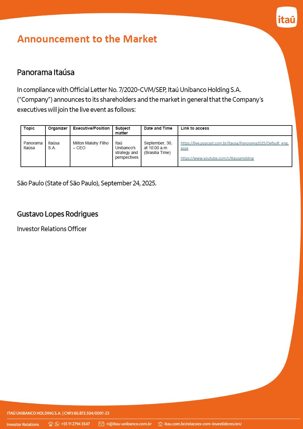 Announcement to the Market Panorama Itaúsa In compliance with Official Letter No. 7/2020-CVM/SEP, Itaú Unibanco Holding S.A. (“Company”) announces to its shareholders and the market in general that the Company’s executives will join the live event as follows: Topic Organizer Executive/Position Subject matter Date and Time Link to access Panorama Itaúsa Itaúsa S.A. Milton Maluhy Filho – CEO Itaú Unibanco's strategy and perspectives September, 30, at 10:00 a.m. (Brasilia Time) https://live.popcast.com.br/itausa/Panorama2025/Default_eng.aspx https://www.youtube.com/c/ItausaHolding São Paulo (State of São Paulo), September 24, 2025. Gustavo Lopes Rodrigues Investor Relations Officer