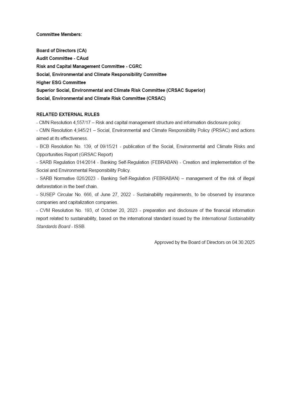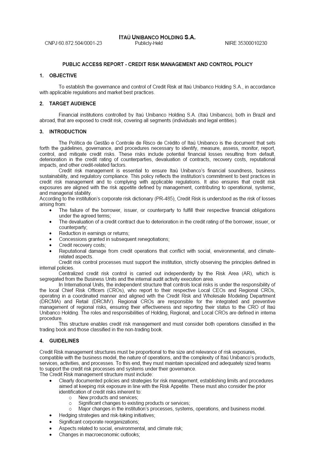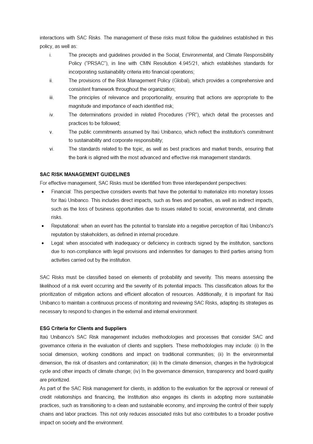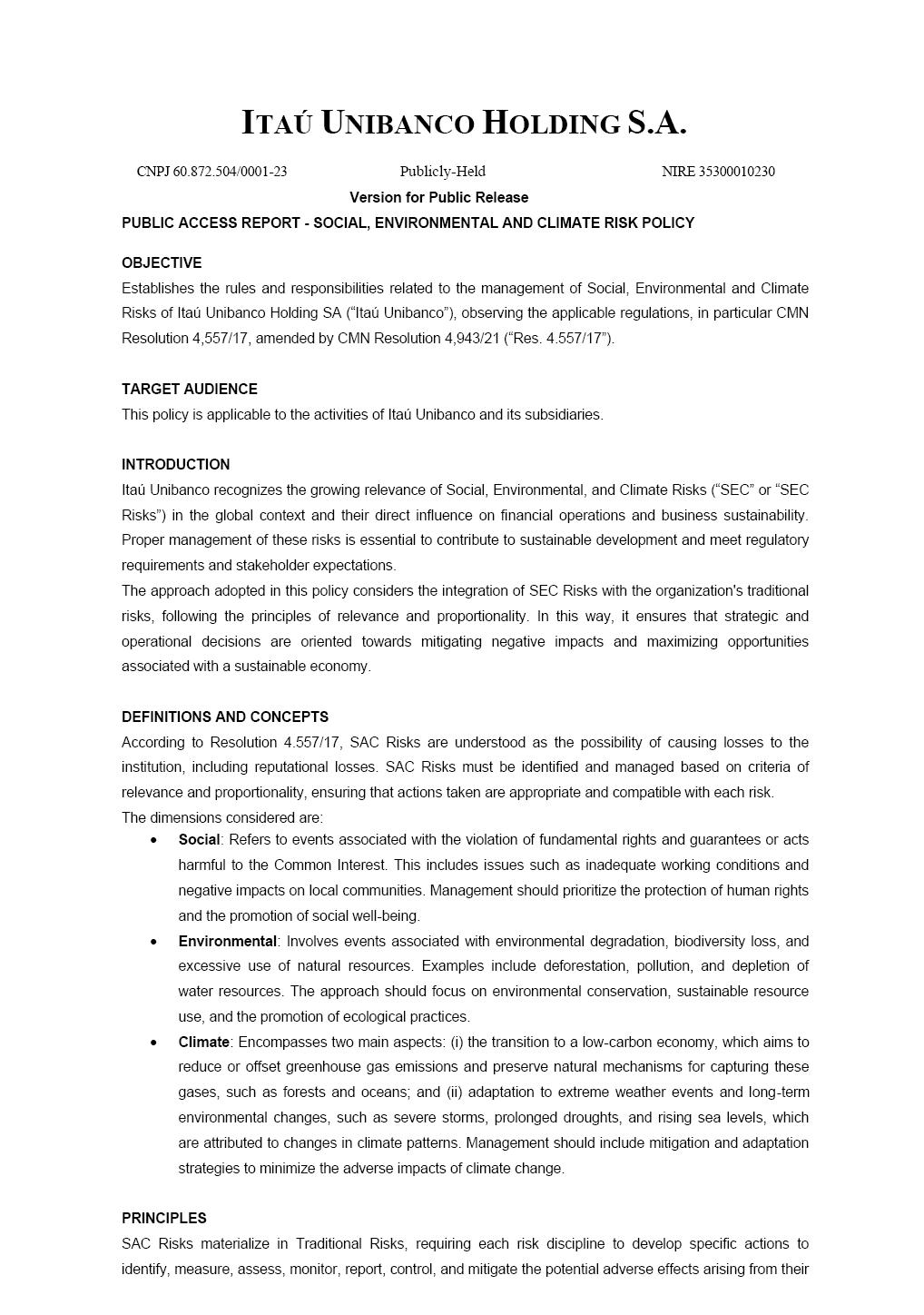 ITAÚ UNIBANCO HOLDING S.A. CNPJ 60.872.504/0001-23 Publicly-Held NIRE 35300010230 PUBLIC ACCESS REPORT - SOCIAL, ENVIRONMENTAL AND CLIMATE RISK POLICY OBJECTIVE Establishes the rules and responsibilities related to the management of Social, Environmental and Climate Risks of Itaú Unibanco Holding SA (“Itaú Unibanco”), observing the applicable regulations, in particular CMN Resolution 4,557/17, amended by CMN Resolution 4,943/21 (“Res. 4.557/17”). TARGET AUDIENCE This policy is applicable to the activities of Itaú Unibanco and its subsidiaries. INTRODUCTION Itaú Unibanco recognizes the growing relevance of Social, Environmental, and Climate Risks (“SEC” or “SEC Risks”) in the global context and their direct influence on financial operations and business sustainability. Proper management of these risks is essential to contribute to sustainable development and meet regulatory requirements and stakeholder expectations. The approach adopted in this policy considers the integration of SEC Risks with the organization's traditional risks, following the principles of relevance and proportionality. In this way, it ensures that strategic and operational decisions are oriented towards mitigating negative impacts and maximizing opportunities associated with a sustainable economy. DEFINITIONS AND CONCEPTS According to Resolution 4.557/17, SAC Risks are understood as the possibility of causing losses to the institution, including reputational losses. SAC Risks must be identified and managed based on criteria of relevance and proportionality, ensuring that actions taken are appropriate and compatible with each risk. The dimensions considered are: •Social: Refers to events associated with the violation of fundamental rights and guarantees or actsharmful to the Common Interest. This includes issues such as inadequate working conditions andnegative impacts on local communities. Management should prioritize the protection of human rightsand the promotion of social well-being. •Environmental: Involves events associated with environmental degradation, biodiversity loss, andexcessive use of natural resources. Examples include deforestation, pollution, and depletion ofwater resources. The approach should focus on environmental conservation, sustainable resourceuse, and the promotion of ecological practices. •Climate: Encompasses two main aspects: (i) the transition to a low-carbon economy, which aims toreduce or offset greenhouse gas emissions and preserve natural mechanisms for capturing thesegases, such as forests and oceans; and (ii) adaptation to extreme weather events and long-termenvironmental changes, such as severe storms, prolonged droughts, and rising sea levels, whichare attributed to changes in climate patterns. Management should include mitigation and adaptationstrategies to minimize the adverse impacts of climate change. PRINCIPLES SAC Risks materialize in Traditional Risks, requiring each risk discipline to develop specific actions to identify, measure, assess, monitor, report, control, and mitigate the potential adverse effects arising from their Version for Public Release interactions with SAC Risks. The management of these risks must follow the guidelines established in this policy, as well as: i. The precepts and guidelines provided in the Social, Environmental, and Climate Responsibility Policy (“PRSAC”), in line with CMN Resolution 4.945/21, which establishes standards for incorporating sustainability criteria into financial operations; ii. The provisions of the Risk Management Policy (Global), which provides a comprehensive and consistent framework throughout the organization; iii. The principles of relevance and proportionality, ensuring that actions are appropriate to the magnitude and importance of each identified risk; iv. The determinations provided in related Procedures (“PR”), which detail the processes and practices to be followed; v. The public commitments assumed by Itaú Unibanco, which reflect the institution's commitment to sustainability and corporate responsibility; vi. The standards related to the topic, as well as best practices and market trends, ensuring that the bank is aligned with the most advanced and effective risk management standards. SAC RISK MANAGEMENT GUIDELINES For effective management, SAC Risks must be identified from three interdependent perspectives: • Financial: This perspective considers events that have the potential to materialize into monetary losses for Itaú Unibanco. This includes direct impacts, such as fines and penalties, as well as indirect impacts, such as the loss of business opportunities due to issues related to social, environmental, and climate risks. • Reputational: when an event has the potential to translate into a negative perception of Itaú Unibanco's reputation by stakeholders, as defined in internal procedure. • Legal: when associated with inadequacy or deficiency in contracts signed by the institution, sanctions due to non-compliance with legal provisions and indemnities for damages to third parties arising from activities carried out by the institution. SAC Risks must be classified based on elements of probability and severity. This means assessing the likelihood of a risk event occurring and the severity of its potential impacts. This classification allows for the prioritization of mitigation actions and efficient allocation of resources. Additionally, it is important for Itaú Unibanco to maintain a continuous process of monitoring and reviewing SAC Risks, adapting its strategies as necessary to respond to changes in the external and internal environment. ESG Criteria for Clients and Suppliers Itaú Unibanco's SAC Risk management includes methodologies and processes that consider SAC and governance criteria in the evaluation of clients and suppliers. These methodologies may include: (i) In the social dimension, working conditions and impact on traditional communities; (ii) In the enviro