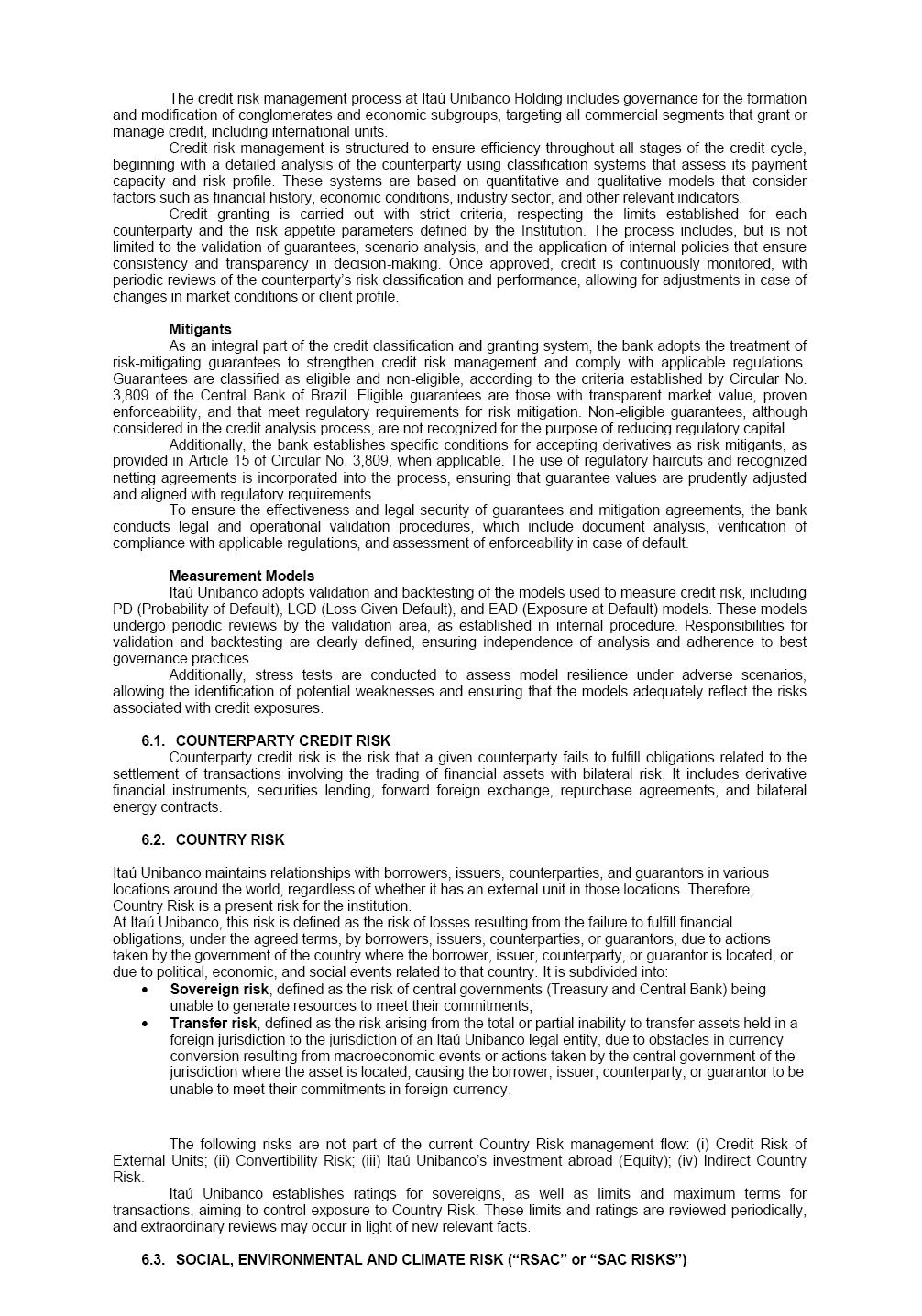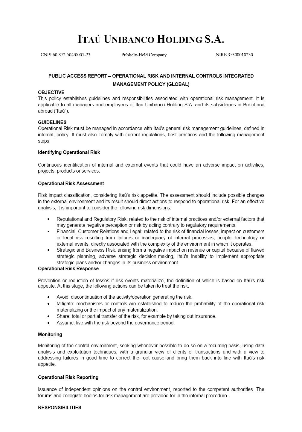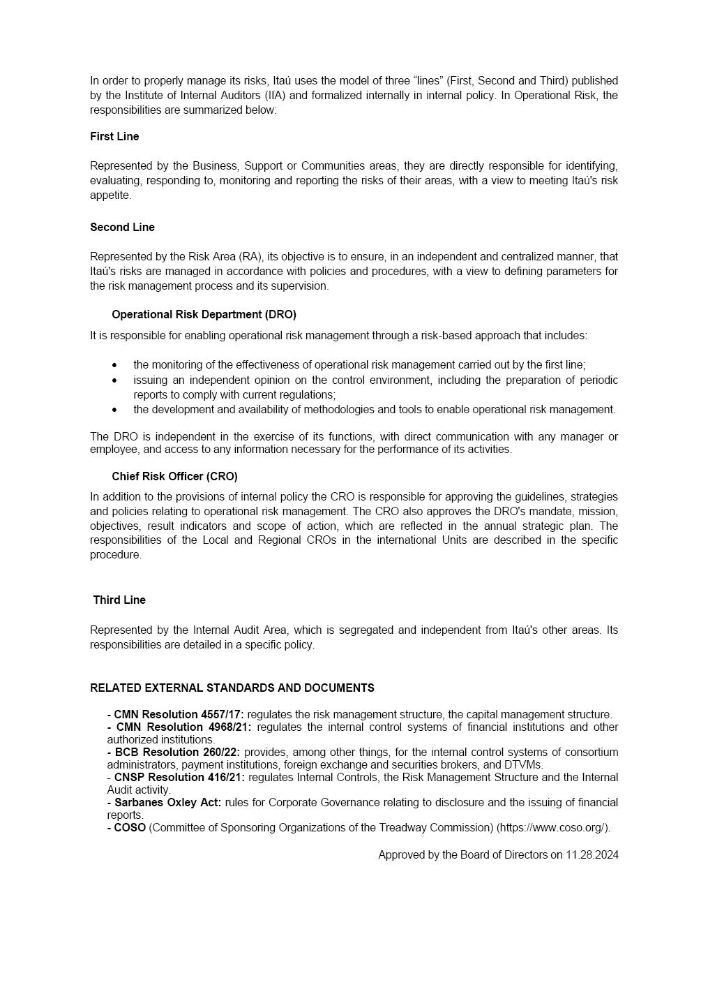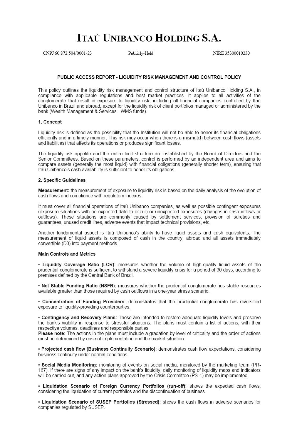 ITAÚ UNIBANCO HOLDING S.A. CNPJ 60.872.504/0001-23 Publicly-Held NIRE 35300010230 PUBLIC ACCESS REPORT - SOCIAL, ENVIRONMENTAL AND CLIMATE RISK POLICY OBJECTIVE Establishes the rules and responsibilities related to the management of Social, Environmental and Climate Risks of Itaú Unibanco Holding SA (“Itaú Unibanco”), observing the applicable regulations, in particular CMN Resolution 4,557/17, amended by CMN Resolution 4,943/21 (“Res. 4.557/17”). TARGET AUDIENCE This policy is applicable to the activities of Itaú Unibanco and its subsidiaries. INTRODUCTION Itaú Unibanco recognizes the growing relevance of Social, Environmental, and Climate Risks (“SEC” or “SEC Risks”) in the global context and their direct influence on financial operations and business sustainability. Proper management of these risks is essential to contribute to sustainable development and meet regulatory requirements and stakeholder expectations. The approach adopted in this policy considers the integration of SEC Risks with the organization's traditional risks, following the principles of relevance and proportionality. In this way, it ensures that strategic and operational decisions are oriented towards mitigating negative impacts and maximizing opportunities associated with a sustainable economy. DEFINITIONS AND CONCEPTS According to Resolution 4.557/17, SAC Risks are understood as the possibility of causing losses to the institution, including reputational losses. SAC Risks must be identified and managed based on criteria of relevance and proportionality, ensuring that actions taken are appropriate and compatible with each risk. The dimensions considered are: •Social: Refers to events associated with the violation of fundamental rights and guarantees or actsharmful to the Common Interest. This includes issues such as inadequate working conditions andnegative impacts on local communities. Management should prioritize the protection of human rightsand the promotion of social well-being. •Environmental: Involves events associated with environmental degradation, biodiversity loss, andexcessive use of natural resources. Examples include deforestation, pollution, and depletion ofwater resources. The approach should focus on environmental conservation, sustainable resourceuse, and the promotion of ecological practices. •Climate: Encompasses two main aspects: (i) the transition to a low-carbon economy, which aims toreduce or offset greenhouse gas emissions and preserve natural mechanisms for capturing thesegases, such as forests and oceans; and (ii) adaptation to extreme weather events and long-termenvironmental changes, such as severe storms, prolonged droughts, and rising sea levels, whichare attributed to changes in climate patterns. Management should include mitigation and adaptationstrategies to minimize the adverse impacts of climate change. PRINCIPLES SAC Risks materialize in Traditional Risks, requiring each risk discipline to develop specific actions to identify, measure, assess, monitor, report, control, and mitigate the potential adverse effects arising from their Version for Public Release interactions with SAC Risks. The management of these risks must follow the guidelines established in this policy, as well as: i. The precepts and guidelines provided in the Social, Environmental, and Climate Responsibility Policy (“PRSAC”), in line with CMN Resolution 4.945/21, which establishes standards for incorporating sustainability criteria into financial operations; ii. The provisions of the Risk Management Policy (Global), which provides a comprehensive and consistent framework throughout the organization; iii. The principles of relevance and proportionality, ensuring that actions are appropriate to the magnitude and importance of each identified risk; iv. The determinations provided in related Procedures (“PR”), which detail the processes and practices to be followed; v. The public commitments assumed by Itaú Unibanco, which reflect the institution's commitment to sustainability and corporate responsibility; vi. The standards related to the topic, as well as best practices and market trends, ensuring that the bank is aligned with the most advanced and effective risk management standards. SAC RISK MANAGEMENT GUIDELINES For effective management, SAC Risks must be identified from three interdependent perspectives: • Financial: This perspective considers events that have the potential to materialize into monetary losses for Itaú Unibanco. This includes direct impacts, such as fines and penalties, as well as indirect impacts, such as the loss of business opportunities due to issues related to social, environmental, and climate risks. • Reputational: when an event has the potential to translate into a negative perception of Itaú Unibanco's reputation by stakeholders, as defined in internal procedure. • Legal: when associated with inadequacy or deficiency in contracts signed by the institution, sanctions due to non-compliance with legal provisions and indemnities for damages to third parties arising from activities carried out by the institution. SAC Risks must be classified based on elements of probability and severity. This means assessing the likelihood of a risk event occurring and the severity of its potential impacts. This classification allows for the prioritization of mitigation actions and efficient allocation of resources. Additionally, it is important for Itaú Unibanco to maintain a continuous process of monitoring and reviewing SAC Risks, adapting its strategies as necessary to respond to changes in the external and internal environment. ESG Criteria for Clients and Suppliers Itaú Unibanco's SAC Risk management includes methodologies and processes that consider SAC and governance criteria in the evaluation of clients and suppliers. These methodologies may include: (i) In the social dimension, working conditions and impact on traditional communities; (ii) In the enviro