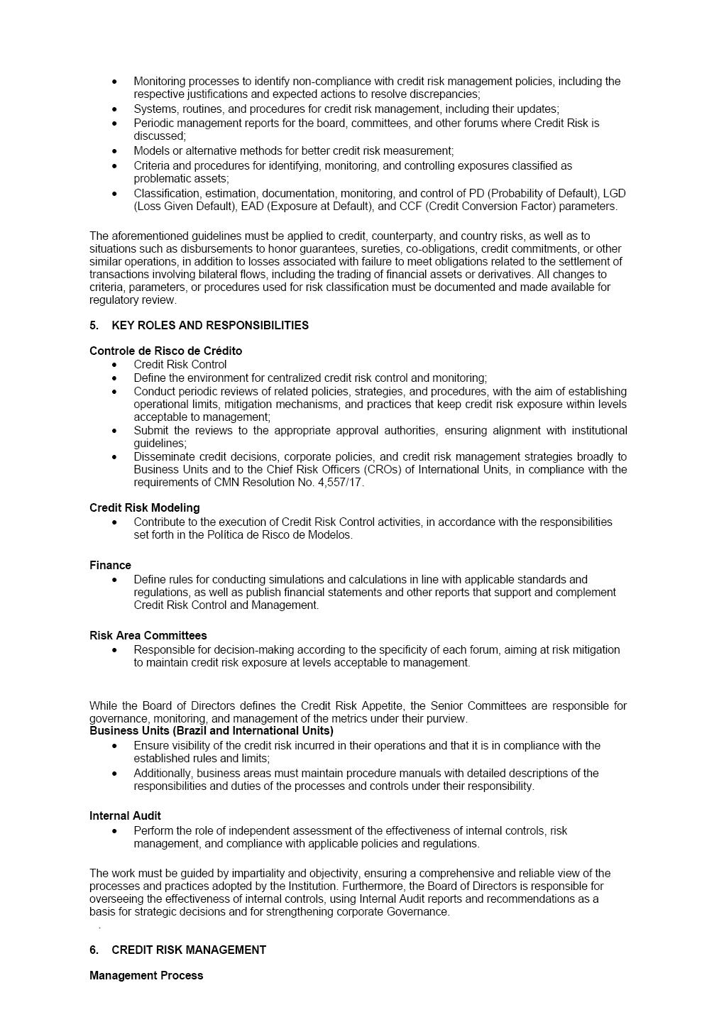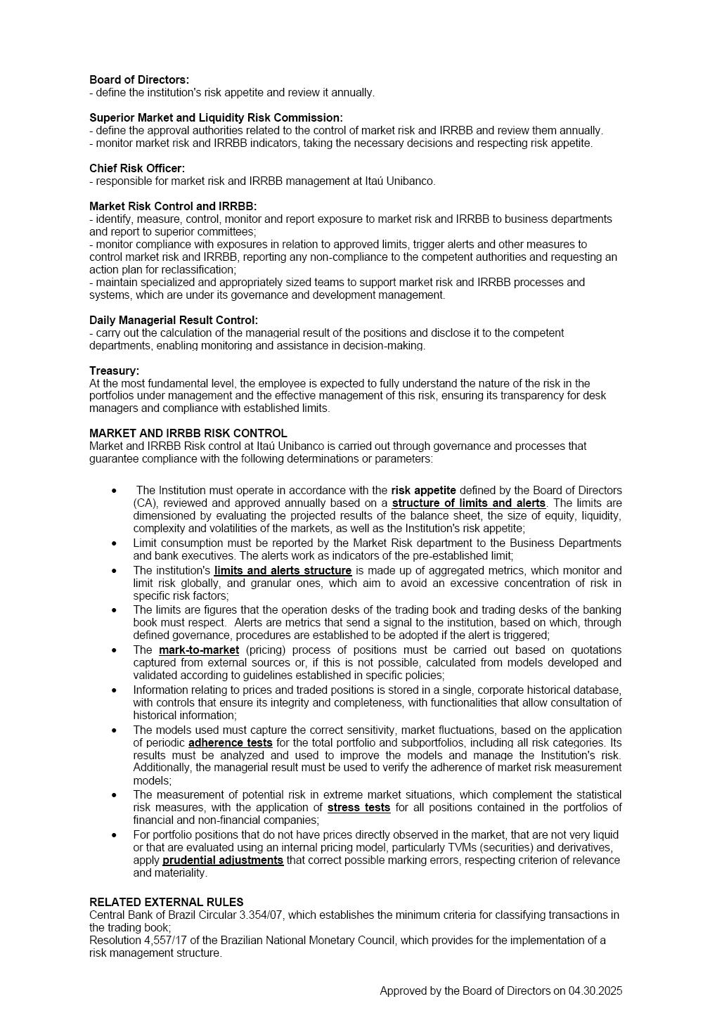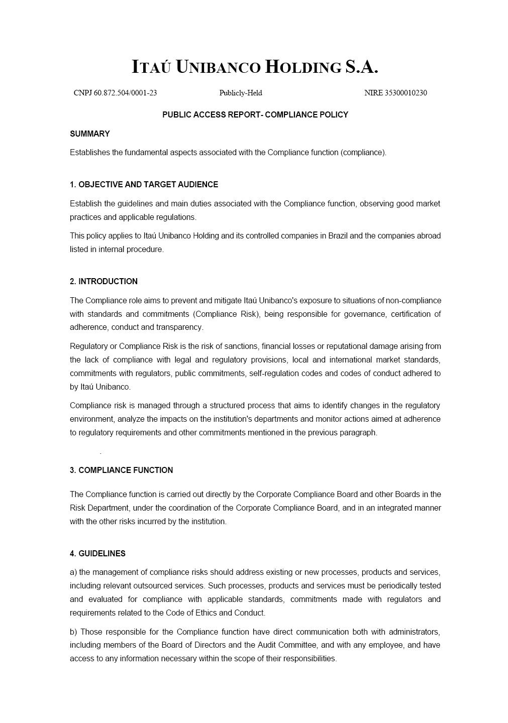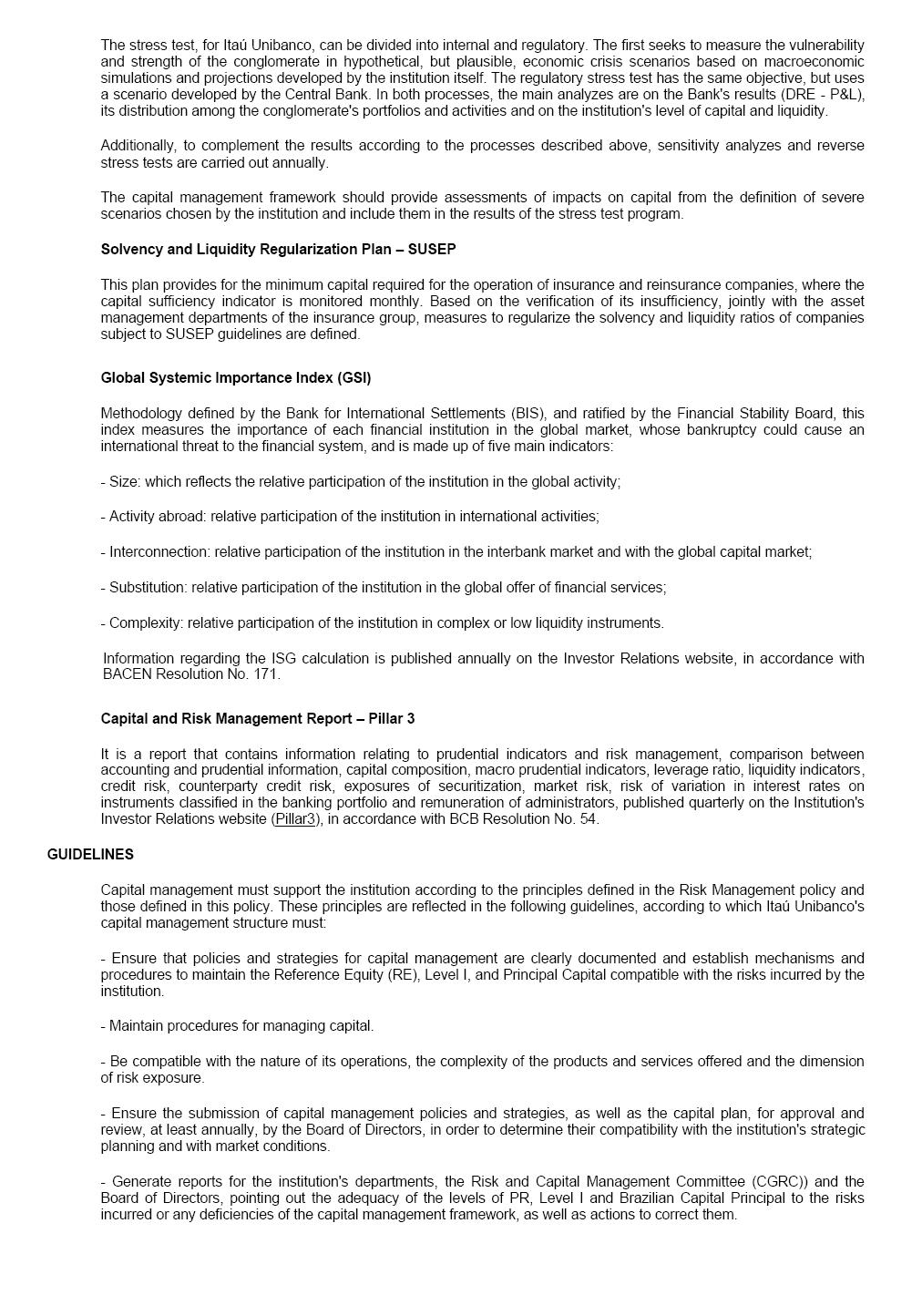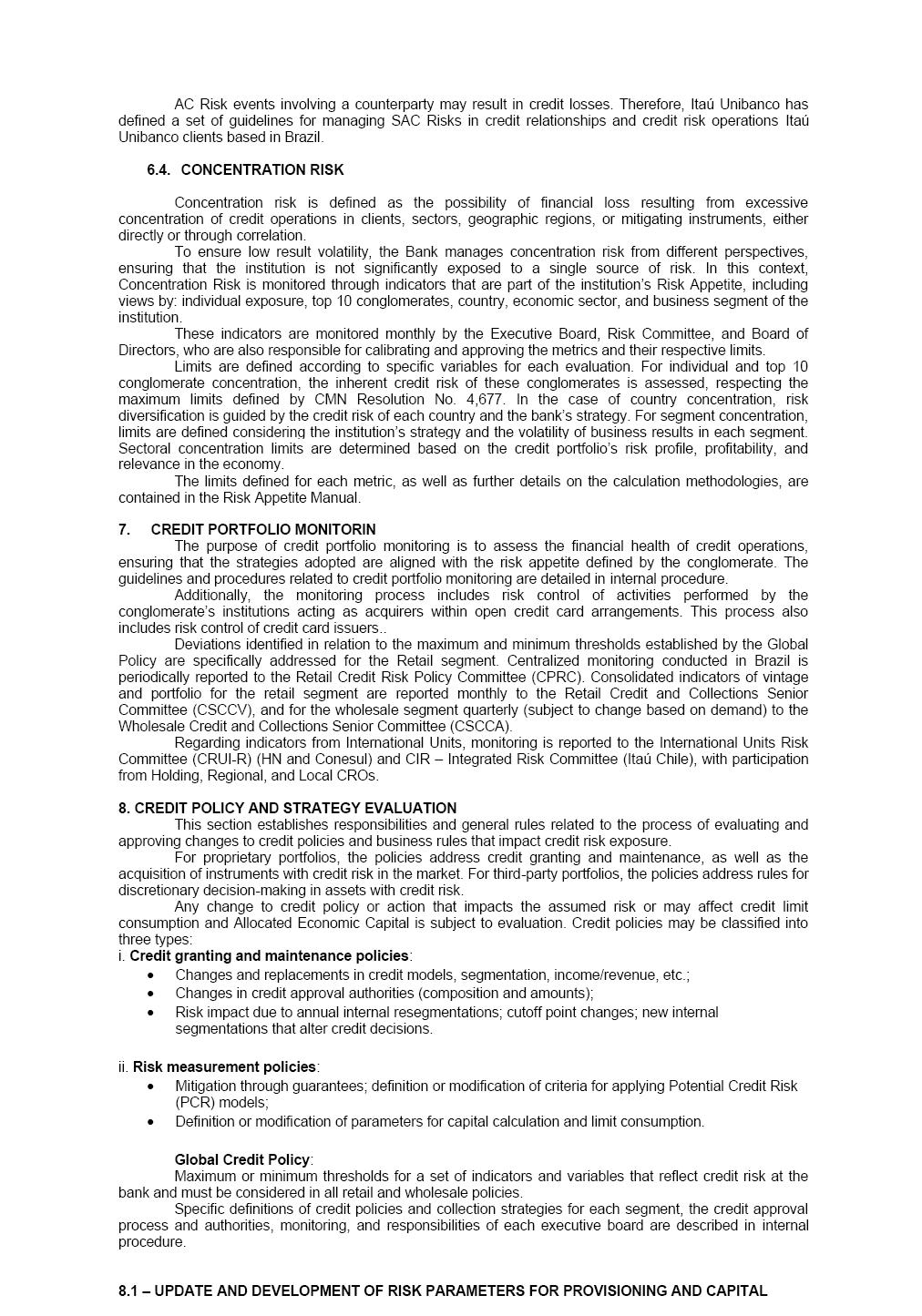 ITAÚ UNIBANCO HOLDING S.A. CNPJ 60.872.504/0001-23 Publicly-Held NIRE 35300010230 PUBLIC ACCESS REPORT - SOCIAL, ENVIRONMENTAL AND CLIMATE RISK POLICY OBJECTIVE Establishes the rules and responsibilities related to the management of Social, Environmental and Climate Risks of Itaú Unibanco Holding SA (“Itaú Unibanco”), observing the applicable regulations, in particular CMN Resolution 4,557/17, amended by CMN Resolution 4,943/21 (“Res. 4.557/17”). TARGET AUDIENCE This policy is applicable to the activities of Itaú Unibanco and its subsidiaries. INTRODUCTION Itaú Unibanco recognizes the growing relevance of Social, Environmental, and Climate Risks (“SEC” or “SEC Risks”) in the global context and their direct influence on financial operations and business sustainability. Proper management of these risks is essential to contribute to sustainable development and meet regulatory requirements and stakeholder expectations. The approach adopted in this policy considers the integration of SEC Risks with the organization's traditional risks, following the principles of relevance and proportionality. In this way, it ensures that strategic and operational decisions are oriented towards mitigating negative impacts and maximizing opportunities associated with a sustainable economy. DEFINITIONS AND CONCEPTS According to Resolution 4.557/17, SAC Risks are understood as the possibility of causing losses to the institution, including reputational losses. SAC Risks must be identified and managed based on criteria of relevance and proportionality, ensuring that actions taken are appropriate and compatible with each risk. The dimensions considered are: •Social: Refers to events associated with the violation of fundamental rights and guarantees or actsharmful to the Common Interest. This includes issues such as inadequate working conditions andnegative impacts on local communities. Management should prioritize the protection of human rightsand the promotion of social well-being. •Environmental: Involves events associated with environmental degradation, biodiversity loss, andexcessive use of natural resources. Examples include deforestation, pollution, and depletion ofwater resources. The approach should focus on environmental conservation, sustainable resourceuse, and the promotion of ecological practices. •Climate: Encompasses two main aspects: (i) the transition to a low-carbon economy, which aims toreduce or offset greenhouse gas emissions and preserve natural mechanisms for capturing thesegases, such as forests and oceans; and (ii) adaptation to extreme weather events and long-termenvironmental changes, such as severe storms, prolonged droughts, and rising sea levels, whichare attributed to changes in climate patterns. Management should include mitigation and adaptationstrategies to minimize the adverse impacts of climate change. PRINCIPLES SAC Risks materialize in Traditional Risks, requiring each risk discipline to develop specific actions to identify, measure, assess, monitor, report, control, and mitigate the potential adverse effects arising from their Version for Public Release interactions with SAC Risks. The management of these risks must follow the guidelines established in this policy, as well as: i. The precepts and guidelines provided in the Social, Environmental, and Climate Responsibility Policy (“PRSAC”), in line with CMN Resolution 4.945/21, which establishes standards for incorporating sustainability criteria into financial operations; ii. The provisions of the Risk Management Policy (Global), which provides a comprehensive and consistent framework throughout the organization; iii. The principles of relevance and proportionality, ensuring that actions are appropriate to the magnitude and importance of each identified risk; iv. The determinations provided in related Procedures (“PR”), which detail the processes and practices to be followed; v. The public commitments assumed by Itaú Unibanco, which reflect the institution's commitment to sustainability and corporate responsibility; vi. The standards related to the topic, as well as best practices and market trends, ensuring that the bank is aligned with the most advanced and effective risk management standards. SAC RISK MANAGEMENT GUIDELINES For effective management, SAC Risks must be identified from three interdependent perspectives: • Financial: This perspective considers events that have the potential to materialize into monetary losses for Itaú Unibanco. This includes direct impacts, such as fines and penalties, as well as indirect impacts, such as the loss of business opportunities due to issues related to social, environmental, and climate risks. • Reputational: when an event has the potential to translate into a negative perception of Itaú Unibanco's reputation by stakeholders, as defined in internal procedure. • Legal: when associated with inadequacy or deficiency in contracts signed by the institution, sanctions due to non-compliance with legal provisions and indemnities for damages to third parties arising from activities carried out by the institution. SAC Risks must be classified based on elements of probability and severity. This means assessing the likelihood of a risk event occurring and the severity of its potential impacts. This classification allows for the prioritization of mitigation actions and efficient allocation of resources. Additionally, it is important for Itaú Unibanco to maintain a continuous process of monitoring and reviewing SAC Risks, adapting its strategies as necessary to respond to changes in the external and internal environment. ESG Criteria for Clients and Suppliers Itaú Unibanco's SAC Risk management includes methodologies and processes that consider SAC and governance criteria in the evaluation of clients and suppliers. These methodologies may include: (i) In the social dimension, working conditions and impact on traditional communities; (ii) In the enviro
