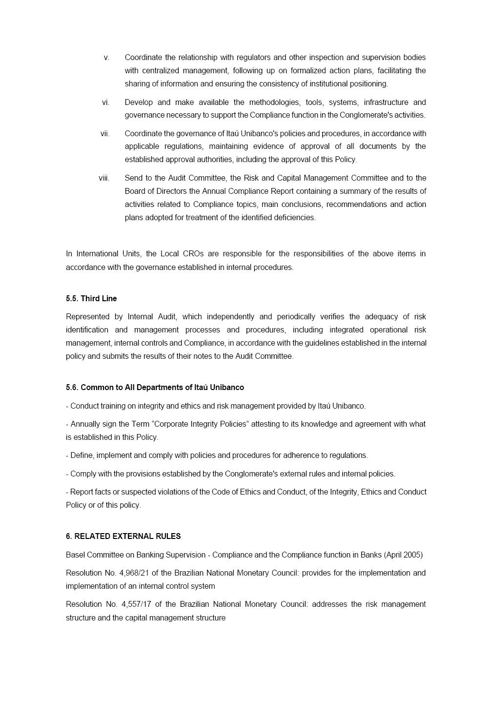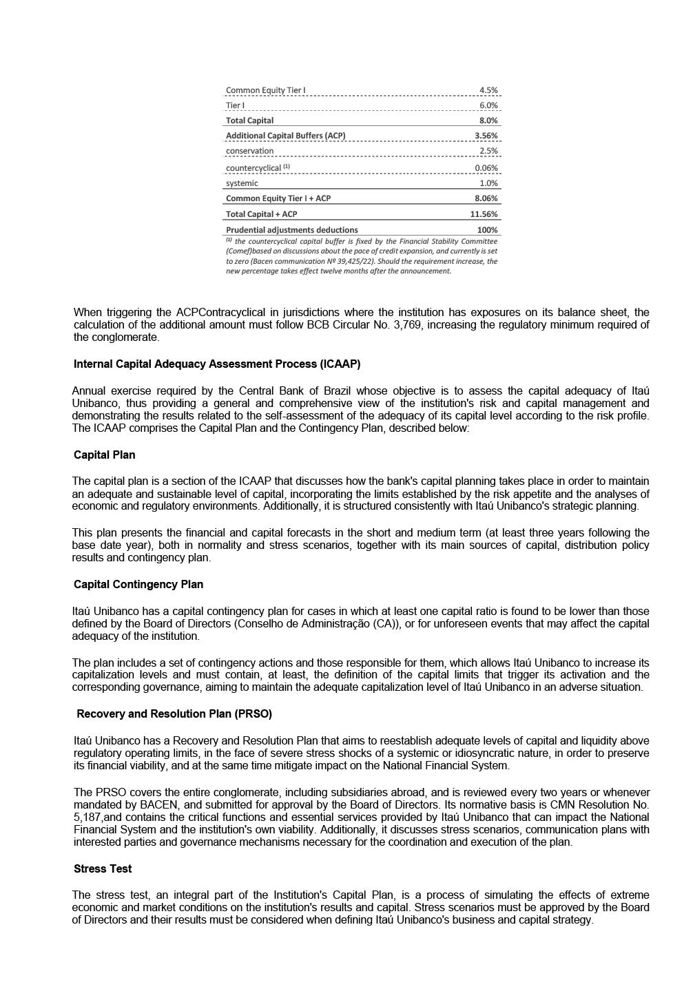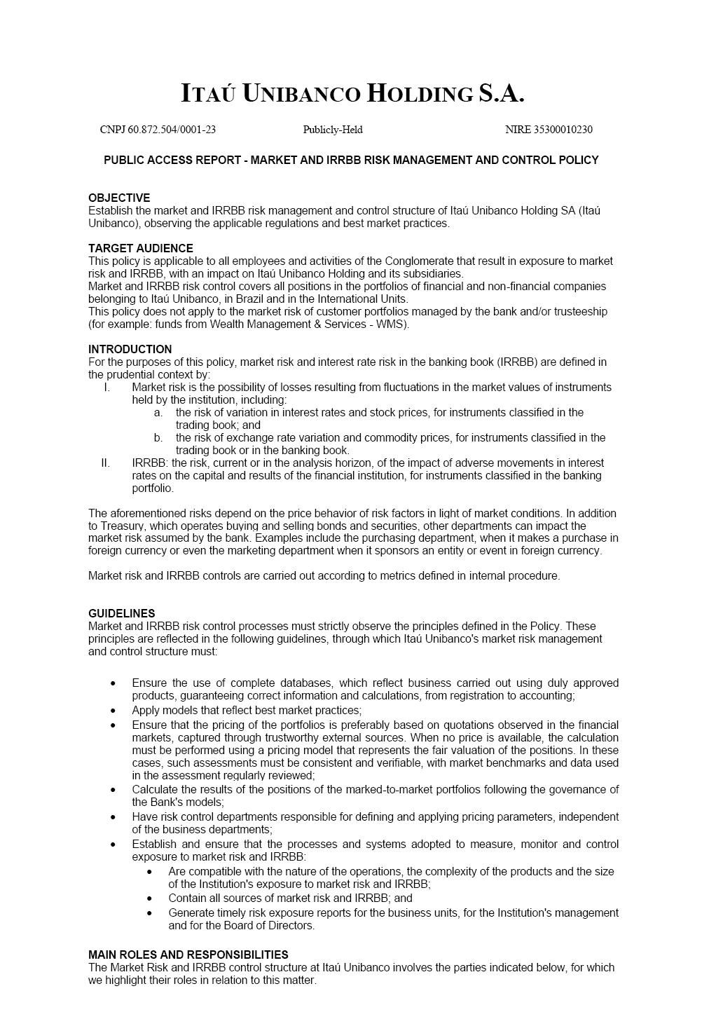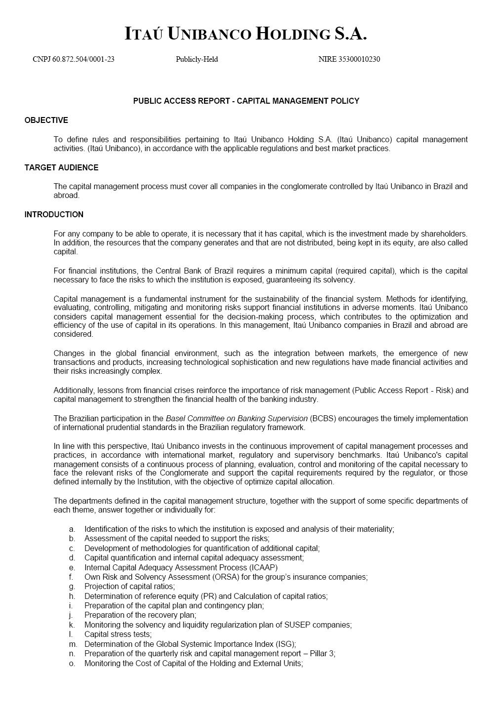 ITAÚ UNIBANCO HOLDING S.A. CNPJ 60.872.504/0001-23 Publicly-Held NIRE 35300010230 PUBLIC ACCESS REPORT - SOCIAL, ENVIRONMENTAL AND CLIMATE RISK POLICY OBJECTIVE Establishes the rules and responsibilities related to the management of Social, Environmental and Climate Risks of Itaú Unibanco Holding SA (“Itaú Unibanco”), observing the applicable regulations, in particular CMN Resolution 4,557/17, amended by CMN Resolution 4,943/21 (“Res. 4.557/17”). TARGET AUDIENCE This policy is applicable to the activities of Itaú Unibanco and its subsidiaries. INTRODUCTION Itaú Unibanco recognizes the growing relevance of Social, Environmental, and Climate Risks (“SEC” or “SEC Risks”) in the global context and their direct influence on financial operations and business sustainability. Proper management of these risks is essential to contribute to sustainable development and meet regulatory requirements and stakeholder expectations. The approach adopted in this policy considers the integration of SEC Risks with the organization's traditional risks, following the principles of relevance and proportionality. In this way, it ensures that strategic and operational decisions are oriented towards mitigating negative impacts and maximizing opportunities associated with a sustainable economy. DEFINITIONS AND CONCEPTS According to Resolution 4.557/17, SAC Risks are understood as the possibility of causing losses to the institution, including reputational losses. SAC Risks must be identified and managed based on criteria of relevance and proportionality, ensuring that actions taken are appropriate and compatible with each risk. The dimensions considered are: •Social: Refers to events associated with the violation of fundamental rights and guarantees or actsharmful to the Common Interest. This includes issues such as inadequate working conditions andnegative impacts on local communities. Management should prioritize the protection of human rightsand the promotion of social well-being. •Environmental: Involves events associated with environmental degradation, biodiversity loss, andexcessive use of natural resources. Examples include deforestation, pollution, and depletion ofwater resources. The approach should focus on environmental conservation, sustainable resourceuse, and the promotion of ecological practices. •Climate: Encompasses two main aspects: (i) the transition to a low-carbon economy, which aims toreduce or offset greenhouse gas emissions and preserve natural mechanisms for capturing thesegases, such as forests and oceans; and (ii) adaptation to extreme weather events and long-termenvironmental changes, such as severe storms, prolonged droughts, and rising sea levels, whichare attributed to changes in climate patterns. Management should include mitigation and adaptationstrategies to minimize the adverse impacts of climate change. PRINCIPLES SAC Risks materialize in Traditional Risks, requiring each risk discipline to develop specific actions to identify, measure, assess, monitor, report, control, and mitigate the potential adverse effects arising from their Version for Public Release interactions with SAC Risks. The management of these risks must follow the guidelines established in this policy, as well as: i. The precepts and guidelines provided in the Social, Environmental, and Climate Responsibility Policy (“PRSAC”), in line with CMN Resolution 4.945/21, which establishes standards for incorporating sustainability criteria into financial operations; ii. The provisions of the Risk Management Policy (Global), which provides a comprehensive and consistent framework throughout the organization; iii. The principles of relevance and proportionality, ensuring that actions are appropriate to the magnitude and importance of each identified risk; iv. The determinations provided in related Procedures (“PR”), which detail the processes and practices to be followed; v. The public commitments assumed by Itaú Unibanco, which reflect the institution's commitment to sustainability and corporate responsibility; vi. The standards related to the topic, as well as best practices and market trends, ensuring that the bank is aligned with the most advanced and effective risk management standards. SAC RISK MANAGEMENT GUIDELINES For effective management, SAC Risks must be identified from three interdependent perspectives: • Financial: This perspective considers events that have the potential to materialize into monetary losses for Itaú Unibanco. This includes direct impacts, such as fines and penalties, as well as indirect impacts, such as the loss of business opportunities due to issues related to social, environmental, and climate risks. • Reputational: when an event has the potential to translate into a negative perception of Itaú Unibanco's reputation by stakeholders, as defined in internal procedure. • Legal: when associated with inadequacy or deficiency in contracts signed by the institution, sanctions due to non-compliance with legal provisions and indemnities for damages to third parties arising from activities carried out by the institution. SAC Risks must be classified based on elements of probability and severity. This means assessing the likelihood of a risk event occurring and the severity of its potential impacts. This classification allows for the prioritization of mitigation actions and efficient allocation of resources. Additionally, it is important for Itaú Unibanco to maintain a continuous process of monitoring and reviewing SAC Risks, adapting its strategies as necessary to respond to changes in the external and internal environment. ESG Criteria for Clients and Suppliers Itaú Unibanco's SAC Risk management includes methodologies and processes that consider SAC and governance criteria in the evaluation of clients and suppliers. These methodologies may include: (i) In the social dimension, working conditions and impact on traditional communities; (ii) In the enviro