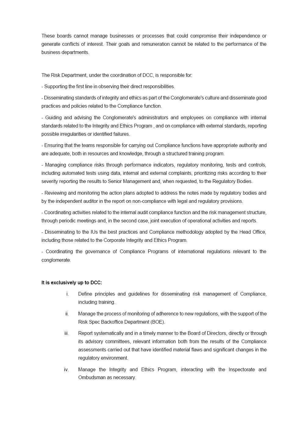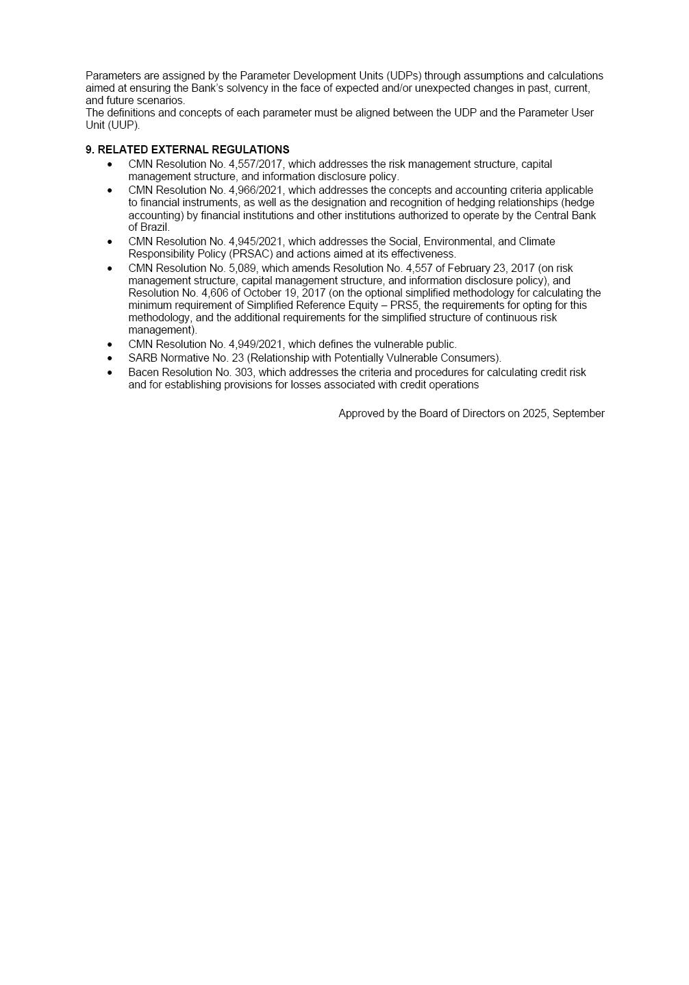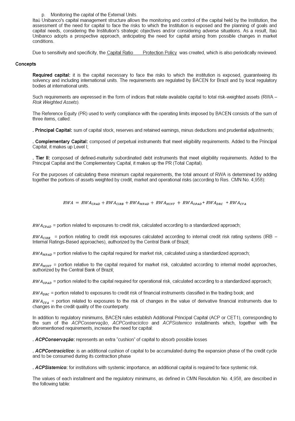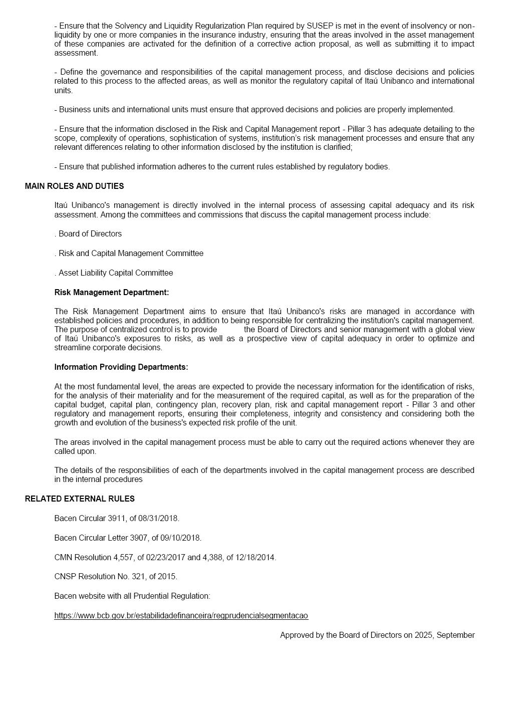 ITAÚ UNIBANCO HOLDING S.A. CNPJ 60.872.504/0001-23 Publicly-Held NIRE 35300010230 PUBLIC ACCESS REPORT - SOCIAL, ENVIRONMENTAL AND CLIMATE RISK POLICY OBJECTIVE Establishes the rules and responsibilities related to the management of Social, Environmental and Climate Risks of Itaú Unibanco Holding SA (“Itaú Unibanco”), observing the applicable regulations, in particular CMN Resolution 4,557/17, amended by CMN Resolution 4,943/21 (“Res. 4.557/17”). TARGET AUDIENCE This policy is applicable to the activities of Itaú Unibanco and its subsidiaries. INTRODUCTION Itaú Unibanco recognizes the growing relevance of Social, Environmental, and Climate Risks (“SEC” or “SEC Risks”) in the global context and their direct influence on financial operations and business sustainability. Proper management of these risks is essential to contribute to sustainable development and meet regulatory requirements and stakeholder expectations. The approach adopted in this policy considers the integration of SEC Risks with the organization's traditional risks, following the principles of relevance and proportionality. In this way, it ensures that strategic and operational decisions are oriented towards mitigating negative impacts and maximizing opportunities associated with a sustainable economy. DEFINITIONS AND CONCEPTS According to Resolution 4.557/17, SAC Risks are understood as the possibility of causing losses to the institution, including reputational losses. SAC Risks must be identified and managed based on criteria of relevance and proportionality, ensuring that actions taken are appropriate and compatible with each risk. The dimensions considered are: •Social: Refers to events associated with the violation of fundamental rights and guarantees or actsharmful to the Common Interest. This includes issues such as inadequate working conditions andnegative impacts on local communities. Management should prioritize the protection of human rightsand the promotion of social well-being. •Environmental: Involves events associated with environmental degradation, biodiversity loss, andexcessive use of natural resources. Examples include deforestation, pollution, and depletion ofwater resources. The approach should focus on environmental conservation, sustainable resourceuse, and the promotion of ecological practices. •Climate: Encompasses two main aspects: (i) the transition to a low-carbon economy, which aims toreduce or offset greenhouse gas emissions and preserve natural mechanisms for capturing thesegases, such as forests and oceans; and (ii) adaptation to extreme weather events and long-termenvironmental changes, such as severe storms, prolonged droughts, and rising sea levels, whichare attributed to changes in climate patterns. Management should include mitigation and adaptationstrategies to minimize the adverse impacts of climate change. PRINCIPLES SAC Risks materialize in Traditional Risks, requiring each risk discipline to develop specific actions to identify, measure, assess, monitor, report, control, and mitigate the potential adverse effects arising from their Version for Public Release interactions with SAC Risks. The management of these risks must follow the guidelines established in this policy, as well as: i. The precepts and guidelines provided in the Social, Environmental, and Climate Responsibility Policy (“PRSAC”), in line with CMN Resolution 4.945/21, which establishes standards for incorporating sustainability criteria into financial operations; ii. The provisions of the Risk Management Policy (Global), which provides a comprehensive and consistent framework throughout the organization; iii. The principles of relevance and proportionality, ensuring that actions are appropriate to the magnitude and importance of each identified risk; iv. The determinations provided in related Procedures (“PR”), which detail the processes and practices to be followed; v. The public commitments assumed by Itaú Unibanco, which reflect the institution's commitment to sustainability and corporate responsibility; vi. The standards related to the topic, as well as best practices and market trends, ensuring that the bank is aligned with the most advanced and effective risk management standards. SAC RISK MANAGEMENT GUIDELINES For effective management, SAC Risks must be identified from three interdependent perspectives: • Financial: This perspective considers events that have the potential to materialize into monetary losses for Itaú Unibanco. This includes direct impacts, such as fines and penalties, as well as indirect impacts, such as the loss of business opportunities due to issues related to social, environmental, and climate risks. • Reputational: when an event has the potential to translate into a negative perception of Itaú Unibanco's reputation by stakeholders, as defined in internal procedure. • Legal: when associated with inadequacy or deficiency in contracts signed by the institution, sanctions due to non-compliance with legal provisions and indemnities for damages to third parties arising from activities carried out by the institution. SAC Risks must be classified based on elements of probability and severity. This means assessing the likelihood of a risk event occurring and the severity of its potential impacts. This classification allows for the prioritization of mitigation actions and efficient allocation of resources. Additionally, it is important for Itaú Unibanco to maintain a continuous process of monitoring and reviewing SAC Risks, adapting its strategies as necessary to respond to changes in the external and internal environment. ESG Criteria for Clients and Suppliers Itaú Unibanco's SAC Risk management includes methodologies and processes that consider SAC and governance criteria in the evaluation of clients and suppliers. These methodologies may include: (i) In the social dimension, working conditions and impact on traditional communities; (ii) In the enviro