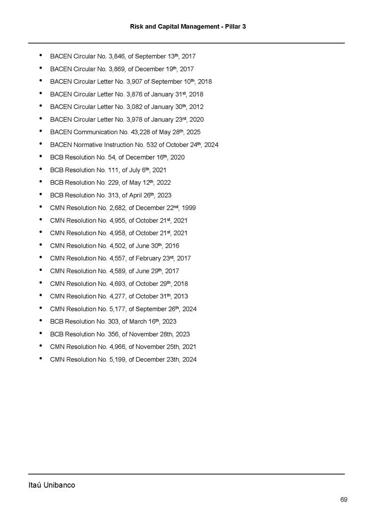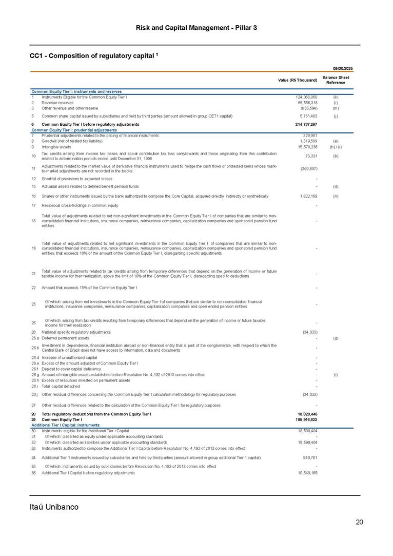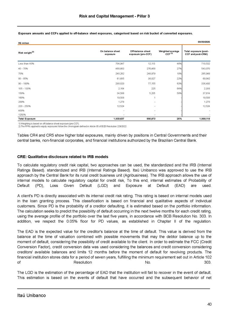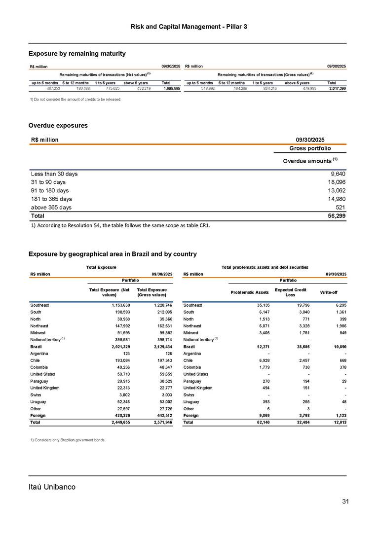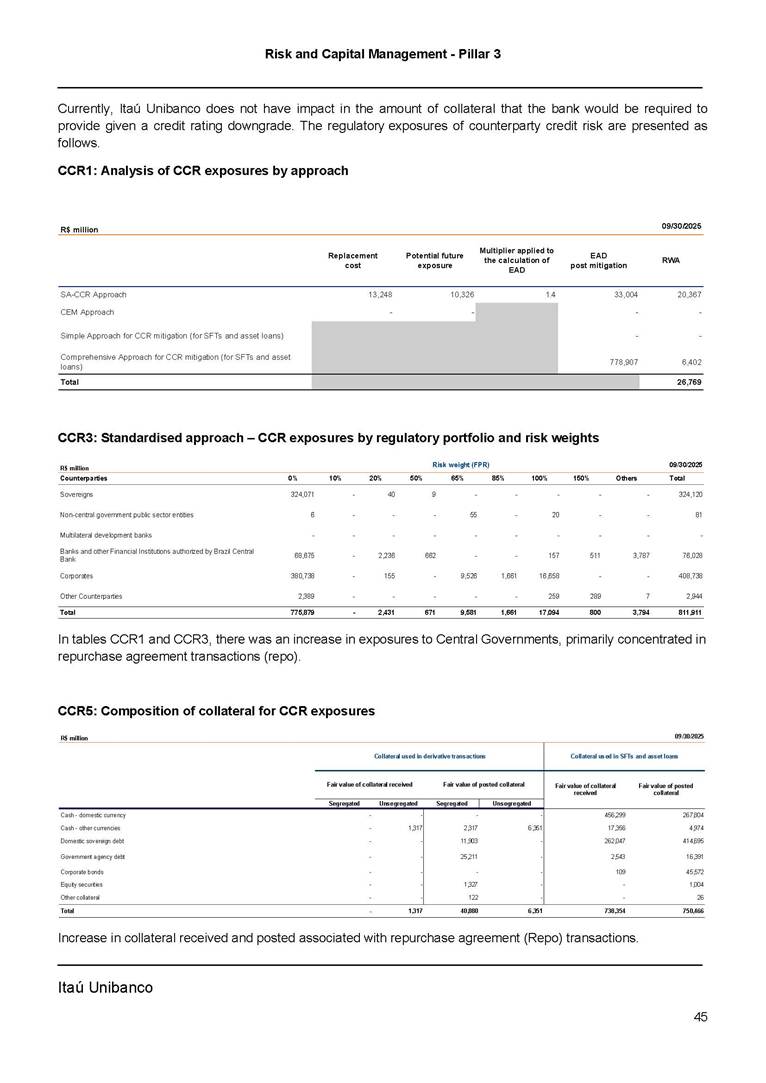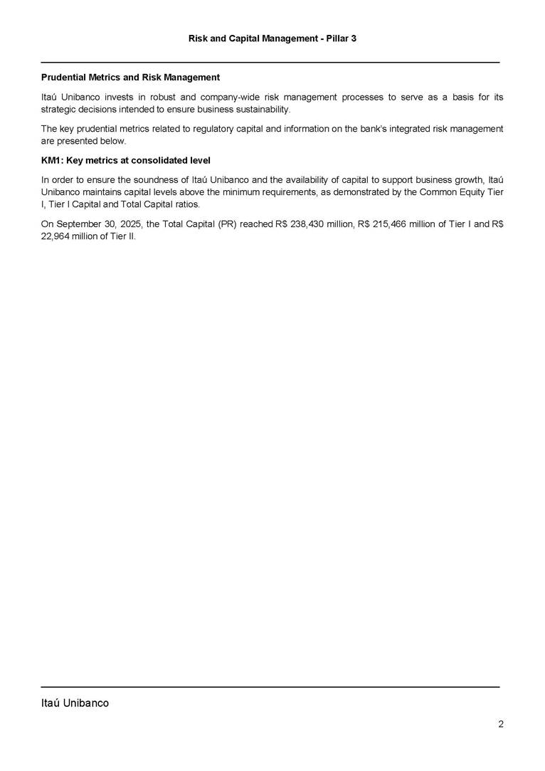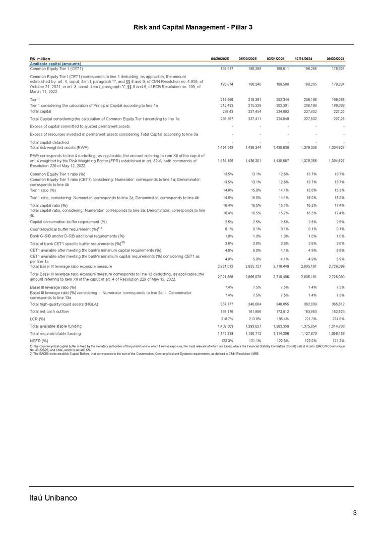 Risk and Capital Management - Pillar 3 Itaú Unibanco Holding S.A. Third Quarter of 2025 Objective 1 Key indicators 1 Prudential Metrics and Risk Management 2 KM1: Key metrics at consolidated level 2 OVA: Bank risk management approach 4 Scope and main characteristics of risk management 4 Risk and Capital Governance 5 Ituber Culture 6 Risk Appetite 7 Stress Testing 8 Recovery and Resolution Plan 8 Capital Adequacy Assessment 10 Capital Adequacy 10 OV1: Overview of risk-weighted assets (RWA) 10 Links between financial statements and regulatory exposures 11 LIA: Explanations of differences between accounting and regulatory exposure amounts 11 LI1: Differences between accounting and regulatory scopes of consolidation and mapping of financial statement categories with regulatory risk categories 12 LI2: Main sources of differences between regulatory exposure amounts and carrying values in financial statements 13 PV1: Prudent valuation adjustments (PVA) 13 Institutions that comprise the Financial Statement of Itaú Unibanco Holding 15 Non Consolidated Institutions 18 Material Entities 19 Composition of Capital 19 CCA: Main features of regulatory capital instuments 19 CC1: Composition of regulatory capital 20 CC2: Reconciliation of regulatory capital to balance sheet 22 Macroprudential Indicators 23 CCyB1: Geographical distribution of credit risk exposures considered in the calculation of the Countercyclical Capital Buffer 23 GSIB1: Disclosure of G-SIB indicators 23 Leverage Ratio 23 LR1: Summary comparison of accounting assets vs leverage ratio exposure measure (RA) 24 LR2: Leverage ratio common disclosure 24 Liquidity Ratios 25 LIQA: Liquidity Risk Management Information 25 Framework and Treatment 25 LIQ1: Liquidity Coverage Ratio (LCR) 26 LIQ2: Net Stable Funding Ratio (NSFR) 27 Credit Risk 28 CRA: Qualitative information on credit risk management 28 CR1: Credit Quality of Assets 29 CR2: Changes in Stock of defaulted loans and debts securities 30 CRB: Additional disclosure related to the credit quality of assets Credit risk mitigation 30 Exposure by industry 30 Exposure by remaining maturity 31 Overdue exposures 31 Exposure by geographical area in Brazil and by country 31 Largest debtors exposures 32 Restructured exposures 32 CRC: Qualitative disclosure related to Credit Risk Mitigation techniques 32 CR3: Credit Risk mitigation techniques – overview 33 CR4: Standardized Approach – Credit Risk exposure and credit risk mitigation effects 34 CR5: Standardized Approach – exposures by asset classes and risk weights 35 CRE: Qualitative disclosure related to IRB models 39 CR8: RWA flow statements of credit risk exposures under IRB 41 CMS1: Comparison of modelled and standardised RWA at risk level 41 Counterparty Credit Risk (CCR) 41 CCRA: Qualitative disclosure related to CCR 44 CCR1: Analysis of CCR exposures by approach 42 CCR3: Standardized approach – CCR exposures by regulatory portfolio and risk weights 42 CCR5: Composition of collateral for CCR exposures 42 CCR6: CCR associated with credit derivatives exposures 43 CCR8: CCR associated with Exposures to central counterparties 43 Securitization Exposures 43 SECA: Qualitative disclosure requirements related to securitisation exposures 43 SEC1: Securitisation exposures in the banking book 44 SEC2: Securitisation exposures in the trading book 44 SEC3: Securitisation exposures in the banking book and associated regulatory capital requirements – bank acting as originator or as sponsor 44 SEC4: Securitisation exposures in the banking book and associated capital requirements – bank acting as investor 44 Market Risk 45 MRA: Qualitative disclosure requirements related to market risk 45 MR1: Market risk under standardized approach 47 MRB: Qualitative disclosures on market risk in the Internal Models Approach (IMA) 47 MR2: RWA flow statements of market risk exposures under an IMA 51 Exposures subject to market risk 51 MR3: IMA values for trading portfolios 51 MR4: Comparison of VaR estimates with gains/losses 52 Backtesting 52 Total Exposure associated with Derivatives 52 IRRBB 53 IRRBBA: IRRBB risk management objectives and policies 53 Framework and Treatment 53 Other Risks 55 Insurance products, pension plans and premium bonds risks 55 Social, Environmental and Climatic Risks 55 Model Risk 56 Regulatory or Compliance Risk 57 Reputational Risk 57 Cyber Risk 59 Country Risk 59 Business and Strategy Risk 59 Step-in Risk 60 Emerging Risks 60 Operational Risk 60 Crisis Management and Operational Resilience 61 Independent Validation of Risk Models 62 Glossary of Acronyms 62 Glossary of Regulations 65 Risk and Capital Management - Pillar 3 __________________________________________________________________________________________ __________________________________________________________________________________________ Itaú Unibanco 1 Objective This document presents Itaú Unibanco Holding S.A. (Itaú Unibanco) information required by the Central Bank of Brazil (BACEN) through Resolution BCB nº 54 and subsequent amendments, which addresses the disclosure of information on risks and capital management, the comparison between accounting and prudential information, the liquidity and market risk indicators, the calculation of risk-weighted assets (RWA), the calculation of the Total Capital (“Patrimônio de Referência” - PR), and the compensation of management members. 1 The referred Resolution brought several amendments in the disclosure format of the Pillar 3 information, besides changes in the scope and frequency of the information disclosed. All these amendments, implemented by the Central Bank, aim the convergence of the Brazilian financial regulation to the recommendations of the Basel Committee, seeking to harmonize the information disclosed by financial institutions at an international level, and taking into account the structural conditions of the Brazilian economy. The disclosure policy of the Risk and Capital Management Report presents t