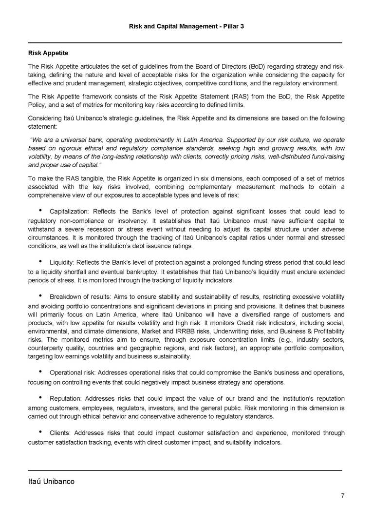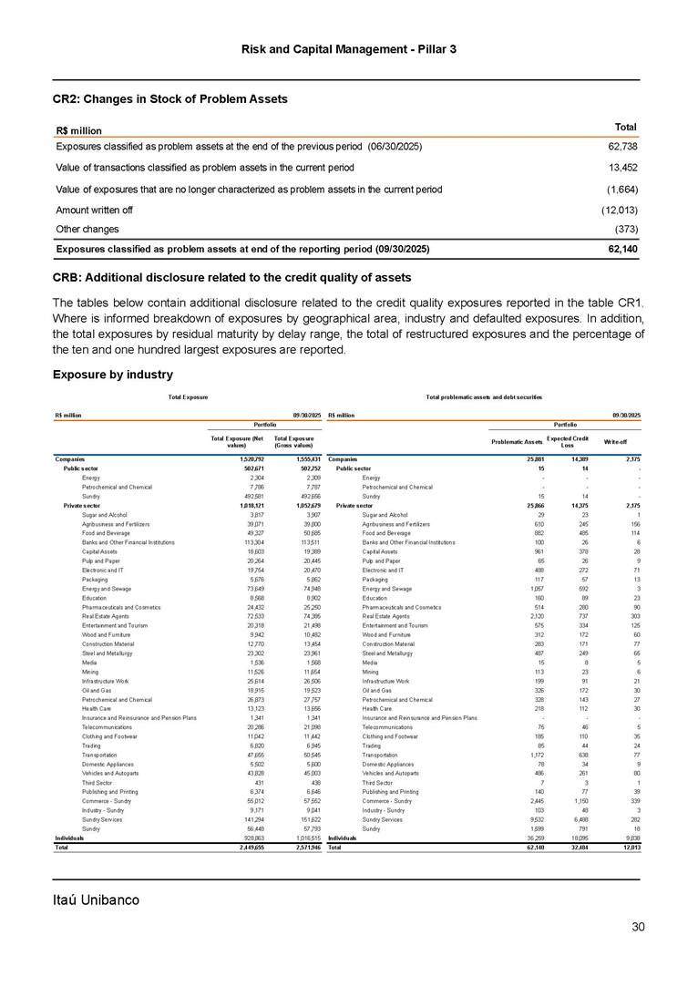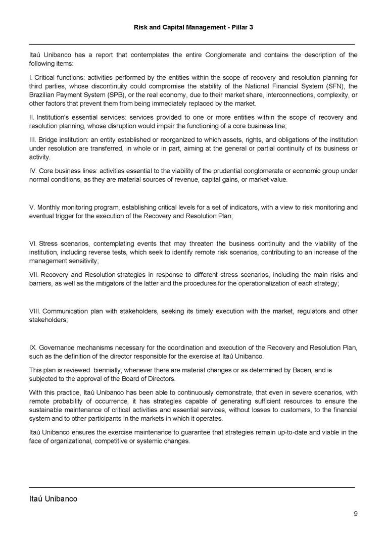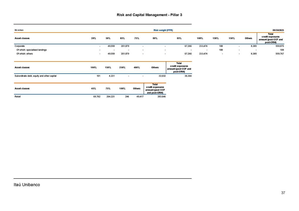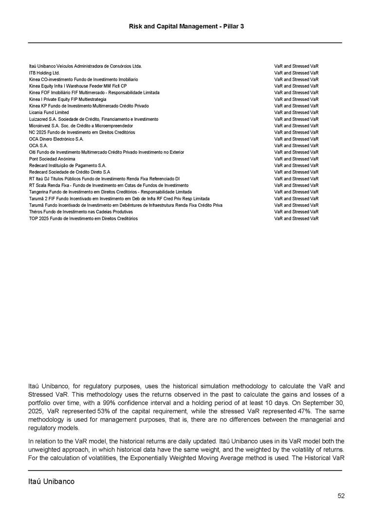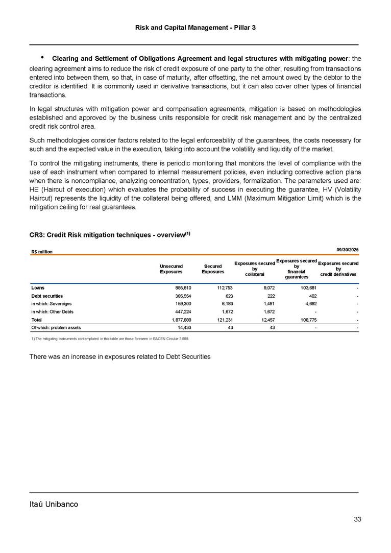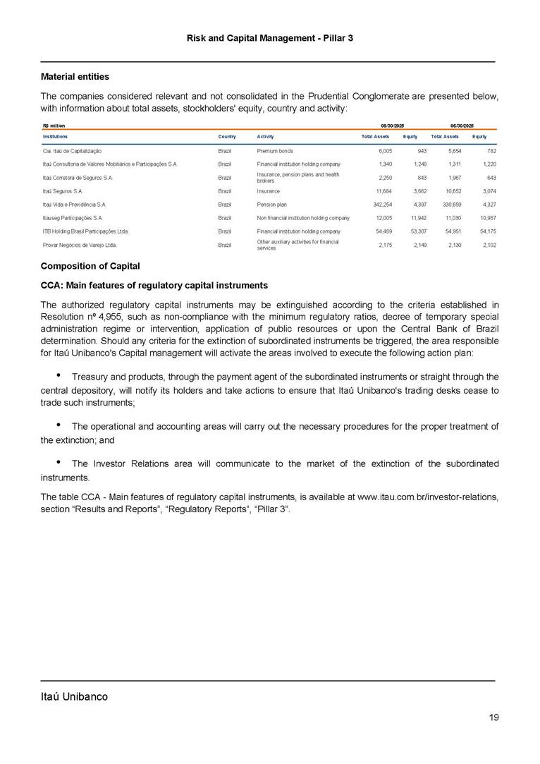 Risk and Capital Management - Pillar 3 Itaú Unibanco Holding S.A. Third Quarter of 2025 Objective 1 Key indicators 1 Prudential Metrics and Risk Management 2 KM1: Key metrics at consolidated level 2 OVA: Bank risk management approach 4 Scope and main characteristics of risk management 4 Risk and Capital Governance 5 Ituber Culture 6 Risk Appetite 7 Stress Testing 8 Recovery and Resolution Plan 8 Capital Adequacy Assessment 10 Capital Adequacy 10 OV1: Overview of risk-weighted assets (RWA) 10 Links between financial statements and regulatory exposures 11 LIA: Explanations of differences between accounting and regulatory exposure amounts 11 LI1: Differences between accounting and regulatory scopes of consolidation and mapping of financial statement categories with regulatory risk categories 12 LI2: Main sources of differences between regulatory exposure amounts and carrying values in financial statements 13 PV1: Prudent valuation adjustments (PVA) 13 Institutions that comprise the Financial Statement of Itaú Unibanco Holding 15 Non Consolidated Institutions 18 Material Entities 19 Composition of Capital 19 CCA: Main features of regulatory capital instuments 19 CC1: Composition of regulatory capital 20 CC2: Reconciliation of regulatory capital to balance sheet 22 Macroprudential Indicators 23 CCyB1: Geographical distribution of credit risk exposures considered in the calculation of the Countercyclical Capital Buffer 23 GSIB1: Disclosure of G-SIB indicators 23 Leverage Ratio 23 LR1: Summary comparison of accounting assets vs leverage ratio exposure measure (RA) 24 LR2: Leverage ratio common disclosure 24 Liquidity Ratios 25 LIQA: Liquidity Risk Management Information 25 Framework and Treatment 25 LIQ1: Liquidity Coverage Ratio (LCR) 26 LIQ2: Net Stable Funding Ratio (NSFR) 27 Credit Risk 28 CRA: Qualitative information on credit risk management 28 CR1: Credit Quality of Assets 29 CR2: Changes in Stock of defaulted loans and debts securities 30 CRB: Additional disclosure related to the credit quality of assets Credit risk mitigation 30 Exposure by industry 30 Exposure by remaining maturity 31 Overdue exposures 31 Exposure by geographical area in Brazil and by country 31 Largest debtors exposures 32 Restructured exposures 32 CRC: Qualitative disclosure related to Credit Risk Mitigation techniques 32 CR3: Credit Risk mitigation techniques – overview 33 CR4: Standardized Approach – Credit Risk exposure and credit risk mitigation effects 34 CR5: Standardized Approach – exposures by asset classes and risk weights 35 CRE: Qualitative disclosure related to IRB models 39 CR8: RWA flow statements of credit risk exposures under IRB 41 CMS1: Comparison of modelled and standardised RWA at risk level 41 Counterparty Credit Risk (CCR) 41 CCRA: Qualitative disclosure related to CCR 44 CCR1: Analysis of CCR exposures by approach 42 CCR3: Standardized approach – CCR exposures by regulatory portfolio and risk weights 42 CCR5: Composition of collateral for CCR exposures 42 CCR6: CCR associated with credit derivatives exposures 43 CCR8: CCR associated with Exposures to central counterparties 43 Securitization Exposures 43 SECA: Qualitative disclosure requirements related to securitisation exposures 43 SEC1: Securitisation exposures in the banking book 44 SEC2: Securitisation exposures in the trading book 44 SEC3: Securitisation exposures in the banking book and associated regulatory capital requirements – bank acting as originator or as sponsor 44 SEC4: Securitisation exposures in the banking book and associated capital requirements – bank acting as investor 44 Market Risk 45 MRA: Qualitative disclosure requirements related to market risk 45 MR1: Market risk under standardized approach 47 MRB: Qualitative disclosures on market risk in the Internal Models Approach (IMA) 47 MR2: RWA flow statements of market risk exposures under an IMA 51 Exposures subject to market risk 51 MR3: IMA values for trading portfolios 51 MR4: Comparison of VaR estimates with gains/losses 52 Backtesting 52 Total Exposure associated with Derivatives 52 IRRBB 53 IRRBBA: IRRBB risk management objectives and policies 53 Framework and Treatment 53 Other Risks 55 Insurance products, pension plans and premium bonds risks 55 Social, Environmental and Climatic Risks 55 Model Risk 56 Regulatory or Compliance Risk 57 Reputational Risk 57 Cyber Risk 59 Country Risk 59 Business and Strategy Risk 59 Step-in Risk 60 Emerging Risks 60 Operational Risk 60 Crisis Management and Operational Resilience 61 Independent Validation of Risk Models 62 Glossary of Acronyms 62 Glossary of Regulations 65 Risk and Capital Management - Pillar 3 __________________________________________________________________________________________ __________________________________________________________________________________________ Itaú Unibanco 1 Objective This document presents Itaú Unibanco Holding S.A. (Itaú Unibanco) information required by the Central Bank of Brazil (BACEN) through Resolution BCB nº 54 and subsequent amendments, which addresses the disclosure of information on risks and capital management, the comparison between accounting and prudential information, the liquidity and market risk indicators, the calculation of risk-weighted assets (RWA), the calculation of the Total Capital (“Patrimônio de Referência” - PR), and the compensation of management members. 1 The referred Resolution brought several amendments in the disclosure format of the Pillar 3 information, besides changes in the scope and frequency of the information disclosed. All these amendments, implemented by the Central Bank, aim the convergence of the Brazilian financial regulation to the recommendations of the Basel Committee, seeking to harmonize the information disclosed by financial institutions at an international level, and taking into account the structural conditions of the Brazilian economy. The disclosure policy of the Risk and Capital Management Report presents t