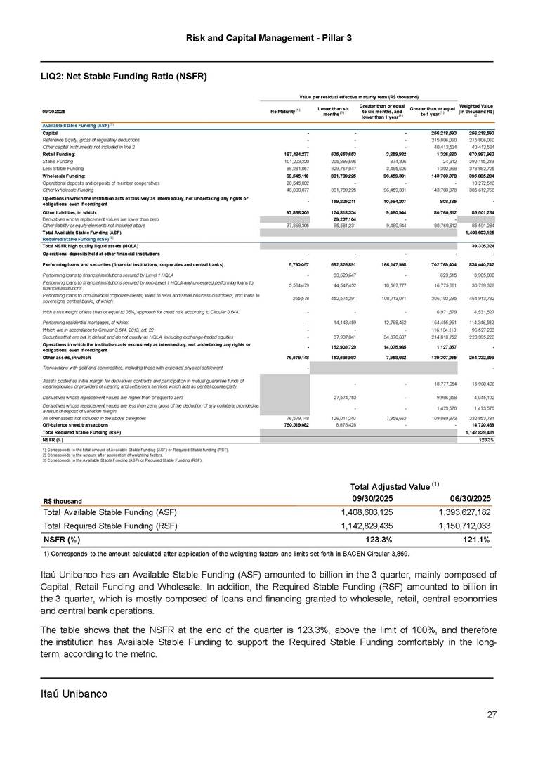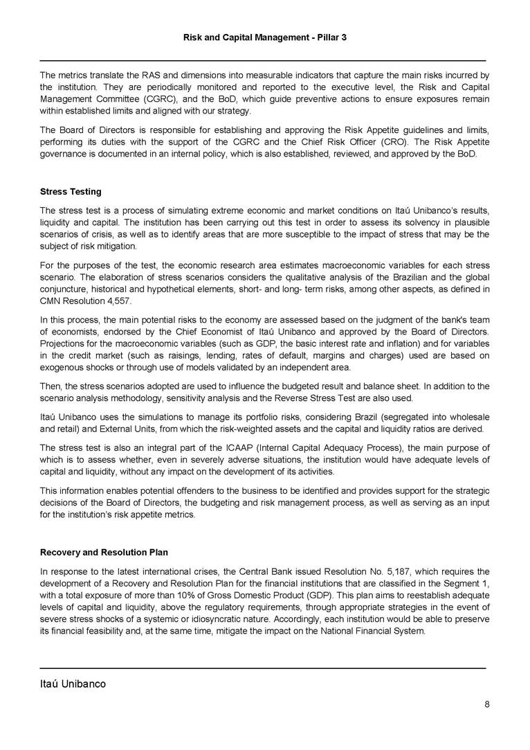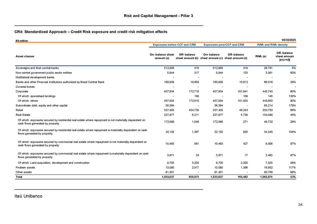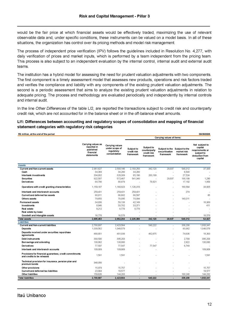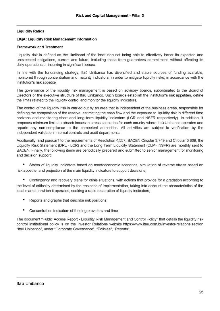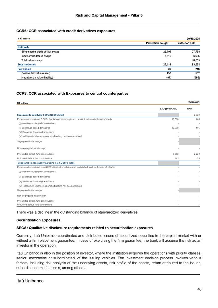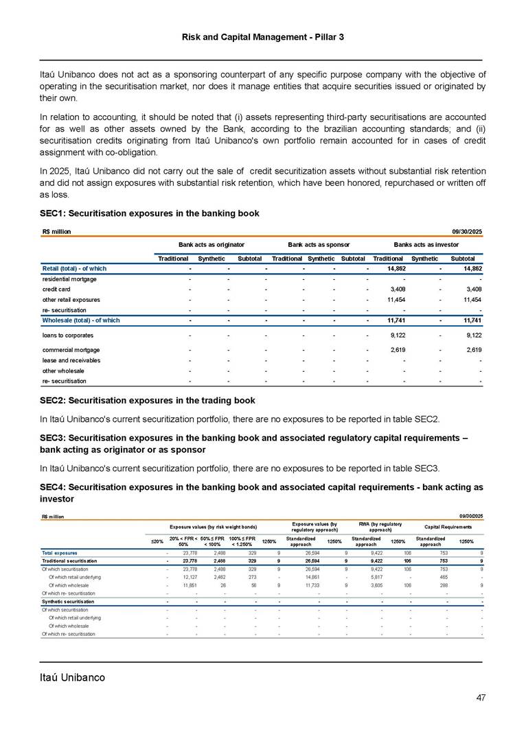 Risk and Capital Management - Pillar 3 Itaú Unibanco Holding S.A. Third Quarter of 2025 Objective 1 Key indicators 1 Prudential Metrics and Risk Management 2 KM1: Key metrics at consolidated level 2 OVA: Bank risk management approach 4 Scope and main characteristics of risk management 4 Risk and Capital Governance 5 Ituber Culture 6 Risk Appetite 7 Stress Testing 8 Recovery and Resolution Plan 8 Capital Adequacy Assessment 10 Capital Adequacy 10 OV1: Overview of risk-weighted assets (RWA) 10 Links between financial statements and regulatory exposures 11 LIA: Explanations of differences between accounting and regulatory exposure amounts 11 LI1: Differences between accounting and regulatory scopes of consolidation and mapping of financial statement categories with regulatory risk categories 12 LI2: Main sources of differences between regulatory exposure amounts and carrying values in financial statements 13 PV1: Prudent valuation adjustments (PVA) 13 Institutions that comprise the Financial Statement of Itaú Unibanco Holding 15 Non Consolidated Institutions 18 Material Entities 19 Composition of Capital 19 CCA: Main features of regulatory capital instuments 19 CC1: Composition of regulatory capital 20 CC2: Reconciliation of regulatory capital to balance sheet 22 Macroprudential Indicators 23 CCyB1: Geographical distribution of credit risk exposures considered in the calculation of the Countercyclical Capital Buffer 23 GSIB1: Disclosure of G-SIB indicators 23 Leverage Ratio 23 LR1: Summary comparison of accounting assets vs leverage ratio exposure measure (RA) 24 LR2: Leverage ratio common disclosure 24 Liquidity Ratios 25 LIQA: Liquidity Risk Management Information 25 Framework and Treatment 25 LIQ1: Liquidity Coverage Ratio (LCR) 26 LIQ2: Net Stable Funding Ratio (NSFR) 27 Credit Risk 28 CRA: Qualitative information on credit risk management 28 CR1: Credit Quality of Assets 29 CR2: Changes in Stock of defaulted loans and debts securities 30 CRB: Additional disclosure related to the credit quality of assets Credit risk mitigation 30 Exposure by industry 30 Exposure by remaining maturity 31 Overdue exposures 31 Exposure by geographical area in Brazil and by country 31 Largest debtors exposures 32 Restructured exposures 32 CRC: Qualitative disclosure related to Credit Risk Mitigation techniques 32 CR3: Credit Risk mitigation techniques – overview 33 CR4: Standardized Approach – Credit Risk exposure and credit risk mitigation effects 34 CR5: Standardized Approach – exposures by asset classes and risk weights 35 CRE: Qualitative disclosure related to IRB models 39 CR8: RWA flow statements of credit risk exposures under IRB 41 CMS1: Comparison of modelled and standardised RWA at risk level 41 Counterparty Credit Risk (CCR) 41 CCRA: Qualitative disclosure related to CCR 44 CCR1: Analysis of CCR exposures by approach 42 CCR3: Standardized approach – CCR exposures by regulatory portfolio and risk weights 42 CCR5: Composition of collateral for CCR exposures 42 CCR6: CCR associated with credit derivatives exposures 43 CCR8: CCR associated with Exposures to central counterparties 43 Securitization Exposures 43 SECA: Qualitative disclosure requirements related to securitisation exposures 43 SEC1: Securitisation exposures in the banking book 44 SEC2: Securitisation exposures in the trading book 44 SEC3: Securitisation exposures in the banking book and associated regulatory capital requirements – bank acting as originator or as sponsor 44 SEC4: Securitisation exposures in the banking book and associated capital requirements – bank acting as investor 44 Market Risk 45 MRA: Qualitative disclosure requirements related to market risk 45 MR1: Market risk under standardized approach 47 MRB: Qualitative disclosures on market risk in the Internal Models Approach (IMA) 47 MR2: RWA flow statements of market risk exposures under an IMA 51 Exposures subject to market risk 51 MR3: IMA values for trading portfolios 51 MR4: Comparison of VaR estimates with gains/losses 52 Backtesting 52 Total Exposure associated with Derivatives 52 IRRBB 53 IRRBBA: IRRBB risk management objectives and policies 53 Framework and Treatment 53 Other Risks 55 Insurance products, pension plans and premium bonds risks 55 Social, Environmental and Climatic Risks 55 Model Risk 56 Regulatory or Compliance Risk 57 Reputational Risk 57 Cyber Risk 59 Country Risk 59 Business and Strategy Risk 59 Step-in Risk 60 Emerging Risks 60 Operational Risk 60 Crisis Management and Operational Resilience 61 Independent Validation of Risk Models 62 Glossary of Acronyms 62 Glossary of Regulations 65 Risk and Capital Management - Pillar 3 __________________________________________________________________________________________ __________________________________________________________________________________________ Itaú Unibanco 1 Objective This document presents Itaú Unibanco Holding S.A. (Itaú Unibanco) information required by the Central Bank of Brazil (BACEN) through Resolution BCB nº 54 and subsequent amendments, which addresses the disclosure of information on risks and capital management, the comparison between accounting and prudential information, the liquidity and market risk indicators, the calculation of risk-weighted assets (RWA), the calculation of the Total Capital (“Patrimônio de Referência” - PR), and the compensation of management members. 1 The referred Resolution brought several amendments in the disclosure format of the Pillar 3 information, besides changes in the scope and frequency of the information disclosed. All these amendments, implemented by the Central Bank, aim the convergence of the Brazilian financial regulation to the recommendations of the Basel Committee, seeking to harmonize the information disclosed by financial institutions at an international level, and taking into account the structural conditions of the Brazilian economy. The disclosure policy of the Risk and Capital Management Report presents t