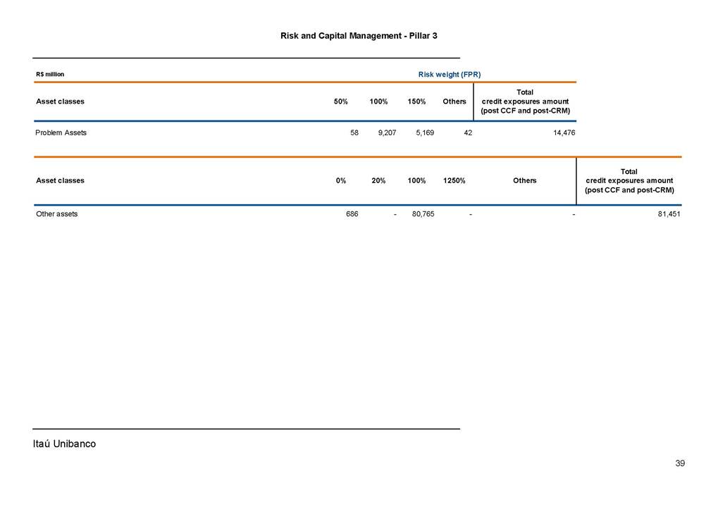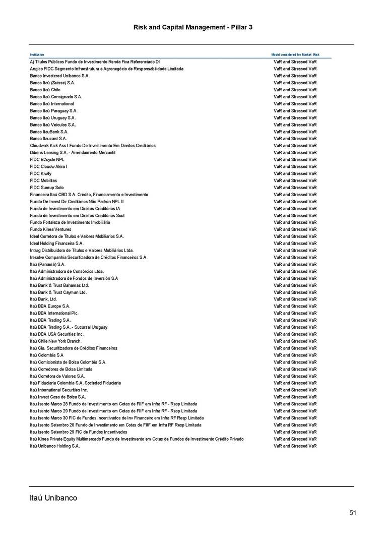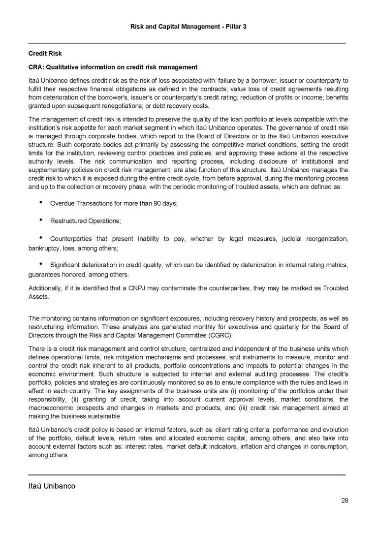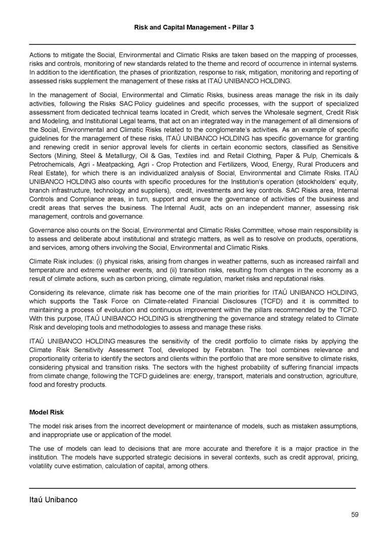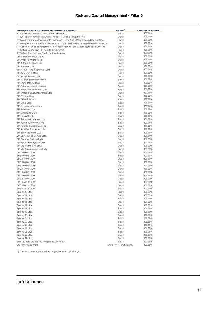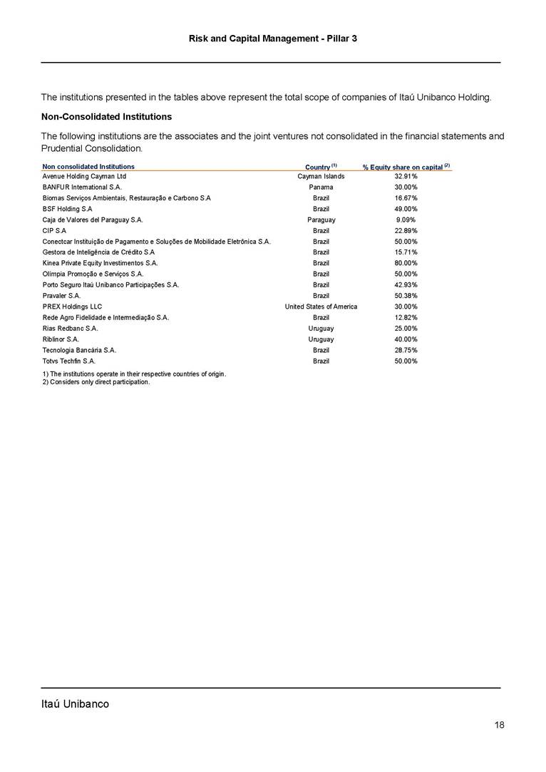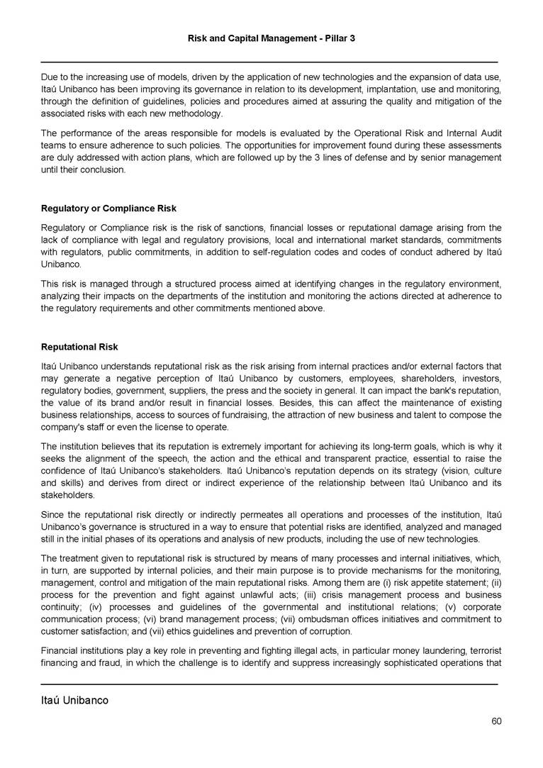 Risk and Capital Management - Pillar 3 Itaú Unibanco Holding S.A. Third Quarter of 2025 Objective 1 Key indicators 1 Prudential Metrics and Risk Management 2 KM1: Key metrics at consolidated level 2 OVA: Bank risk management approach 4 Scope and main characteristics of risk management 4 Risk and Capital Governance 5 Ituber Culture 6 Risk Appetite 7 Stress Testing 8 Recovery and Resolution Plan 8 Capital Adequacy Assessment 10 Capital Adequacy 10 OV1: Overview of risk-weighted assets (RWA) 10 Links between financial statements and regulatory exposures 11 LIA: Explanations of differences between accounting and regulatory exposure amounts 11 LI1: Differences between accounting and regulatory scopes of consolidation and mapping of financial statement categories with regulatory risk categories 12 LI2: Main sources of differences between regulatory exposure amounts and carrying values in financial statements 13 PV1: Prudent valuation adjustments (PVA) 13 Institutions that comprise the Financial Statement of Itaú Unibanco Holding 15 Non Consolidated Institutions 18 Material Entities 19 Composition of Capital 19 CCA: Main features of regulatory capital instuments 19 CC1: Composition of regulatory capital 20 CC2: Reconciliation of regulatory capital to balance sheet 22 Macroprudential Indicators 23 CCyB1: Geographical distribution of credit risk exposures considered in the calculation of the Countercyclical Capital Buffer 23 GSIB1: Disclosure of G-SIB indicators 23 Leverage Ratio 23 LR1: Summary comparison of accounting assets vs leverage ratio exposure measure (RA) 24 LR2: Leverage ratio common disclosure 24 Liquidity Ratios 25 LIQA: Liquidity Risk Management Information 25 Framework and Treatment 25 LIQ1: Liquidity Coverage Ratio (LCR) 26 LIQ2: Net Stable Funding Ratio (NSFR) 27 Credit Risk 28 CRA: Qualitative information on credit risk management 28 CR1: Credit Quality of Assets 29 CR2: Changes in Stock of defaulted loans and debts securities 30 CRB: Additional disclosure related to the credit quality of assets Credit risk mitigation 30 Exposure by industry 30 Exposure by remaining maturity 31 Overdue exposures 31 Exposure by geographical area in Brazil and by country 31 Largest debtors exposures 32 Restructured exposures 32 CRC: Qualitative disclosure related to Credit Risk Mitigation techniques 32 CR3: Credit Risk mitigation techniques – overview 33 CR4: Standardized Approach – Credit Risk exposure and credit risk mitigation effects 34 CR5: Standardized Approach – exposures by asset classes and risk weights 35 CRE: Qualitative disclosure related to IRB models 39 CR8: RWA flow statements of credit risk exposures under IRB 41 CMS1: Comparison of modelled and standardised RWA at risk level 41 Counterparty Credit Risk (CCR) 41 CCRA: Qualitative disclosure related to CCR 44 CCR1: Analysis of CCR exposures by approach 42 CCR3: Standardized approach – CCR exposures by regulatory portfolio and risk weights 42 CCR5: Composition of collateral for CCR exposures 42 CCR6: CCR associated with credit derivatives exposures 43 CCR8: CCR associated with Exposures to central counterparties 43 Securitization Exposures 43 SECA: Qualitative disclosure requirements related to securitisation exposures 43 SEC1: Securitisation exposures in the banking book 44 SEC2: Securitisation exposures in the trading book 44 SEC3: Securitisation exposures in the banking book and associated regulatory capital requirements – bank acting as originator or as sponsor 44 SEC4: Securitisation exposures in the banking book and associated capital requirements – bank acting as investor 44 Market Risk 45 MRA: Qualitative disclosure requirements related to market risk 45 MR1: Market risk under standardized approach 47 MRB: Qualitative disclosures on market risk in the Internal Models Approach (IMA) 47 MR2: RWA flow statements of market risk exposures under an IMA 51 Exposures subject to market risk 51 MR3: IMA values for trading portfolios 51 MR4: Comparison of VaR estimates with gains/losses 52 Backtesting 52 Total Exposure associated with Derivatives 52 IRRBB 53 IRRBBA: IRRBB risk management objectives and policies 53 Framework and Treatment 53 Other Risks 55 Insurance products, pension plans and premium bonds risks 55 Social, Environmental and Climatic Risks 55 Model Risk 56 Regulatory or Compliance Risk 57 Reputational Risk 57 Cyber Risk 59 Country Risk 59 Business and Strategy Risk 59 Step-in Risk 60 Emerging Risks 60 Operational Risk 60 Crisis Management and Operational Resilience 61 Independent Validation of Risk Models 62 Glossary of Acronyms 62 Glossary of Regulations 65 Risk and Capital Management - Pillar 3 __________________________________________________________________________________________ __________________________________________________________________________________________ Itaú Unibanco 1 Objective This document presents Itaú Unibanco Holding S.A. (Itaú Unibanco) information required by the Central Bank of Brazil (BACEN) through Resolution BCB nº 54 and subsequent amendments, which addresses the disclosure of information on risks and capital management, the comparison between accounting and prudential information, the liquidity and market risk indicators, the calculation of risk-weighted assets (RWA), the calculation of the Total Capital (“Patrimônio de Referência” - PR), and the compensation of management members. 1 The referred Resolution brought several amendments in the disclosure format of the Pillar 3 information, besides changes in the scope and frequency of the information disclosed. All these amendments, implemented by the Central Bank, aim the convergence of the Brazilian financial regulation to the recommendations of the Basel Committee, seeking to harmonize the information disclosed by financial institutions at an international level, and taking into account the structural conditions of the Brazilian economy. The disclosure policy of the Risk and Capital Management Report presents t