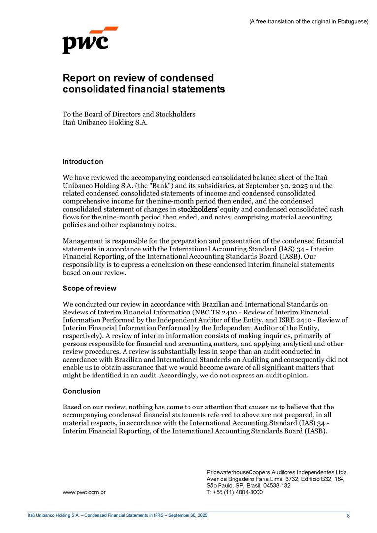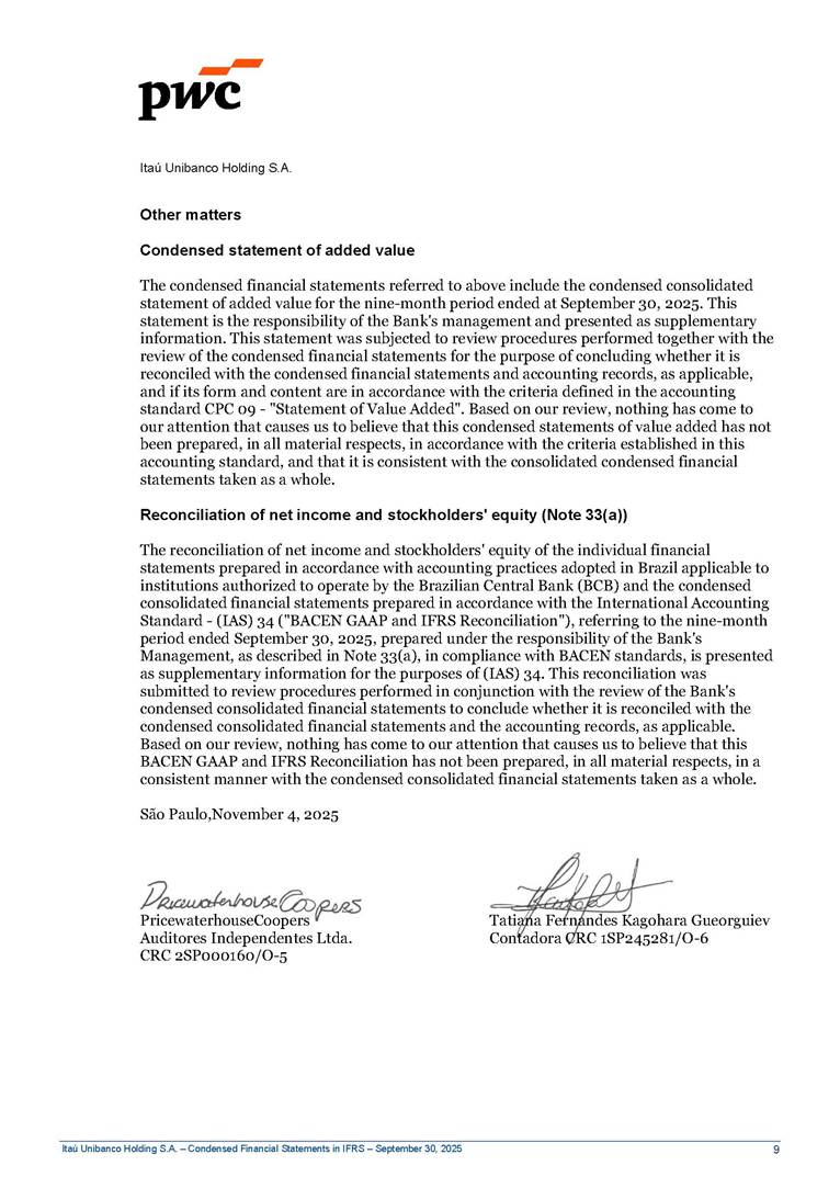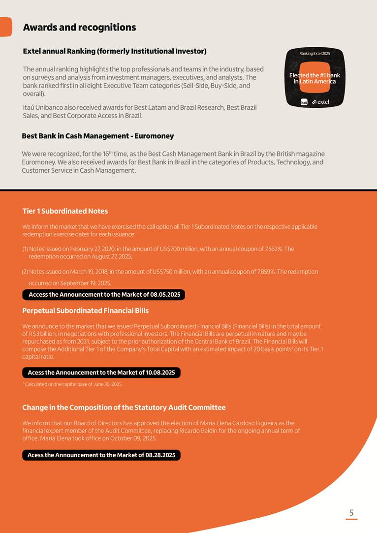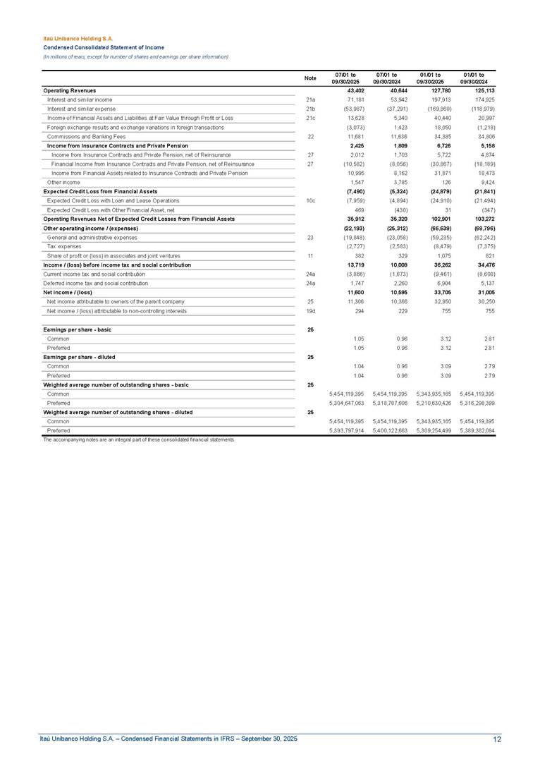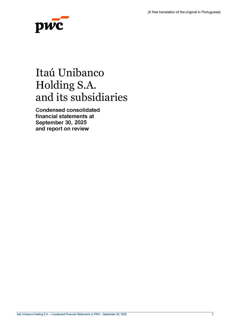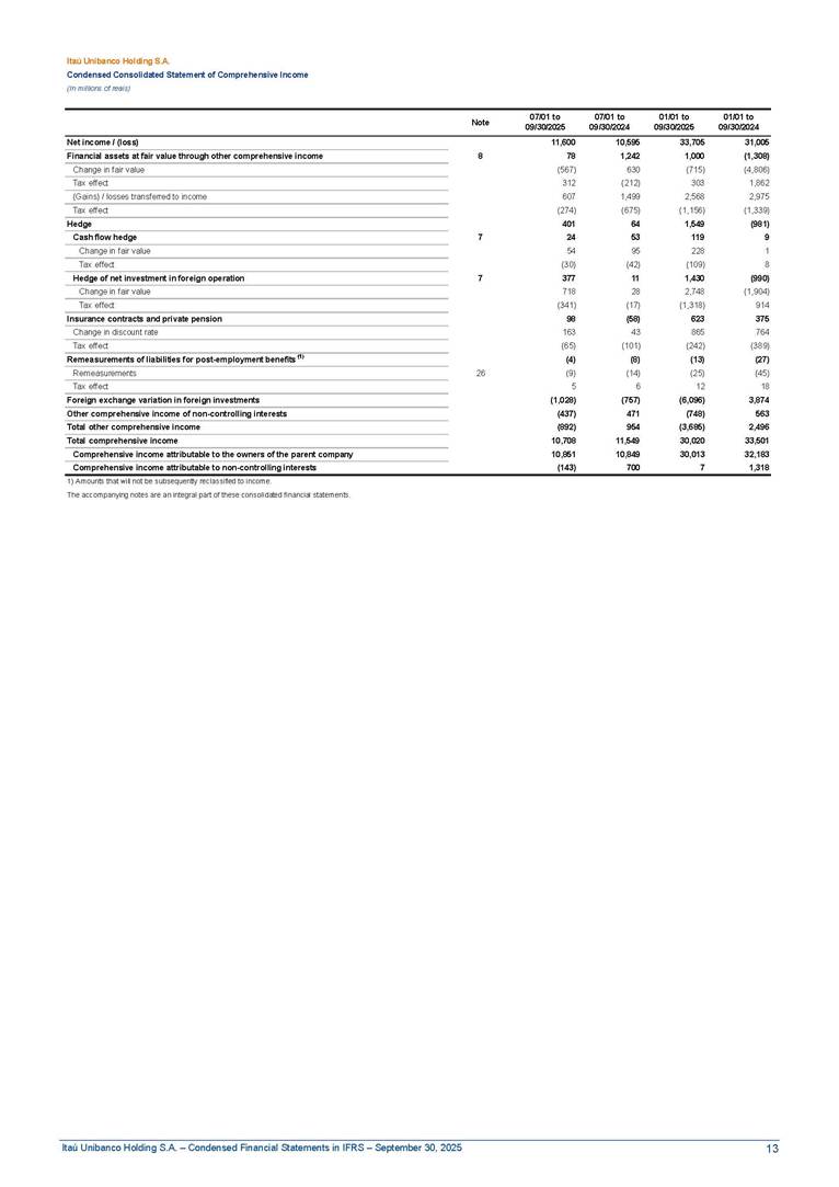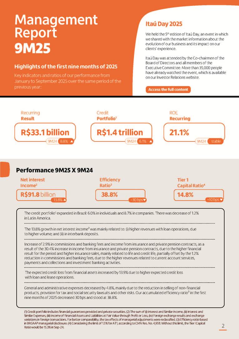 Condensed Financial Statements in IFRS Itaú Unibanco Holding S.A. September 30, 2025 Itaú Day 2025 We held the 5th edition of Itaú Day, an event in which we shared with the market information about the evolution of our business and its impact on our clients’ experience. Itaú Day was attended by the Co-chairmen of the Board of Directors and all members of the Executive Committee. More than 35,000 people have already watched the event, which is available on our Investor Relations website. Management Report 9M25 Key indicators and ratios of our performance from January to September 2025 over the same period of the previous year: Highlights of the first nine months of 2025 Access the full content Recurring Result R$33.1 billion 9M24 8.8% Credit Portfolio1 R$1.4 trillion 9M24 6.1% ROE Recurring 21.1% 9M24 stable Net interest Income2 R$91.8 billion 38.8% Efficiency Ratio3 14.8% Tier 1 Capital Ratio4 13.8% -30 bps -40 bps The credit portfolio1 expanded in Brazil: 6.0% in individuals and 8.7% in companies. There was decrease of 1.2% in Latin America. The 13.8% growth in net interest income² was mainly related to: (i) higher revenues with loan operations, due to higher volume; and (ii) in interbank deposits. The expected credit loss from financial assets increased by 13.9% due to higher expected credit loss with loan and lease operations. General and administrative expenses decreased by 4.8%, mainly due to the reduction in selling of non-financial products, provision for tax and social security lawsuits and other risks. Our accumulated efficiency ratio³ in the first nine months of 2025 decreased 30 bps and stood at 38.8%. (1) Credit portfolio includes financial guarantees provided and private securities. (2) The sum of (i) Interest and Similar Income, (ii) Interest and Similar Expenses, (iii) Income of Financial Assets and Liabilities at Fair Value through Profit or Loss, (iv) Foreign exchange results and exchange variations in foreign transactions. For better comparability, the tax effects of managerial adjustments were reclassified. (3) Efficiency ratio based in BRGAAP managerial disclosure. (4) Considering the limit of 1.5% for AT1, according to CMN Res. No. 4,958. Without this limit, the Tier I Capital Ratio would be 15.3% in Sep-24. Increase of 2.9% in commissions and banking fees and income from insurance and private pension contracts, as a result of the 30.4% increase in income from insurance and private pension contracts, due to the higher financial result for the period and higher insurance sales, mainly related to life and credit life, partially offset by the 1.2% reduction in commissions and banking fees, due to the higher revenues related to current account services, payments and collections and investment banking activities. Performance 9M25 X 9M24 2 3 (1) The sum of (i) Interest and Similar Income, (ii) Interest and Similar Expenses, (iii) Income of Financial Assets and Liabilities at Fair Value through Profit or Loss, (iv) Foreign exchange results and exchange variations in foreign transactions, (v) Commissions and Banking Fees, (vi) Income from Insurance Contracts and Private Pension, net of Reinsurance, and (vii) Other Income. For better comparability, the tax effects of managerial adjustments were reclassified. (2) The sum of (i) Interest and Similar Income, (ii) Interest and Similar Expenses, (iii) Income of Financial Assets and Liabilities at Fair Value through Profit or Loss, (iv) Foreign exchange results and exchange variations in foreign transactions. For better comparability, the tax effects of managerial adjustments were reclassified. (3) The sum on the Commissions and Banking Fees and Income from Insurance Contracts and Private Pension, net of Reinsurance. (4) The Return is calculated by dividing the Net income attributable to owners of the parent company by the Average Stockholders’ Equity. The quotient was multiplied by the number of periods in the year to derive the annualized rate. (5) The return is calculated by dividing the Recurring Result by the Average Stockholders’ Equity. The quotient was multiplied by the number of periods in the year to derive the annualized rate. (6) Source: Bloomberg. (7) The number of outstanding shares has been adjusted to reflect the 10% bonus that took place on March 20, 2025. Therefore, the indicators per share were reclassified. We present below the key indicators comprising our results: In R$ billions Income information 9M25 9M24 Variation Operating Revenues1 Net Interest Income2 Commissions and Banking Fees and Income from Insurance and Private Pension Contracts3 Expected Credit Loss from Financial Assets General and Administrative Expenses Net Income Net Income Attributable to Owners of the Parent Company Recurring Result Return on Average Equity - Annualized4 Recurring Return on Average Equity - Annualized5 Shares 9M257 9M24 7 Variation Net Income per Share - R$ Book Value per Share - R$ (in circulation on 09/30) Dividends and Interest on Own Capital net of Taxes per Share - R$ Average Financial Daily Trading Volume B3 (ON+PN) NYSE (ADR) Market Capitalization6 133.0 91.8 41.1 (24.9) (59.2) 33.7 33.0 33.1 21.0% 21.1% 130.0 80.6 40.0 (21.8) (62.2) 31.0 30.3 30.5 20.9% 21.1% 2.3% 13.8% 2.9% 13.9% -4.8% 8.7% 8.9% 8.8% 10 bps stable 3.06 20.02 0.75 1.8 0.8 1.0 397.2 2.81 18.69 0.71 1.4 0.8 0.6 330.8 8.9% 7.1% 4.9% 29.0% 2.5% 64.6% 20.1% 4 Know more Know more Know more We created a focused structure for crypto fund management Through Itaú Asset, we created our first dedicated structure for cryptoassets. This initiative reinforces our commitment to delivering innovative and tailored solutions to our clients, offering products that cover all allocation possibilities in the financial market. Our new crypto-focused team is now part of the Multimesas structure (similar to multi-asset), which includes more than 130 investment professionals. We are the first bank to offer Pix for small and medium-sized businesses using the Guaran