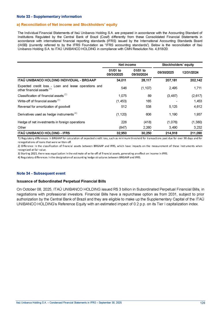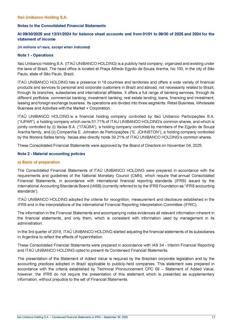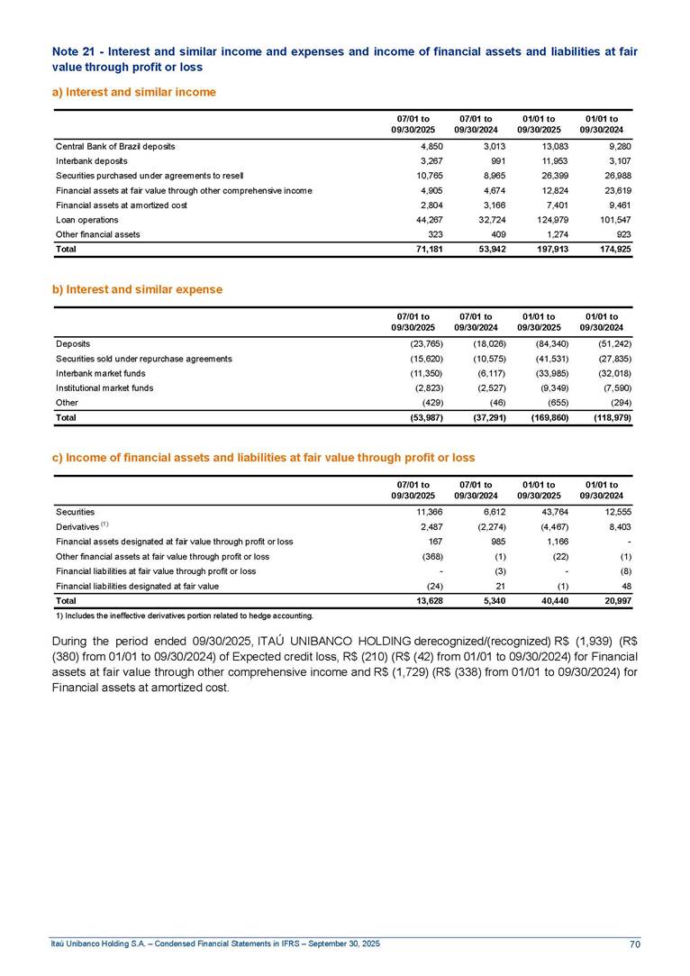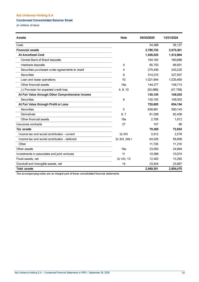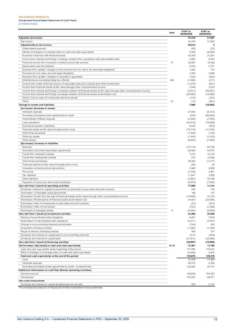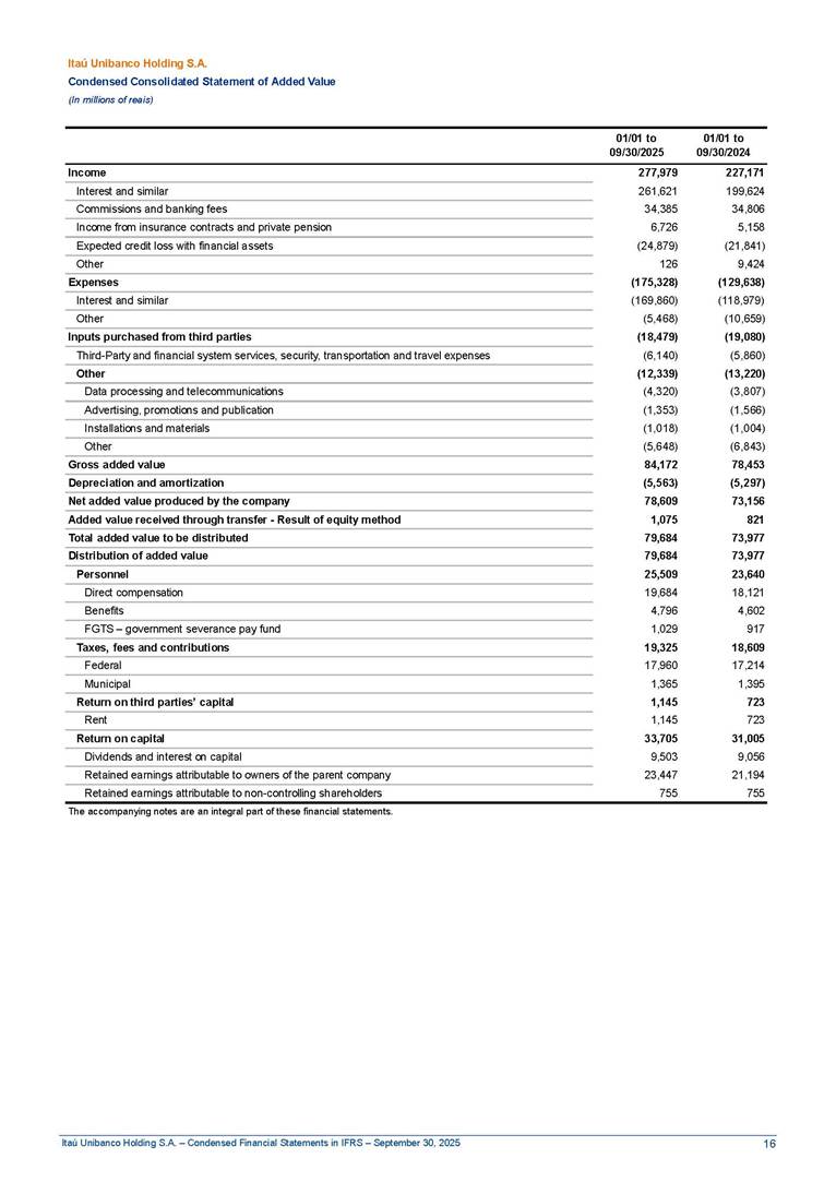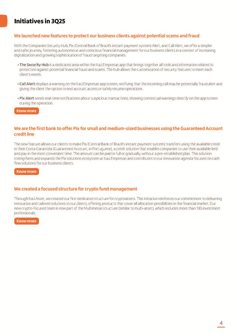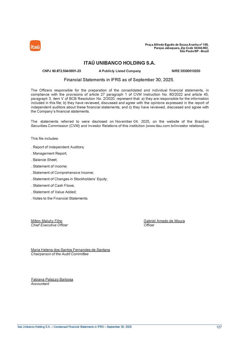 Condensed Financial Statements in IFRS Itaú Unibanco Holding S.A. September 30, 2025 Itaú Day 2025 We held the 5th edition of Itaú Day, an event in which we shared with the market information about the evolution of our business and its impact on our clients’ experience. Itaú Day was attended by the Co-chairmen of the Board of Directors and all members of the Executive Committee. More than 35,000 people have already watched the event, which is available on our Investor Relations website. Management Report 9M25 Key indicators and ratios of our performance from January to September 2025 over the same period of the previous year: Highlights of the first nine months of 2025 Access the full content Recurring Result R$33.1 billion 9M24 8.8% Credit Portfolio1 R$1.4 trillion 9M24 6.1% ROE Recurring 21.1% 9M24 stable Net interest Income2 R$91.8 billion 38.8% Efficiency Ratio3 14.8% Tier 1 Capital Ratio4 13.8% -30 bps -40 bps The credit portfolio1 expanded in Brazil: 6.0% in individuals and 8.7% in companies. There was decrease of 1.2% in Latin America. The 13.8% growth in net interest income² was mainly related to: (i) higher revenues with loan operations, due to higher volume; and (ii) in interbank deposits. The expected credit loss from financial assets increased by 13.9% due to higher expected credit loss with loan and lease operations. General and administrative expenses decreased by 4.8%, mainly due to the reduction in selling of non-financial products, provision for tax and social security lawsuits and other risks. Our accumulated efficiency ratio³ in the first nine months of 2025 decreased 30 bps and stood at 38.8%. (1) Credit portfolio includes financial guarantees provided and private securities. (2) The sum of (i) Interest and Similar Income, (ii) Interest and Similar Expenses, (iii) Income of Financial Assets and Liabilities at Fair Value through Profit or Loss, (iv) Foreign exchange results and exchange variations in foreign transactions. For better comparability, the tax effects of managerial adjustments were reclassified. (3) Efficiency ratio based in BRGAAP managerial disclosure. (4) Considering the limit of 1.5% for AT1, according to CMN Res. No. 4,958. Without this limit, the Tier I Capital Ratio would be 15.3% in Sep-24. Increase of 2.9% in commissions and banking fees and income from insurance and private pension contracts, as a result of the 30.4% increase in income from insurance and private pension contracts, due to the higher financial result for the period and higher insurance sales, mainly related to life and credit life, partially offset by the 1.2% reduction in commissions and banking fees, due to the higher revenues related to current account services, payments and collections and investment banking activities. Performance 9M25 X 9M24 2 3 (1) The sum of (i) Interest and Similar Income, (ii) Interest and Similar Expenses, (iii) Income of Financial Assets and Liabilities at Fair Value through Profit or Loss, (iv) Foreign exchange results and exchange variations in foreign transactions, (v) Commissions and Banking Fees, (vi) Income from Insurance Contracts and Private Pension, net of Reinsurance, and (vii) Other Income. For better comparability, the tax effects of managerial adjustments were reclassified. (2) The sum of (i) Interest and Similar Income, (ii) Interest and Similar Expenses, (iii) Income of Financial Assets and Liabilities at Fair Value through Profit or Loss, (iv) Foreign exchange results and exchange variations in foreign transactions. For better comparability, the tax effects of managerial adjustments were reclassified. (3) The sum on the Commissions and Banking Fees and Income from Insurance Contracts and Private Pension, net of Reinsurance. (4) The Return is calculated by dividing the Net income attributable to owners of the parent company by the Average Stockholders’ Equity. The quotient was multiplied by the number of periods in the year to derive the annualized rate. (5) The return is calculated by dividing the Recurring Result by the Average Stockholders’ Equity. The quotient was multiplied by the number of periods in the year to derive the annualized rate. (6) Source: Bloomberg. (7) The number of outstanding shares has been adjusted to reflect the 10% bonus that took place on March 20, 2025. Therefore, the indicators per share were reclassified. We present below the key indicators comprising our results: In R$ billions Income information 9M25 9M24 Variation Operating Revenues1 Net Interest Income2 Commissions and Banking Fees and Income from Insurance and Private Pension Contracts3 Expected Credit Loss from Financial Assets General and Administrative Expenses Net Income Net Income Attributable to Owners of the Parent Company Recurring Result Return on Average Equity - Annualized4 Recurring Return on Average Equity - Annualized5 Shares 9M257 9M24 7 Variation Net Income per Share - R$ Book Value per Share - R$ (in circulation on 09/30) Dividends and Interest on Own Capital net of Taxes per Share - R$ Average Financial Daily Trading Volume B3 (ON+PN) NYSE (ADR) Market Capitalization6 133.0 91.8 41.1 (24.9) (59.2) 33.7 33.0 33.1 21.0% 21.1% 130.0 80.6 40.0 (21.8) (62.2) 31.0 30.3 30.5 20.9% 21.1% 2.3% 13.8% 2.9% 13.9% -4.8% 8.7% 8.9% 8.8% 10 bps stable 3.06 20.02 0.75 1.8 0.8 1.0 397.2 2.81 18.69 0.71 1.4 0.8 0.6 330.8 8.9% 7.1% 4.9% 29.0% 2.5% 64.6% 20.1% 4 Know more Know more Know more We created a focused structure for crypto fund management Through Itaú Asset, we created our first dedicated structure for cryptoassets. This initiative reinforces our commitment to delivering innovative and tailored solutions to our clients, offering products that cover all allocation possibilities in the financial market. Our new crypto-focused team is now part of the Multimesas structure (similar to multi-asset), which includes more than 130 investment professionals. We are the first bank to offer Pix for small and medium-sized businesses using the Guaran
