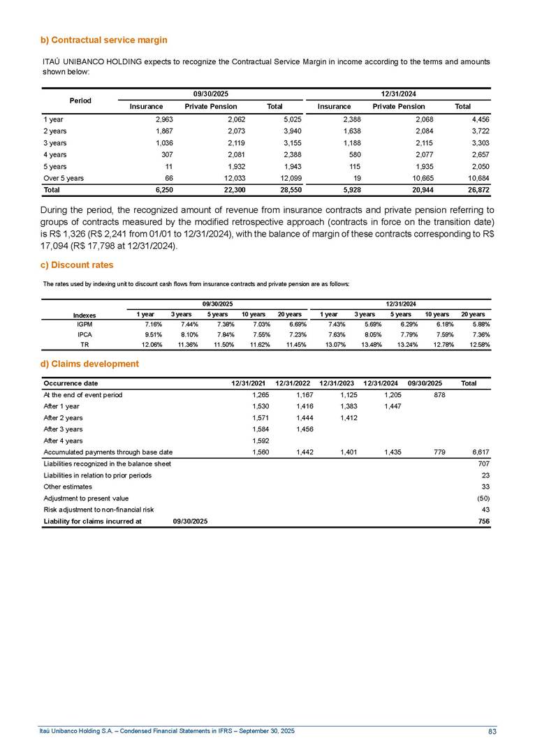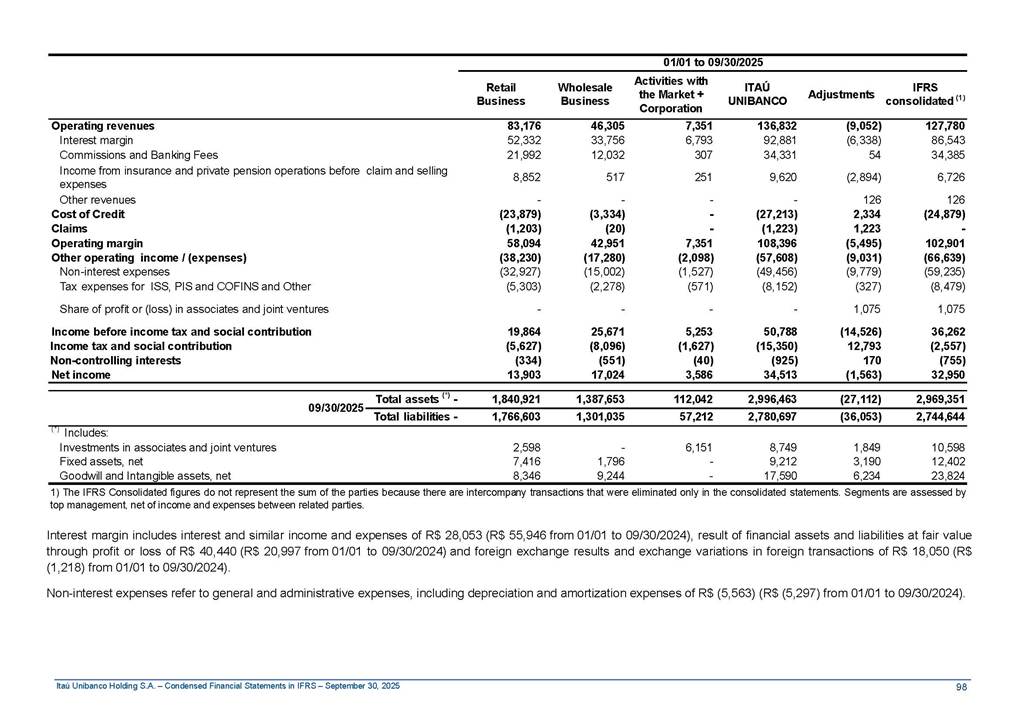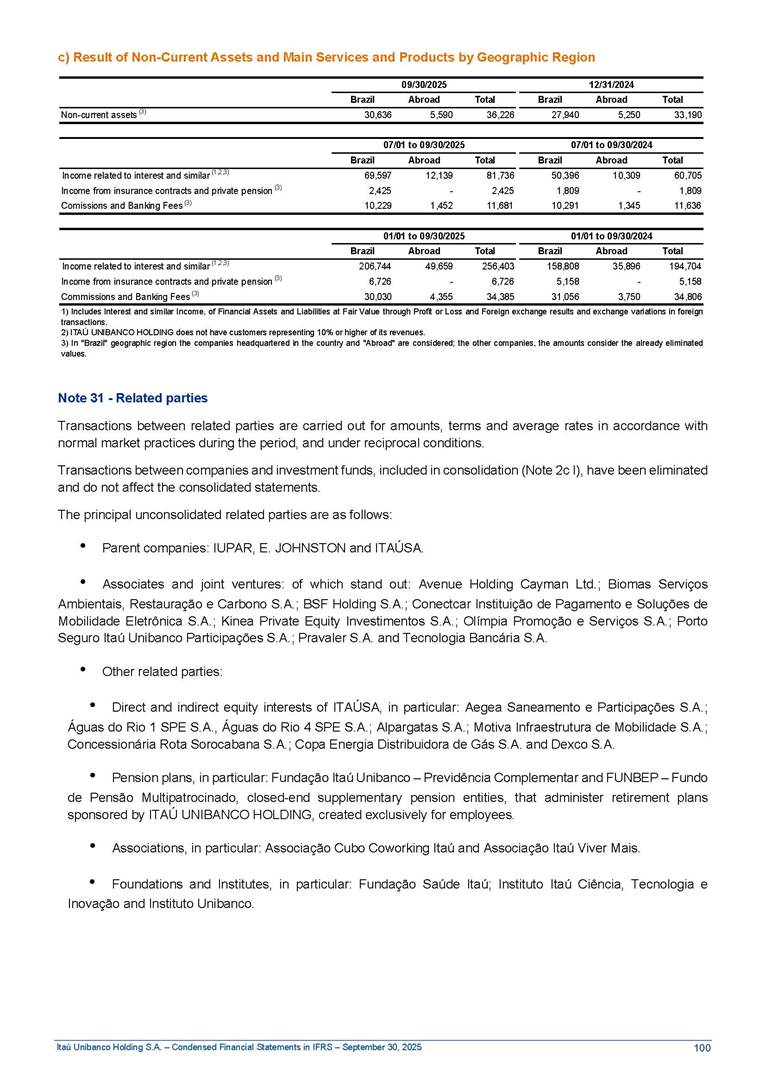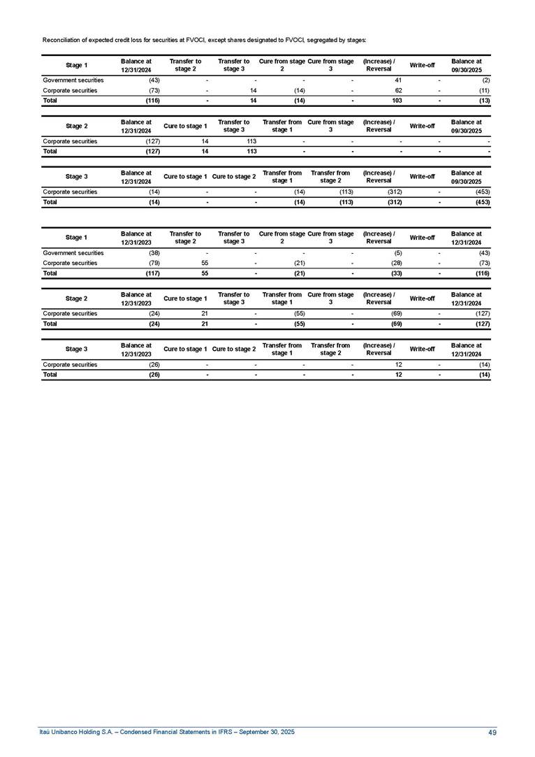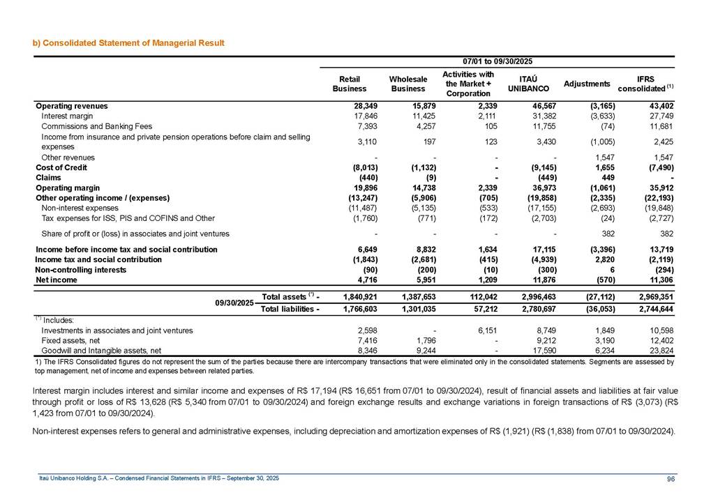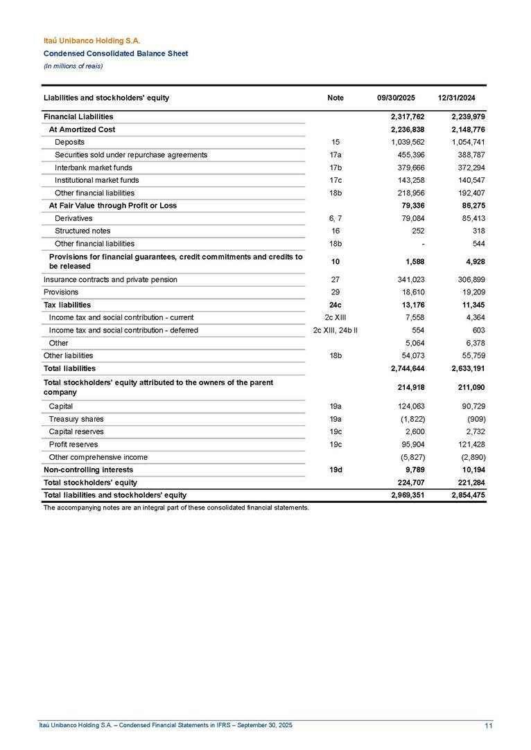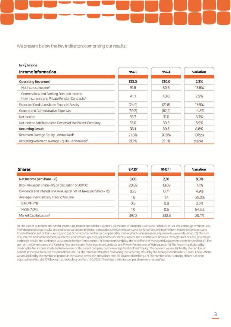 Condensed Financial Statements in IFRS Itaú Unibanco Holding S.A. September 30, 2025 Itaú Day 2025 We held the 5th edition of Itaú Day, an event in which we shared with the market information about the evolution of our business and its impact on our clients’ experience. Itaú Day was attended by the Co-chairmen of the Board of Directors and all members of the Executive Committee. More than 35,000 people have already watched the event, which is available on our Investor Relations website. Management Report 9M25 Key indicators and ratios of our performance from January to September 2025 over the same period of the previous year: Highlights of the first nine months of 2025 Access the full content Recurring Result R$33.1 billion 9M24 8.8% Credit Portfolio1 R$1.4 trillion 9M24 6.1% ROE Recurring 21.1% 9M24 stable Net interest Income2 R$91.8 billion 38.8% Efficiency Ratio3 14.8% Tier 1 Capital Ratio4 13.8% -30 bps -40 bps The credit portfolio1 expanded in Brazil: 6.0% in individuals and 8.7% in companies. There was decrease of 1.2% in Latin America. The 13.8% growth in net interest income² was mainly related to: (i) higher revenues with loan operations, due to higher volume; and (ii) in interbank deposits. The expected credit loss from financial assets increased by 13.9% due to higher expected credit loss with loan and lease operations. General and administrative expenses decreased by 4.8%, mainly due to the reduction in selling of non-financial products, provision for tax and social security lawsuits and other risks. Our accumulated efficiency ratio³ in the first nine months of 2025 decreased 30 bps and stood at 38.8%. (1) Credit portfolio includes financial guarantees provided and private securities. (2) The sum of (i) Interest and Similar Income, (ii) Interest and Similar Expenses, (iii) Income of Financial Assets and Liabilities at Fair Value through Profit or Loss, (iv) Foreign exchange results and exchange variations in foreign transactions. For better comparability, the tax effects of managerial adjustments were reclassified. (3) Efficiency ratio based in BRGAAP managerial disclosure. (4) Considering the limit of 1.5% for AT1, according to CMN Res. No. 4,958. Without this limit, the Tier I Capital Ratio would be 15.3% in Sep-24. Increase of 2.9% in commissions and banking fees and income from insurance and private pension contracts, as a result of the 30.4% increase in income from insurance and private pension contracts, due to the higher financial result for the period and higher insurance sales, mainly related to life and credit life, partially offset by the 1.2% reduction in commissions and banking fees, due to the higher revenues related to current account services, payments and collections and investment banking activities. Performance 9M25 X 9M24 2 3 (1) The sum of (i) Interest and Similar Income, (ii) Interest and Similar Expenses, (iii) Income of Financial Assets and Liabilities at Fair Value through Profit or Loss, (iv) Foreign exchange results and exchange variations in foreign transactions, (v) Commissions and Banking Fees, (vi) Income from Insurance Contracts and Private Pension, net of Reinsurance, and (vii) Other Income. For better comparability, the tax effects of managerial adjustments were reclassified. (2) The sum of (i) Interest and Similar Income, (ii) Interest and Similar Expenses, (iii) Income of Financial Assets and Liabilities at Fair Value through Profit or Loss, (iv) Foreign exchange results and exchange variations in foreign transactions. For better comparability, the tax effects of managerial adjustments were reclassified. (3) The sum on the Commissions and Banking Fees and Income from Insurance Contracts and Private Pension, net of Reinsurance. (4) The Return is calculated by dividing the Net income attributable to owners of the parent company by the Average Stockholders’ Equity. The quotient was multiplied by the number of periods in the year to derive the annualized rate. (5) The return is calculated by dividing the Recurring Result by the Average Stockholders’ Equity. The quotient was multiplied by the number of periods in the year to derive the annualized rate. (6) Source: Bloomberg. (7) The number of outstanding shares has been adjusted to reflect the 10% bonus that took place on March 20, 2025. Therefore, the indicators per share were reclassified. We present below the key indicators comprising our results: In R$ billions Income information 9M25 9M24 Variation Operating Revenues1 Net Interest Income2 Commissions and Banking Fees and Income from Insurance and Private Pension Contracts3 Expected Credit Loss from Financial Assets General and Administrative Expenses Net Income Net Income Attributable to Owners of the Parent Company Recurring Result Return on Average Equity - Annualized4 Recurring Return on Average Equity - Annualized5 Shares 9M257 9M24 7 Variation Net Income per Share - R$ Book Value per Share - R$ (in circulation on 09/30) Dividends and Interest on Own Capital net of Taxes per Share - R$ Average Financial Daily Trading Volume B3 (ON+PN) NYSE (ADR) Market Capitalization6 133.0 91.8 41.1 (24.9) (59.2) 33.7 33.0 33.1 21.0% 21.1% 130.0 80.6 40.0 (21.8) (62.2) 31.0 30.3 30.5 20.9% 21.1% 2.3% 13.8% 2.9% 13.9% -4.8% 8.7% 8.9% 8.8% 10 bps stable 3.06 20.02 0.75 1.8 0.8 1.0 397.2 2.81 18.69 0.71 1.4 0.8 0.6 330.8 8.9% 7.1% 4.9% 29.0% 2.5% 64.6% 20.1% 4 Know more Know more Know more We created a focused structure for crypto fund management Through Itaú Asset, we created our first dedicated structure for cryptoassets. This initiative reinforces our commitment to delivering innovative and tailored solutions to our clients, offering products that cover all allocation possibilities in the financial market. Our new crypto-focused team is now part of the Multimesas structure (similar to multi-asset), which includes more than 130 investment professionals. We are the first bank to offer Pix for small and medium-sized businesses using the Guaran