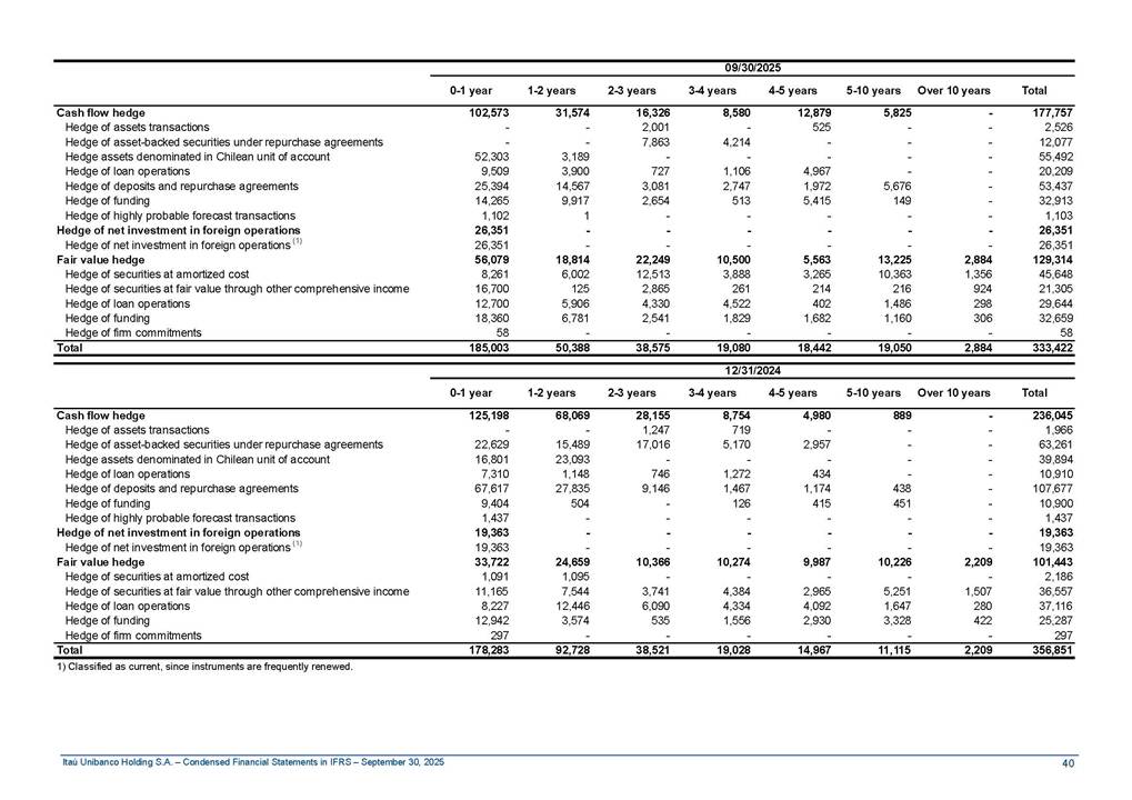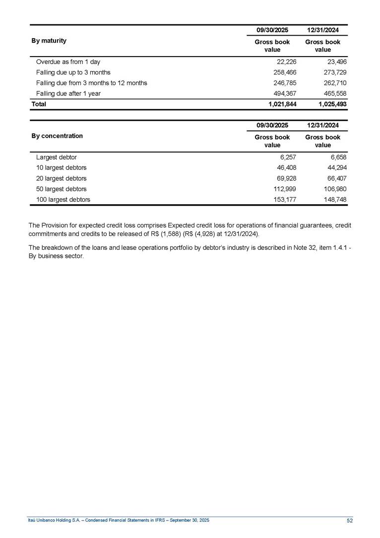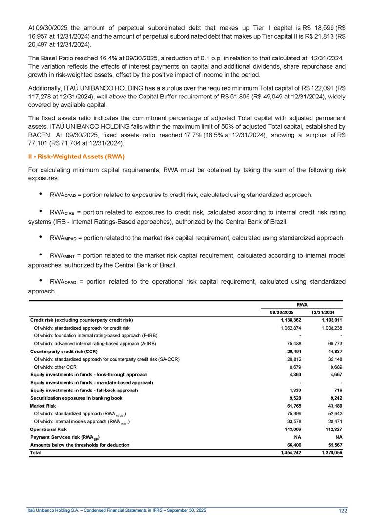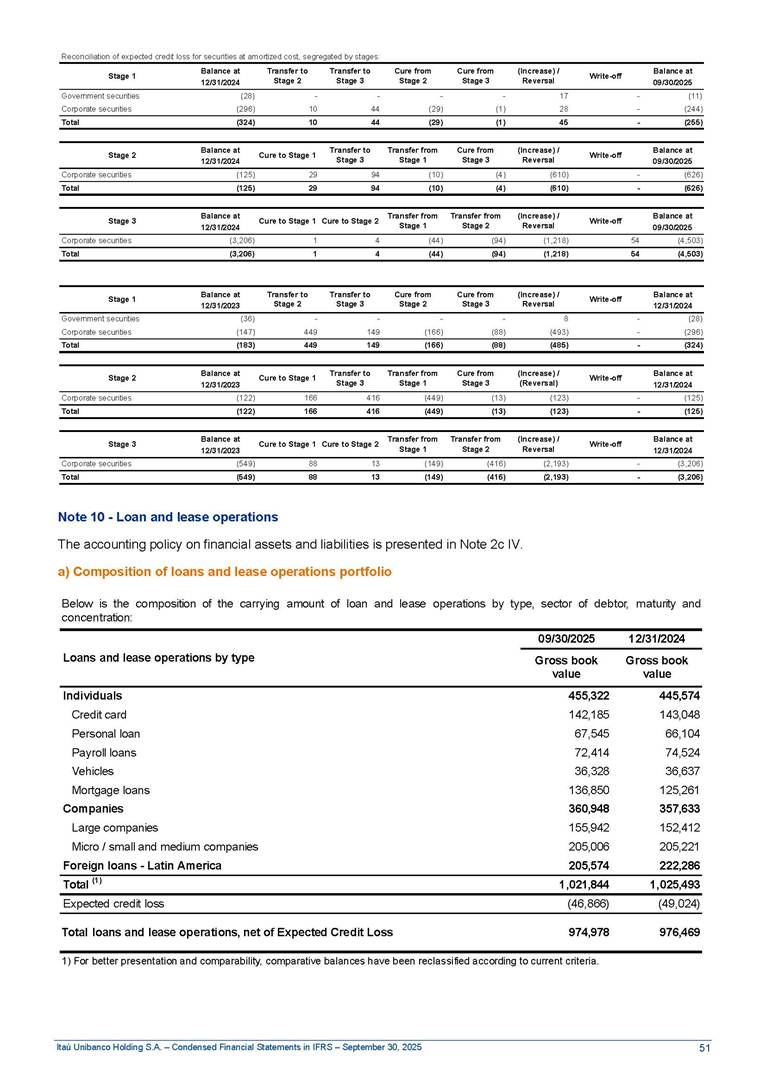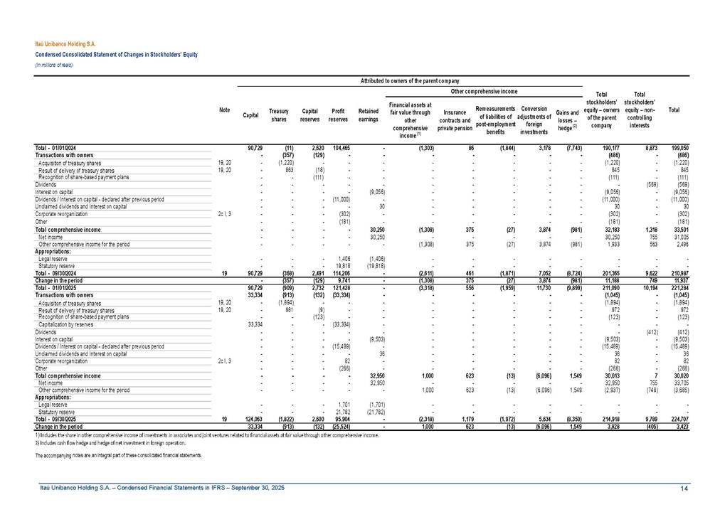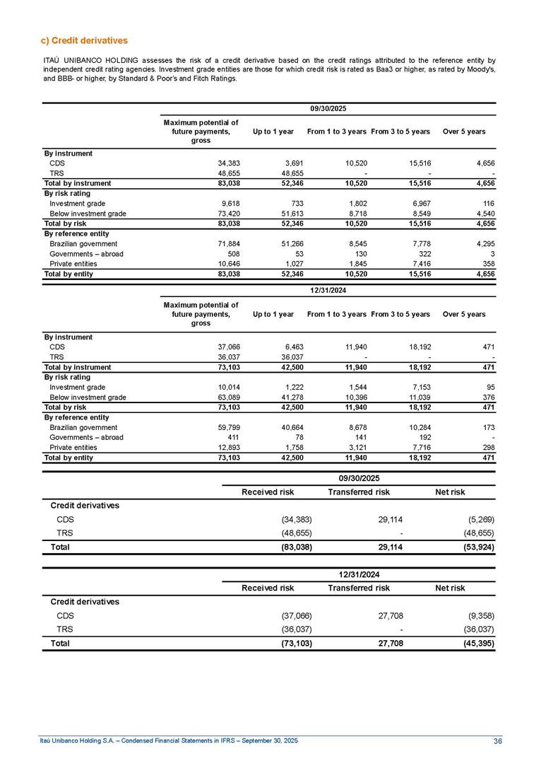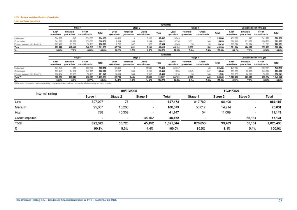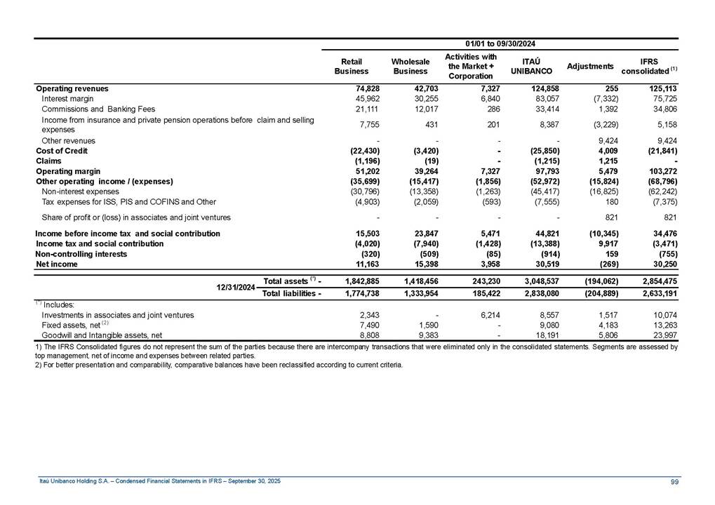Condensed Financial Statements in IFRS Itaú Unibanco Holding S.A. September 30, 2025 Itaú Day 2025 We held the 5th edition of Itaú Day, an event in which we shared with the market information about the evolution of our business and its impact on our clients’ experience. Itaú Day was attended by the Co-chairmen of the Board of Directors and all members of the Executive Committee. More than 35,000 people have already watched the event, which is available on our Investor Relations website. Management Report 9M25 Key indicators and ratios of our performance from January to September 2025 over the same period of the previous year: Highlights of the first nine months of 2025 Access the full content Recurring Result R$33.1 billion 9M24 8.8% Credit Portfolio1 R$1.4 trillion 9M24 6.1% ROE Recurring 21.1% 9M24 stable Net interest Income2 R$91.8 billion 38.8% Efficiency Ratio3 14.8% Tier 1 Capital Ratio4 13.8% -30 bps -40 bps The credit portfolio1 expanded in Brazil: 6.0% in individuals and 8.7% in companies. There was decrease of 1.2% in Latin America. The 13.8% growth in net interest income² was mainly related to: (i) higher revenues with loan operations, due to higher volume; and (ii) in interbank deposits. The expected credit loss from financial assets increased by 13.9% due to higher expected credit loss with loan and lease operations. General and administrative expenses decreased by 4.8%, mainly due to the reduction in selling of non-financial products, provision for tax and social security lawsuits and other risks. Our accumulated efficiency ratio³ in the first nine months of 2025 decreased 30 bps and stood at 38.8%. (1) Credit portfolio includes financial guarantees provided and private securities. (2) The sum of (i) Interest and Similar Income, (ii) Interest and Similar Expenses, (iii) Income of Financial Assets and Liabilities at Fair Value through Profit or Loss, (iv) Foreign exchange results and exchange variations in foreign transactions. For better comparability, the tax effects of managerial adjustments were reclassified. (3) Efficiency ratio based in BRGAAP managerial disclosure. (4) Considering the limit of 1.5% for AT1, according to CMN Res. No. 4,958. Without this limit, the Tier I Capital Ratio would be 15.3% in Sep-24. Increase of 2.9% in commissions and banking fees and income from insurance and private pension contracts, as a result of the 30.4% increase in income from insurance and private pension contracts, due to the higher financial result for the period and higher insurance sales, mainly related to life and credit life, partially offset by the 1.2% reduction in commissions and banking fees, due to the higher revenues related to current account services, payments and collections and investment banking activities. Performance 9M25 X 9M24 2 3 (1) The sum of (i) Interest and Similar Income, (ii) Interest and Similar Expenses, (iii) Income of Financial Assets and Liabilities at Fair Value through Profit or Loss, (iv) Foreign exchange results and exchange variations in foreign transactions, (v) Commissions and Banking Fees, (vi) Income from Insurance Contracts and Private Pension, net of Reinsurance, and (vii) Other Income. For better comparability, the tax effects of managerial adjustments were reclassified. (2) The sum of (i) Interest and Similar Income, (ii) Interest and Similar Expenses, (iii) Income of Financial Assets and Liabilities at Fair Value through Profit or Loss, (iv) Foreign exchange results and exchange variations in foreign transactions. For better comparability, the tax effects of managerial adjustments were reclassified. (3) The sum on the Commissions and Banking Fees and Income from Insurance Contracts and Private Pension, net of Reinsurance. (4) The Return is calculated by dividing the Net income attributable to owners of the parent company by the Average Stockholders’ Equity. The quotient was multiplied by the number of periods in the year to derive the annualized rate. (5) The return is calculated by dividing the Recurring Result by the Average Stockholders’ Equity. The quotient was multiplied by the number of periods in the year to derive the annualized rate. (6) Source: Bloomberg. (7) The number of outstanding shares has been adjusted to reflect the 10% bonus that took place on March 20, 2025. Therefore, the indicators per share were reclassified. We present below the key indicators comprising our results: In R$ billions Income information 9M25 9M24 Variation Operating Revenues1 Net Interest Income2 Commissions and Banking Fees and Income from Insurance and Private Pension Contracts3 Expected Credit Loss from Financial Assets General and Administrative Expenses Net Income Net Income Attributable to Owners of the Parent Company Recurring Result Return on Average Equity - Annualized4 Recurring Return on Average Equity - Annualized5 Shares 9M257 9M24 7 Variation Net Income per Share - R$ Book Value per Share - R$ (in circulation on 09/30) Dividends and Interest on Own Capital net of Taxes per Share - R$ Average Financial Daily Trading Volume B3 (ON+PN) NYSE (ADR) Market Capitalization6 133.0 91.8 41.1 (24.9) (59.2) 33.7 33.0 33.1 21.0% 21.1% 130.0 80.6 40.0 (21.8) (62.2) 31.0 30.3 30.5 20.9% 21.1% 2.3% 13.8% 2.9% 13.9% -4.8% 8.7% 8.9% 8.8% 10 bps stable 3.06 20.02 0.75 1.8 0.8 1.0 397.2 2.81 18.69 0.71 1.4 0.8 0.6 330.8 8.9% 7.1% 4.9% 29.0% 2.5% 64.6% 20.1% 4 Know more Know more Know more We created a focused structure for crypto fund management Through Itaú Asset, we created our first dedicated structure for cryptoassets. This initiative reinforces our commitment to delivering innovative and tailored solutions to our clients, offering products that cover all allocation possibilities in the financial market. Our new crypto-focused team is now part of the Multimesas structure (similar to multi-asset), which includes more than 130 investment professionals. We are the first bank to offer Pix for small and medium-sized businesses using the Guaran
