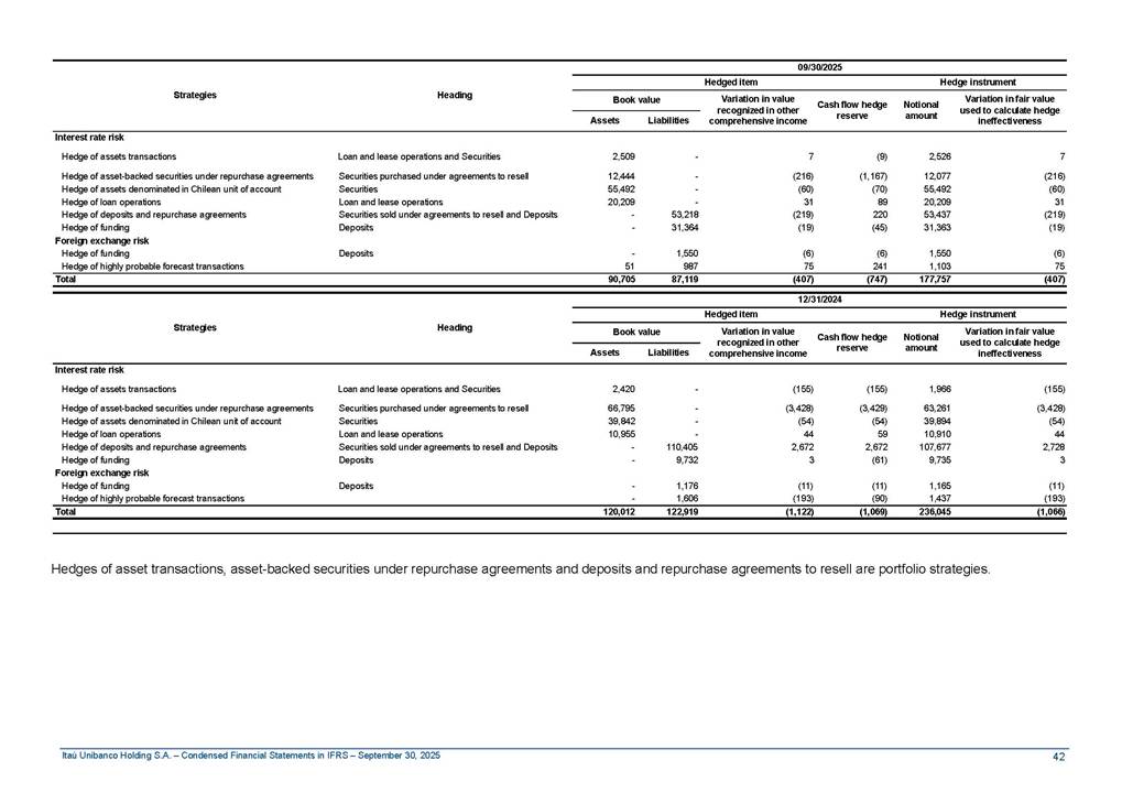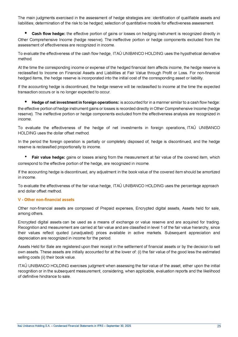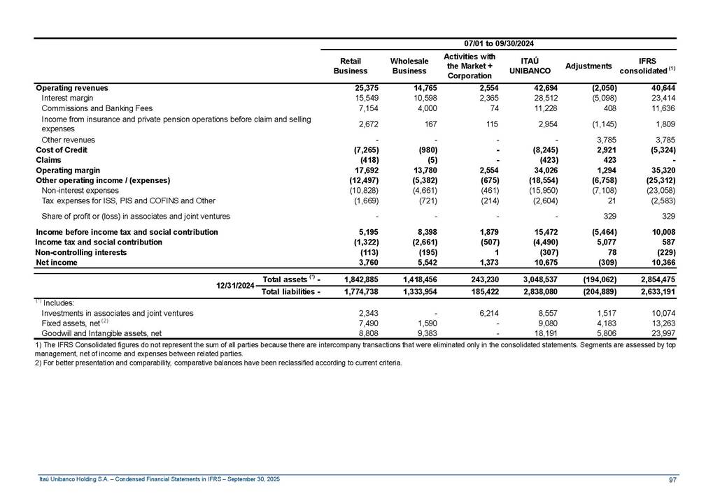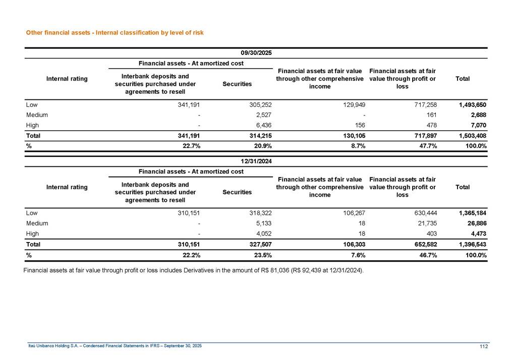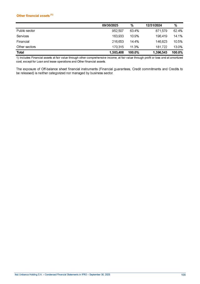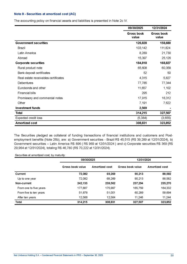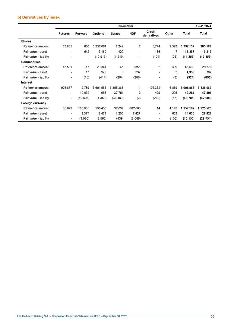 Condensed Financial Statements in IFRS Itaú Unibanco Holding S.A. September 30, 2025 Itaú Day 2025 We held the 5th edition of Itaú Day, an event in which we shared with the market information about the evolution of our business and its impact on our clients’ experience. Itaú Day was attended by the Co-chairmen of the Board of Directors and all members of the Executive Committee. More than 35,000 people have already watched the event, which is available on our Investor Relations website. Management Report 9M25 Key indicators and ratios of our performance from January to September 2025 over the same period of the previous year: Highlights of the first nine months of 2025 Access the full content Recurring Result R$33.1 billion 9M24 8.8% Credit Portfolio1 R$1.4 trillion 9M24 6.1% ROE Recurring 21.1% 9M24 stable Net interest Income2 R$91.8 billion 38.8% Efficiency Ratio3 14.8% Tier 1 Capital Ratio4 13.8% -30 bps -40 bps The credit portfolio1 expanded in Brazil: 6.0% in individuals and 8.7% in companies. There was decrease of 1.2% in Latin America. The 13.8% growth in net interest income² was mainly related to: (i) higher revenues with loan operations, due to higher volume; and (ii) in interbank deposits. The expected credit loss from financial assets increased by 13.9% due to higher expected credit loss with loan and lease operations. General and administrative expenses decreased by 4.8%, mainly due to the reduction in selling of non-financial products, provision for tax and social security lawsuits and other risks. Our accumulated efficiency ratio³ in the first nine months of 2025 decreased 30 bps and stood at 38.8%. (1) Credit portfolio includes financial guarantees provided and private securities. (2) The sum of (i) Interest and Similar Income, (ii) Interest and Similar Expenses, (iii) Income of Financial Assets and Liabilities at Fair Value through Profit or Loss, (iv) Foreign exchange results and exchange variations in foreign transactions. For better comparability, the tax effects of managerial adjustments were reclassified. (3) Efficiency ratio based in BRGAAP managerial disclosure. (4) Considering the limit of 1.5% for AT1, according to CMN Res. No. 4,958. Without this limit, the Tier I Capital Ratio would be 15.3% in Sep-24. Increase of 2.9% in commissions and banking fees and income from insurance and private pension contracts, as a result of the 30.4% increase in income from insurance and private pension contracts, due to the higher financial result for the period and higher insurance sales, mainly related to life and credit life, partially offset by the 1.2% reduction in commissions and banking fees, due to the higher revenues related to current account services, payments and collections and investment banking activities. Performance 9M25 X 9M24 2 3 (1) The sum of (i) Interest and Similar Income, (ii) Interest and Similar Expenses, (iii) Income of Financial Assets and Liabilities at Fair Value through Profit or Loss, (iv) Foreign exchange results and exchange variations in foreign transactions, (v) Commissions and Banking Fees, (vi) Income from Insurance Contracts and Private Pension, net of Reinsurance, and (vii) Other Income. For better comparability, the tax effects of managerial adjustments were reclassified. (2) The sum of (i) Interest and Similar Income, (ii) Interest and Similar Expenses, (iii) Income of Financial Assets and Liabilities at Fair Value through Profit or Loss, (iv) Foreign exchange results and exchange variations in foreign transactions. For better comparability, the tax effects of managerial adjustments were reclassified. (3) The sum on the Commissions and Banking Fees and Income from Insurance Contracts and Private Pension, net of Reinsurance. (4) The Return is calculated by dividing the Net income attributable to owners of the parent company by the Average Stockholders’ Equity. The quotient was multiplied by the number of periods in the year to derive the annualized rate. (5) The return is calculated by dividing the Recurring Result by the Average Stockholders’ Equity. The quotient was multiplied by the number of periods in the year to derive the annualized rate. (6) Source: Bloomberg. (7) The number of outstanding shares has been adjusted to reflect the 10% bonus that took place on March 20, 2025. Therefore, the indicators per share were reclassified. We present below the key indicators comprising our results: In R$ billions Income information 9M25 9M24 Variation Operating Revenues1 Net Interest Income2 Commissions and Banking Fees and Income from Insurance and Private Pension Contracts3 Expected Credit Loss from Financial Assets General and Administrative Expenses Net Income Net Income Attributable to Owners of the Parent Company Recurring Result Return on Average Equity - Annualized4 Recurring Return on Average Equity - Annualized5 Shares 9M257 9M24 7 Variation Net Income per Share - R$ Book Value per Share - R$ (in circulation on 09/30) Dividends and Interest on Own Capital net of Taxes per Share - R$ Average Financial Daily Trading Volume B3 (ON+PN) NYSE (ADR) Market Capitalization6 133.0 91.8 41.1 (24.9) (59.2) 33.7 33.0 33.1 21.0% 21.1% 130.0 80.6 40.0 (21.8) (62.2) 31.0 30.3 30.5 20.9% 21.1% 2.3% 13.8% 2.9% 13.9% -4.8% 8.7% 8.9% 8.8% 10 bps stable 3.06 20.02 0.75 1.8 0.8 1.0 397.2 2.81 18.69 0.71 1.4 0.8 0.6 330.8 8.9% 7.1% 4.9% 29.0% 2.5% 64.6% 20.1% 4 Know more Know more Know more We created a focused structure for crypto fund management Through Itaú Asset, we created our first dedicated structure for cryptoassets. This initiative reinforces our commitment to delivering innovative and tailored solutions to our clients, offering products that cover all allocation possibilities in the financial market. Our new crypto-focused team is now part of the Multimesas structure (similar to multi-asset), which includes more than 130 investment professionals. We are the first bank to offer Pix for small and medium-sized businesses using the Guaran