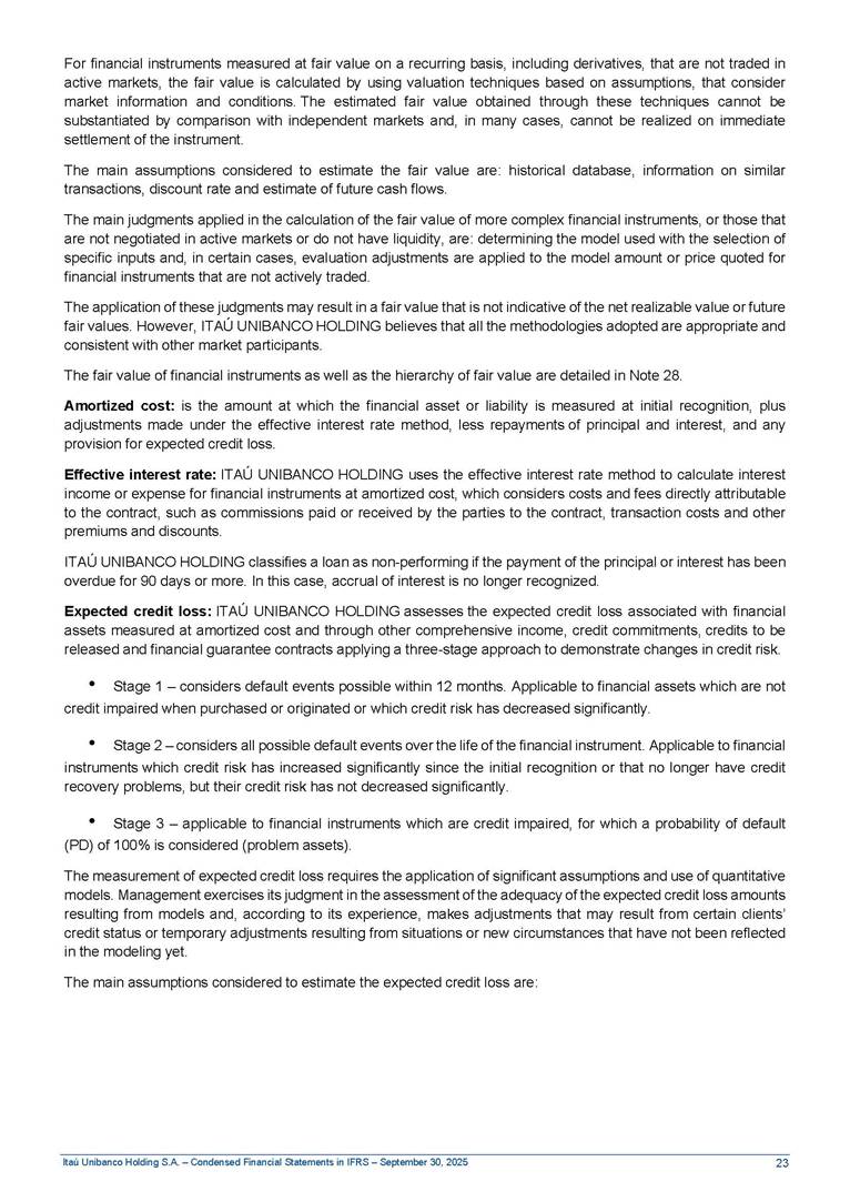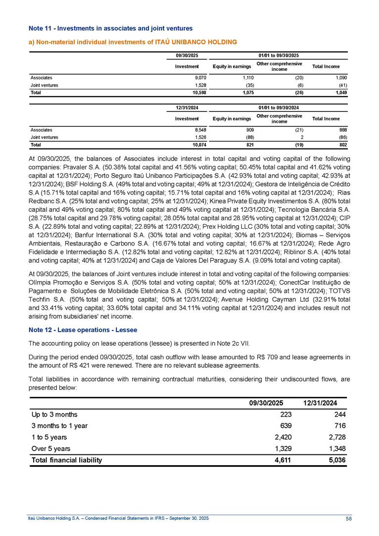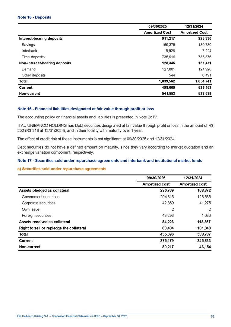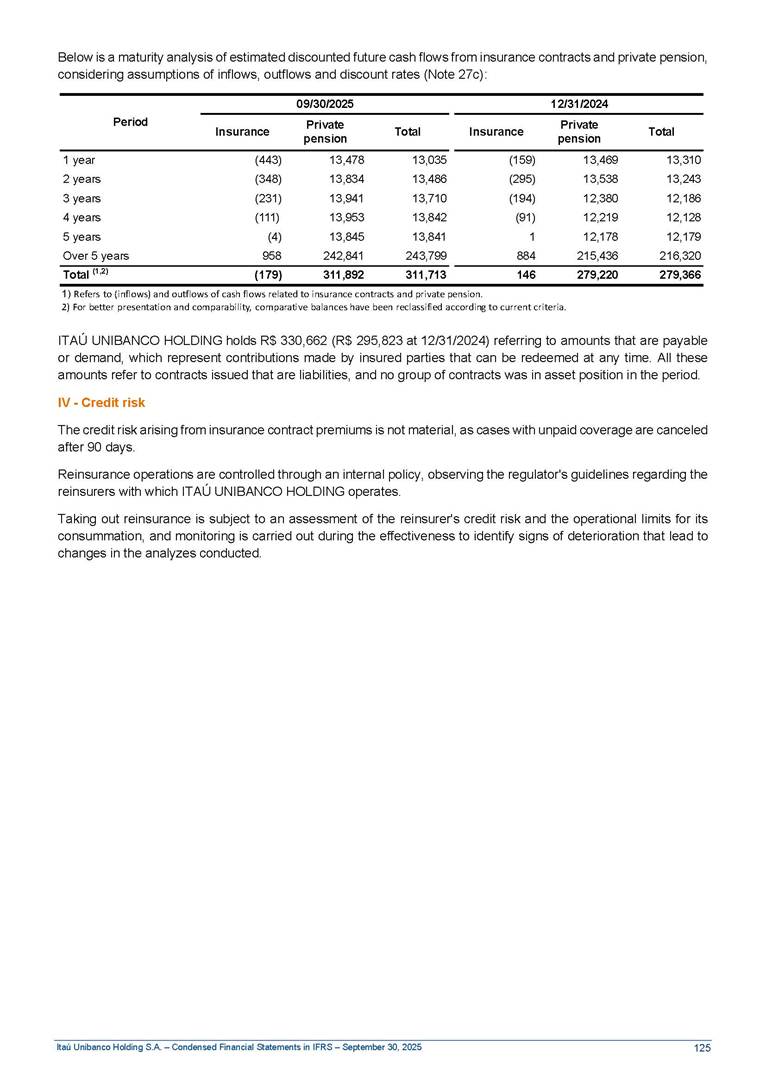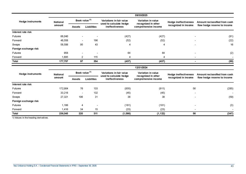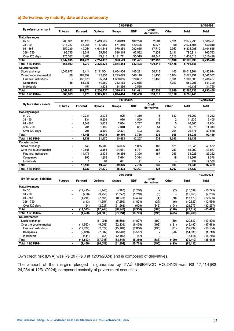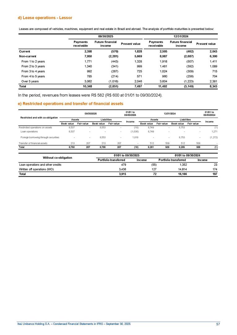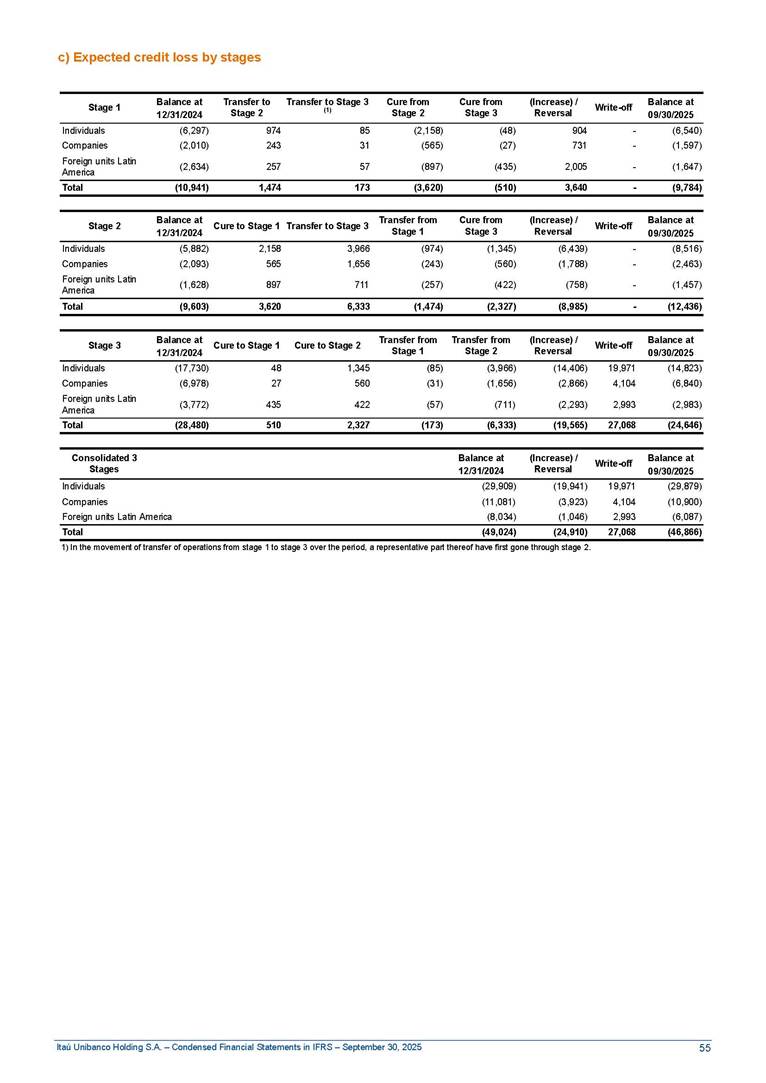 Condensed Financial Statements in IFRS Itaú Unibanco Holding S.A. September 30, 2025 Itaú Day 2025 We held the 5th edition of Itaú Day, an event in which we shared with the market information about the evolution of our business and its impact on our clients’ experience. Itaú Day was attended by the Co-chairmen of the Board of Directors and all members of the Executive Committee. More than 35,000 people have already watched the event, which is available on our Investor Relations website. Management Report 9M25 Key indicators and ratios of our performance from January to September 2025 over the same period of the previous year: Highlights of the first nine months of 2025 Access the full content Recurring Result R$33.1 billion 9M24 8.8% Credit Portfolio1 R$1.4 trillion 9M24 6.1% ROE Recurring 21.1% 9M24 stable Net interest Income2 R$91.8 billion 38.8% Efficiency Ratio3 14.8% Tier 1 Capital Ratio4 13.8% -30 bps -40 bps The credit portfolio1 expanded in Brazil: 6.0% in individuals and 8.7% in companies. There was decrease of 1.2% in Latin America. The 13.8% growth in net interest income² was mainly related to: (i) higher revenues with loan operations, due to higher volume; and (ii) in interbank deposits. The expected credit loss from financial assets increased by 13.9% due to higher expected credit loss with loan and lease operations. General and administrative expenses decreased by 4.8%, mainly due to the reduction in selling of non-financial products, provision for tax and social security lawsuits and other risks. Our accumulated efficiency ratio³ in the first nine months of 2025 decreased 30 bps and stood at 38.8%. (1) Credit portfolio includes financial guarantees provided and private securities. (2) The sum of (i) Interest and Similar Income, (ii) Interest and Similar Expenses, (iii) Income of Financial Assets and Liabilities at Fair Value through Profit or Loss, (iv) Foreign exchange results and exchange variations in foreign transactions. For better comparability, the tax effects of managerial adjustments were reclassified. (3) Efficiency ratio based in BRGAAP managerial disclosure. (4) Considering the limit of 1.5% for AT1, according to CMN Res. No. 4,958. Without this limit, the Tier I Capital Ratio would be 15.3% in Sep-24. Increase of 2.9% in commissions and banking fees and income from insurance and private pension contracts, as a result of the 30.4% increase in income from insurance and private pension contracts, due to the higher financial result for the period and higher insurance sales, mainly related to life and credit life, partially offset by the 1.2% reduction in commissions and banking fees, due to the higher revenues related to current account services, payments and collections and investment banking activities. Performance 9M25 X 9M24 2 3 (1) The sum of (i) Interest and Similar Income, (ii) Interest and Similar Expenses, (iii) Income of Financial Assets and Liabilities at Fair Value through Profit or Loss, (iv) Foreign exchange results and exchange variations in foreign transactions, (v) Commissions and Banking Fees, (vi) Income from Insurance Contracts and Private Pension, net of Reinsurance, and (vii) Other Income. For better comparability, the tax effects of managerial adjustments were reclassified. (2) The sum of (i) Interest and Similar Income, (ii) Interest and Similar Expenses, (iii) Income of Financial Assets and Liabilities at Fair Value through Profit or Loss, (iv) Foreign exchange results and exchange variations in foreign transactions. For better comparability, the tax effects of managerial adjustments were reclassified. (3) The sum on the Commissions and Banking Fees and Income from Insurance Contracts and Private Pension, net of Reinsurance. (4) The Return is calculated by dividing the Net income attributable to owners of the parent company by the Average Stockholders’ Equity. The quotient was multiplied by the number of periods in the year to derive the annualized rate. (5) The return is calculated by dividing the Recurring Result by the Average Stockholders’ Equity. The quotient was multiplied by the number of periods in the year to derive the annualized rate. (6) Source: Bloomberg. (7) The number of outstanding shares has been adjusted to reflect the 10% bonus that took place on March 20, 2025. Therefore, the indicators per share were reclassified. We present below the key indicators comprising our results: In R$ billions Income information 9M25 9M24 Variation Operating Revenues1 Net Interest Income2 Commissions and Banking Fees and Income from Insurance and Private Pension Contracts3 Expected Credit Loss from Financial Assets General and Administrative Expenses Net Income Net Income Attributable to Owners of the Parent Company Recurring Result Return on Average Equity - Annualized4 Recurring Return on Average Equity - Annualized5 Shares 9M257 9M24 7 Variation Net Income per Share - R$ Book Value per Share - R$ (in circulation on 09/30) Dividends and Interest on Own Capital net of Taxes per Share - R$ Average Financial Daily Trading Volume B3 (ON+PN) NYSE (ADR) Market Capitalization6 133.0 91.8 41.1 (24.9) (59.2) 33.7 33.0 33.1 21.0% 21.1% 130.0 80.6 40.0 (21.8) (62.2) 31.0 30.3 30.5 20.9% 21.1% 2.3% 13.8% 2.9% 13.9% -4.8% 8.7% 8.9% 8.8% 10 bps stable 3.06 20.02 0.75 1.8 0.8 1.0 397.2 2.81 18.69 0.71 1.4 0.8 0.6 330.8 8.9% 7.1% 4.9% 29.0% 2.5% 64.6% 20.1% 4 Know more Know more Know more We created a focused structure for crypto fund management Through Itaú Asset, we created our first dedicated structure for cryptoassets. This initiative reinforces our commitment to delivering innovative and tailored solutions to our clients, offering products that cover all allocation possibilities in the financial market. Our new crypto-focused team is now part of the Multimesas structure (similar to multi-asset), which includes more than 130 investment professionals. We are the first bank to offer Pix for small and medium-sized businesses using the Guaran