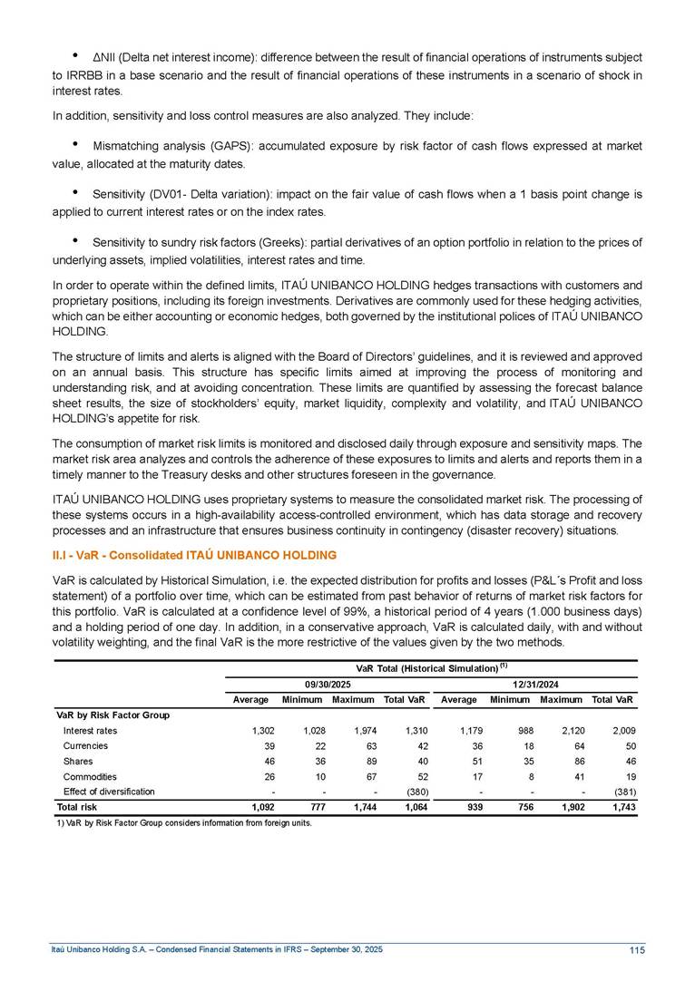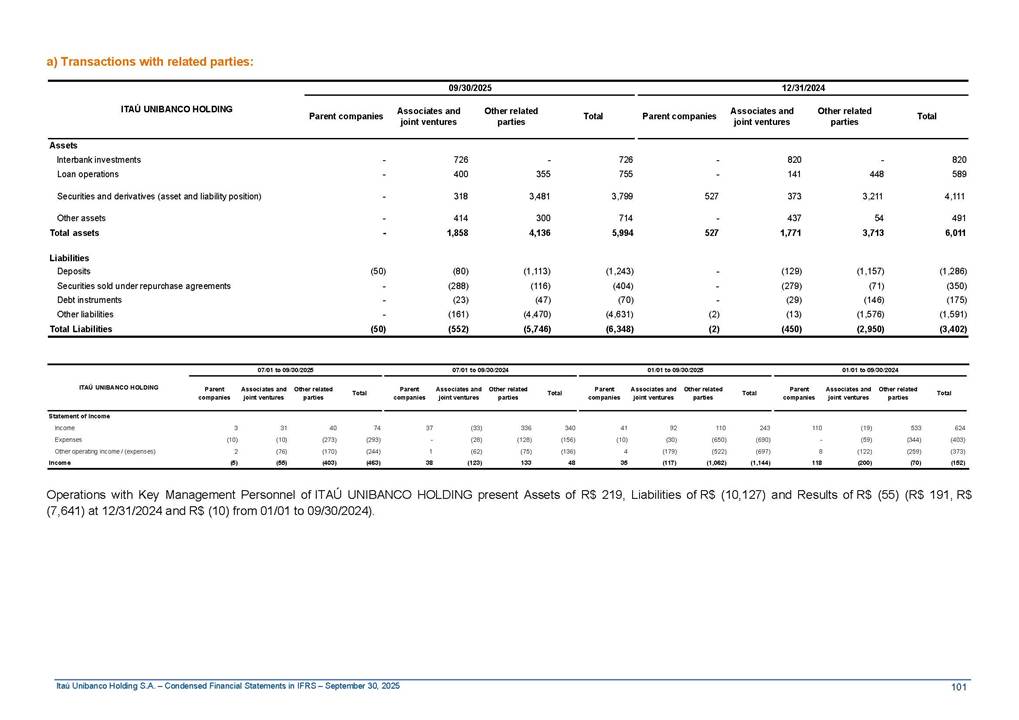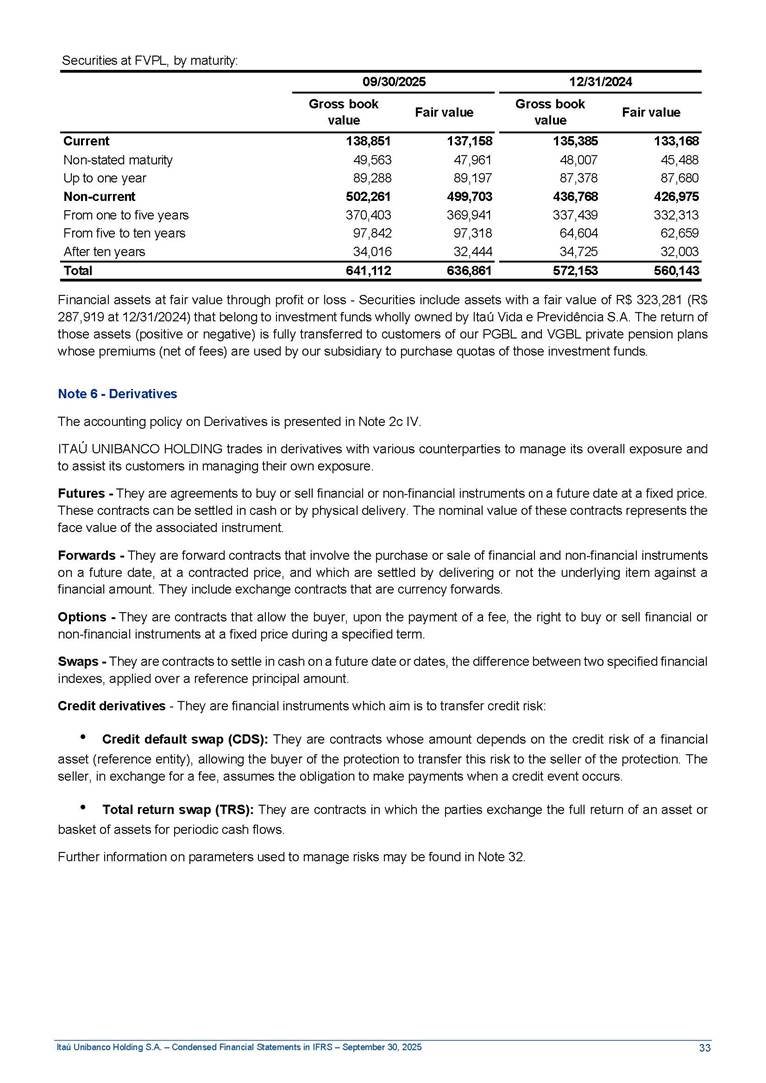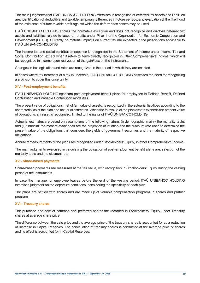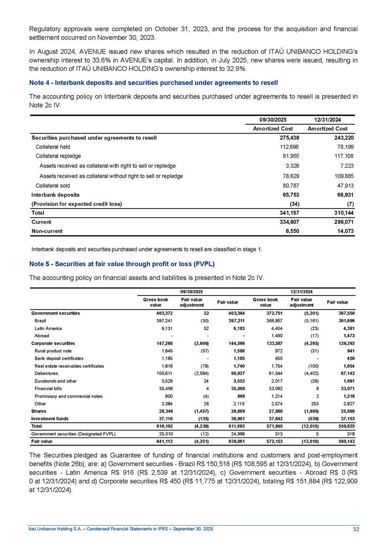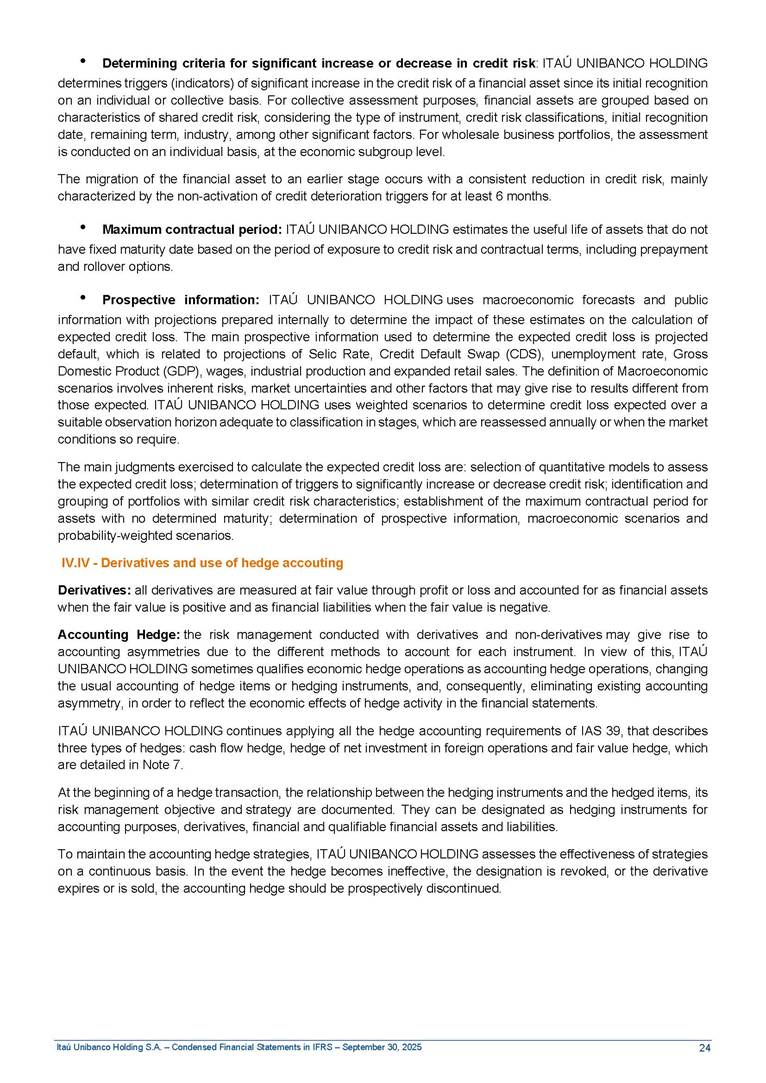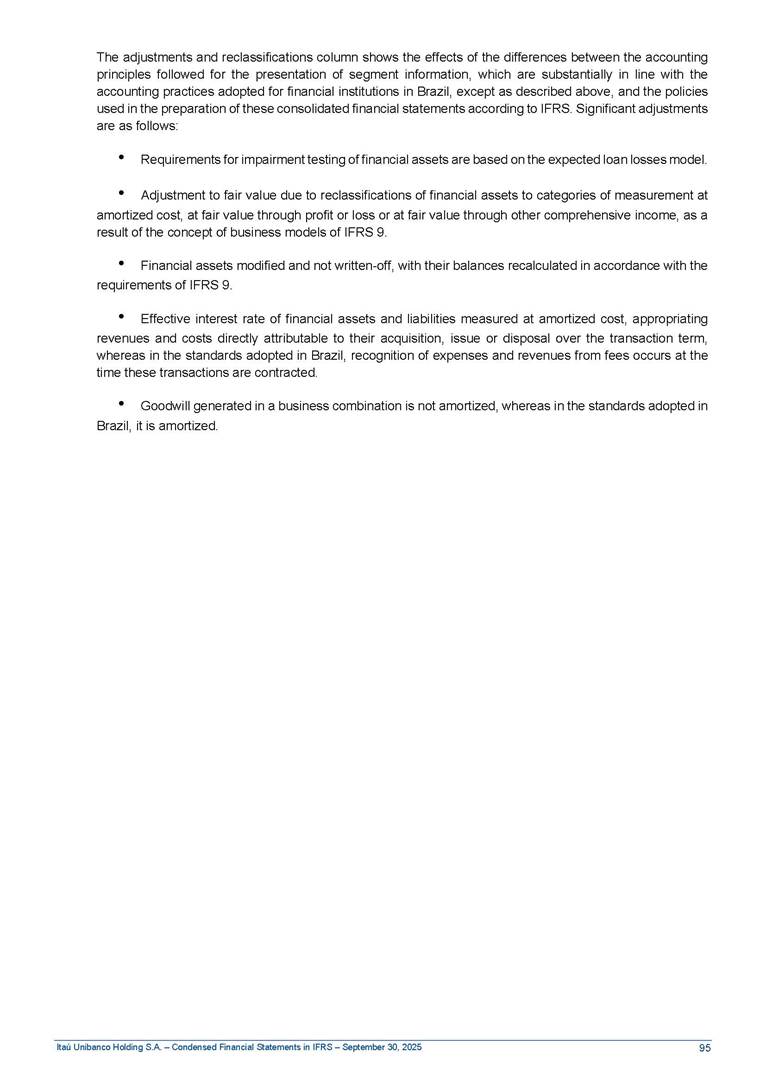 Condensed Financial Statements in IFRS Itaú Unibanco Holding S.A. September 30, 2025 Itaú Day 2025 We held the 5th edition of Itaú Day, an event in which we shared with the market information about the evolution of our business and its impact on our clients’ experience. Itaú Day was attended by the Co-chairmen of the Board of Directors and all members of the Executive Committee. More than 35,000 people have already watched the event, which is available on our Investor Relations website. Management Report 9M25 Key indicators and ratios of our performance from January to September 2025 over the same period of the previous year: Highlights of the first nine months of 2025 Access the full content Recurring Result R$33.1 billion 9M24 8.8% Credit Portfolio1 R$1.4 trillion 9M24 6.1% ROE Recurring 21.1% 9M24 stable Net interest Income2 R$91.8 billion 38.8% Efficiency Ratio3 14.8% Tier 1 Capital Ratio4 13.8% -30 bps -40 bps The credit portfolio1 expanded in Brazil: 6.0% in individuals and 8.7% in companies. There was decrease of 1.2% in Latin America. The 13.8% growth in net interest income² was mainly related to: (i) higher revenues with loan operations, due to higher volume; and (ii) in interbank deposits. The expected credit loss from financial assets increased by 13.9% due to higher expected credit loss with loan and lease operations. General and administrative expenses decreased by 4.8%, mainly due to the reduction in selling of non-financial products, provision for tax and social security lawsuits and other risks. Our accumulated efficiency ratio³ in the first nine months of 2025 decreased 30 bps and stood at 38.8%. (1) Credit portfolio includes financial guarantees provided and private securities. (2) The sum of (i) Interest and Similar Income, (ii) Interest and Similar Expenses, (iii) Income of Financial Assets and Liabilities at Fair Value through Profit or Loss, (iv) Foreign exchange results and exchange variations in foreign transactions. For better comparability, the tax effects of managerial adjustments were reclassified. (3) Efficiency ratio based in BRGAAP managerial disclosure. (4) Considering the limit of 1.5% for AT1, according to CMN Res. No. 4,958. Without this limit, the Tier I Capital Ratio would be 15.3% in Sep-24. Increase of 2.9% in commissions and banking fees and income from insurance and private pension contracts, as a result of the 30.4% increase in income from insurance and private pension contracts, due to the higher financial result for the period and higher insurance sales, mainly related to life and credit life, partially offset by the 1.2% reduction in commissions and banking fees, due to the higher revenues related to current account services, payments and collections and investment banking activities. Performance 9M25 X 9M24 2 3 (1) The sum of (i) Interest and Similar Income, (ii) Interest and Similar Expenses, (iii) Income of Financial Assets and Liabilities at Fair Value through Profit or Loss, (iv) Foreign exchange results and exchange variations in foreign transactions, (v) Commissions and Banking Fees, (vi) Income from Insurance Contracts and Private Pension, net of Reinsurance, and (vii) Other Income. For better comparability, the tax effects of managerial adjustments were reclassified. (2) The sum of (i) Interest and Similar Income, (ii) Interest and Similar Expenses, (iii) Income of Financial Assets and Liabilities at Fair Value through Profit or Loss, (iv) Foreign exchange results and exchange variations in foreign transactions. For better comparability, the tax effects of managerial adjustments were reclassified. (3) The sum on the Commissions and Banking Fees and Income from Insurance Contracts and Private Pension, net of Reinsurance. (4) The Return is calculated by dividing the Net income attributable to owners of the parent company by the Average Stockholders’ Equity. The quotient was multiplied by the number of periods in the year to derive the annualized rate. (5) The return is calculated by dividing the Recurring Result by the Average Stockholders’ Equity. The quotient was multiplied by the number of periods in the year to derive the annualized rate. (6) Source: Bloomberg. (7) The number of outstanding shares has been adjusted to reflect the 10% bonus that took place on March 20, 2025. Therefore, the indicators per share were reclassified. We present below the key indicators comprising our results: In R$ billions Income information 9M25 9M24 Variation Operating Revenues1 Net Interest Income2 Commissions and Banking Fees and Income from Insurance and Private Pension Contracts3 Expected Credit Loss from Financial Assets General and Administrative Expenses Net Income Net Income Attributable to Owners of the Parent Company Recurring Result Return on Average Equity - Annualized4 Recurring Return on Average Equity - Annualized5 Shares 9M257 9M24 7 Variation Net Income per Share - R$ Book Value per Share - R$ (in circulation on 09/30) Dividends and Interest on Own Capital net of Taxes per Share - R$ Average Financial Daily Trading Volume B3 (ON+PN) NYSE (ADR) Market Capitalization6 133.0 91.8 41.1 (24.9) (59.2) 33.7 33.0 33.1 21.0% 21.1% 130.0 80.6 40.0 (21.8) (62.2) 31.0 30.3 30.5 20.9% 21.1% 2.3% 13.8% 2.9% 13.9% -4.8% 8.7% 8.9% 8.8% 10 bps stable 3.06 20.02 0.75 1.8 0.8 1.0 397.2 2.81 18.69 0.71 1.4 0.8 0.6 330.8 8.9% 7.1% 4.9% 29.0% 2.5% 64.6% 20.1% 4 Know more Know more Know more We created a focused structure for crypto fund management Through Itaú Asset, we created our first dedicated structure for cryptoassets. This initiative reinforces our commitment to delivering innovative and tailored solutions to our clients, offering products that cover all allocation possibilities in the financial market. Our new crypto-focused team is now part of the Multimesas structure (similar to multi-asset), which includes more than 130 investment professionals. We are the first bank to offer Pix for small and medium-sized businesses using the Guaran