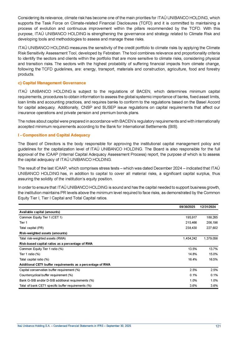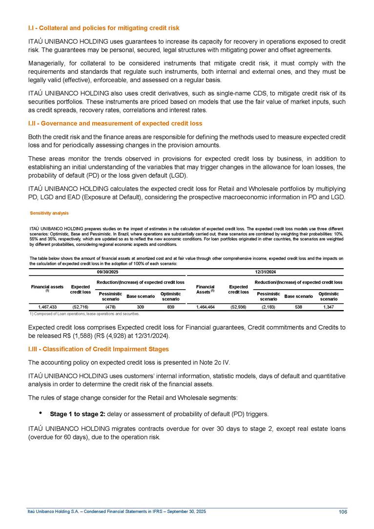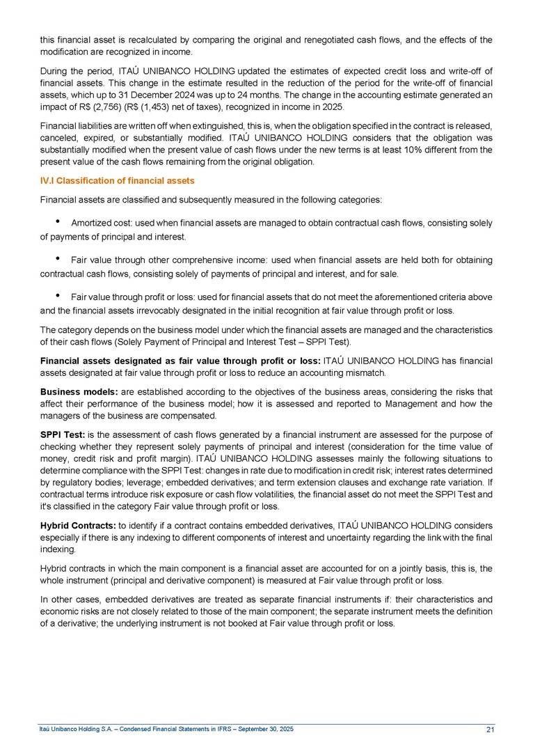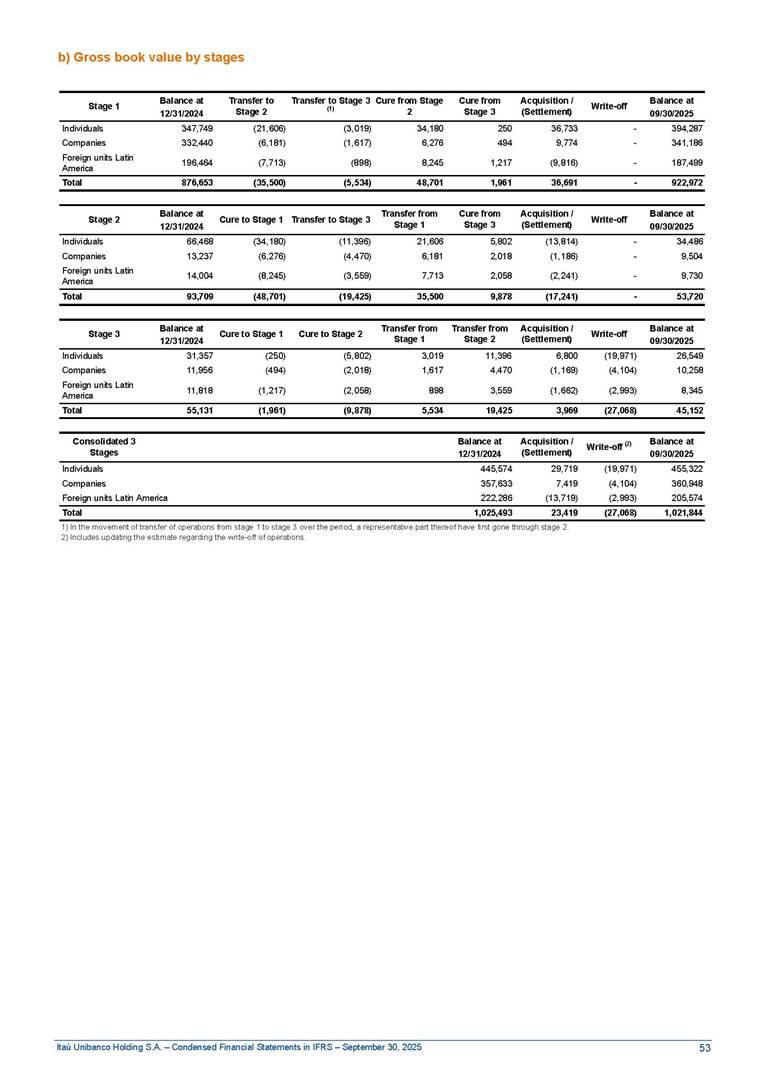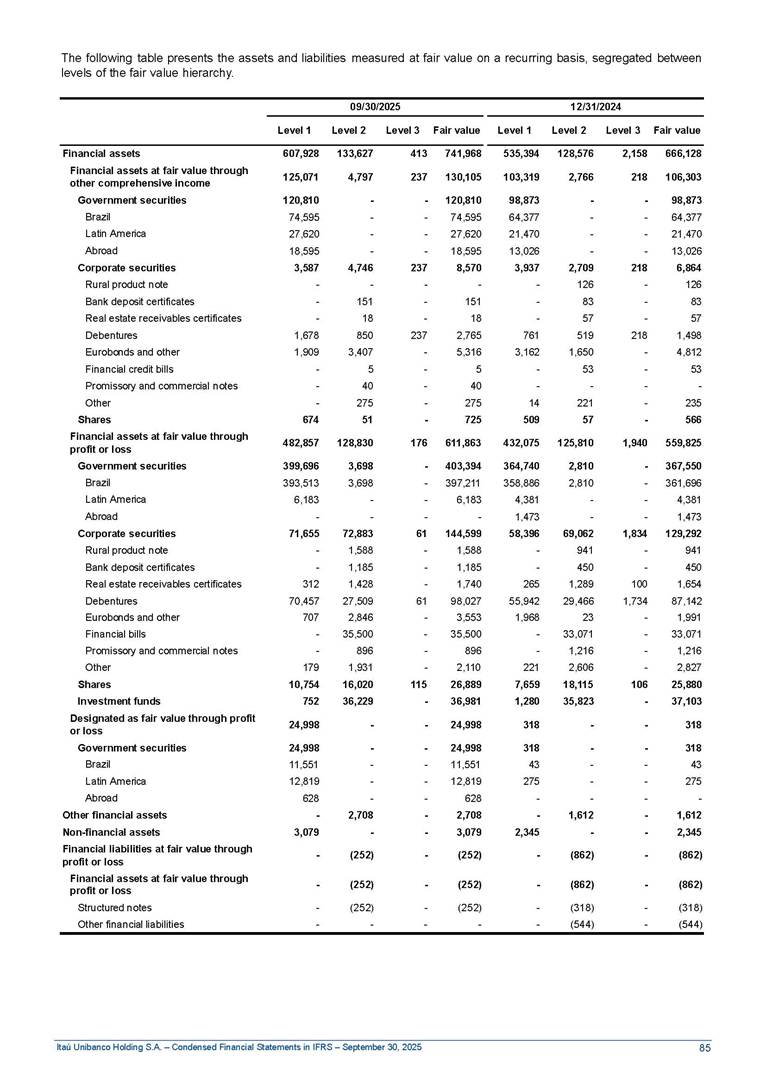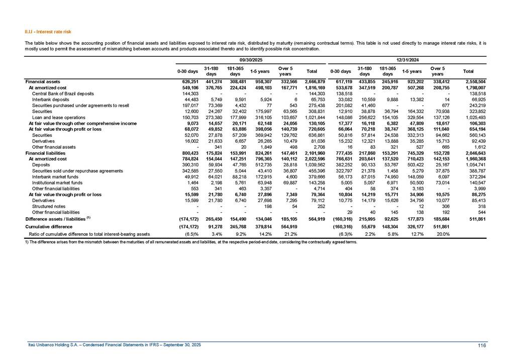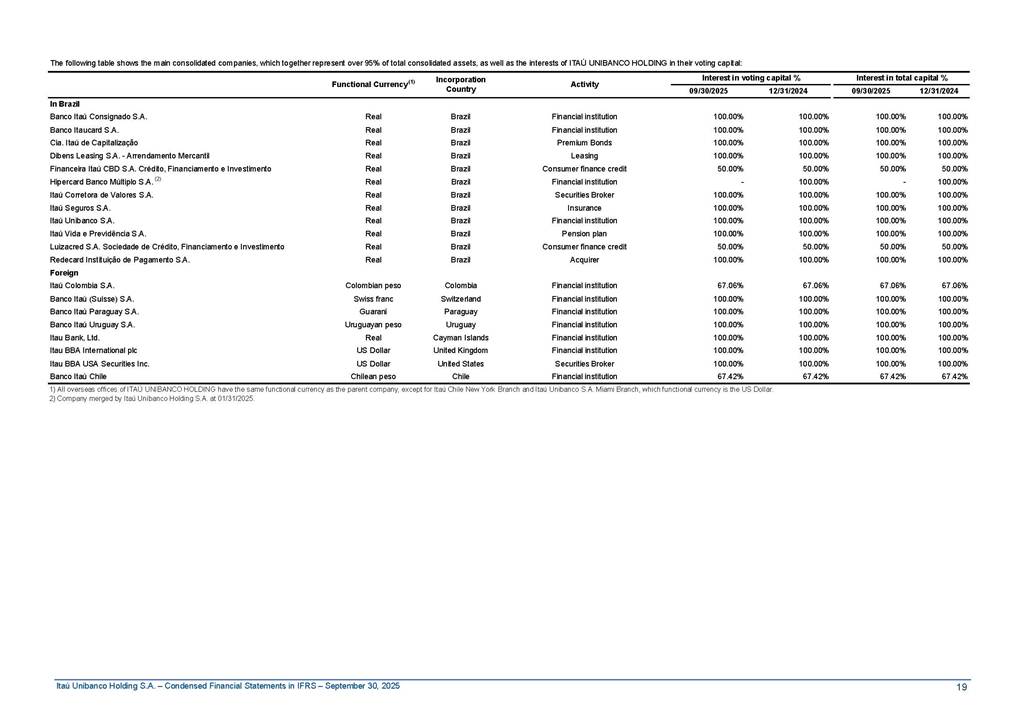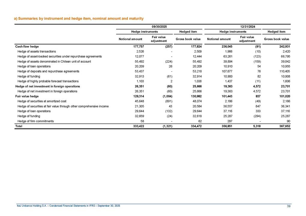 Condensed Financial Statements in IFRS Itaú Unibanco Holding S.A. September 30, 2025 Itaú Day 2025 We held the 5th edition of Itaú Day, an event in which we shared with the market information about the evolution of our business and its impact on our clients’ experience. Itaú Day was attended by the Co-chairmen of the Board of Directors and all members of the Executive Committee. More than 35,000 people have already watched the event, which is available on our Investor Relations website. Management Report 9M25 Key indicators and ratios of our performance from January to September 2025 over the same period of the previous year: Highlights of the first nine months of 2025 Access the full content Recurring Result R$33.1 billion 9M24 8.8% Credit Portfolio1 R$1.4 trillion 9M24 6.1% ROE Recurring 21.1% 9M24 stable Net interest Income2 R$91.8 billion 38.8% Efficiency Ratio3 14.8% Tier 1 Capital Ratio4 13.8% -30 bps -40 bps The credit portfolio1 expanded in Brazil: 6.0% in individuals and 8.7% in companies. There was decrease of 1.2% in Latin America. The 13.8% growth in net interest income² was mainly related to: (i) higher revenues with loan operations, due to higher volume; and (ii) in interbank deposits. The expected credit loss from financial assets increased by 13.9% due to higher expected credit loss with loan and lease operations. General and administrative expenses decreased by 4.8%, mainly due to the reduction in selling of non-financial products, provision for tax and social security lawsuits and other risks. Our accumulated efficiency ratio³ in the first nine months of 2025 decreased 30 bps and stood at 38.8%. (1) Credit portfolio includes financial guarantees provided and private securities. (2) The sum of (i) Interest and Similar Income, (ii) Interest and Similar Expenses, (iii) Income of Financial Assets and Liabilities at Fair Value through Profit or Loss, (iv) Foreign exchange results and exchange variations in foreign transactions. For better comparability, the tax effects of managerial adjustments were reclassified. (3) Efficiency ratio based in BRGAAP managerial disclosure. (4) Considering the limit of 1.5% for AT1, according to CMN Res. No. 4,958. Without this limit, the Tier I Capital Ratio would be 15.3% in Sep-24. Increase of 2.9% in commissions and banking fees and income from insurance and private pension contracts, as a result of the 30.4% increase in income from insurance and private pension contracts, due to the higher financial result for the period and higher insurance sales, mainly related to life and credit life, partially offset by the 1.2% reduction in commissions and banking fees, due to the higher revenues related to current account services, payments and collections and investment banking activities. Performance 9M25 X 9M24 2 3 (1) The sum of (i) Interest and Similar Income, (ii) Interest and Similar Expenses, (iii) Income of Financial Assets and Liabilities at Fair Value through Profit or Loss, (iv) Foreign exchange results and exchange variations in foreign transactions, (v) Commissions and Banking Fees, (vi) Income from Insurance Contracts and Private Pension, net of Reinsurance, and (vii) Other Income. For better comparability, the tax effects of managerial adjustments were reclassified. (2) The sum of (i) Interest and Similar Income, (ii) Interest and Similar Expenses, (iii) Income of Financial Assets and Liabilities at Fair Value through Profit or Loss, (iv) Foreign exchange results and exchange variations in foreign transactions. For better comparability, the tax effects of managerial adjustments were reclassified. (3) The sum on the Commissions and Banking Fees and Income from Insurance Contracts and Private Pension, net of Reinsurance. (4) The Return is calculated by dividing the Net income attributable to owners of the parent company by the Average Stockholders’ Equity. The quotient was multiplied by the number of periods in the year to derive the annualized rate. (5) The return is calculated by dividing the Recurring Result by the Average Stockholders’ Equity. The quotient was multiplied by the number of periods in the year to derive the annualized rate. (6) Source: Bloomberg. (7) The number of outstanding shares has been adjusted to reflect the 10% bonus that took place on March 20, 2025. Therefore, the indicators per share were reclassified. We present below the key indicators comprising our results: In R$ billions Income information 9M25 9M24 Variation Operating Revenues1 Net Interest Income2 Commissions and Banking Fees and Income from Insurance and Private Pension Contracts3 Expected Credit Loss from Financial Assets General and Administrative Expenses Net Income Net Income Attributable to Owners of the Parent Company Recurring Result Return on Average Equity - Annualized4 Recurring Return on Average Equity - Annualized5 Shares 9M257 9M24 7 Variation Net Income per Share - R$ Book Value per Share - R$ (in circulation on 09/30) Dividends and Interest on Own Capital net of Taxes per Share - R$ Average Financial Daily Trading Volume B3 (ON+PN) NYSE (ADR) Market Capitalization6 133.0 91.8 41.1 (24.9) (59.2) 33.7 33.0 33.1 21.0% 21.1% 130.0 80.6 40.0 (21.8) (62.2) 31.0 30.3 30.5 20.9% 21.1% 2.3% 13.8% 2.9% 13.9% -4.8% 8.7% 8.9% 8.8% 10 bps stable 3.06 20.02 0.75 1.8 0.8 1.0 397.2 2.81 18.69 0.71 1.4 0.8 0.6 330.8 8.9% 7.1% 4.9% 29.0% 2.5% 64.6% 20.1% 4 Know more Know more Know more We created a focused structure for crypto fund management Through Itaú Asset, we created our first dedicated structure for cryptoassets. This initiative reinforces our commitment to delivering innovative and tailored solutions to our clients, offering products that cover all allocation possibilities in the financial market. Our new crypto-focused team is now part of the Multimesas structure (similar to multi-asset), which includes more than 130 investment professionals. We are the first bank to offer Pix for small and medium-sized businesses using the Guaran