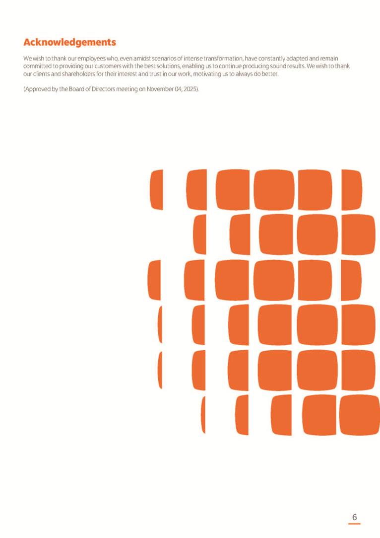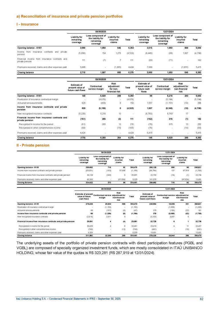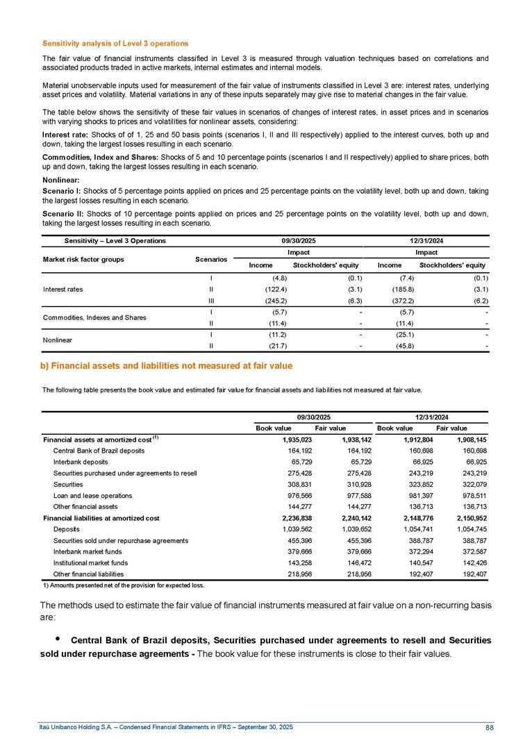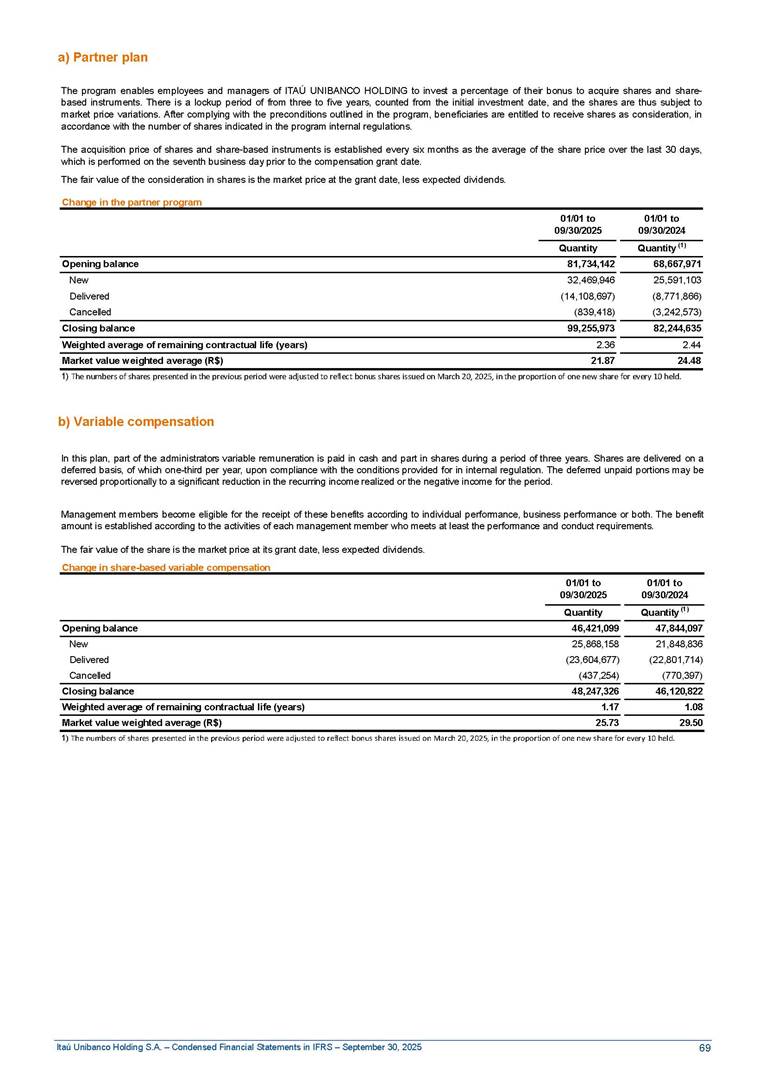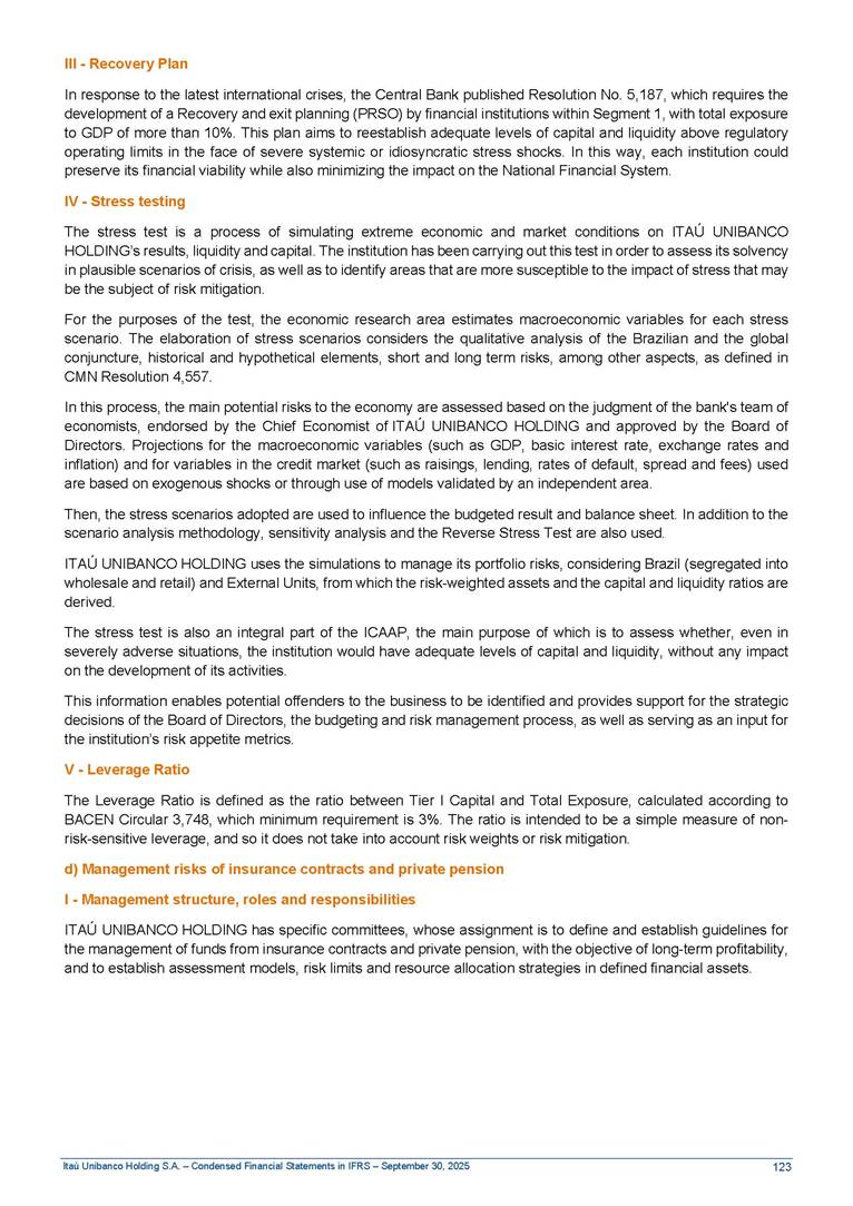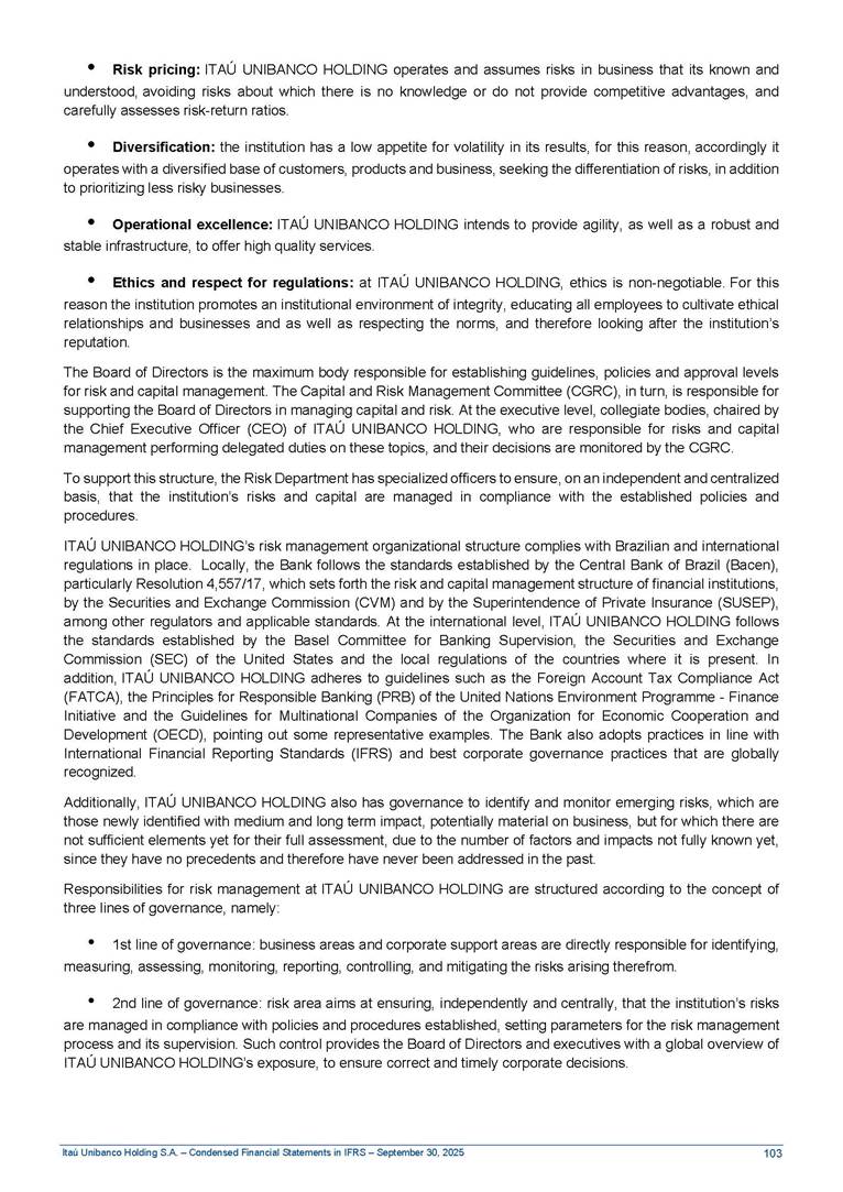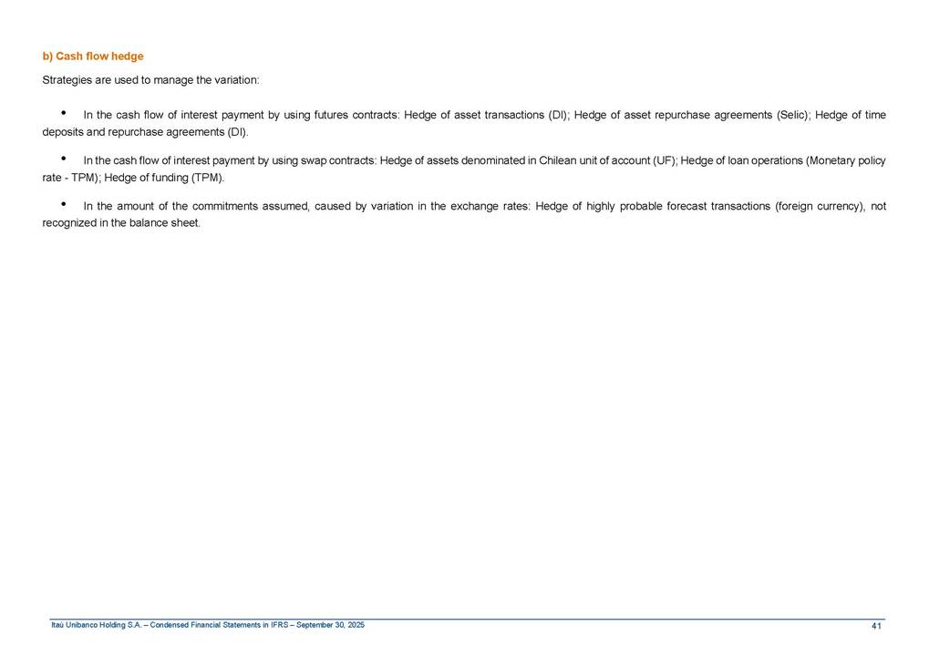 Condensed Financial Statements in IFRS Itaú Unibanco Holding S.A. September 30, 2025 Itaú Day 2025 We held the 5th edition of Itaú Day, an event in which we shared with the market information about the evolution of our business and its impact on our clients’ experience. Itaú Day was attended by the Co-chairmen of the Board of Directors and all members of the Executive Committee. More than 35,000 people have already watched the event, which is available on our Investor Relations website. Management Report 9M25 Key indicators and ratios of our performance from January to September 2025 over the same period of the previous year: Highlights of the first nine months of 2025 Access the full content Recurring Result R$33.1 billion 9M24 8.8% Credit Portfolio1 R$1.4 trillion 9M24 6.1% ROE Recurring 21.1% 9M24 stable Net interest Income2 R$91.8 billion 38.8% Efficiency Ratio3 14.8% Tier 1 Capital Ratio4 13.8% -30 bps -40 bps The credit portfolio1 expanded in Brazil: 6.0% in individuals and 8.7% in companies. There was decrease of 1.2% in Latin America. The 13.8% growth in net interest income² was mainly related to: (i) higher revenues with loan operations, due to higher volume; and (ii) in interbank deposits. The expected credit loss from financial assets increased by 13.9% due to higher expected credit loss with loan and lease operations. General and administrative expenses decreased by 4.8%, mainly due to the reduction in selling of non-financial products, provision for tax and social security lawsuits and other risks. Our accumulated efficiency ratio³ in the first nine months of 2025 decreased 30 bps and stood at 38.8%. (1) Credit portfolio includes financial guarantees provided and private securities. (2) The sum of (i) Interest and Similar Income, (ii) Interest and Similar Expenses, (iii) Income of Financial Assets and Liabilities at Fair Value through Profit or Loss, (iv) Foreign exchange results and exchange variations in foreign transactions. For better comparability, the tax effects of managerial adjustments were reclassified. (3) Efficiency ratio based in BRGAAP managerial disclosure. (4) Considering the limit of 1.5% for AT1, according to CMN Res. No. 4,958. Without this limit, the Tier I Capital Ratio would be 15.3% in Sep-24. Increase of 2.9% in commissions and banking fees and income from insurance and private pension contracts, as a result of the 30.4% increase in income from insurance and private pension contracts, due to the higher financial result for the period and higher insurance sales, mainly related to life and credit life, partially offset by the 1.2% reduction in commissions and banking fees, due to the higher revenues related to current account services, payments and collections and investment banking activities. Performance 9M25 X 9M24 2 3 (1) The sum of (i) Interest and Similar Income, (ii) Interest and Similar Expenses, (iii) Income of Financial Assets and Liabilities at Fair Value through Profit or Loss, (iv) Foreign exchange results and exchange variations in foreign transactions, (v) Commissions and Banking Fees, (vi) Income from Insurance Contracts and Private Pension, net of Reinsurance, and (vii) Other Income. For better comparability, the tax effects of managerial adjustments were reclassified. (2) The sum of (i) Interest and Similar Income, (ii) Interest and Similar Expenses, (iii) Income of Financial Assets and Liabilities at Fair Value through Profit or Loss, (iv) Foreign exchange results and exchange variations in foreign transactions. For better comparability, the tax effects of managerial adjustments were reclassified. (3) The sum on the Commissions and Banking Fees and Income from Insurance Contracts and Private Pension, net of Reinsurance. (4) The Return is calculated by dividing the Net income attributable to owners of the parent company by the Average Stockholders’ Equity. The quotient was multiplied by the number of periods in the year to derive the annualized rate. (5) The return is calculated by dividing the Recurring Result by the Average Stockholders’ Equity. The quotient was multiplied by the number of periods in the year to derive the annualized rate. (6) Source: Bloomberg. (7) The number of outstanding shares has been adjusted to reflect the 10% bonus that took place on March 20, 2025. Therefore, the indicators per share were reclassified. We present below the key indicators comprising our results: In R$ billions Income information 9M25 9M24 Variation Operating Revenues1 Net Interest Income2 Commissions and Banking Fees and Income from Insurance and Private Pension Contracts3 Expected Credit Loss from Financial Assets General and Administrative Expenses Net Income Net Income Attributable to Owners of the Parent Company Recurring Result Return on Average Equity - Annualized4 Recurring Return on Average Equity - Annualized5 Shares 9M257 9M24 7 Variation Net Income per Share - R$ Book Value per Share - R$ (in circulation on 09/30) Dividends and Interest on Own Capital net of Taxes per Share - R$ Average Financial Daily Trading Volume B3 (ON+PN) NYSE (ADR) Market Capitalization6 133.0 91.8 41.1 (24.9) (59.2) 33.7 33.0 33.1 21.0% 21.1% 130.0 80.6 40.0 (21.8) (62.2) 31.0 30.3 30.5 20.9% 21.1% 2.3% 13.8% 2.9% 13.9% -4.8% 8.7% 8.9% 8.8% 10 bps stable 3.06 20.02 0.75 1.8 0.8 1.0 397.2 2.81 18.69 0.71 1.4 0.8 0.6 330.8 8.9% 7.1% 4.9% 29.0% 2.5% 64.6% 20.1% 4 Know more Know more Know more We created a focused structure for crypto fund management Through Itaú Asset, we created our first dedicated structure for cryptoassets. This initiative reinforces our commitment to delivering innovative and tailored solutions to our clients, offering products that cover all allocation possibilities in the financial market. Our new crypto-focused team is now part of the Multimesas structure (similar to multi-asset), which includes more than 130 investment professionals. We are the first bank to offer Pix for small and medium-sized businesses using the Guaran