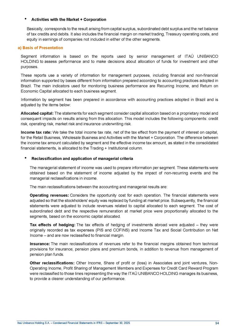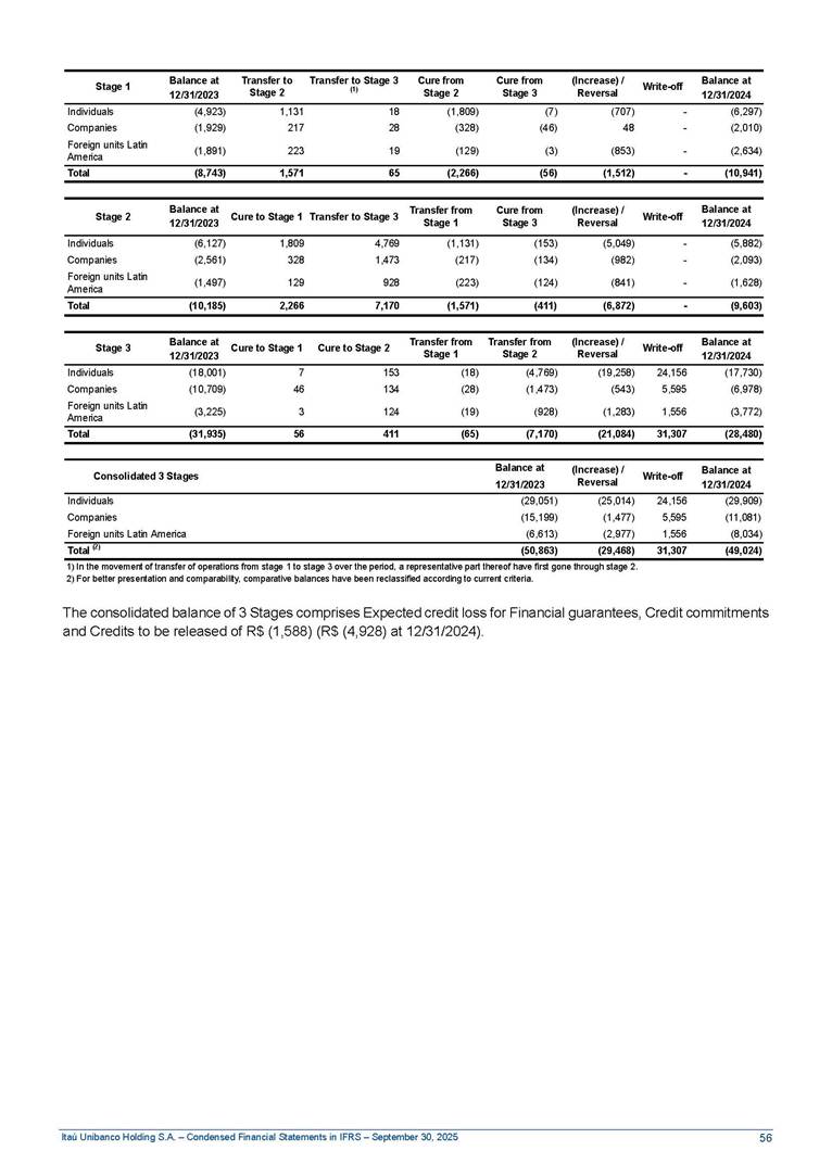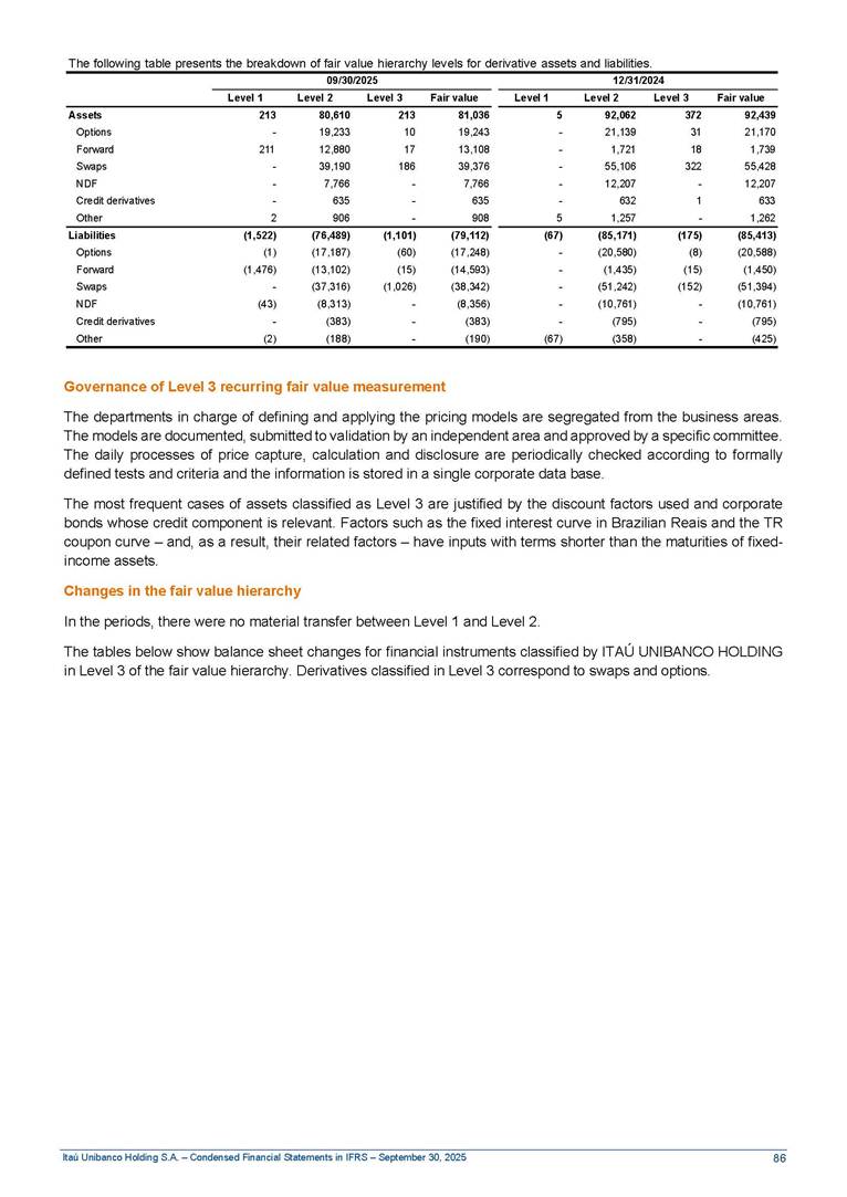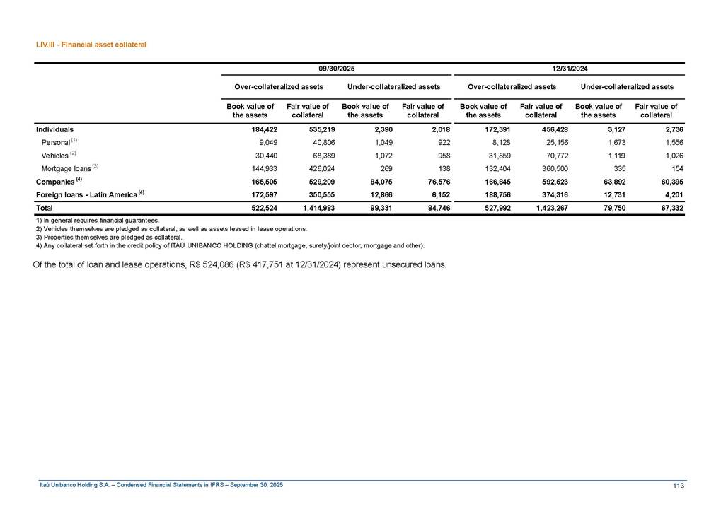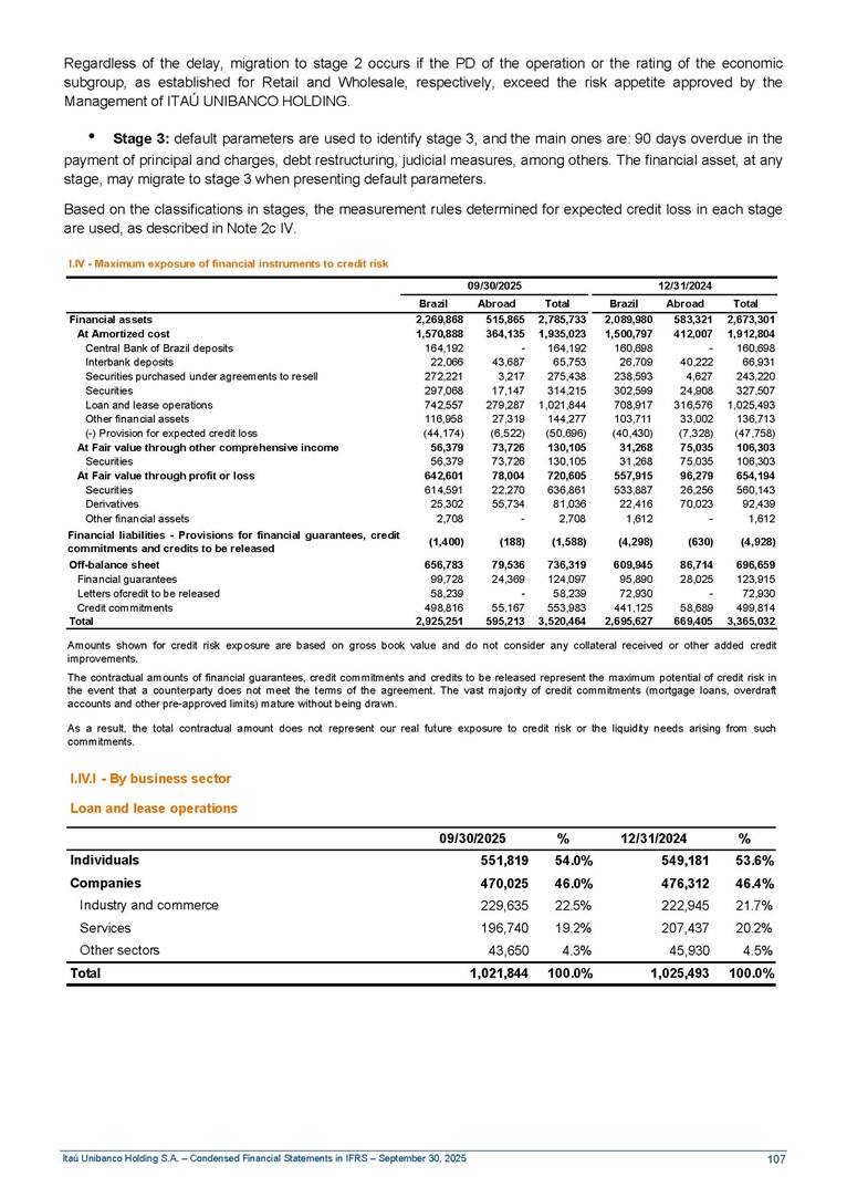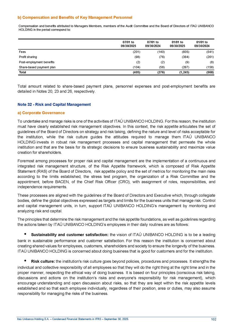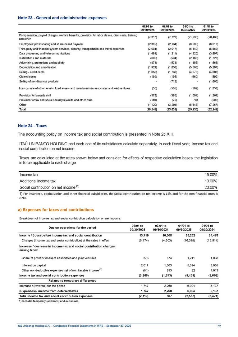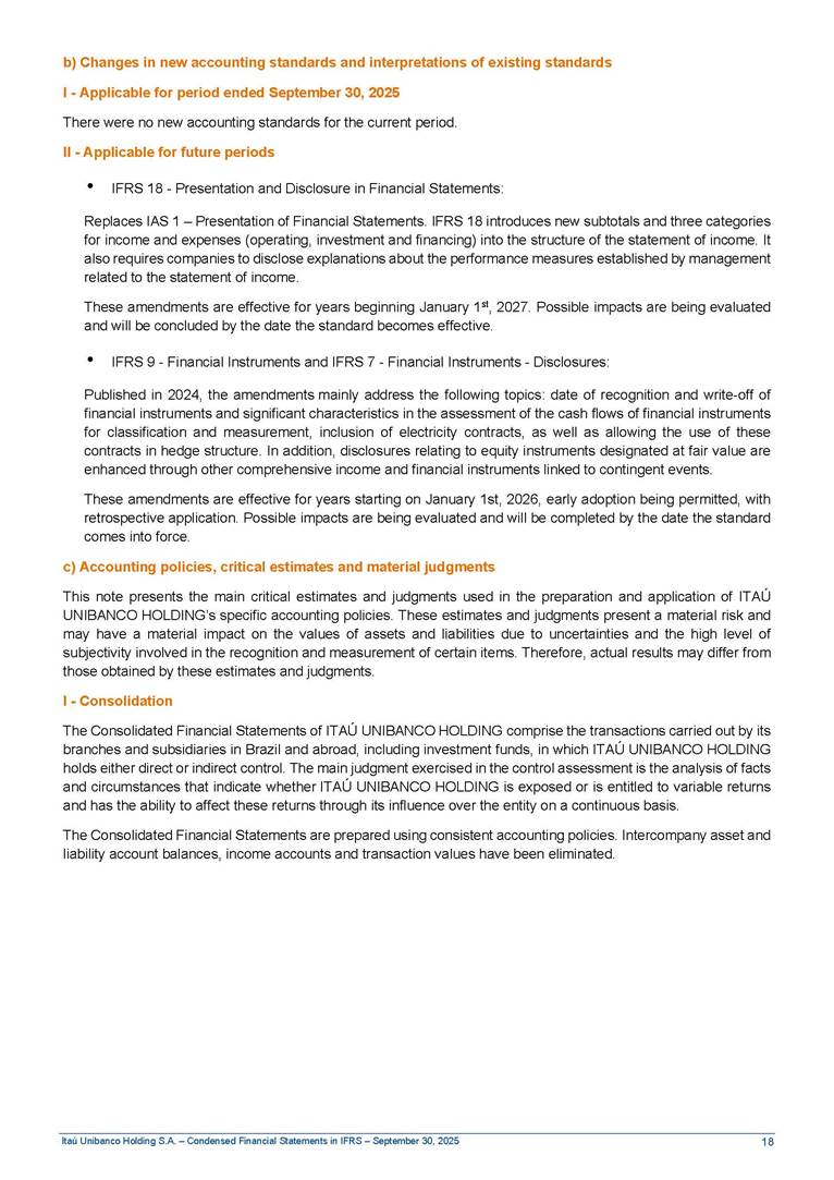 Condensed Financial Statements in IFRS Itaú Unibanco Holding S.A. September 30, 2025 Itaú Day 2025 We held the 5th edition of Itaú Day, an event in which we shared with the market information about the evolution of our business and its impact on our clients’ experience. Itaú Day was attended by the Co-chairmen of the Board of Directors and all members of the Executive Committee. More than 35,000 people have already watched the event, which is available on our Investor Relations website. Management Report 9M25 Key indicators and ratios of our performance from January to September 2025 over the same period of the previous year: Highlights of the first nine months of 2025 Access the full content Recurring Result R$33.1 billion 9M24 8.8% Credit Portfolio1 R$1.4 trillion 9M24 6.1% ROE Recurring 21.1% 9M24 stable Net interest Income2 R$91.8 billion 38.8% Efficiency Ratio3 14.8% Tier 1 Capital Ratio4 13.8% -30 bps -40 bps The credit portfolio1 expanded in Brazil: 6.0% in individuals and 8.7% in companies. There was decrease of 1.2% in Latin America. The 13.8% growth in net interest income² was mainly related to: (i) higher revenues with loan operations, due to higher volume; and (ii) in interbank deposits. The expected credit loss from financial assets increased by 13.9% due to higher expected credit loss with loan and lease operations. General and administrative expenses decreased by 4.8%, mainly due to the reduction in selling of non-financial products, provision for tax and social security lawsuits and other risks. Our accumulated efficiency ratio³ in the first nine months of 2025 decreased 30 bps and stood at 38.8%. (1) Credit portfolio includes financial guarantees provided and private securities. (2) The sum of (i) Interest and Similar Income, (ii) Interest and Similar Expenses, (iii) Income of Financial Assets and Liabilities at Fair Value through Profit or Loss, (iv) Foreign exchange results and exchange variations in foreign transactions. For better comparability, the tax effects of managerial adjustments were reclassified. (3) Efficiency ratio based in BRGAAP managerial disclosure. (4) Considering the limit of 1.5% for AT1, according to CMN Res. No. 4,958. Without this limit, the Tier I Capital Ratio would be 15.3% in Sep-24. Increase of 2.9% in commissions and banking fees and income from insurance and private pension contracts, as a result of the 30.4% increase in income from insurance and private pension contracts, due to the higher financial result for the period and higher insurance sales, mainly related to life and credit life, partially offset by the 1.2% reduction in commissions and banking fees, due to the higher revenues related to current account services, payments and collections and investment banking activities. Performance 9M25 X 9M24 2 3 (1) The sum of (i) Interest and Similar Income, (ii) Interest and Similar Expenses, (iii) Income of Financial Assets and Liabilities at Fair Value through Profit or Loss, (iv) Foreign exchange results and exchange variations in foreign transactions, (v) Commissions and Banking Fees, (vi) Income from Insurance Contracts and Private Pension, net of Reinsurance, and (vii) Other Income. For better comparability, the tax effects of managerial adjustments were reclassified. (2) The sum of (i) Interest and Similar Income, (ii) Interest and Similar Expenses, (iii) Income of Financial Assets and Liabilities at Fair Value through Profit or Loss, (iv) Foreign exchange results and exchange variations in foreign transactions. For better comparability, the tax effects of managerial adjustments were reclassified. (3) The sum on the Commissions and Banking Fees and Income from Insurance Contracts and Private Pension, net of Reinsurance. (4) The Return is calculated by dividing the Net income attributable to owners of the parent company by the Average Stockholders’ Equity. The quotient was multiplied by the number of periods in the year to derive the annualized rate. (5) The return is calculated by dividing the Recurring Result by the Average Stockholders’ Equity. The quotient was multiplied by the number of periods in the year to derive the annualized rate. (6) Source: Bloomberg. (7) The number of outstanding shares has been adjusted to reflect the 10% bonus that took place on March 20, 2025. Therefore, the indicators per share were reclassified. We present below the key indicators comprising our results: In R$ billions Income information 9M25 9M24 Variation Operating Revenues1 Net Interest Income2 Commissions and Banking Fees and Income from Insurance and Private Pension Contracts3 Expected Credit Loss from Financial Assets General and Administrative Expenses Net Income Net Income Attributable to Owners of the Parent Company Recurring Result Return on Average Equity - Annualized4 Recurring Return on Average Equity - Annualized5 Shares 9M257 9M24 7 Variation Net Income per Share - R$ Book Value per Share - R$ (in circulation on 09/30) Dividends and Interest on Own Capital net of Taxes per Share - R$ Average Financial Daily Trading Volume B3 (ON+PN) NYSE (ADR) Market Capitalization6 133.0 91.8 41.1 (24.9) (59.2) 33.7 33.0 33.1 21.0% 21.1% 130.0 80.6 40.0 (21.8) (62.2) 31.0 30.3 30.5 20.9% 21.1% 2.3% 13.8% 2.9% 13.9% -4.8% 8.7% 8.9% 8.8% 10 bps stable 3.06 20.02 0.75 1.8 0.8 1.0 397.2 2.81 18.69 0.71 1.4 0.8 0.6 330.8 8.9% 7.1% 4.9% 29.0% 2.5% 64.6% 20.1% 4 Know more Know more Know more We created a focused structure for crypto fund management Through Itaú Asset, we created our first dedicated structure for cryptoassets. This initiative reinforces our commitment to delivering innovative and tailored solutions to our clients, offering products that cover all allocation possibilities in the financial market. Our new crypto-focused team is now part of the Multimesas structure (similar to multi-asset), which includes more than 130 investment professionals. We are the first bank to offer Pix for small and medium-sized businesses using the Guaran