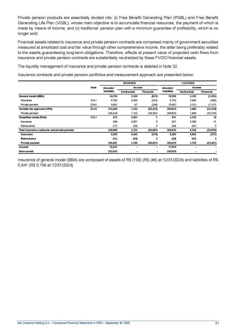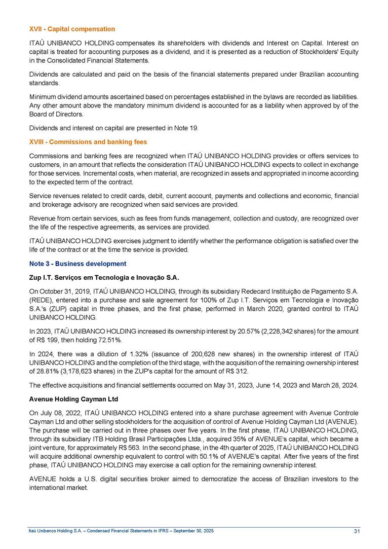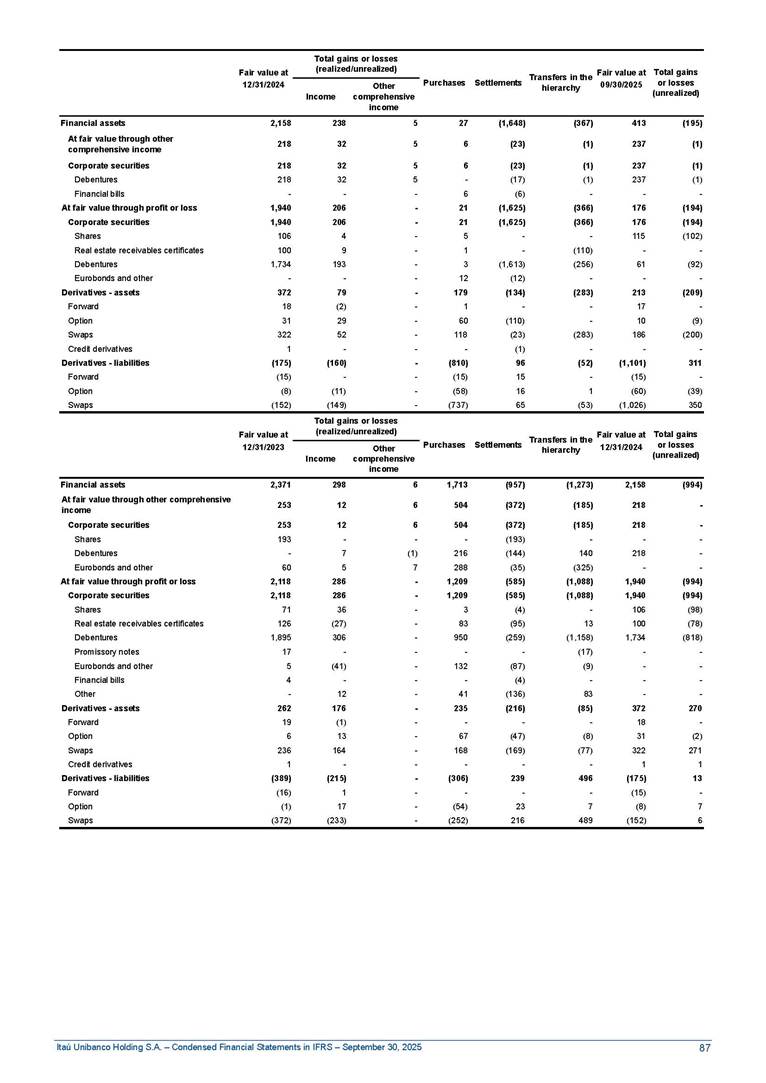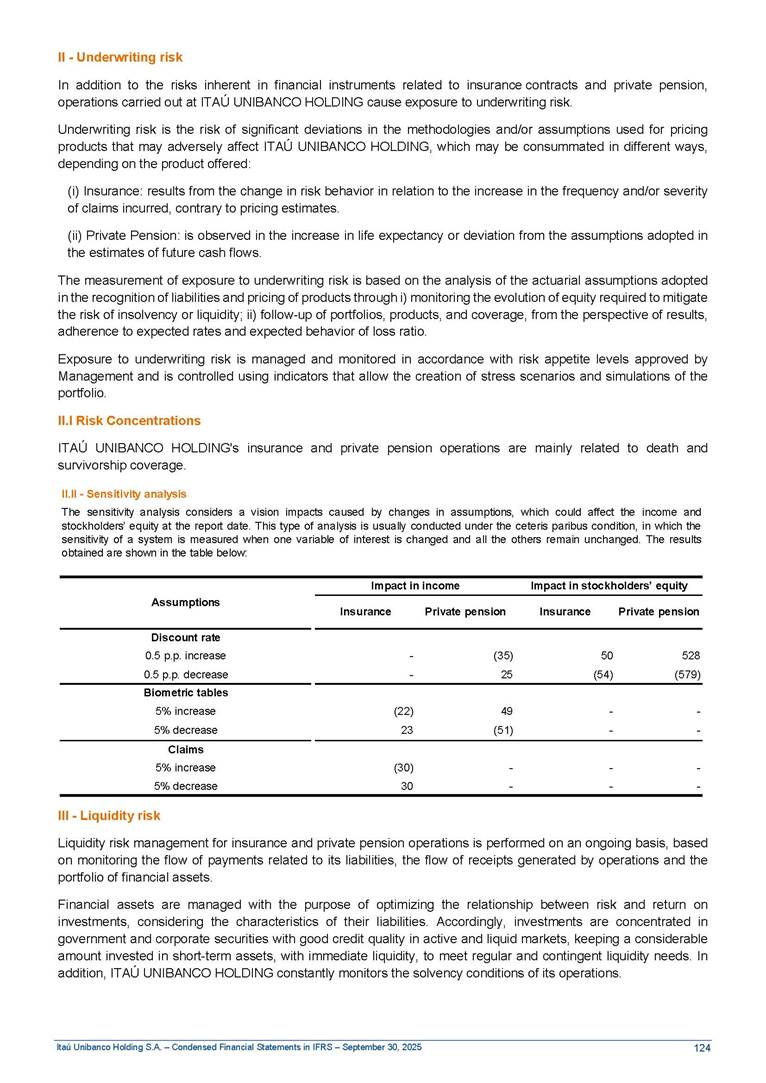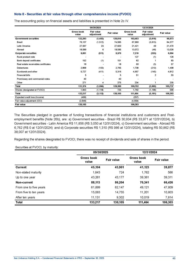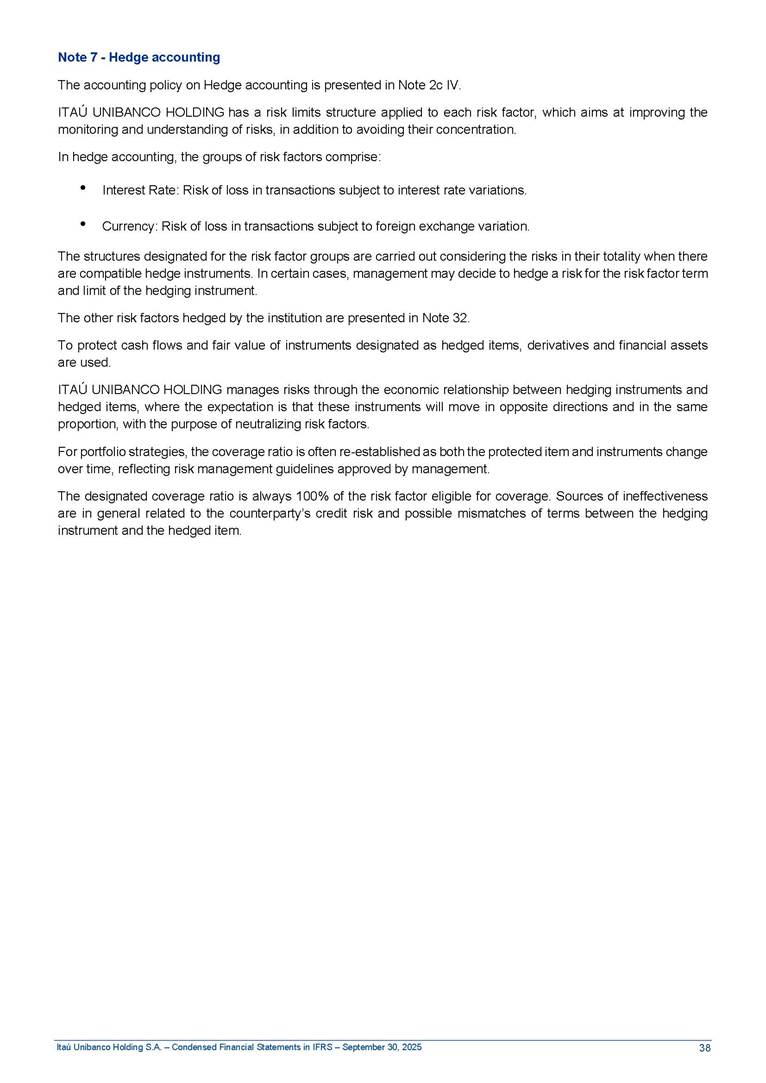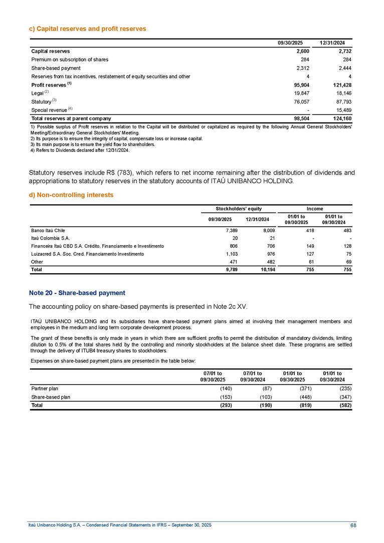 Condensed Financial Statements in IFRS Itaú Unibanco Holding S.A. September 30, 2025 Itaú Day 2025 We held the 5th edition of Itaú Day, an event in which we shared with the market information about the evolution of our business and its impact on our clients’ experience. Itaú Day was attended by the Co-chairmen of the Board of Directors and all members of the Executive Committee. More than 35,000 people have already watched the event, which is available on our Investor Relations website. Management Report 9M25 Key indicators and ratios of our performance from January to September 2025 over the same period of the previous year: Highlights of the first nine months of 2025 Access the full content Recurring Result R$33.1 billion 9M24 8.8% Credit Portfolio1 R$1.4 trillion 9M24 6.1% ROE Recurring 21.1% 9M24 stable Net interest Income2 R$91.8 billion 38.8% Efficiency Ratio3 14.8% Tier 1 Capital Ratio4 13.8% -30 bps -40 bps The credit portfolio1 expanded in Brazil: 6.0% in individuals and 8.7% in companies. There was decrease of 1.2% in Latin America. The 13.8% growth in net interest income² was mainly related to: (i) higher revenues with loan operations, due to higher volume; and (ii) in interbank deposits. The expected credit loss from financial assets increased by 13.9% due to higher expected credit loss with loan and lease operations. General and administrative expenses decreased by 4.8%, mainly due to the reduction in selling of non-financial products, provision for tax and social security lawsuits and other risks. Our accumulated efficiency ratio³ in the first nine months of 2025 decreased 30 bps and stood at 38.8%. (1) Credit portfolio includes financial guarantees provided and private securities. (2) The sum of (i) Interest and Similar Income, (ii) Interest and Similar Expenses, (iii) Income of Financial Assets and Liabilities at Fair Value through Profit or Loss, (iv) Foreign exchange results and exchange variations in foreign transactions. For better comparability, the tax effects of managerial adjustments were reclassified. (3) Efficiency ratio based in BRGAAP managerial disclosure. (4) Considering the limit of 1.5% for AT1, according to CMN Res. No. 4,958. Without this limit, the Tier I Capital Ratio would be 15.3% in Sep-24. Increase of 2.9% in commissions and banking fees and income from insurance and private pension contracts, as a result of the 30.4% increase in income from insurance and private pension contracts, due to the higher financial result for the period and higher insurance sales, mainly related to life and credit life, partially offset by the 1.2% reduction in commissions and banking fees, due to the higher revenues related to current account services, payments and collections and investment banking activities. Performance 9M25 X 9M24 2 3 (1) The sum of (i) Interest and Similar Income, (ii) Interest and Similar Expenses, (iii) Income of Financial Assets and Liabilities at Fair Value through Profit or Loss, (iv) Foreign exchange results and exchange variations in foreign transactions, (v) Commissions and Banking Fees, (vi) Income from Insurance Contracts and Private Pension, net of Reinsurance, and (vii) Other Income. For better comparability, the tax effects of managerial adjustments were reclassified. (2) The sum of (i) Interest and Similar Income, (ii) Interest and Similar Expenses, (iii) Income of Financial Assets and Liabilities at Fair Value through Profit or Loss, (iv) Foreign exchange results and exchange variations in foreign transactions. For better comparability, the tax effects of managerial adjustments were reclassified. (3) The sum on the Commissions and Banking Fees and Income from Insurance Contracts and Private Pension, net of Reinsurance. (4) The Return is calculated by dividing the Net income attributable to owners of the parent company by the Average Stockholders’ Equity. The quotient was multiplied by the number of periods in the year to derive the annualized rate. (5) The return is calculated by dividing the Recurring Result by the Average Stockholders’ Equity. The quotient was multiplied by the number of periods in the year to derive the annualized rate. (6) Source: Bloomberg. (7) The number of outstanding shares has been adjusted to reflect the 10% bonus that took place on March 20, 2025. Therefore, the indicators per share were reclassified. We present below the key indicators comprising our results: In R$ billions Income information 9M25 9M24 Variation Operating Revenues1 Net Interest Income2 Commissions and Banking Fees and Income from Insurance and Private Pension Contracts3 Expected Credit Loss from Financial Assets General and Administrative Expenses Net Income Net Income Attributable to Owners of the Parent Company Recurring Result Return on Average Equity - Annualized4 Recurring Return on Average Equity - Annualized5 Shares 9M257 9M24 7 Variation Net Income per Share - R$ Book Value per Share - R$ (in circulation on 09/30) Dividends and Interest on Own Capital net of Taxes per Share - R$ Average Financial Daily Trading Volume B3 (ON+PN) NYSE (ADR) Market Capitalization6 133.0 91.8 41.1 (24.9) (59.2) 33.7 33.0 33.1 21.0% 21.1% 130.0 80.6 40.0 (21.8) (62.2) 31.0 30.3 30.5 20.9% 21.1% 2.3% 13.8% 2.9% 13.9% -4.8% 8.7% 8.9% 8.8% 10 bps stable 3.06 20.02 0.75 1.8 0.8 1.0 397.2 2.81 18.69 0.71 1.4 0.8 0.6 330.8 8.9% 7.1% 4.9% 29.0% 2.5% 64.6% 20.1% 4 Know more Know more Know more We created a focused structure for crypto fund management Through Itaú Asset, we created our first dedicated structure for cryptoassets. This initiative reinforces our commitment to delivering innovative and tailored solutions to our clients, offering products that cover all allocation possibilities in the financial market. Our new crypto-focused team is now part of the Multimesas structure (similar to multi-asset), which includes more than 130 investment professionals. We are the first bank to offer Pix for small and medium-sized businesses using the Guaran