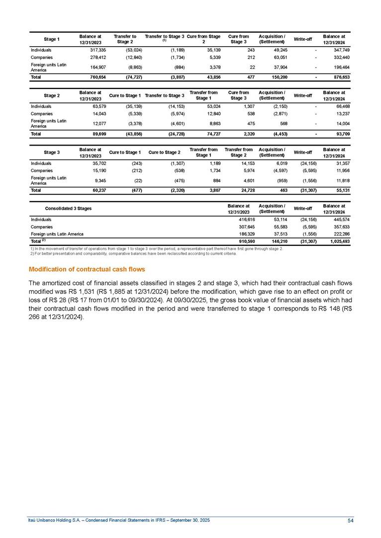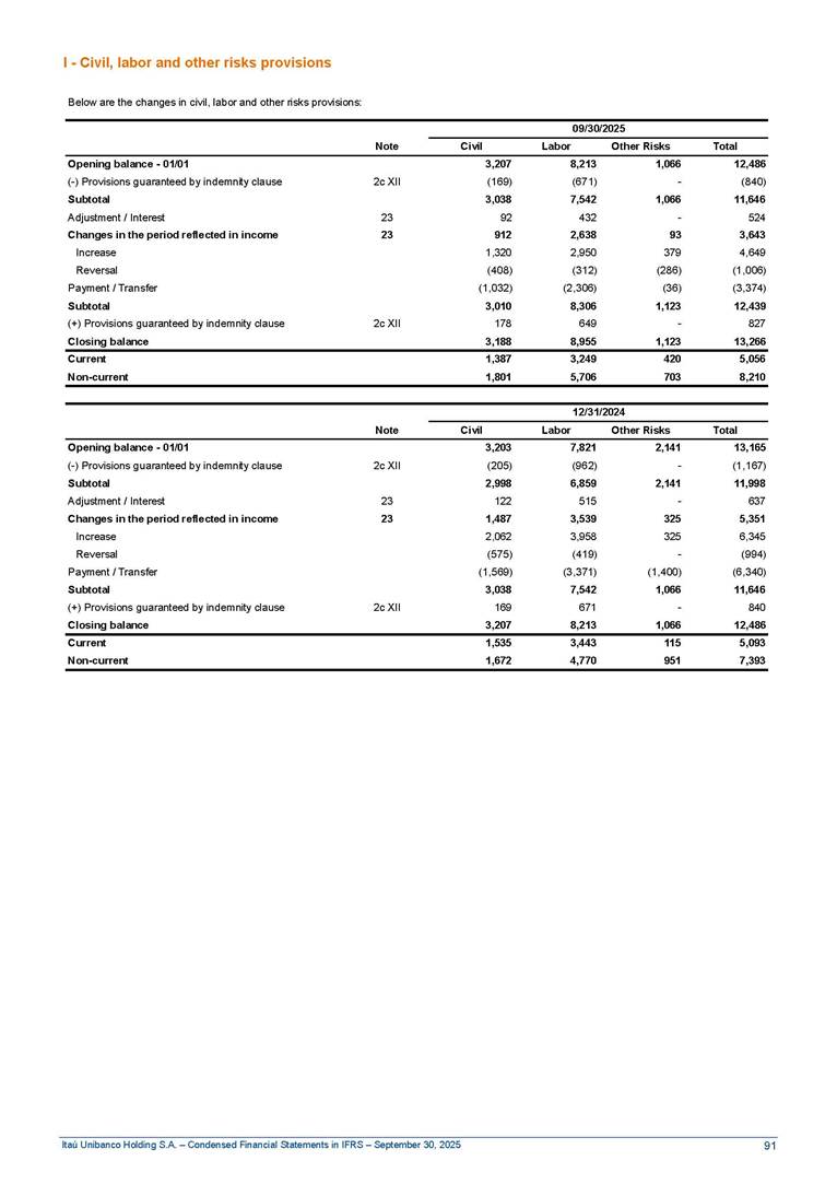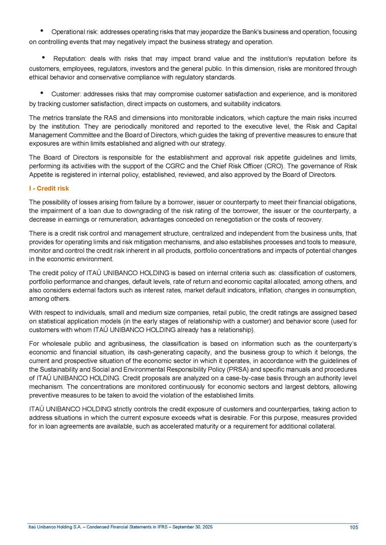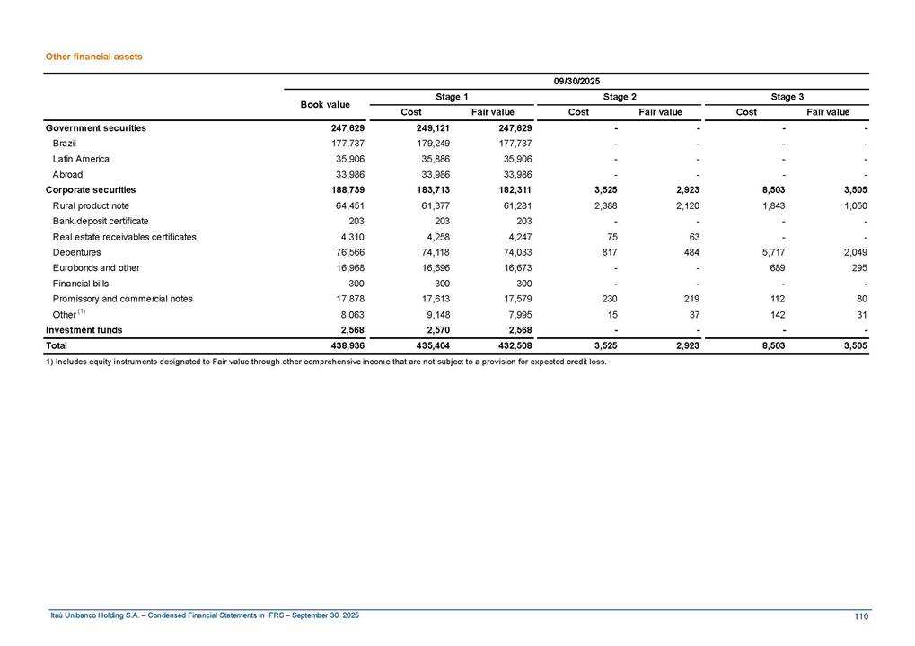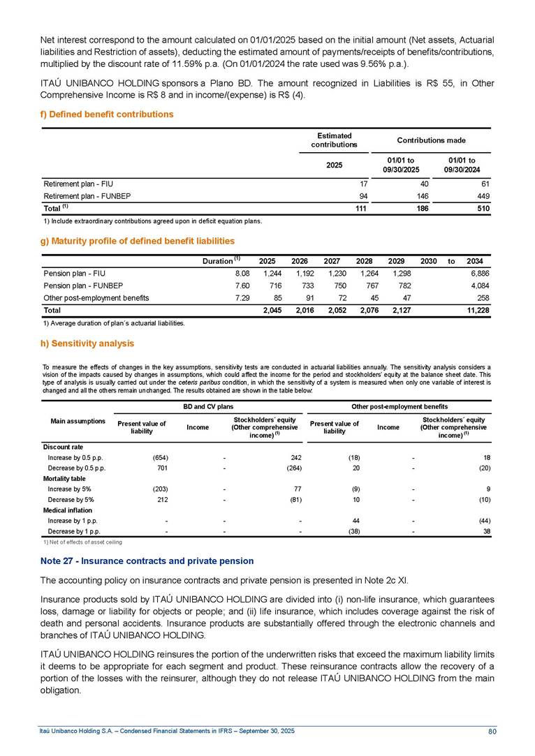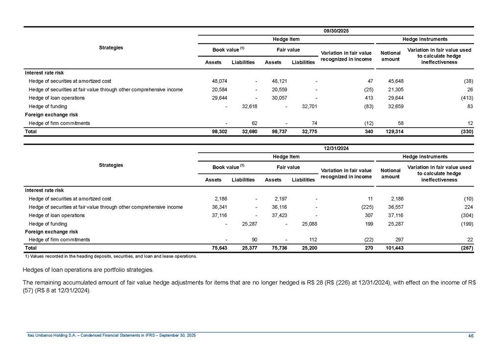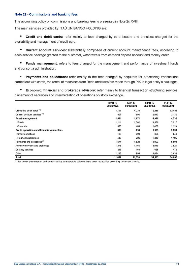 Condensed Financial Statements in IFRS Itaú Unibanco Holding S.A. September 30, 2025 Itaú Day 2025 We held the 5th edition of Itaú Day, an event in which we shared with the market information about the evolution of our business and its impact on our clients’ experience. Itaú Day was attended by the Co-chairmen of the Board of Directors and all members of the Executive Committee. More than 35,000 people have already watched the event, which is available on our Investor Relations website. Management Report 9M25 Key indicators and ratios of our performance from January to September 2025 over the same period of the previous year: Highlights of the first nine months of 2025 Access the full content Recurring Result R$33.1 billion 9M24 8.8% Credit Portfolio1 R$1.4 trillion 9M24 6.1% ROE Recurring 21.1% 9M24 stable Net interest Income2 R$91.8 billion 38.8% Efficiency Ratio3 14.8% Tier 1 Capital Ratio4 13.8% -30 bps -40 bps The credit portfolio1 expanded in Brazil: 6.0% in individuals and 8.7% in companies. There was decrease of 1.2% in Latin America. The 13.8% growth in net interest income² was mainly related to: (i) higher revenues with loan operations, due to higher volume; and (ii) in interbank deposits. The expected credit loss from financial assets increased by 13.9% due to higher expected credit loss with loan and lease operations. General and administrative expenses decreased by 4.8%, mainly due to the reduction in selling of non-financial products, provision for tax and social security lawsuits and other risks. Our accumulated efficiency ratio³ in the first nine months of 2025 decreased 30 bps and stood at 38.8%. (1) Credit portfolio includes financial guarantees provided and private securities. (2) The sum of (i) Interest and Similar Income, (ii) Interest and Similar Expenses, (iii) Income of Financial Assets and Liabilities at Fair Value through Profit or Loss, (iv) Foreign exchange results and exchange variations in foreign transactions. For better comparability, the tax effects of managerial adjustments were reclassified. (3) Efficiency ratio based in BRGAAP managerial disclosure. (4) Considering the limit of 1.5% for AT1, according to CMN Res. No. 4,958. Without this limit, the Tier I Capital Ratio would be 15.3% in Sep-24. Increase of 2.9% in commissions and banking fees and income from insurance and private pension contracts, as a result of the 30.4% increase in income from insurance and private pension contracts, due to the higher financial result for the period and higher insurance sales, mainly related to life and credit life, partially offset by the 1.2% reduction in commissions and banking fees, due to the higher revenues related to current account services, payments and collections and investment banking activities. Performance 9M25 X 9M24 2 3 (1) The sum of (i) Interest and Similar Income, (ii) Interest and Similar Expenses, (iii) Income of Financial Assets and Liabilities at Fair Value through Profit or Loss, (iv) Foreign exchange results and exchange variations in foreign transactions, (v) Commissions and Banking Fees, (vi) Income from Insurance Contracts and Private Pension, net of Reinsurance, and (vii) Other Income. For better comparability, the tax effects of managerial adjustments were reclassified. (2) The sum of (i) Interest and Similar Income, (ii) Interest and Similar Expenses, (iii) Income of Financial Assets and Liabilities at Fair Value through Profit or Loss, (iv) Foreign exchange results and exchange variations in foreign transactions. For better comparability, the tax effects of managerial adjustments were reclassified. (3) The sum on the Commissions and Banking Fees and Income from Insurance Contracts and Private Pension, net of Reinsurance. (4) The Return is calculated by dividing the Net income attributable to owners of the parent company by the Average Stockholders’ Equity. The quotient was multiplied by the number of periods in the year to derive the annualized rate. (5) The return is calculated by dividing the Recurring Result by the Average Stockholders’ Equity. The quotient was multiplied by the number of periods in the year to derive the annualized rate. (6) Source: Bloomberg. (7) The number of outstanding shares has been adjusted to reflect the 10% bonus that took place on March 20, 2025. Therefore, the indicators per share were reclassified. We present below the key indicators comprising our results: In R$ billions Income information 9M25 9M24 Variation Operating Revenues1 Net Interest Income2 Commissions and Banking Fees and Income from Insurance and Private Pension Contracts3 Expected Credit Loss from Financial Assets General and Administrative Expenses Net Income Net Income Attributable to Owners of the Parent Company Recurring Result Return on Average Equity - Annualized4 Recurring Return on Average Equity - Annualized5 Shares 9M257 9M24 7 Variation Net Income per Share - R$ Book Value per Share - R$ (in circulation on 09/30) Dividends and Interest on Own Capital net of Taxes per Share - R$ Average Financial Daily Trading Volume B3 (ON+PN) NYSE (ADR) Market Capitalization6 133.0 91.8 41.1 (24.9) (59.2) 33.7 33.0 33.1 21.0% 21.1% 130.0 80.6 40.0 (21.8) (62.2) 31.0 30.3 30.5 20.9% 21.1% 2.3% 13.8% 2.9% 13.9% -4.8% 8.7% 8.9% 8.8% 10 bps stable 3.06 20.02 0.75 1.8 0.8 1.0 397.2 2.81 18.69 0.71 1.4 0.8 0.6 330.8 8.9% 7.1% 4.9% 29.0% 2.5% 64.6% 20.1% 4 Know more Know more Know more We created a focused structure for crypto fund management Through Itaú Asset, we created our first dedicated structure for cryptoassets. This initiative reinforces our commitment to delivering innovative and tailored solutions to our clients, offering products that cover all allocation possibilities in the financial market. Our new crypto-focused team is now part of the Multimesas structure (similar to multi-asset), which includes more than 130 investment professionals. We are the first bank to offer Pix for small and medium-sized businesses using the Guaran