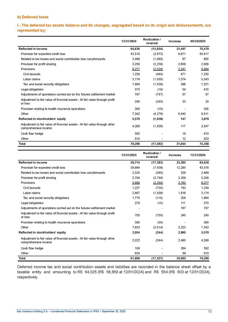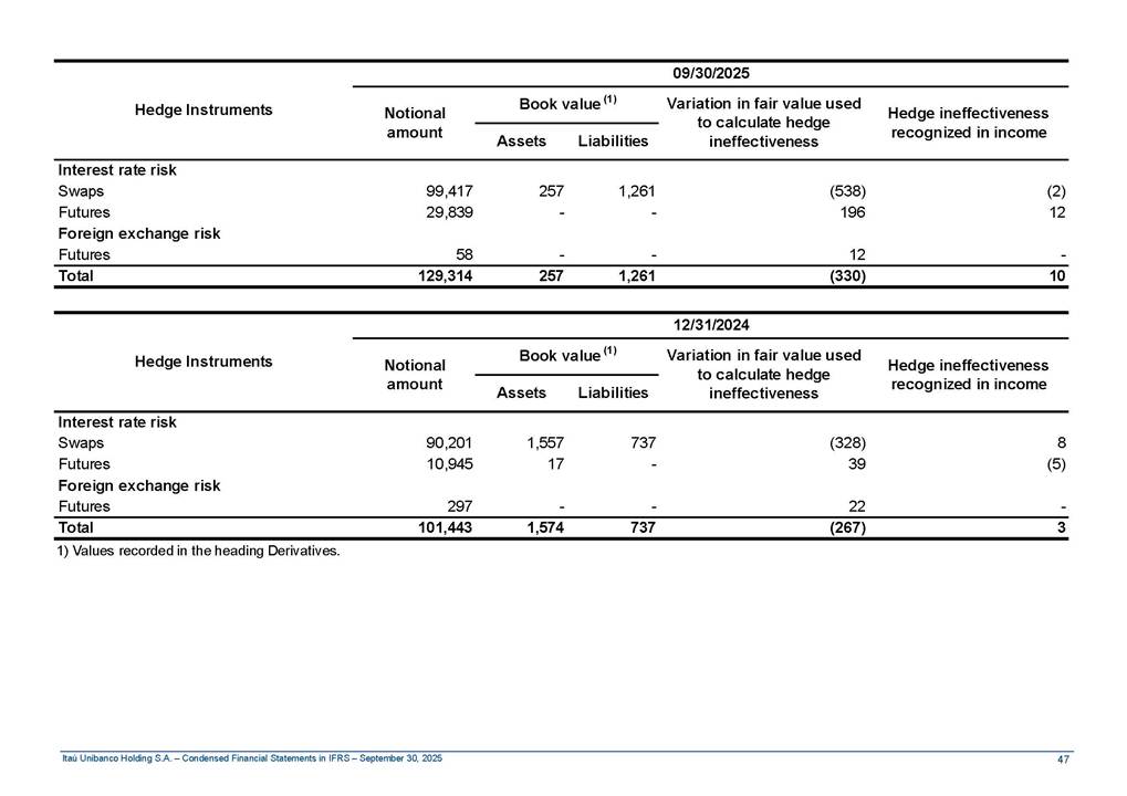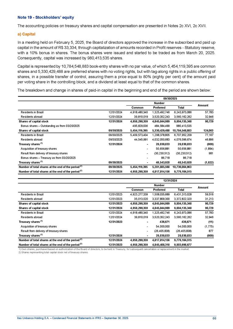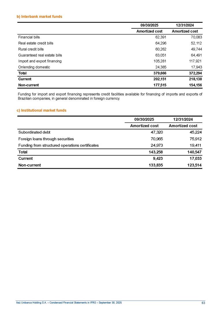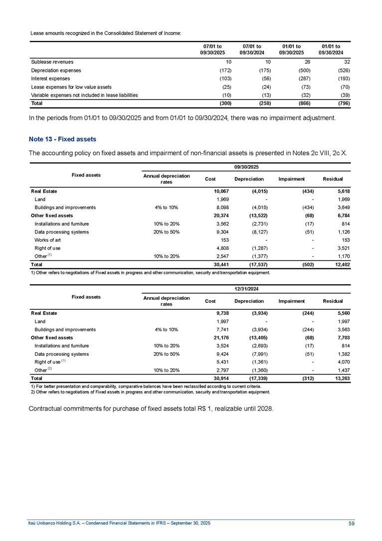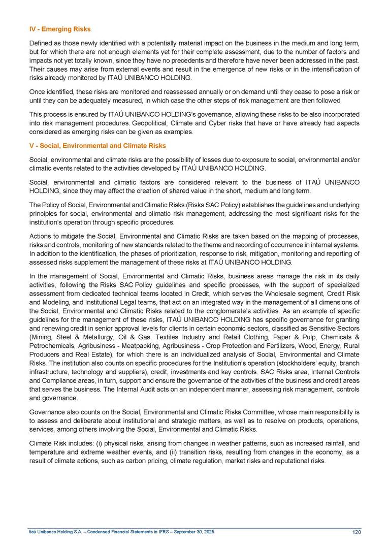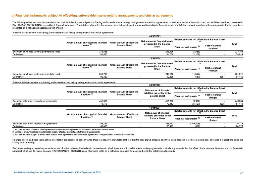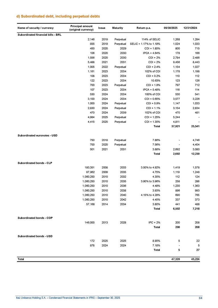 Condensed Financial Statements in IFRS Itaú Unibanco Holding S.A. September 30, 2025 Itaú Day 2025 We held the 5th edition of Itaú Day, an event in which we shared with the market information about the evolution of our business and its impact on our clients’ experience. Itaú Day was attended by the Co-chairmen of the Board of Directors and all members of the Executive Committee. More than 35,000 people have already watched the event, which is available on our Investor Relations website. Management Report 9M25 Key indicators and ratios of our performance from January to September 2025 over the same period of the previous year: Highlights of the first nine months of 2025 Access the full content Recurring Result R$33.1 billion 9M24 8.8% Credit Portfolio1 R$1.4 trillion 9M24 6.1% ROE Recurring 21.1% 9M24 stable Net interest Income2 R$91.8 billion 38.8% Efficiency Ratio3 14.8% Tier 1 Capital Ratio4 13.8% -30 bps -40 bps The credit portfolio1 expanded in Brazil: 6.0% in individuals and 8.7% in companies. There was decrease of 1.2% in Latin America. The 13.8% growth in net interest income² was mainly related to: (i) higher revenues with loan operations, due to higher volume; and (ii) in interbank deposits. The expected credit loss from financial assets increased by 13.9% due to higher expected credit loss with loan and lease operations. General and administrative expenses decreased by 4.8%, mainly due to the reduction in selling of non-financial products, provision for tax and social security lawsuits and other risks. Our accumulated efficiency ratio³ in the first nine months of 2025 decreased 30 bps and stood at 38.8%. (1) Credit portfolio includes financial guarantees provided and private securities. (2) The sum of (i) Interest and Similar Income, (ii) Interest and Similar Expenses, (iii) Income of Financial Assets and Liabilities at Fair Value through Profit or Loss, (iv) Foreign exchange results and exchange variations in foreign transactions. For better comparability, the tax effects of managerial adjustments were reclassified. (3) Efficiency ratio based in BRGAAP managerial disclosure. (4) Considering the limit of 1.5% for AT1, according to CMN Res. No. 4,958. Without this limit, the Tier I Capital Ratio would be 15.3% in Sep-24. Increase of 2.9% in commissions and banking fees and income from insurance and private pension contracts, as a result of the 30.4% increase in income from insurance and private pension contracts, due to the higher financial result for the period and higher insurance sales, mainly related to life and credit life, partially offset by the 1.2% reduction in commissions and banking fees, due to the higher revenues related to current account services, payments and collections and investment banking activities. Performance 9M25 X 9M24 2 3 (1) The sum of (i) Interest and Similar Income, (ii) Interest and Similar Expenses, (iii) Income of Financial Assets and Liabilities at Fair Value through Profit or Loss, (iv) Foreign exchange results and exchange variations in foreign transactions, (v) Commissions and Banking Fees, (vi) Income from Insurance Contracts and Private Pension, net of Reinsurance, and (vii) Other Income. For better comparability, the tax effects of managerial adjustments were reclassified. (2) The sum of (i) Interest and Similar Income, (ii) Interest and Similar Expenses, (iii) Income of Financial Assets and Liabilities at Fair Value through Profit or Loss, (iv) Foreign exchange results and exchange variations in foreign transactions. For better comparability, the tax effects of managerial adjustments were reclassified. (3) The sum on the Commissions and Banking Fees and Income from Insurance Contracts and Private Pension, net of Reinsurance. (4) The Return is calculated by dividing the Net income attributable to owners of the parent company by the Average Stockholders’ Equity. The quotient was multiplied by the number of periods in the year to derive the annualized rate. (5) The return is calculated by dividing the Recurring Result by the Average Stockholders’ Equity. The quotient was multiplied by the number of periods in the year to derive the annualized rate. (6) Source: Bloomberg. (7) The number of outstanding shares has been adjusted to reflect the 10% bonus that took place on March 20, 2025. Therefore, the indicators per share were reclassified. We present below the key indicators comprising our results: In R$ billions Income information 9M25 9M24 Variation Operating Revenues1 Net Interest Income2 Commissions and Banking Fees and Income from Insurance and Private Pension Contracts3 Expected Credit Loss from Financial Assets General and Administrative Expenses Net Income Net Income Attributable to Owners of the Parent Company Recurring Result Return on Average Equity - Annualized4 Recurring Return on Average Equity - Annualized5 Shares 9M257 9M24 7 Variation Net Income per Share - R$ Book Value per Share - R$ (in circulation on 09/30) Dividends and Interest on Own Capital net of Taxes per Share - R$ Average Financial Daily Trading Volume B3 (ON+PN) NYSE (ADR) Market Capitalization6 133.0 91.8 41.1 (24.9) (59.2) 33.7 33.0 33.1 21.0% 21.1% 130.0 80.6 40.0 (21.8) (62.2) 31.0 30.3 30.5 20.9% 21.1% 2.3% 13.8% 2.9% 13.9% -4.8% 8.7% 8.9% 8.8% 10 bps stable 3.06 20.02 0.75 1.8 0.8 1.0 397.2 2.81 18.69 0.71 1.4 0.8 0.6 330.8 8.9% 7.1% 4.9% 29.0% 2.5% 64.6% 20.1% 4 Know more Know more Know more We created a focused structure for crypto fund management Through Itaú Asset, we created our first dedicated structure for cryptoassets. This initiative reinforces our commitment to delivering innovative and tailored solutions to our clients, offering products that cover all allocation possibilities in the financial market. Our new crypto-focused team is now part of the Multimesas structure (similar to multi-asset), which includes more than 130 investment professionals. We are the first bank to offer Pix for small and medium-sized businesses using the Guaran